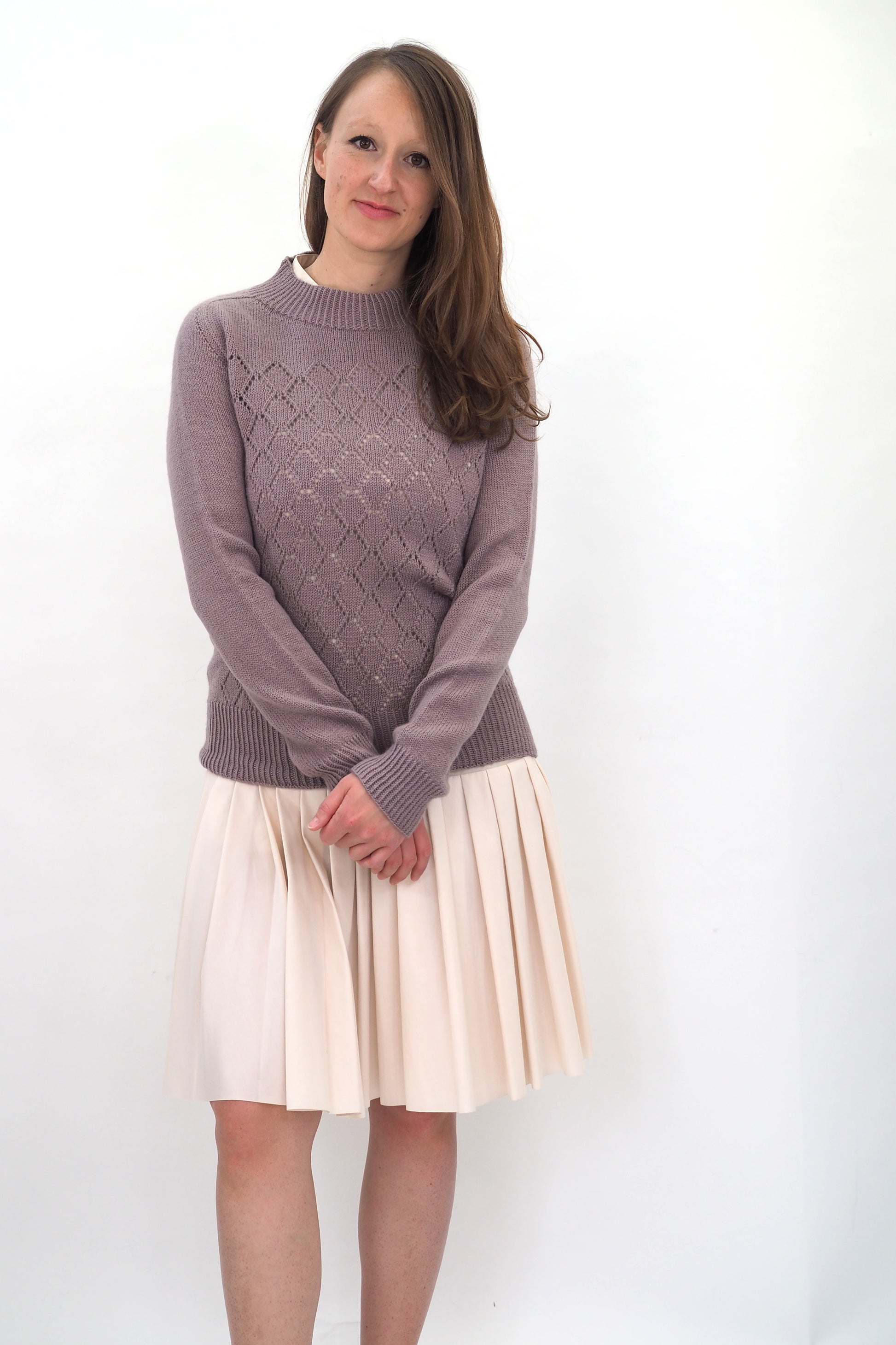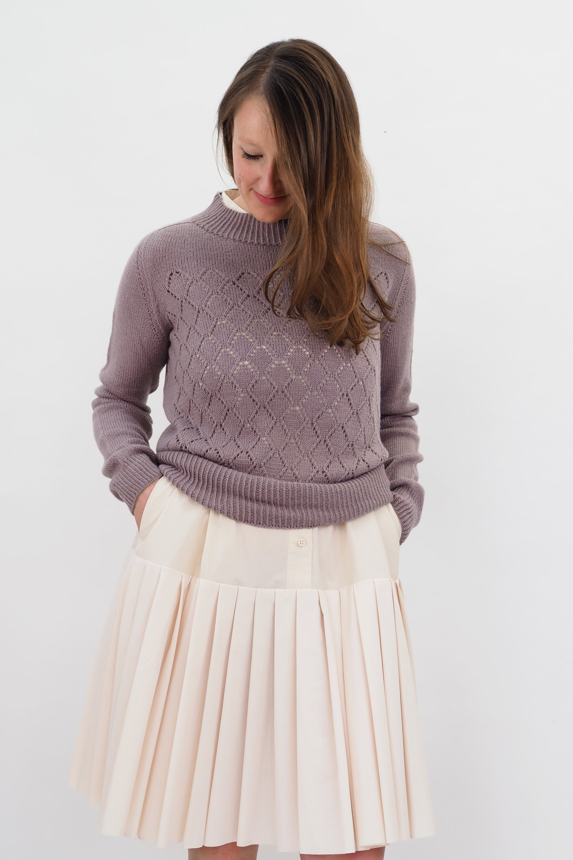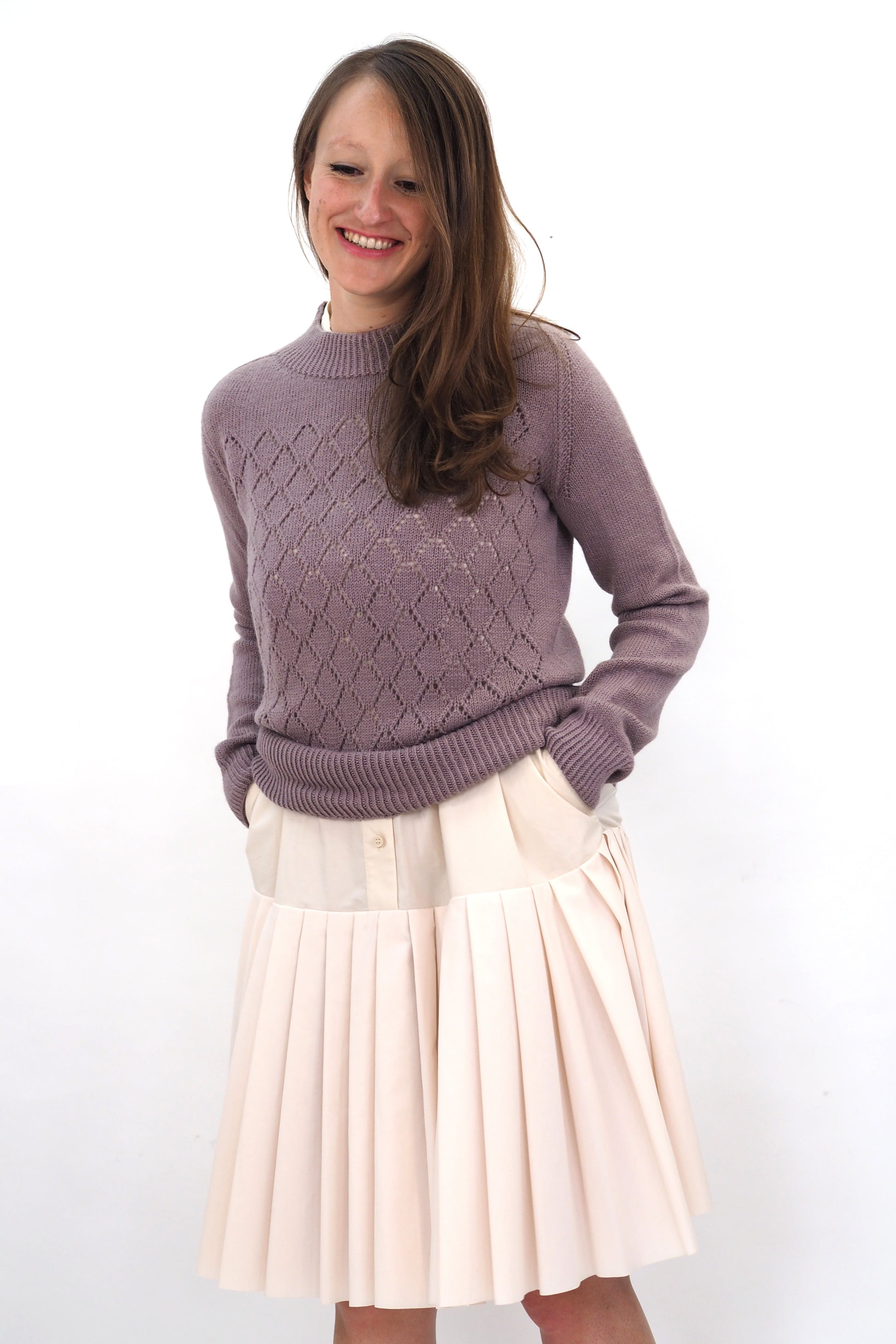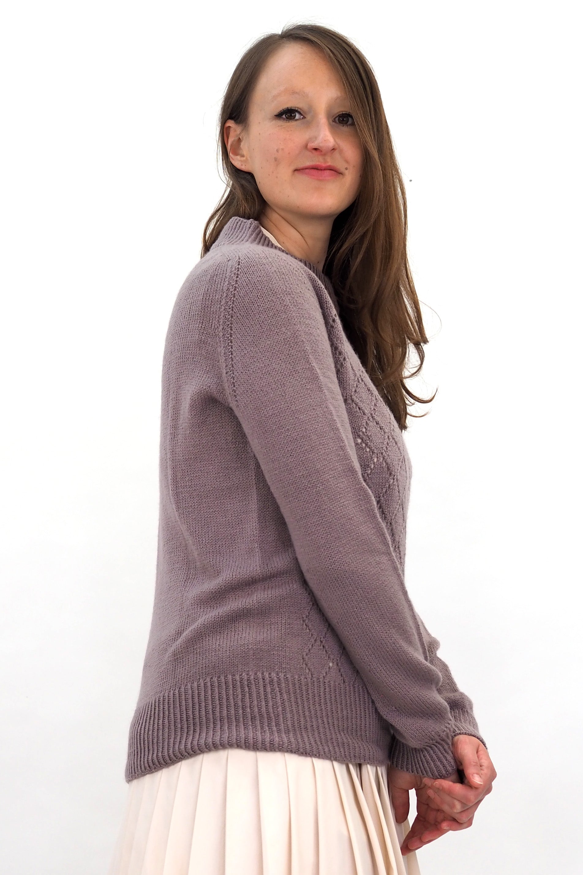 AINO wird nahtlos von oben nach unten in Runden gestrickt. Der Hals- und Saumabschluss sowie die Manschetten werden im Rippenmuster[1li, 1re] gestrickt. Der Halsausschnitt wird mit der verkürzten Reihen geformt. Die Schulterpassen werden mit der Contiguous Methode geformt.