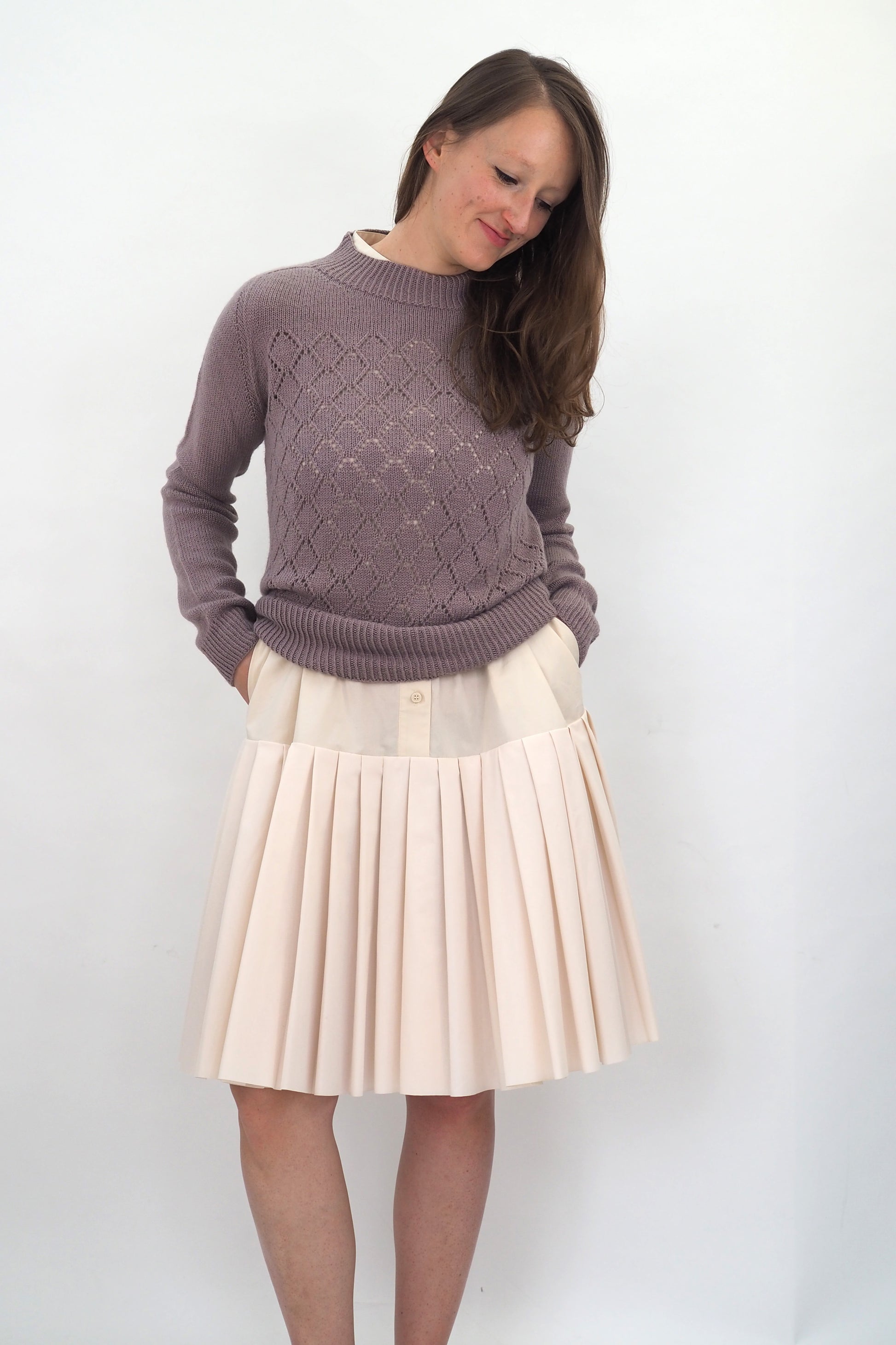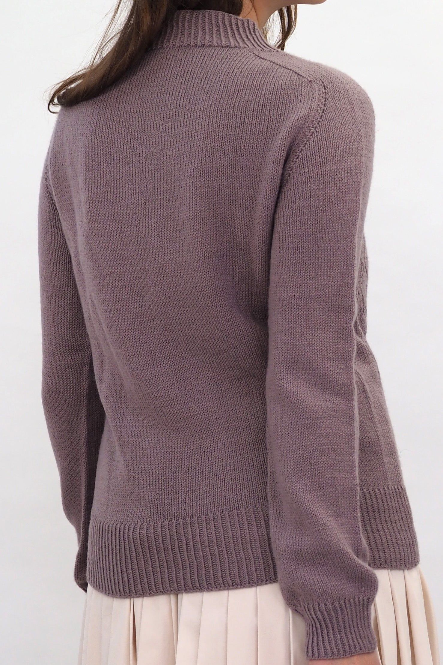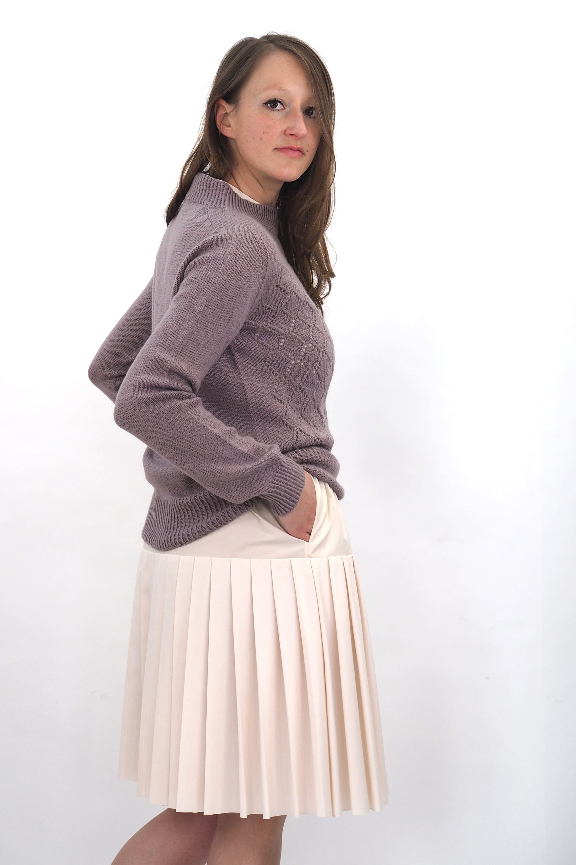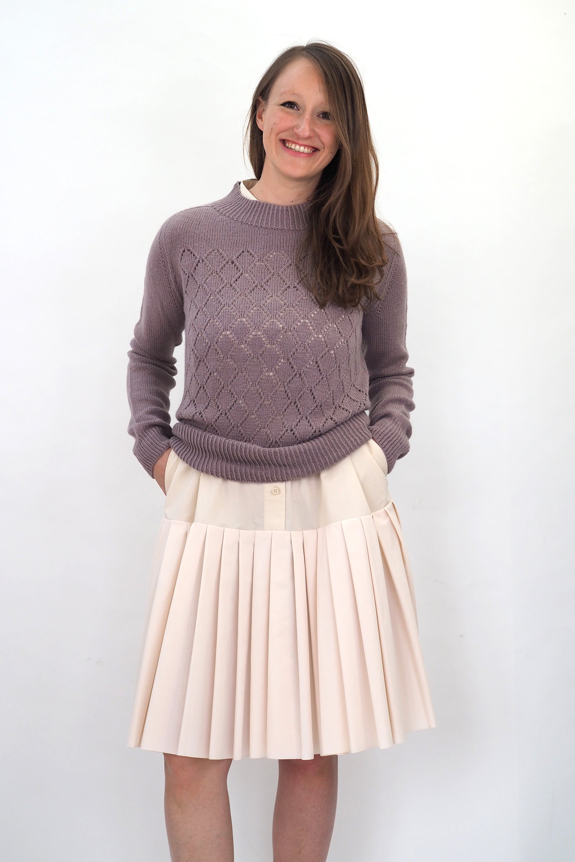 AINO wird nahtlos von oben nach unten in Runden gestrickt. Der Hals- und Saumabschluss sowie die Manschetten werden im Rippenmuster[1li, 1re] gestrickt. Der Halsausschnitt wird mit der verkürzten Reihen geformt. Die Schulterpassen werden mit der Contiguous Methode geformt.