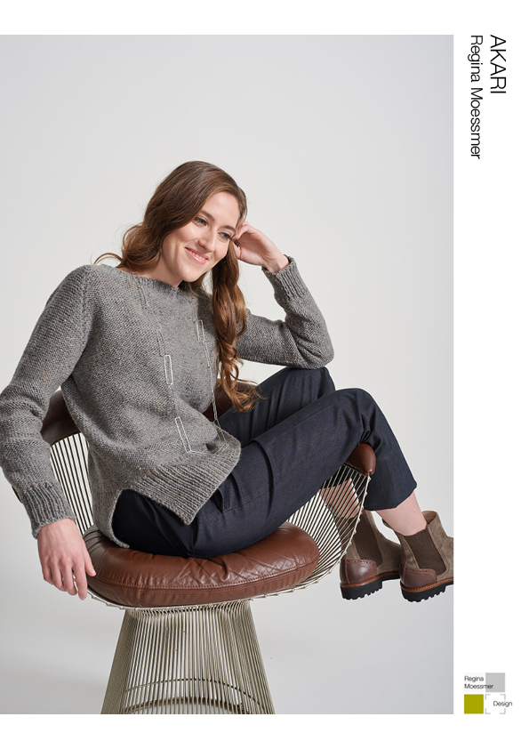 AKARI wird nahtlos von oben nach unten gestrickt. Um linke Maschen zu vermeiden, wird der Pullover ausschließlich auf der linken Seite gestrickt. Der Ausschnitt wird mit verkürzten Reihen geformt und die Ärmel mit Raglan-Zunahmen. Für eine sanfte A-Linie werden am unteren Teil des Körpers einige Maschen zugenommen. Der Saum ist an den Seiten geteilt.