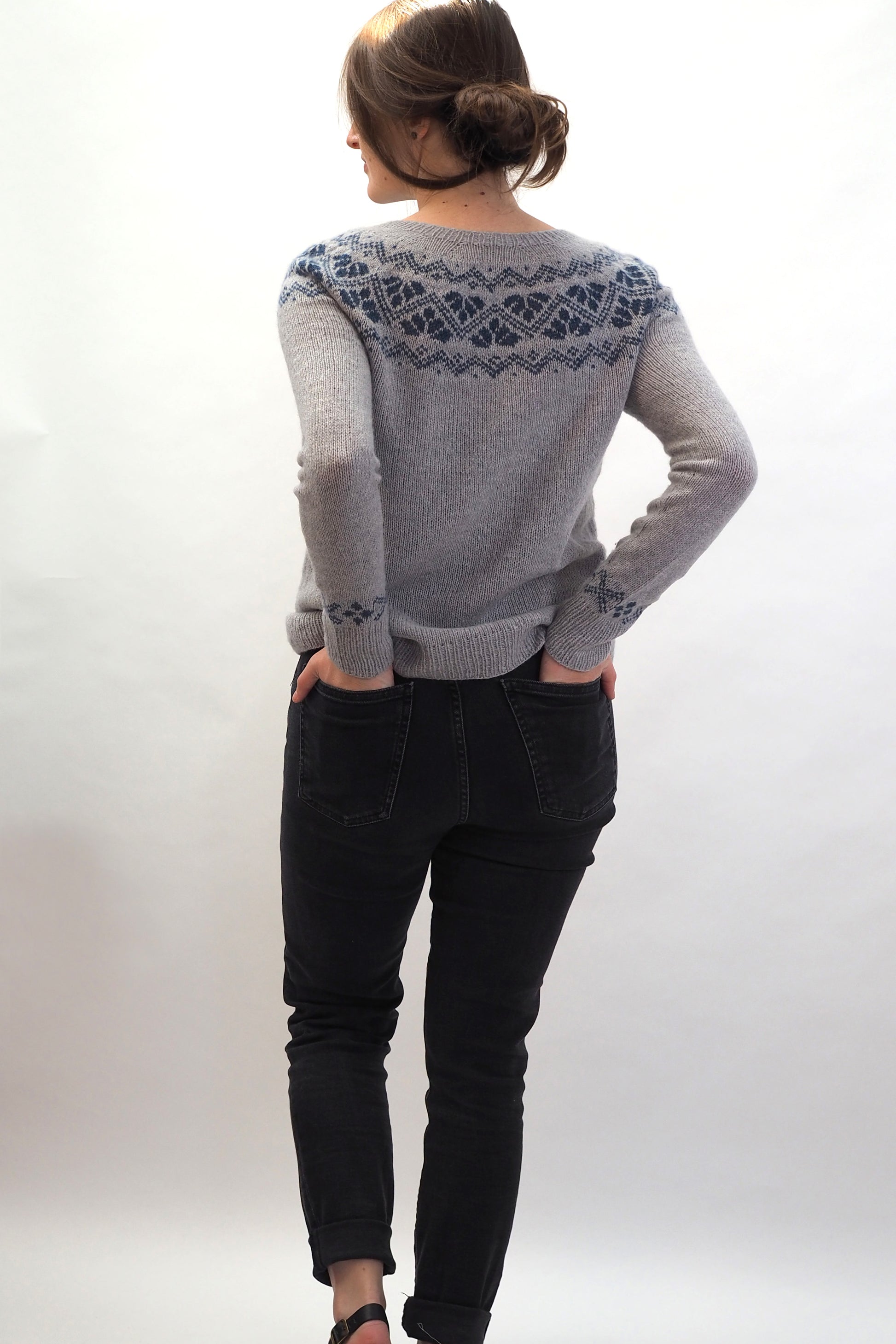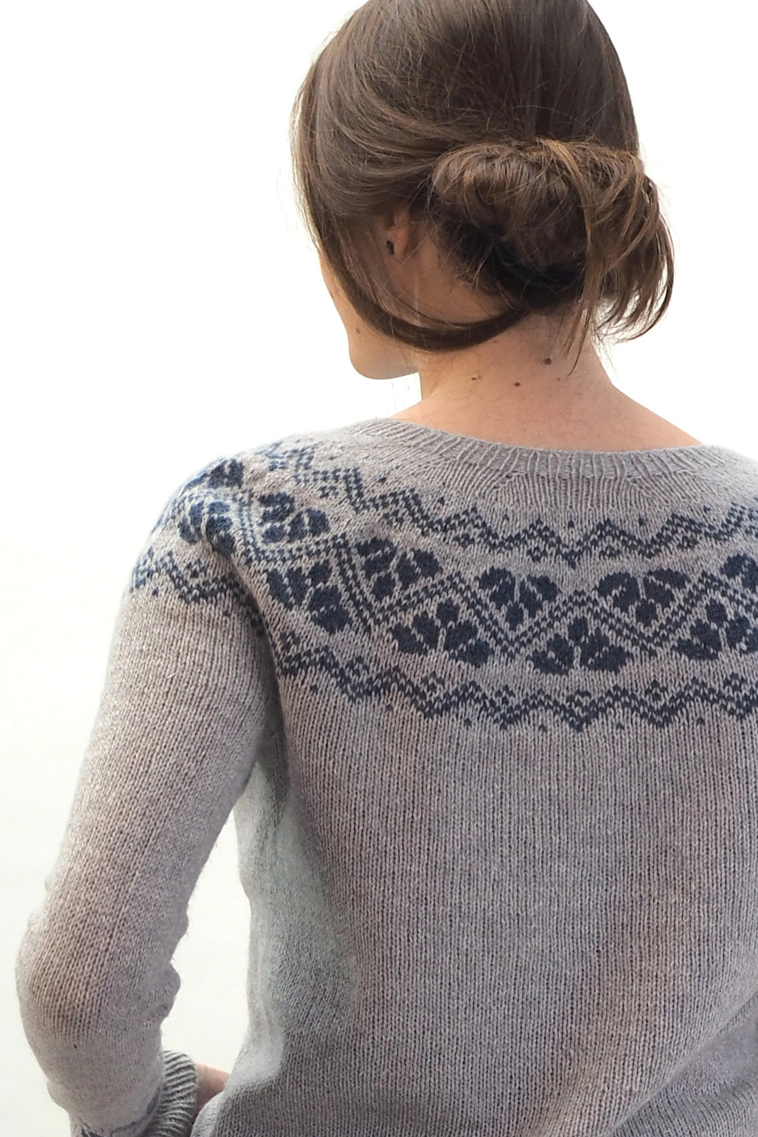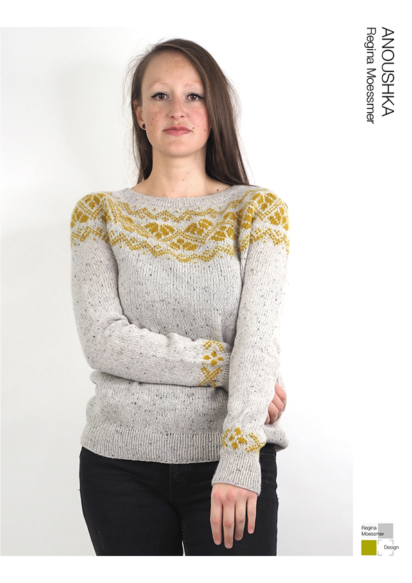 ANOUSHKA wird nahtlos von oben nach unten gestrickt. Die German Short Rows Technik wird verwendet, um den Halsausschnitt zu formen. Die Zunahmen für das Rundpasse sind gleichmäßig verteilt, dann wird der Musterteil gestrickt. Nach den Zunahmen für die Rundpasse werden Zunahmen für Körper und Ärmel gearbeitet, bis die Ärmel abgeteil werden.