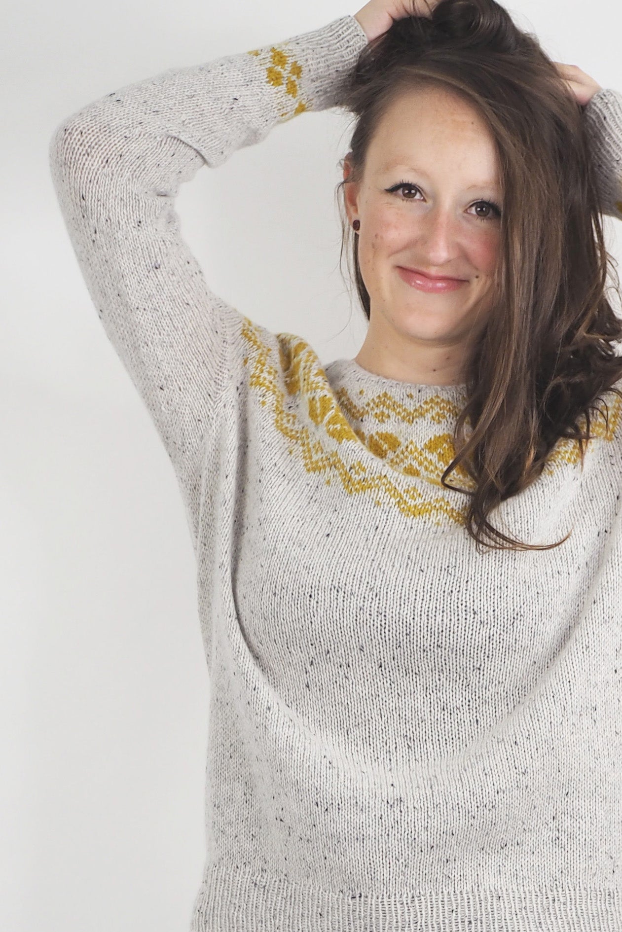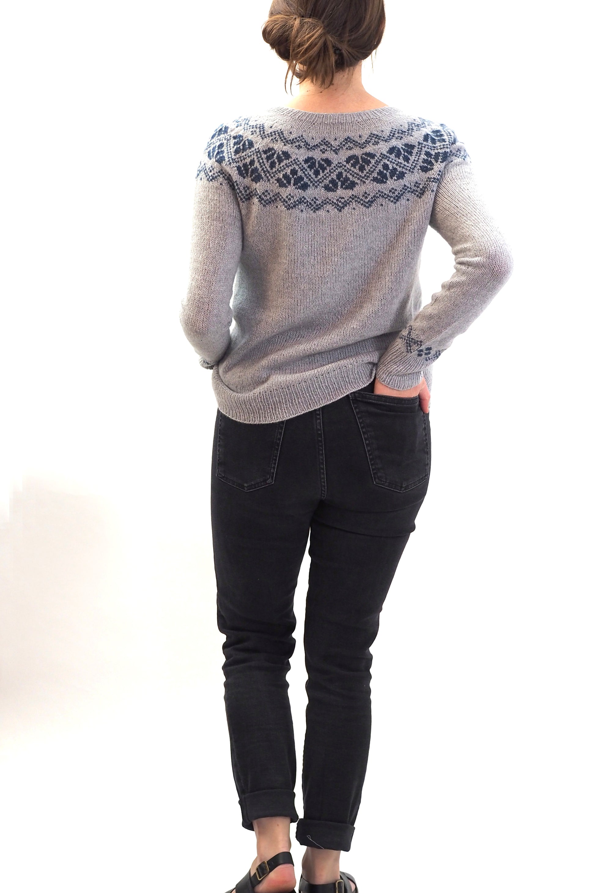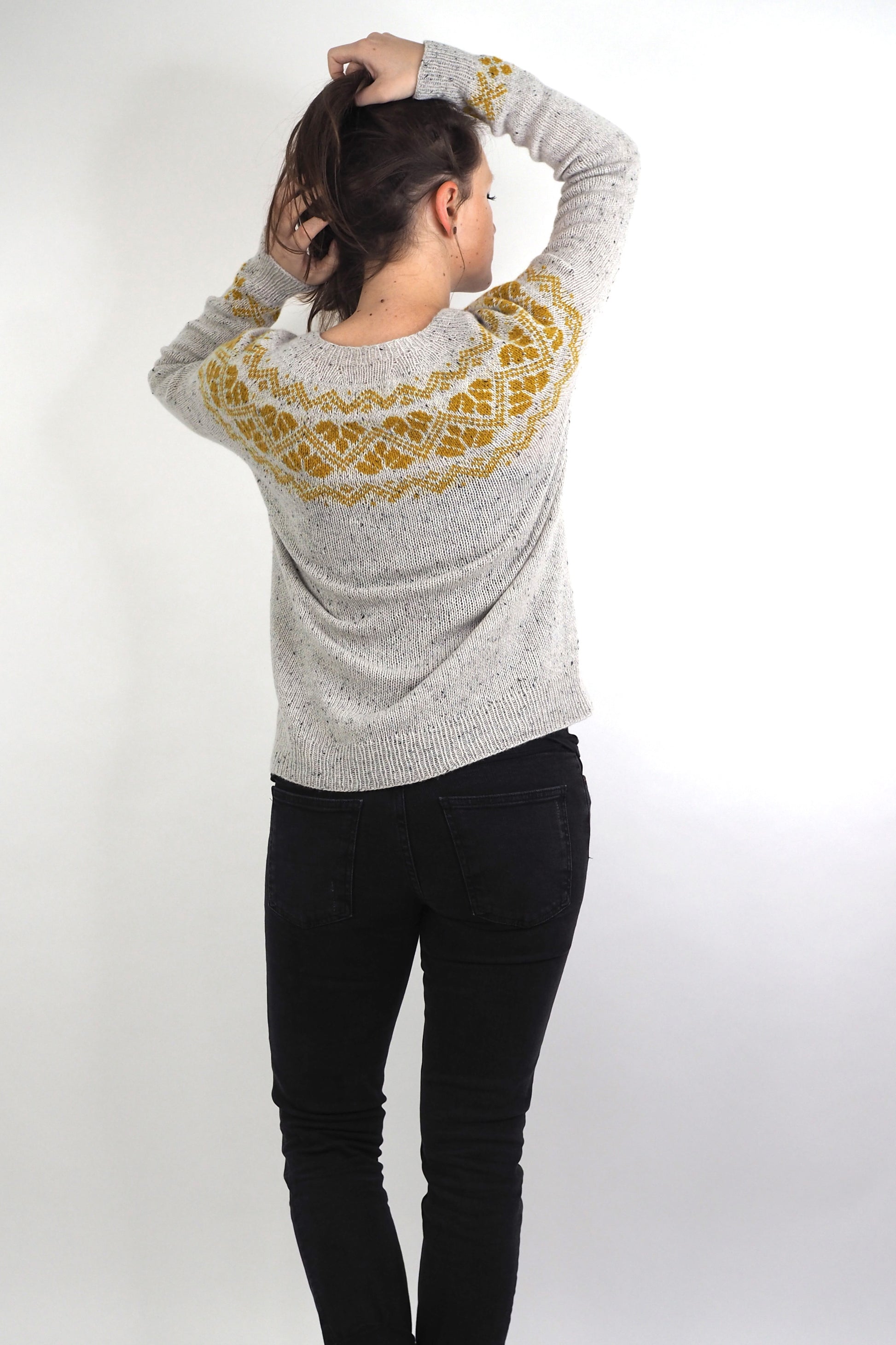 ANOUSHKA wird nahtlos von oben nach unten gestrickt. Die German Short Rows Technik wird verwendet, um den Halsausschnitt zu formen. Die Zunahmen für das Rundpasse sind gleichmäßig verteilt, dann wird der Musterteil gestrickt. Nach den Zunahmen für die Rundpasse werden Zunahmen für Körper und Ärmel gearbeitet, bis die Ärmel abgeteil werden.