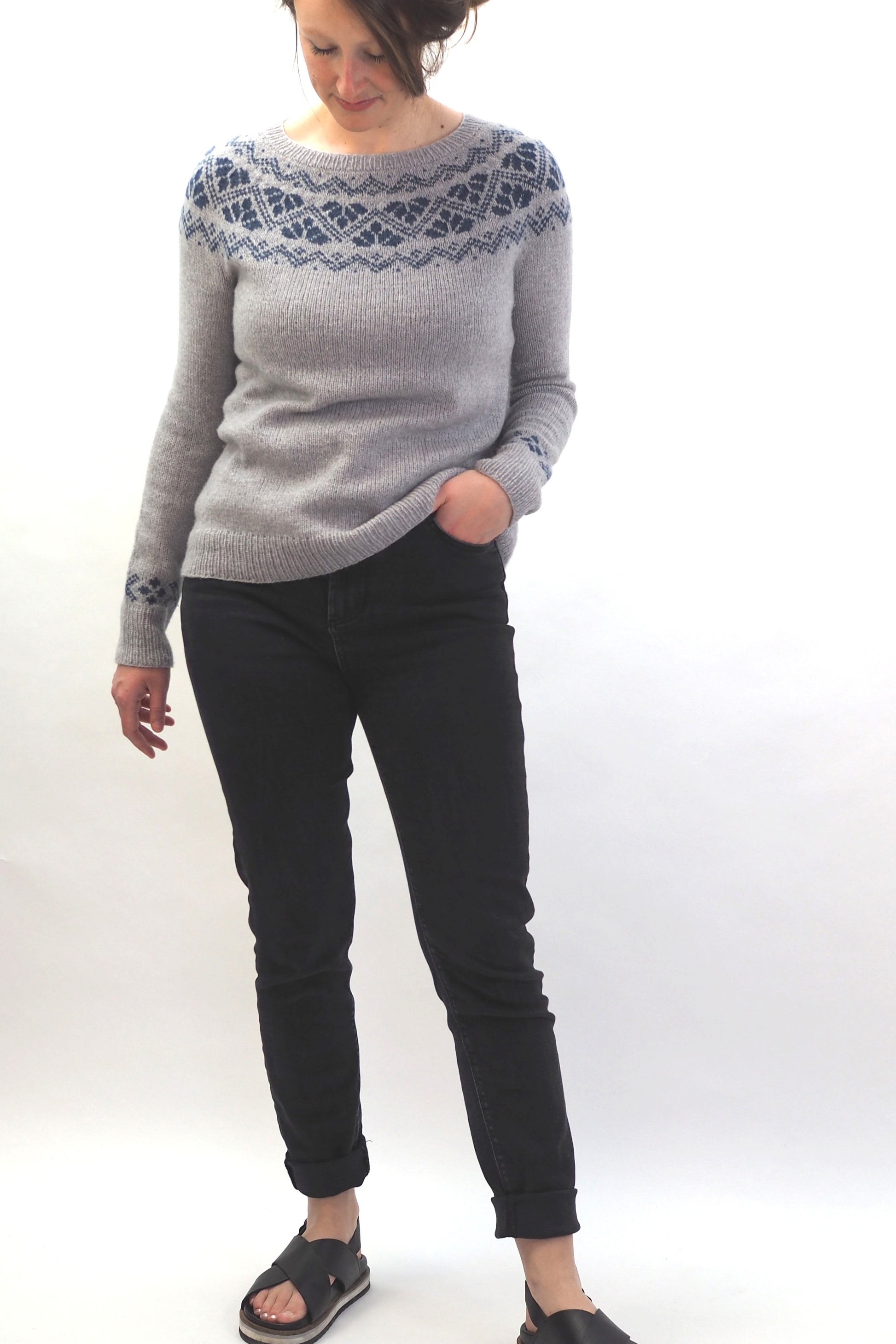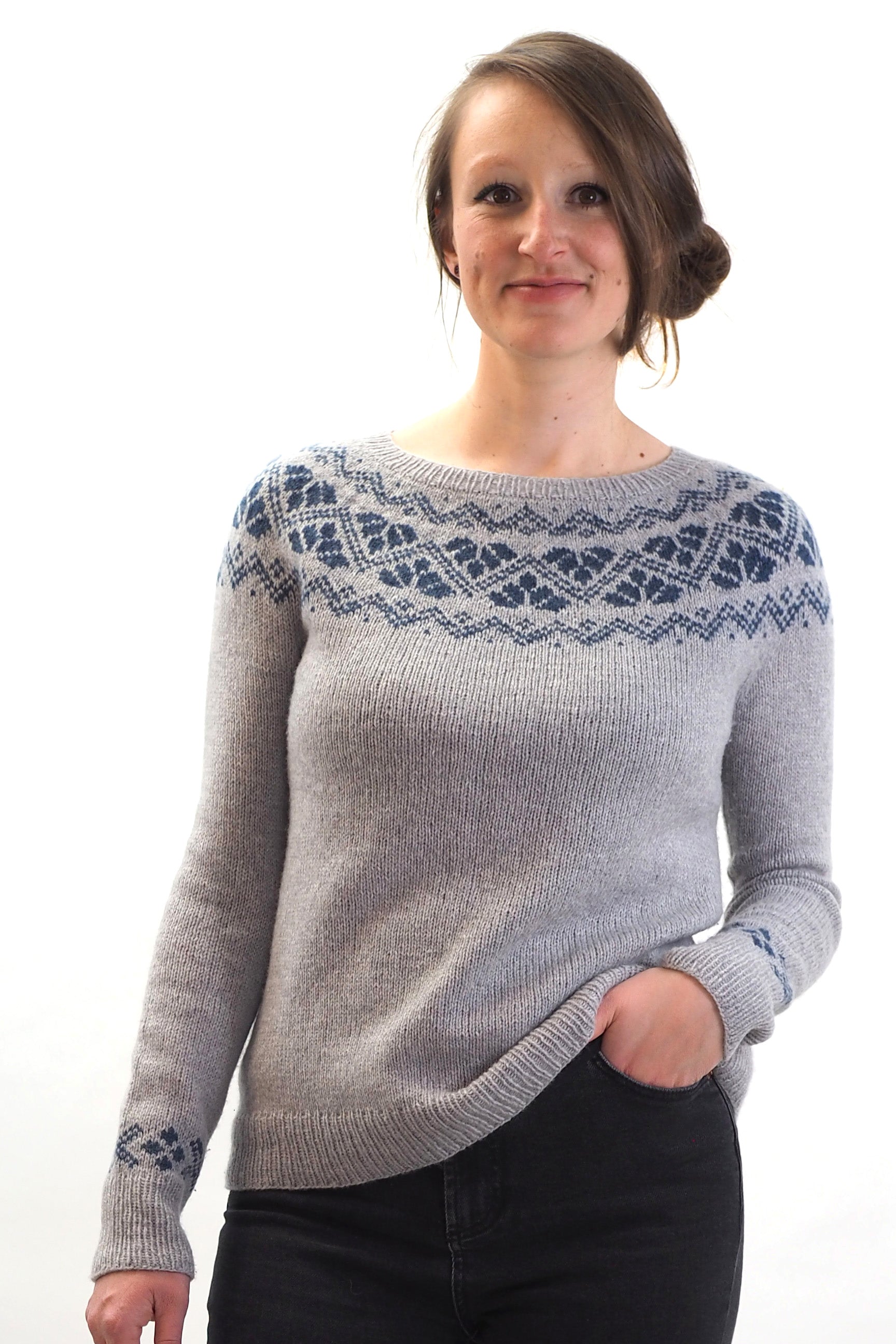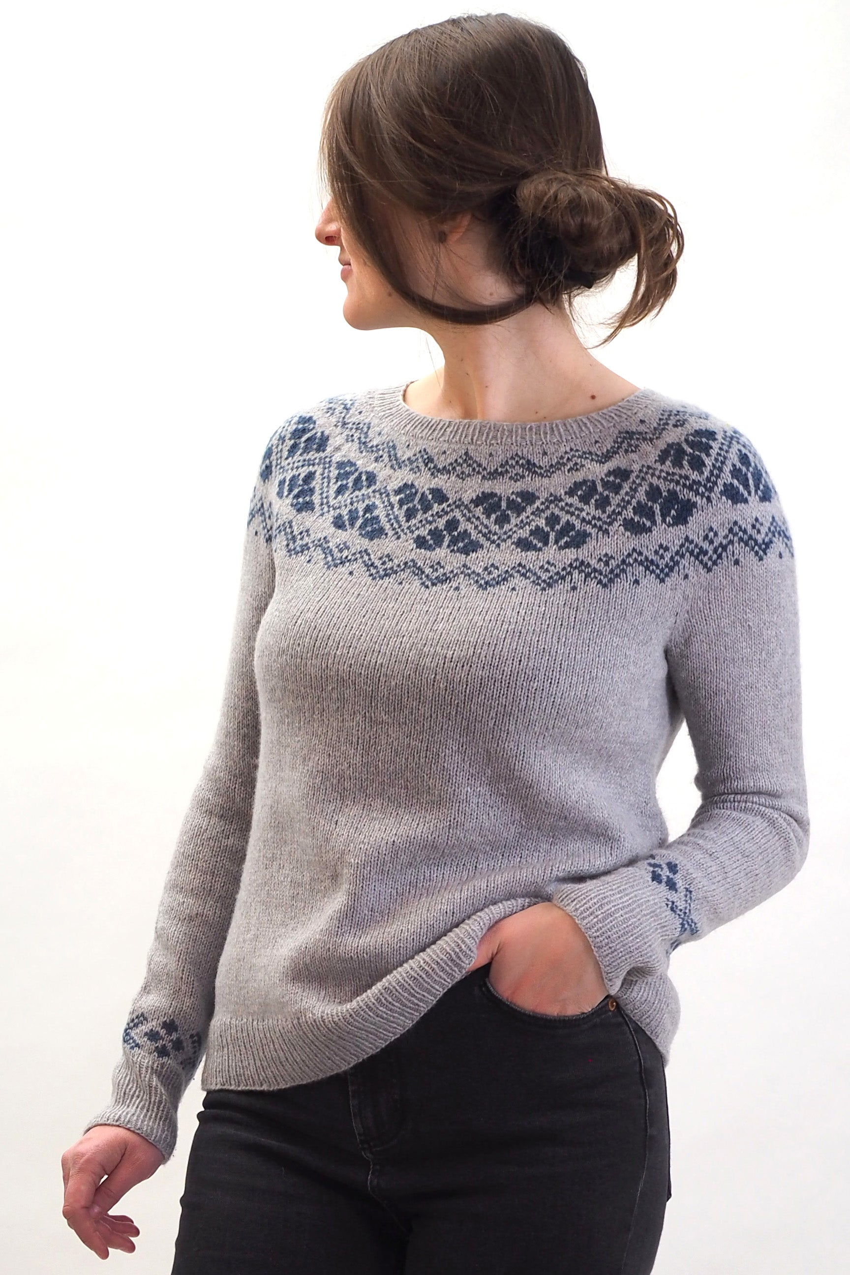 Verkürzte Reihen, Zunahmen m1L / m1R (rechts- und links-geneigte Zunahmen), Fair Isle-Muster in der Runde.