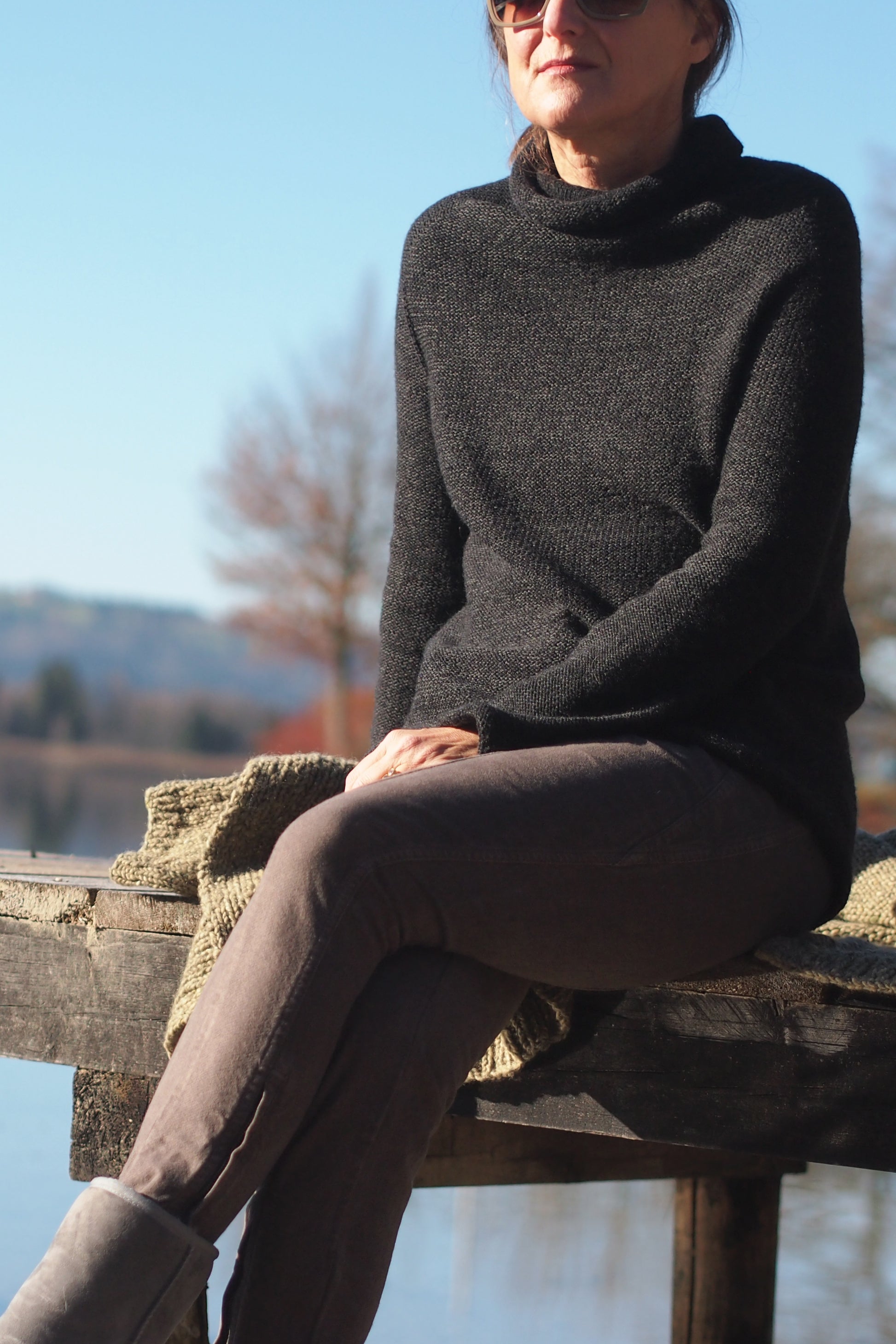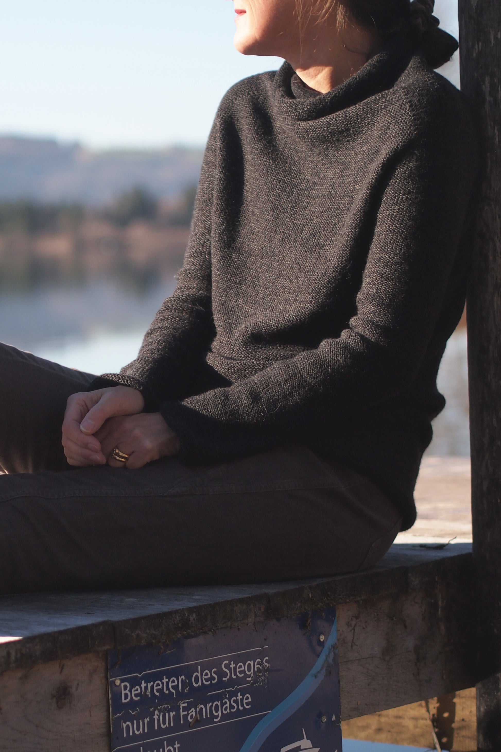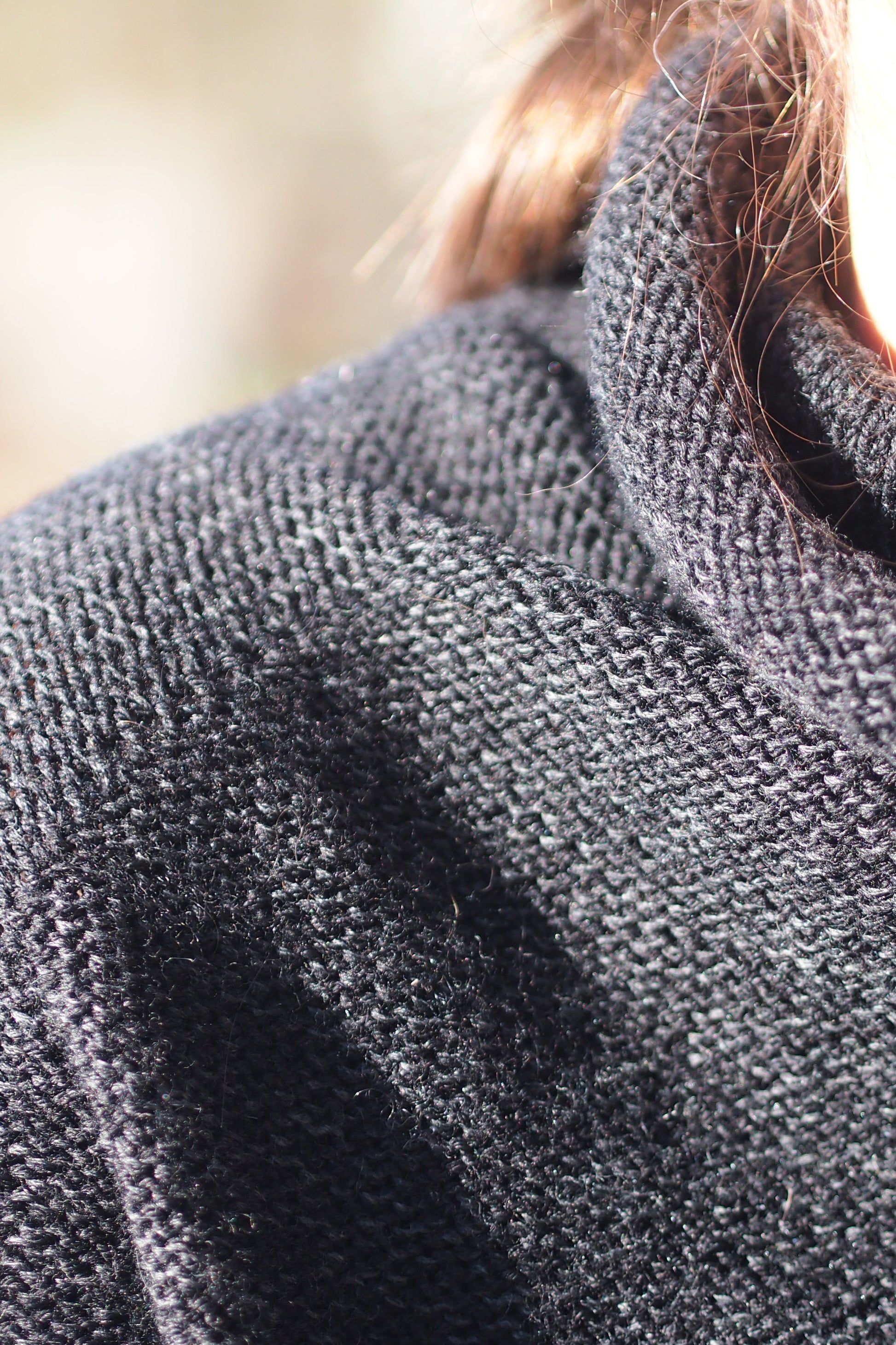 Das Musterteil wurde mit ITO Shio in der Farbe 444 charcoal und Spud&Chloë Fine in der Farbe 7825 Black Pepper, beide zusammen verarbeitet.
