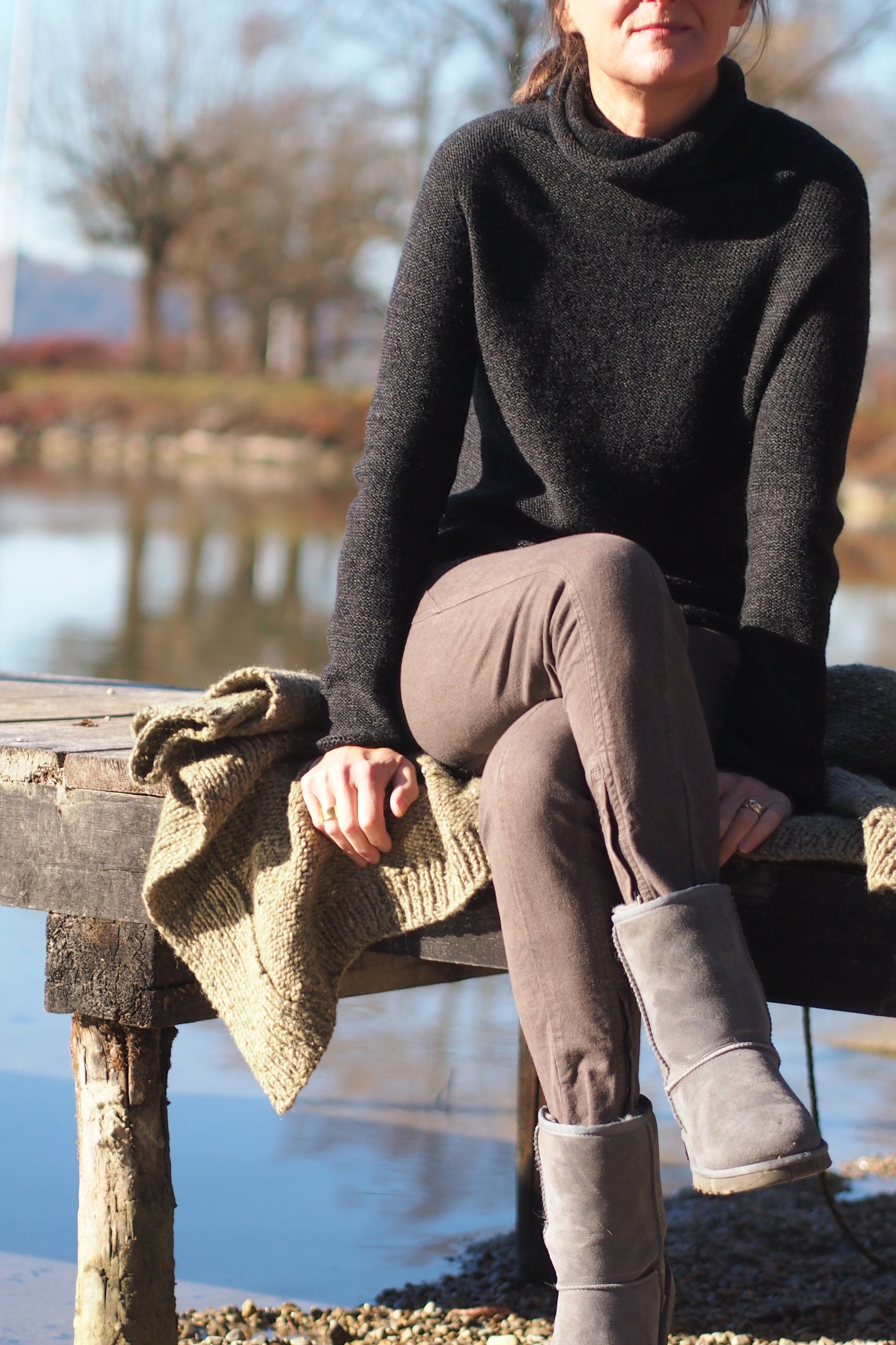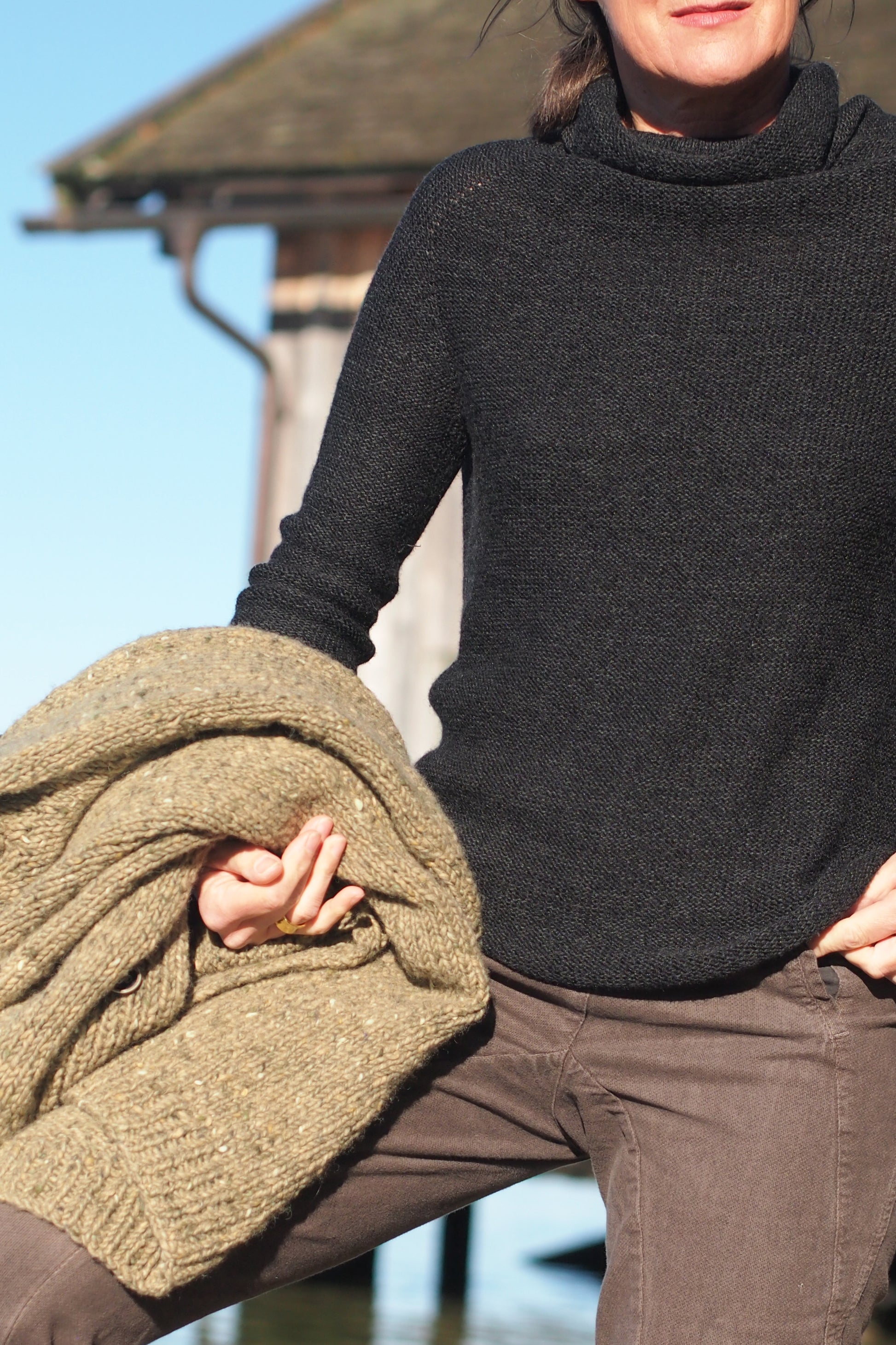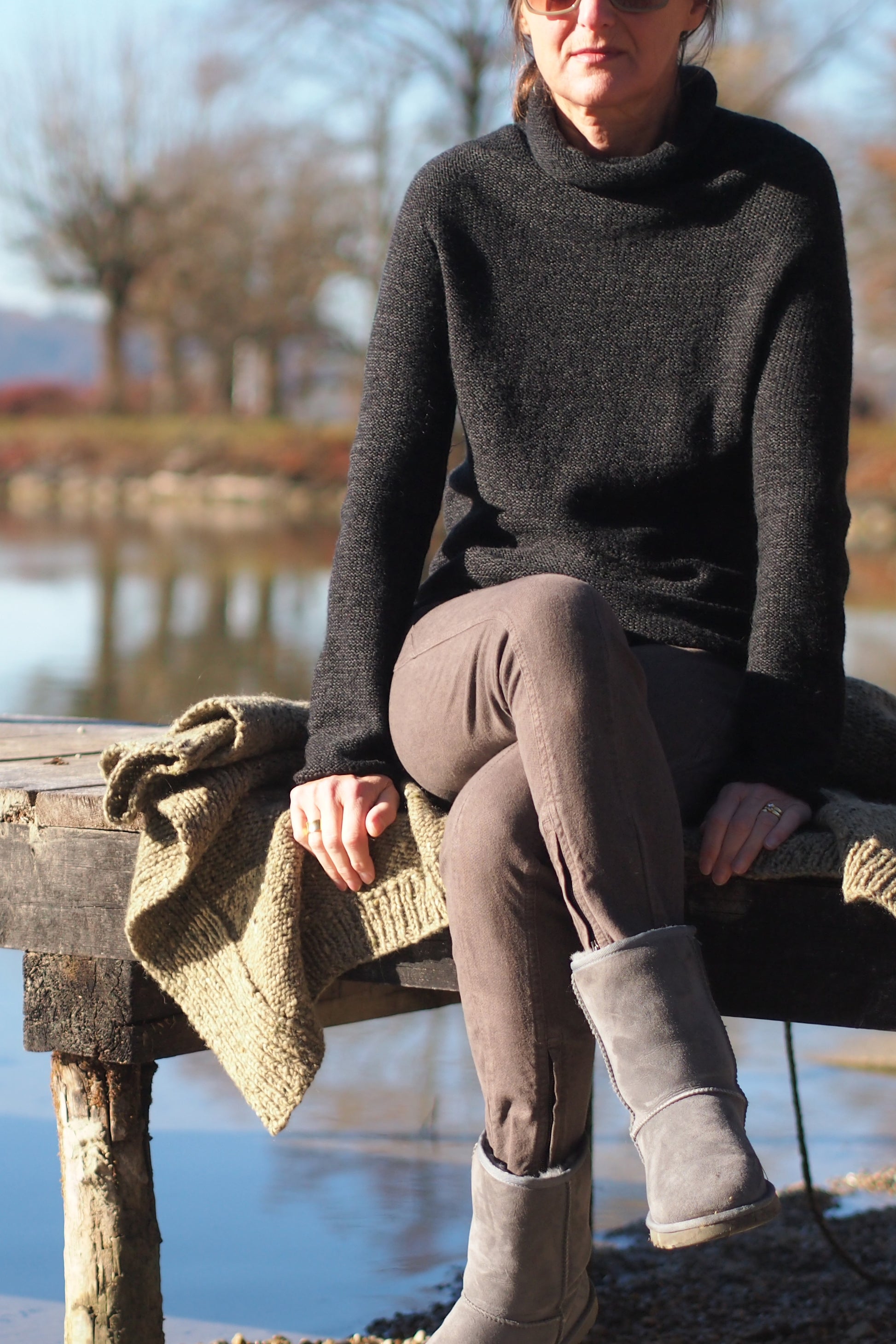 Das Musterteil wurde mit ITO Shio in der Farbe 444 charcoal und Spud&Chloë Fine in der Farbe 7825 Black Pepper, beide zusammen verarbeitet.