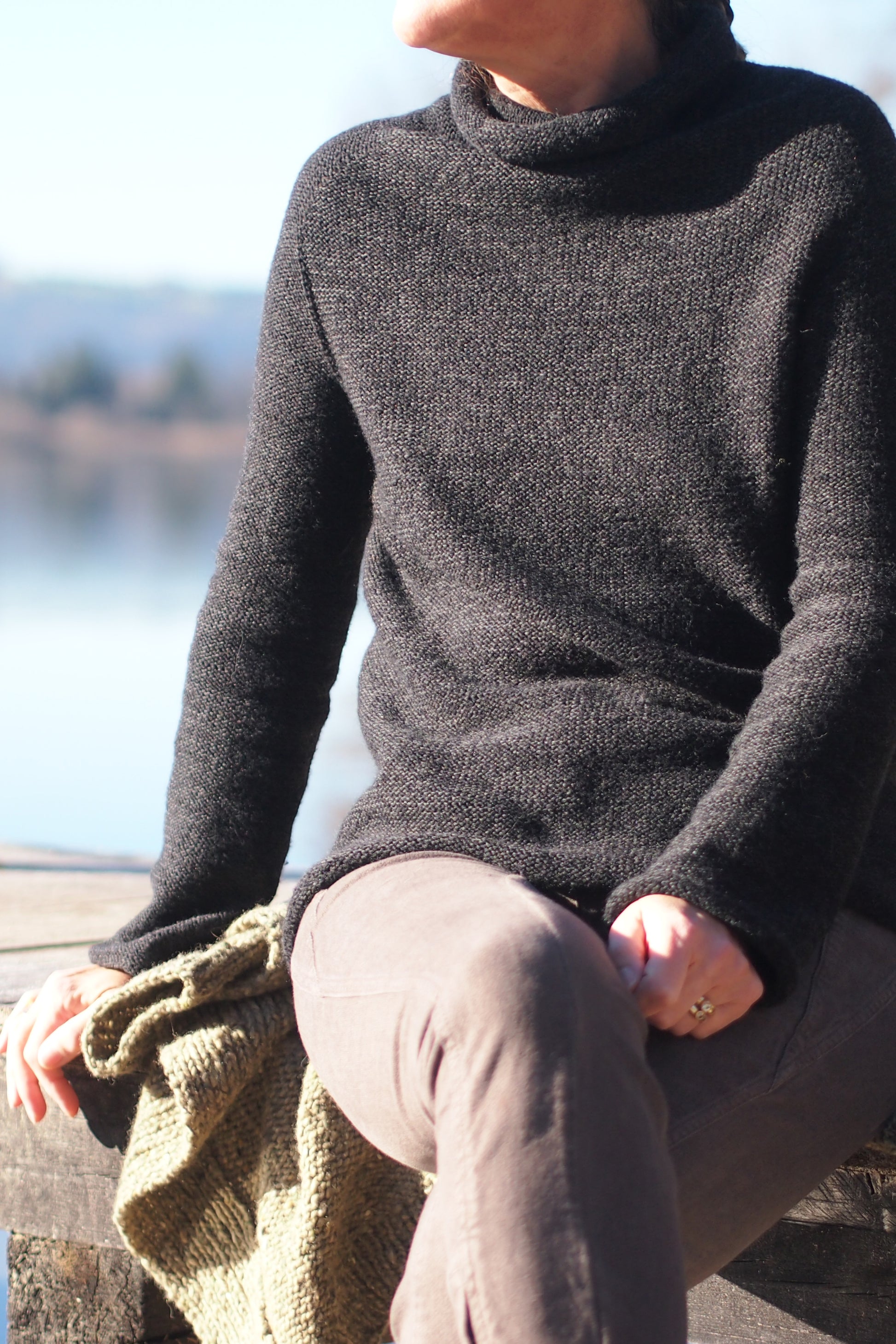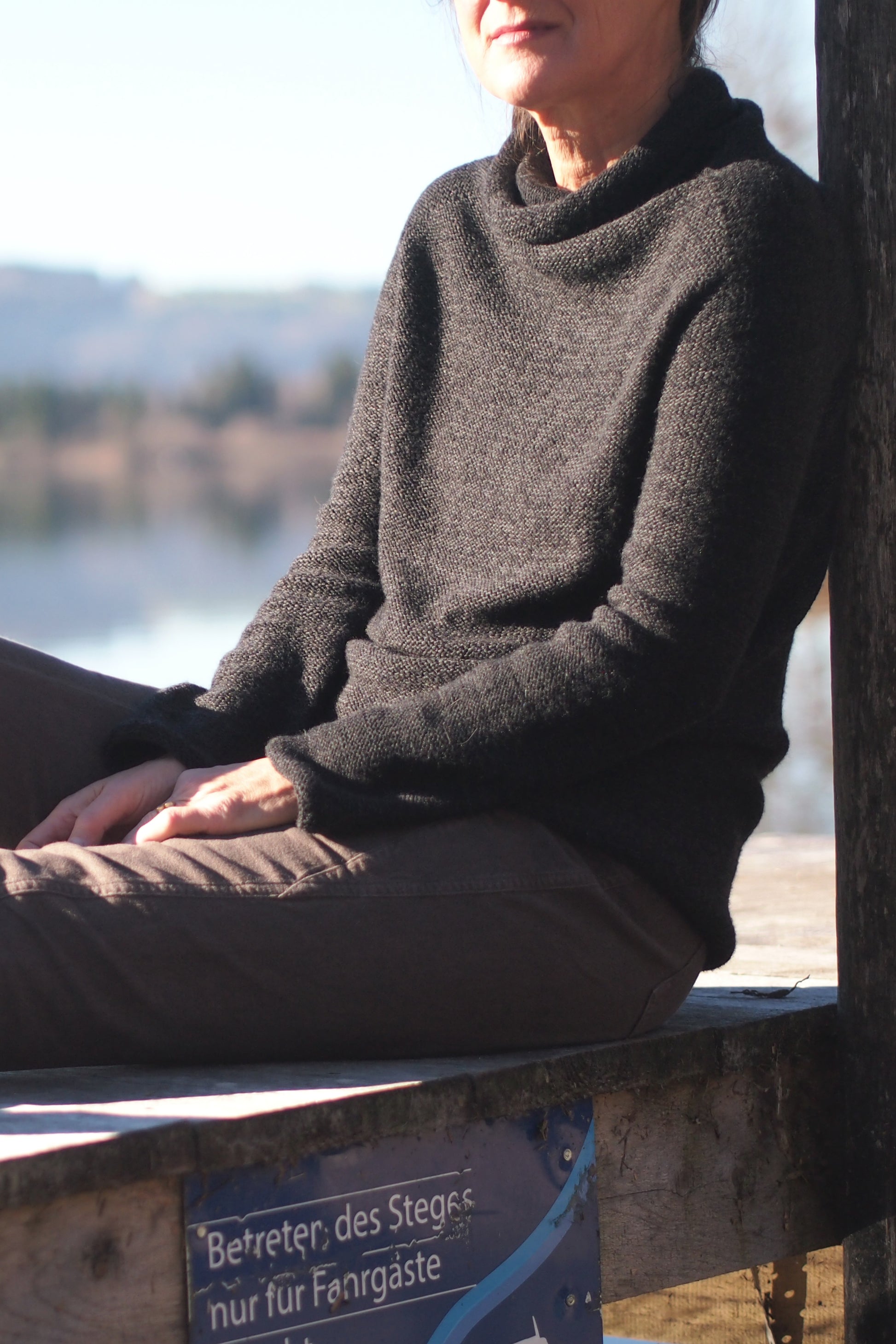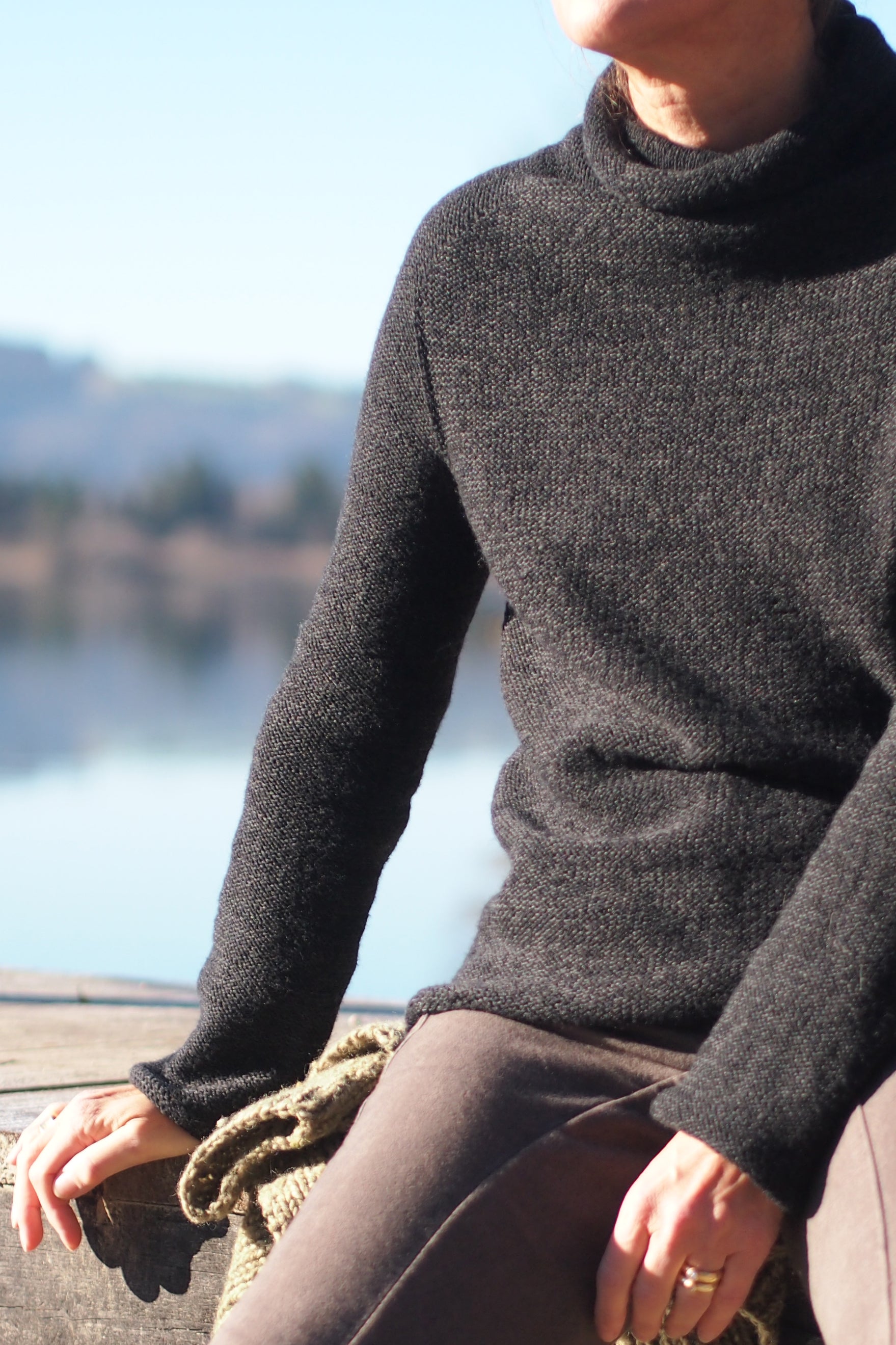 DARK SIDE OF THE MOON ist ein sehr schmeichelhafter, lässiger Rollkragenpullover, der von oben nach unten in Runden gestrickt wird. Die Schultern werden mit der Contiguous-Methode geformt. Der gesamte Pullover wird auf der Innenseite mit rechten Maschen gestrickt.