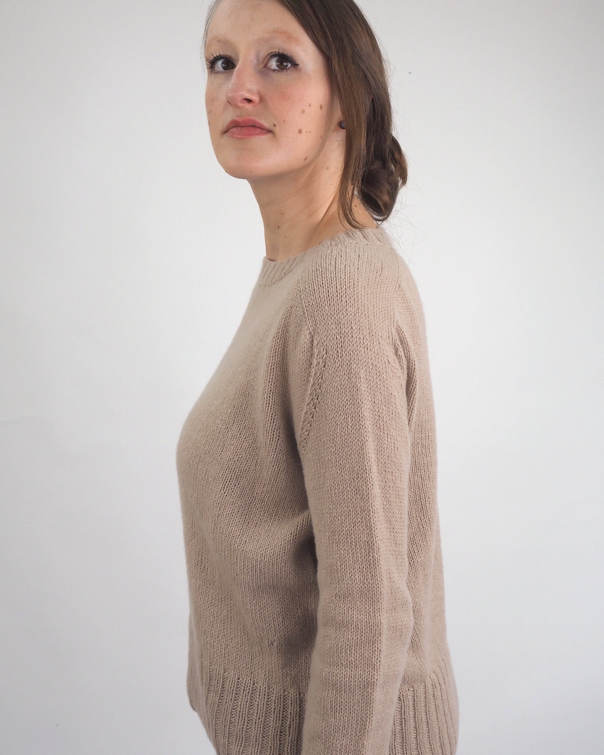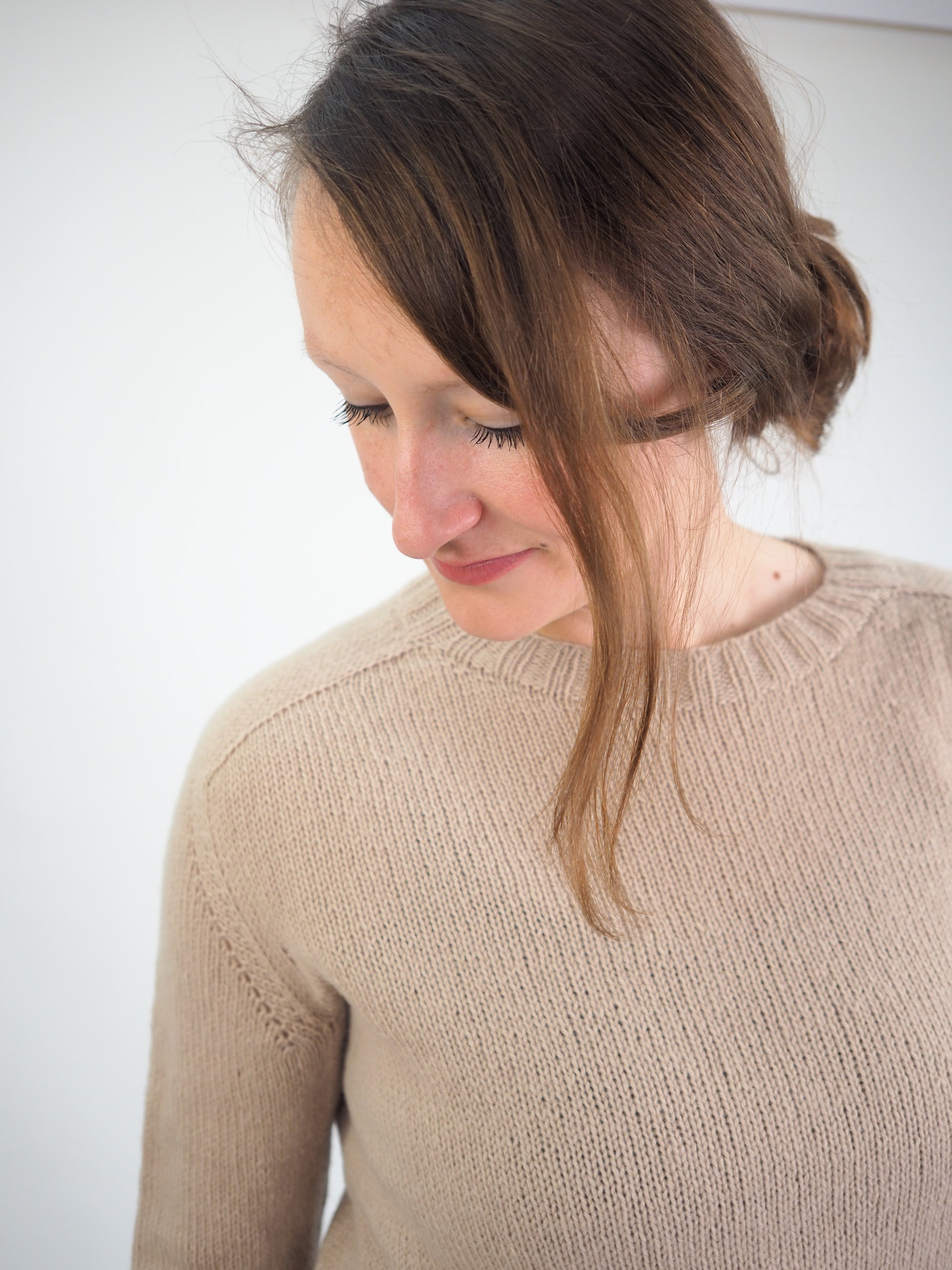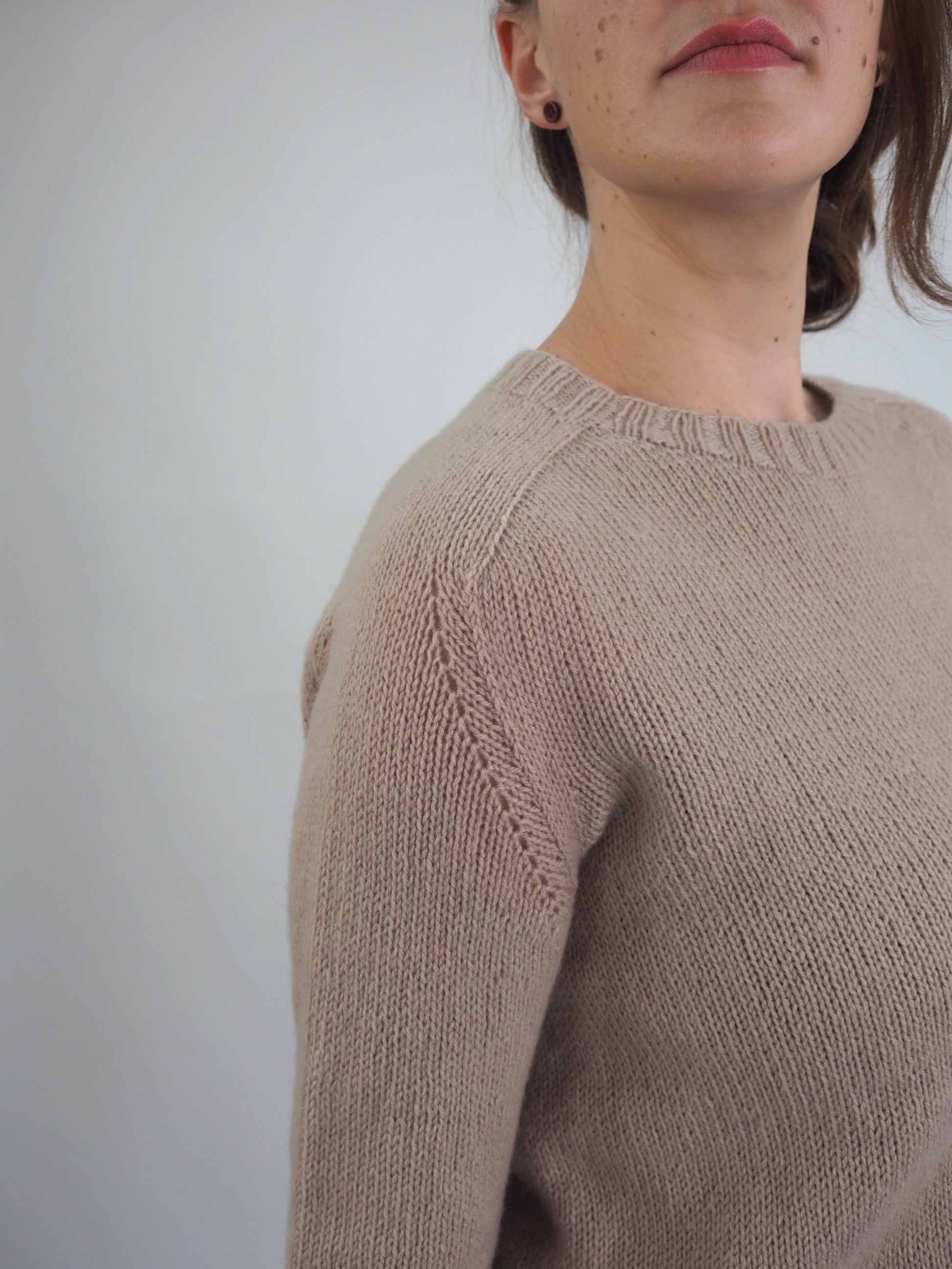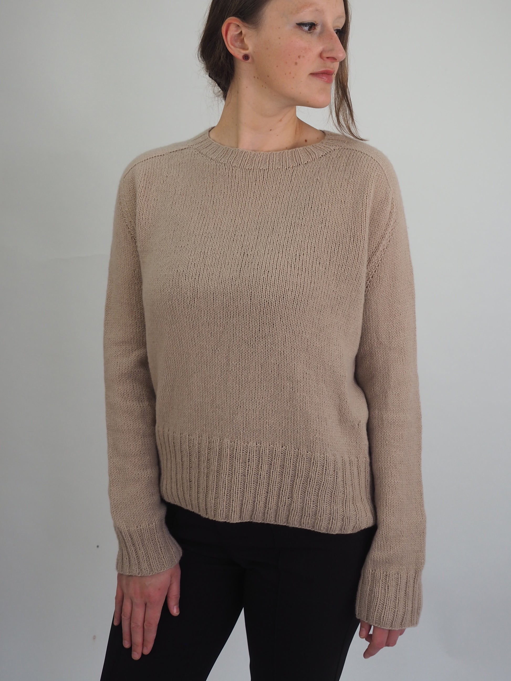 Unsere Variante des Contiguous Klassikers wird nahtlos von oben nach unten gestrickt. Die Schultern werden mit der Contiguous Methode nach Susie Myers geformt. Dann werden die Ärmel durch [1re, U, 1re] Zunahmen in die selbe Masche und gleichzeitige Abnahmen geformt. Der Bund, die Ärmelbündchen und das Halsbündchen werden im Rippenmuster [2re, 2li] gestrickt.