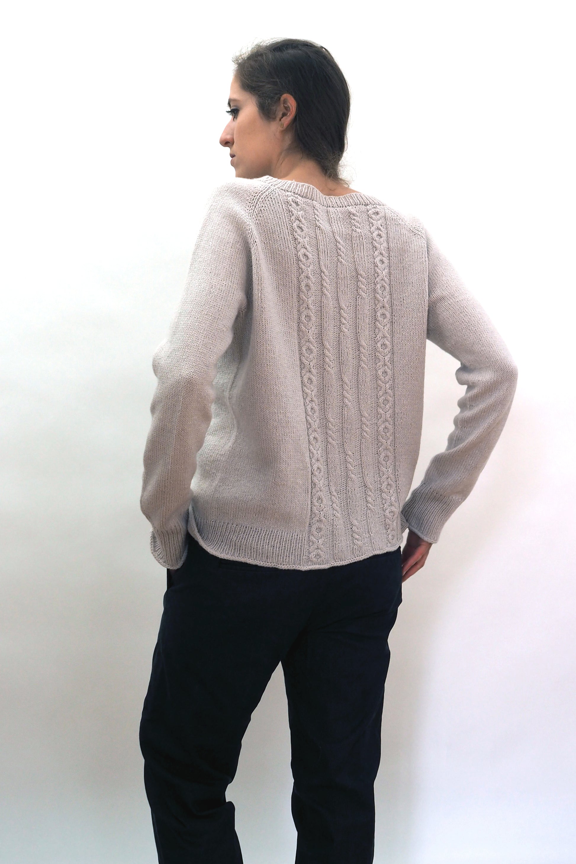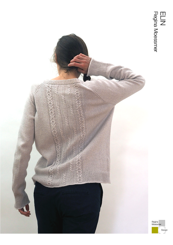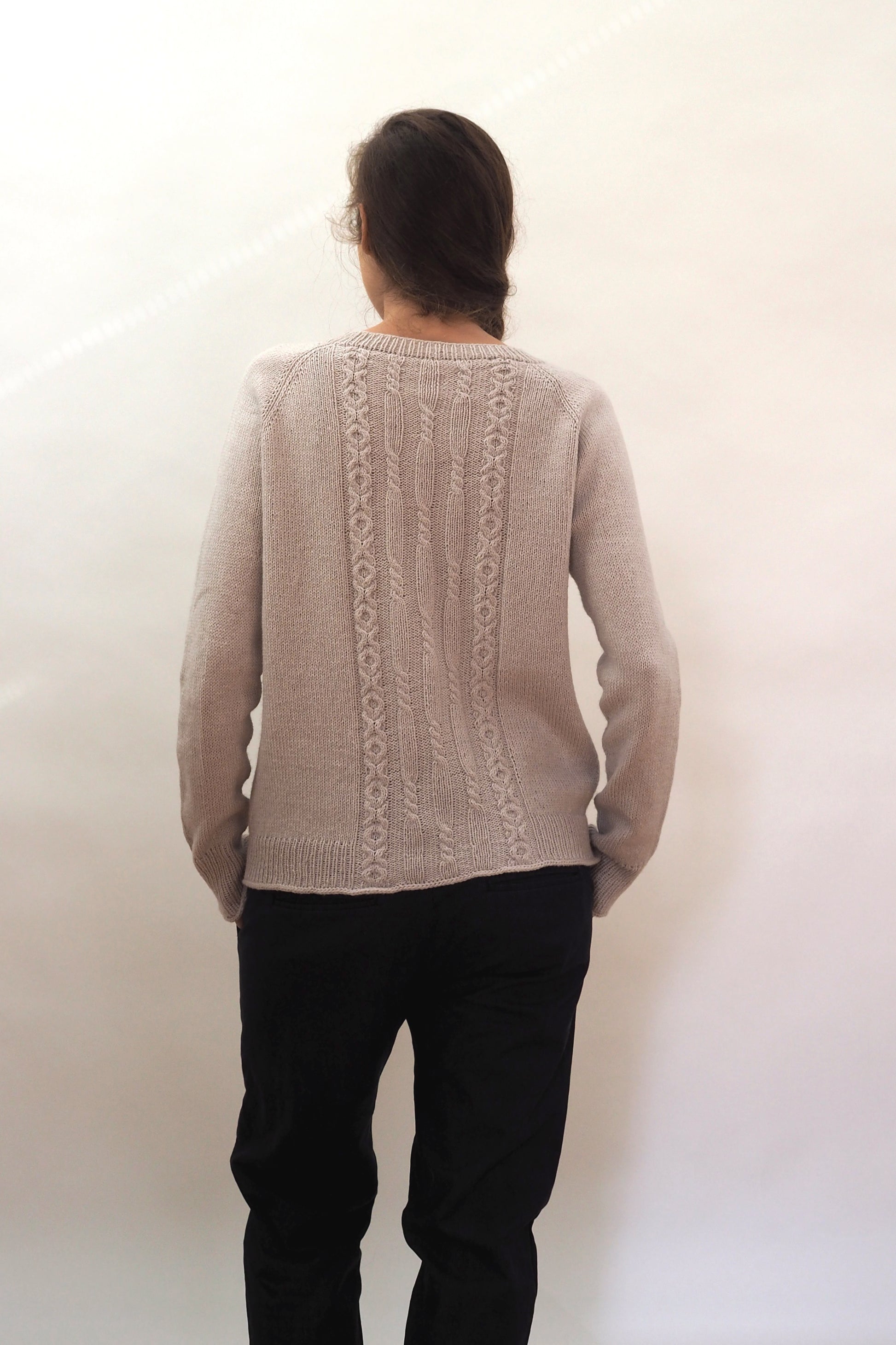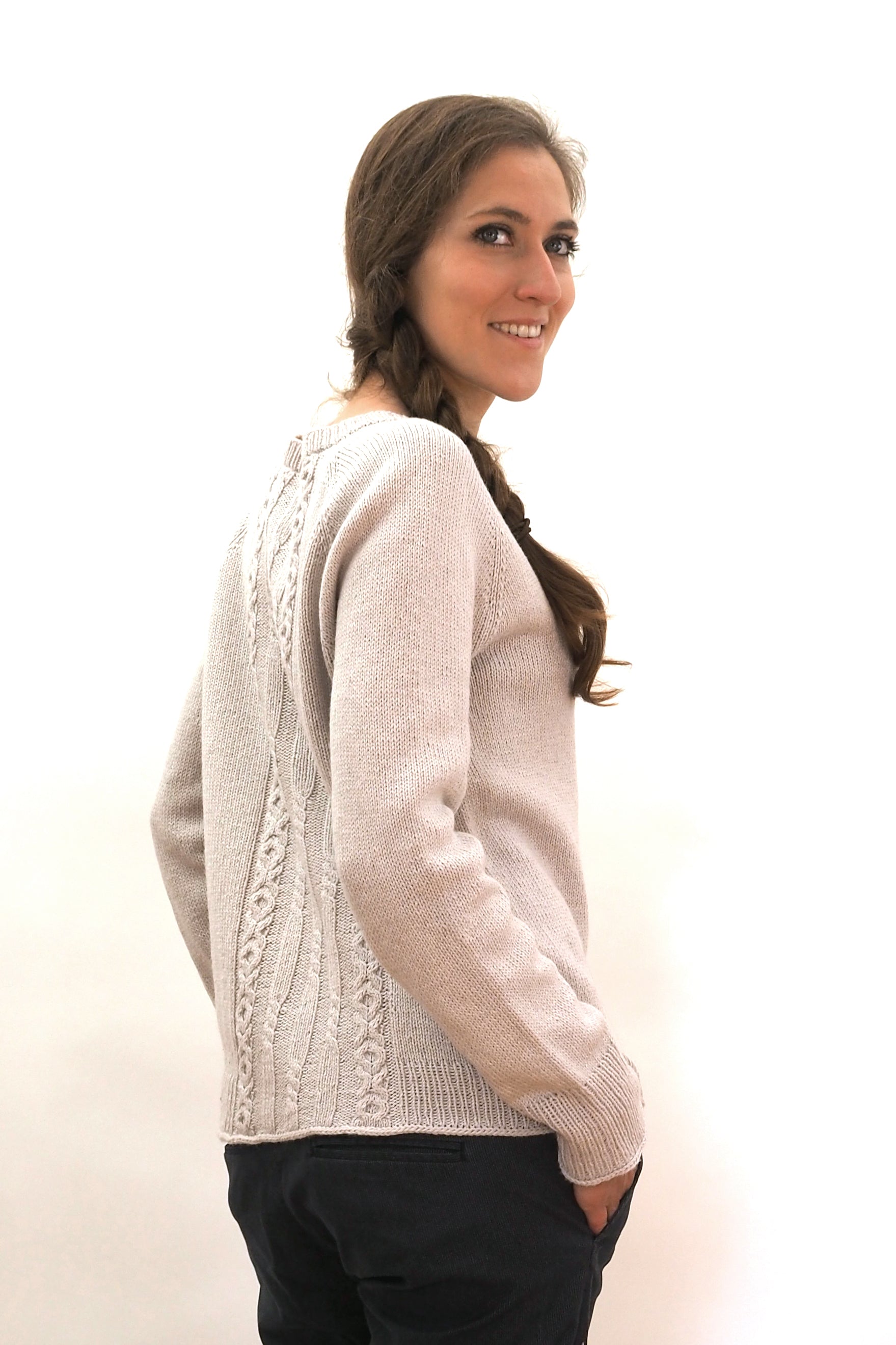 ELIN wird nahtlos von oben nach unten mit Raglanzunahmen und einer sanften A-Linien-Form gestrickt. Bis die V-Ausschnittformung erreicht ist, wird der Pullover in Reihen gestrickt und dann in der Runde gearbeitet. Das Zopfmuster auf der Rückseite ist sehr süss und einfach zu stricken.