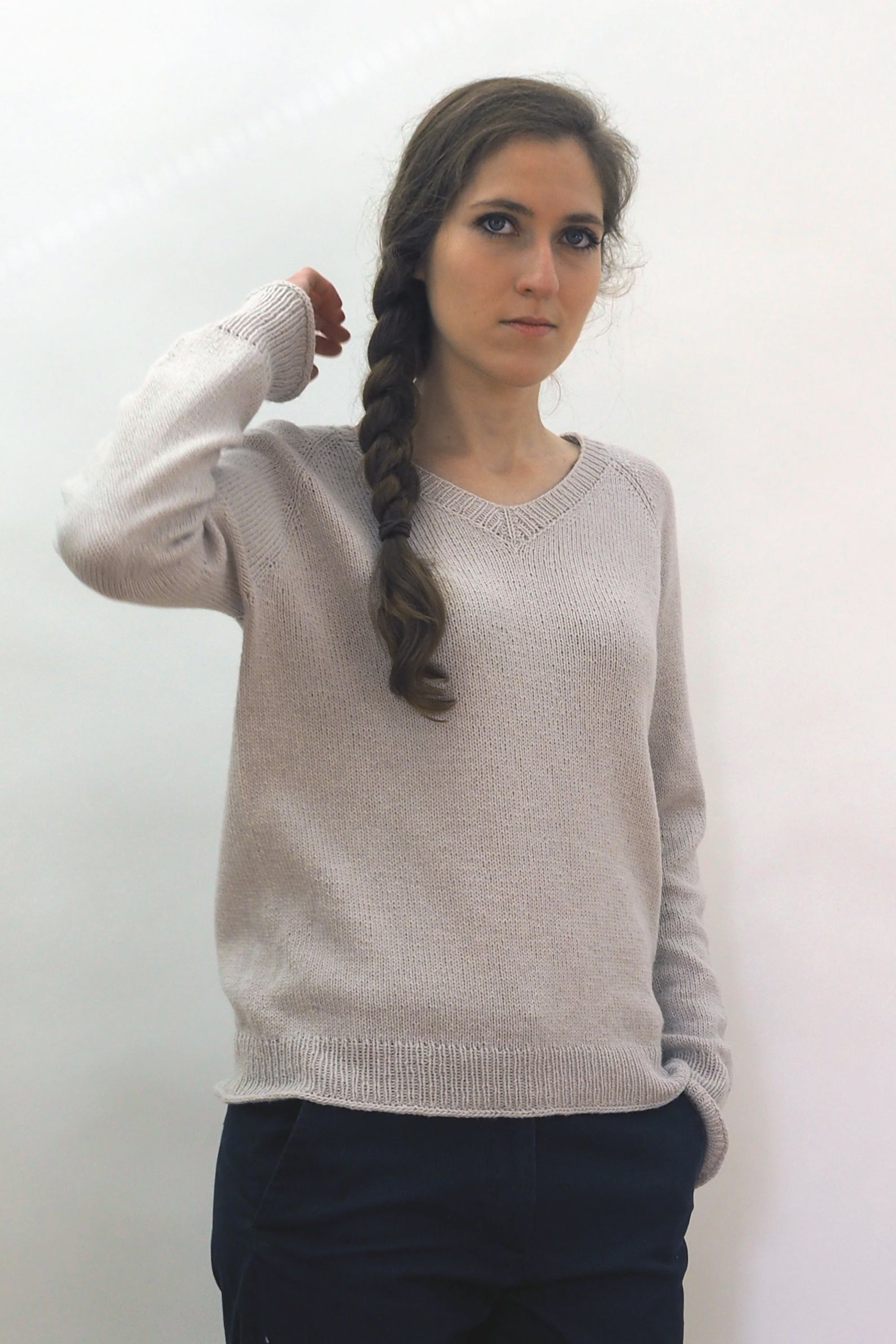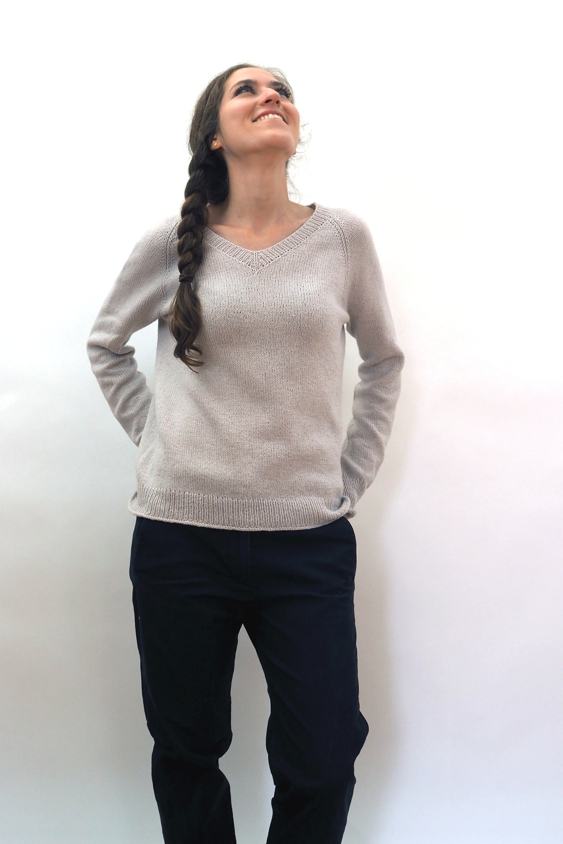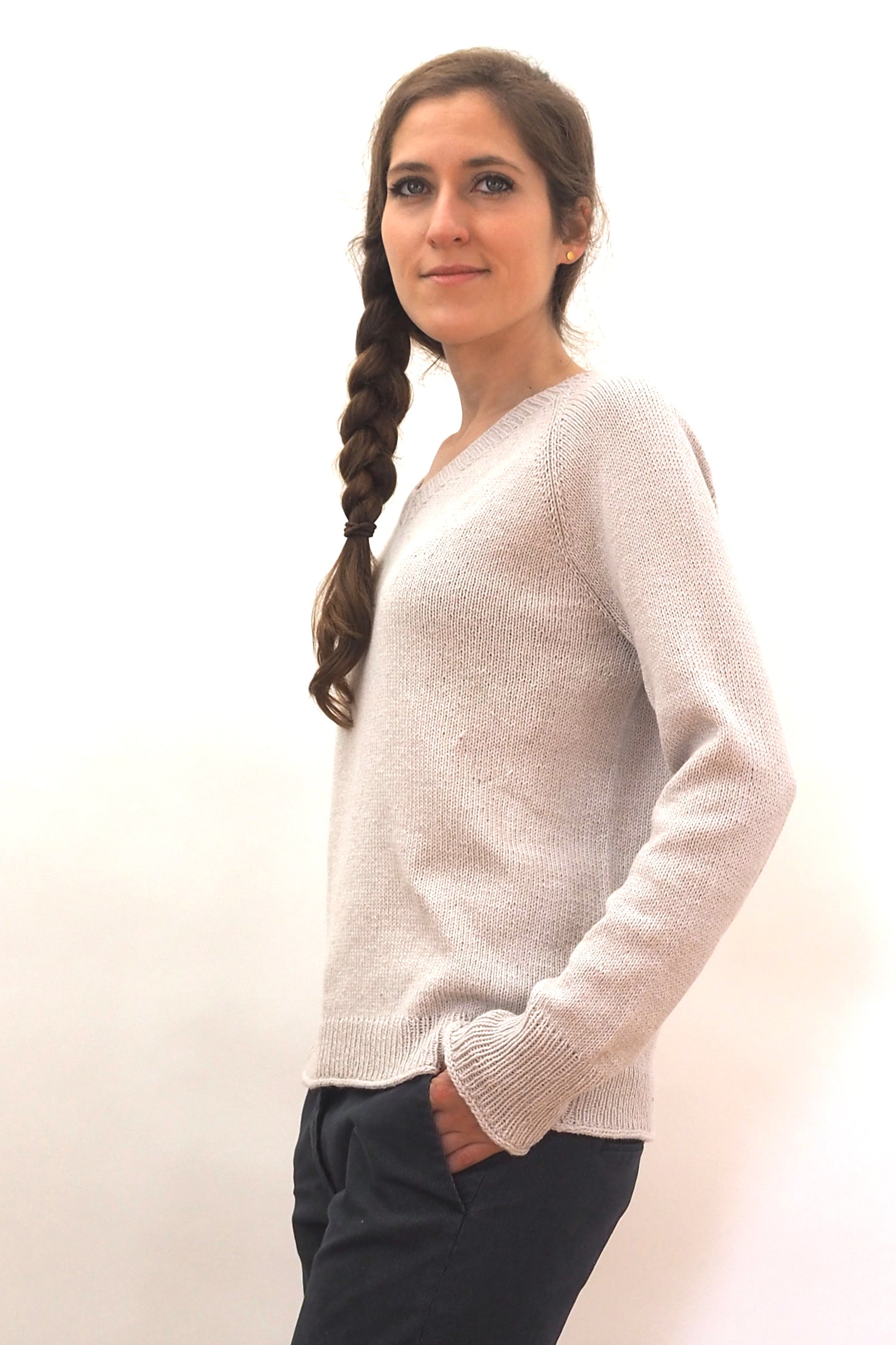ELIN wird nahtlos von oben nach unten mit Raglanzunahmen und einer sanften A-Linien-Form gestrickt. Bis die V-Ausschnittformung erreicht ist, wird der Pullover in Reihen gestrickt und dann in der Runde gearbeitet. Das Zopfmuster auf der Rückseite ist sehr süss und einfach zu stricken.