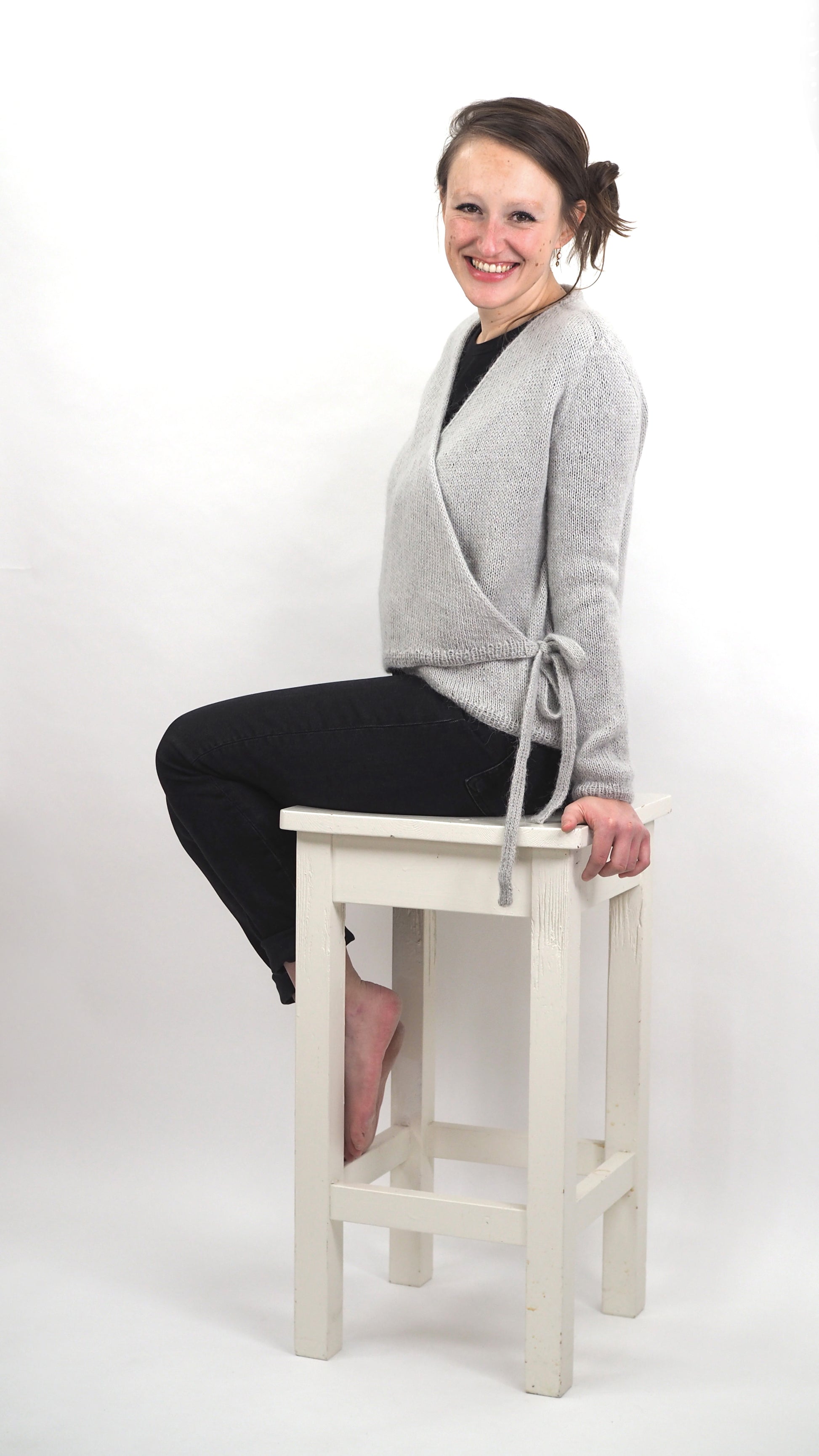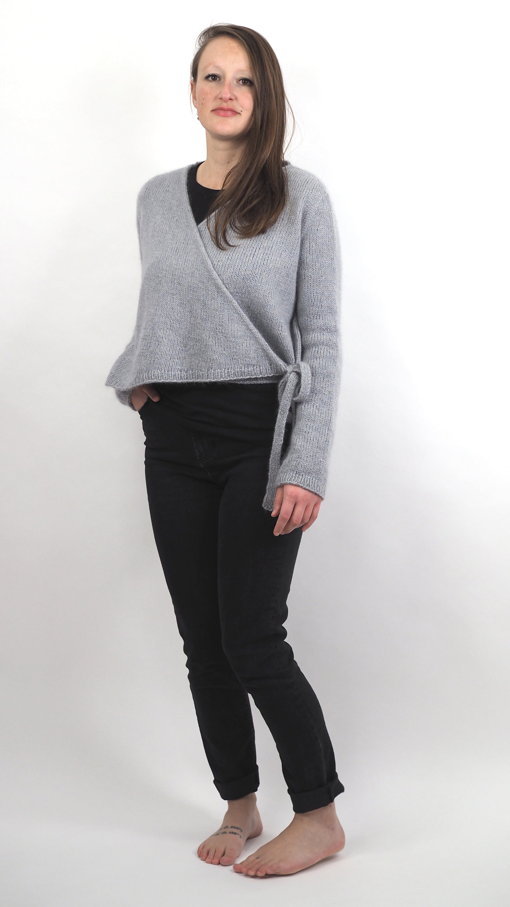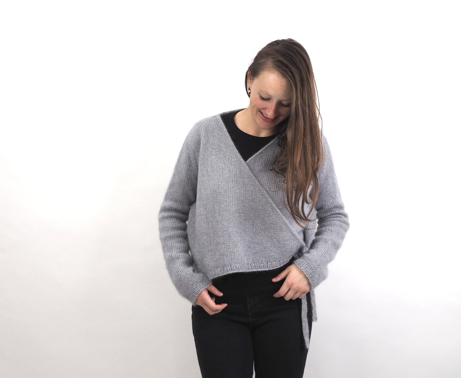 Dieser süße Wickel-Cardigan mit abgerundetem Saum wird nahtlos von oben nach unten gestrickt. Die Schultern werden mit der "Contiguous"-Methode von Susie Myers geformt. Die vordere Linie wird mit schrägen Zunahmen geformt, die fortgesetzt werden, bis beide Vorderteile fast die Breite des Rückenteils erreichen, nachdem die Ärmel abgetrennt wurden. Die Vorderteile werden am Saum mit verkürzten Reihen abgerundet. Die Bänder zum Verschließen des Cardigans werden gestrickt und ein Knopf mit einer Schlaufe wird an der rechten Seitennaht angenäht. Die Bänder und alle Bündchen werden im Rippenmuster [rechts, links] gestrickt.