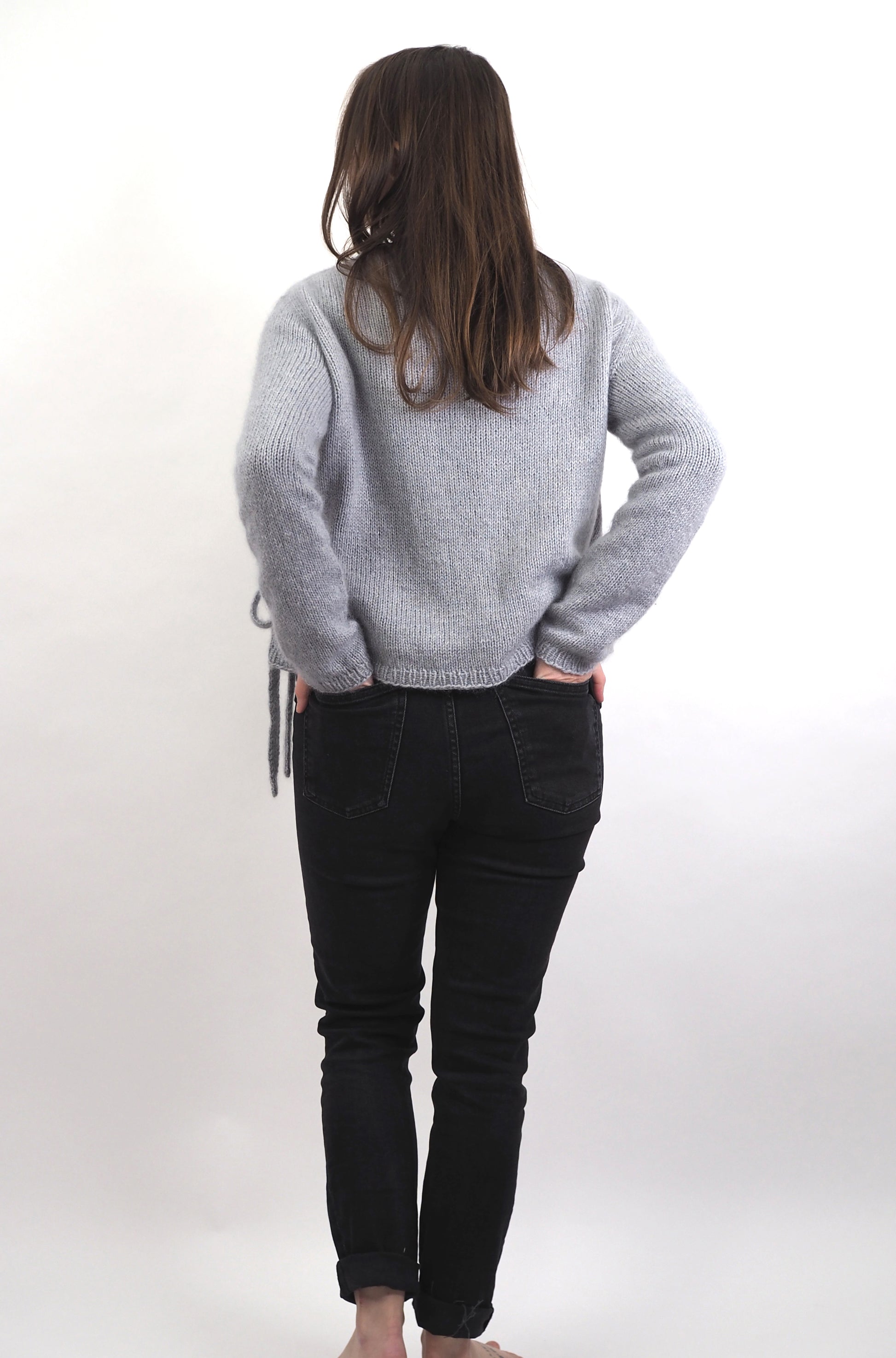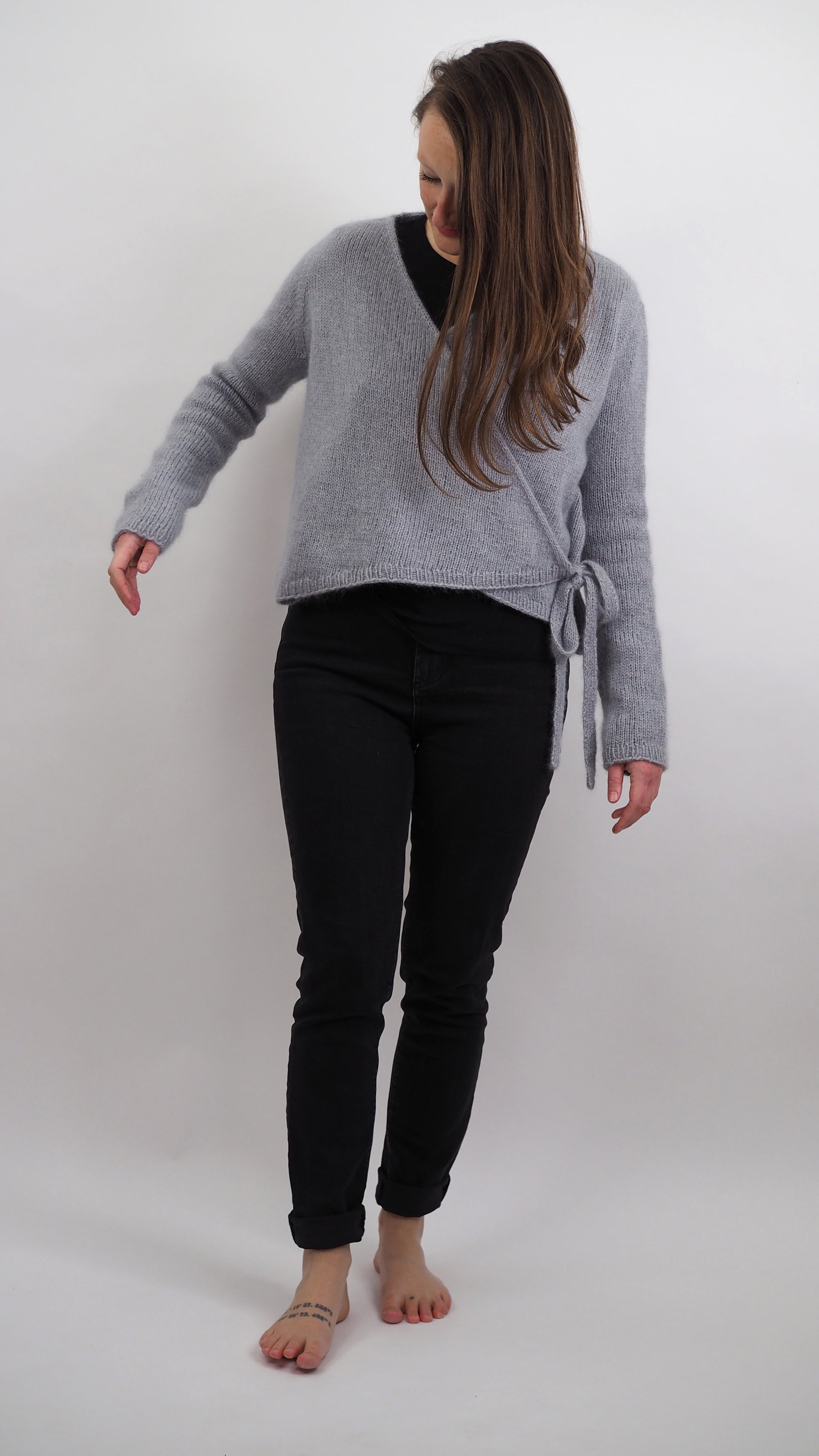 Das Musterteil ist mit LAMANA Verona gestrickt, 50% Wolle (feine Merinowolle), 30% Seide, 20% Kaschmir, Farbe 03 Seidengrau, und LAMANA Cusi, 60% Mohair (Super Kid), 40% Seide, Farbe 03 Seidengrau. Beide Garne werden doppelfädig gestrickt.