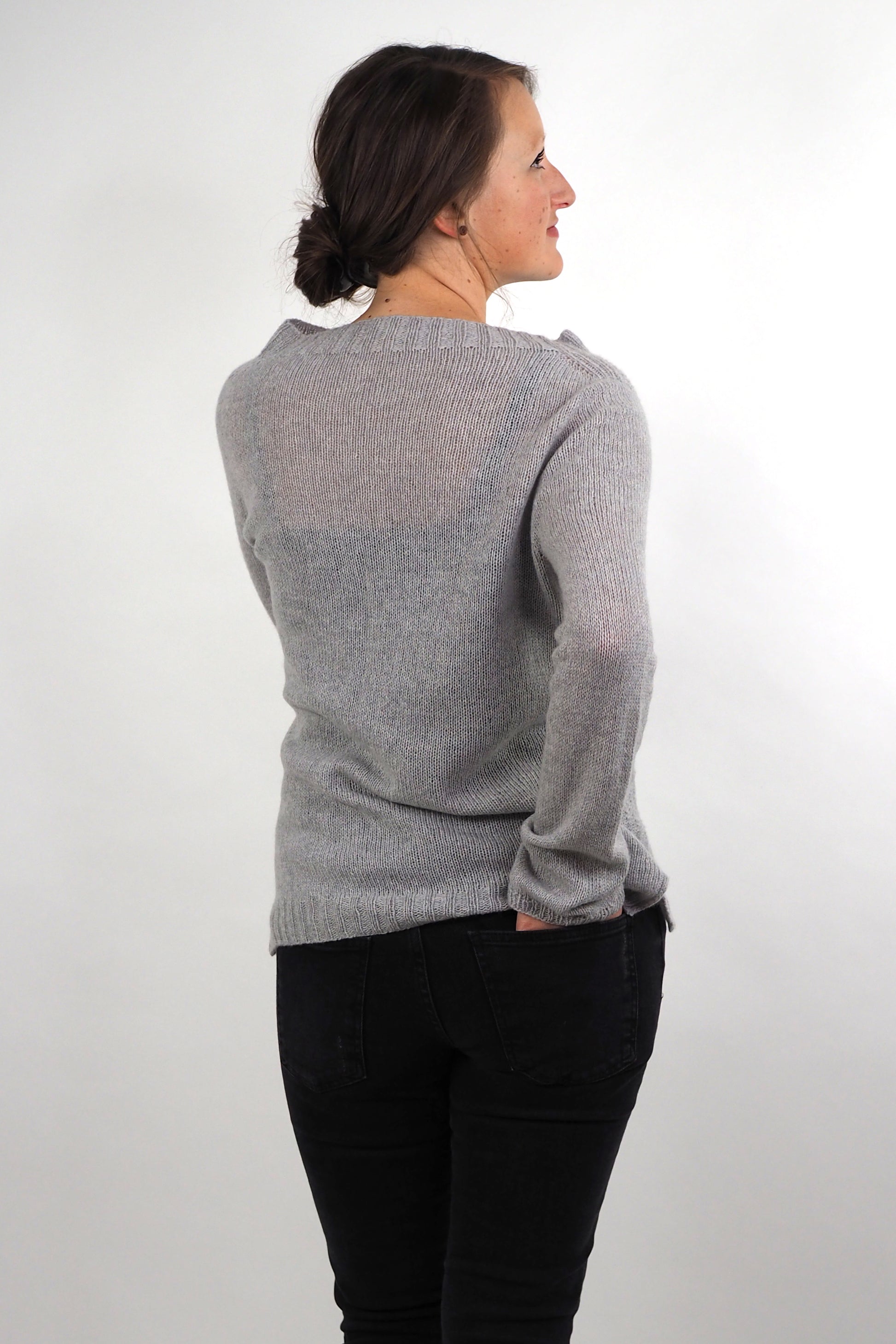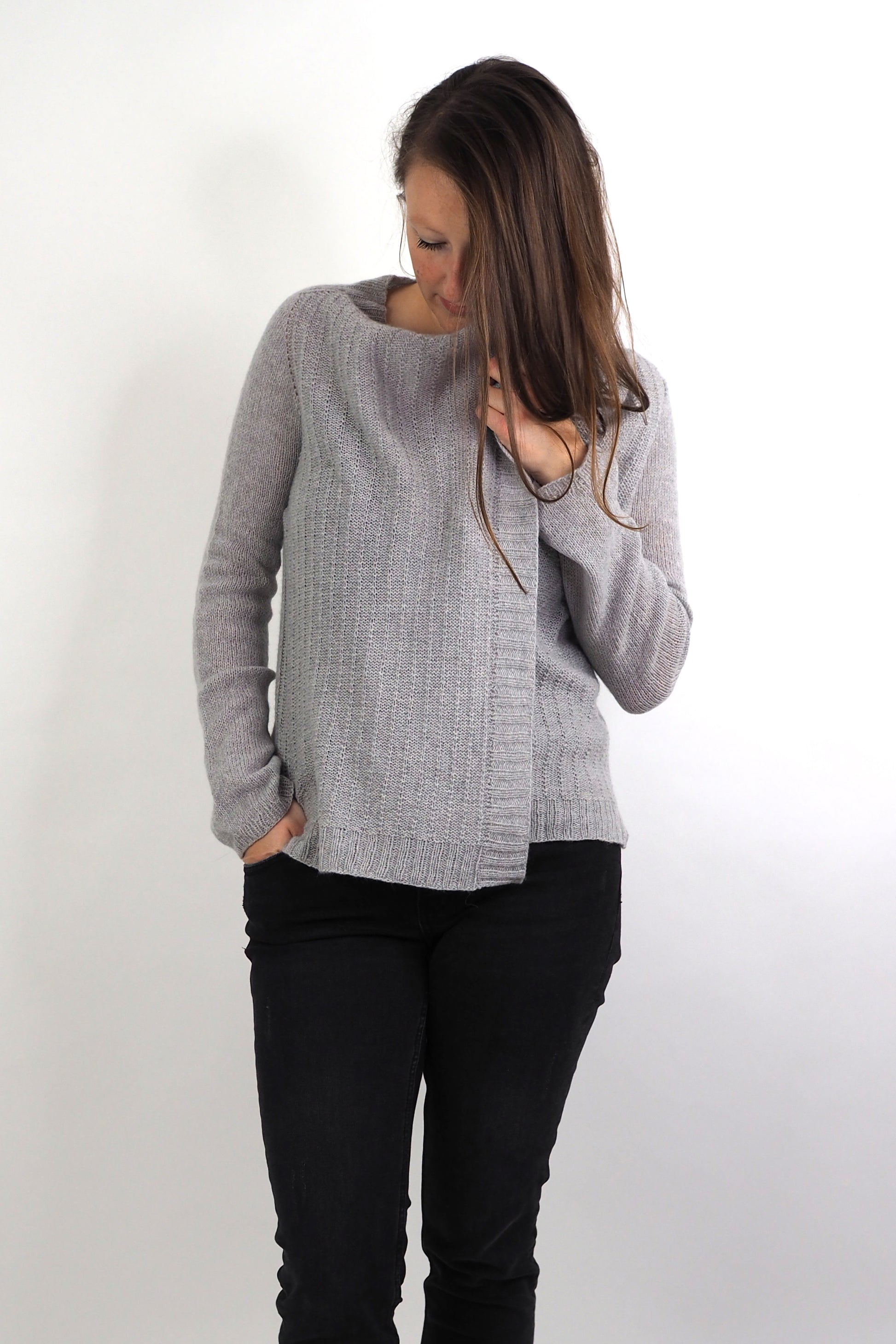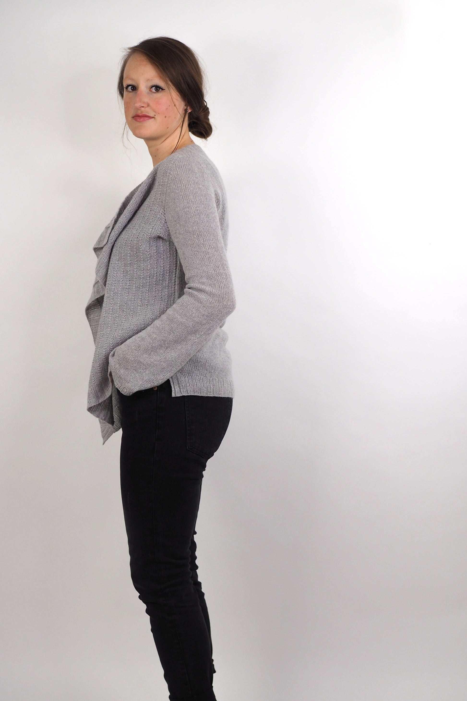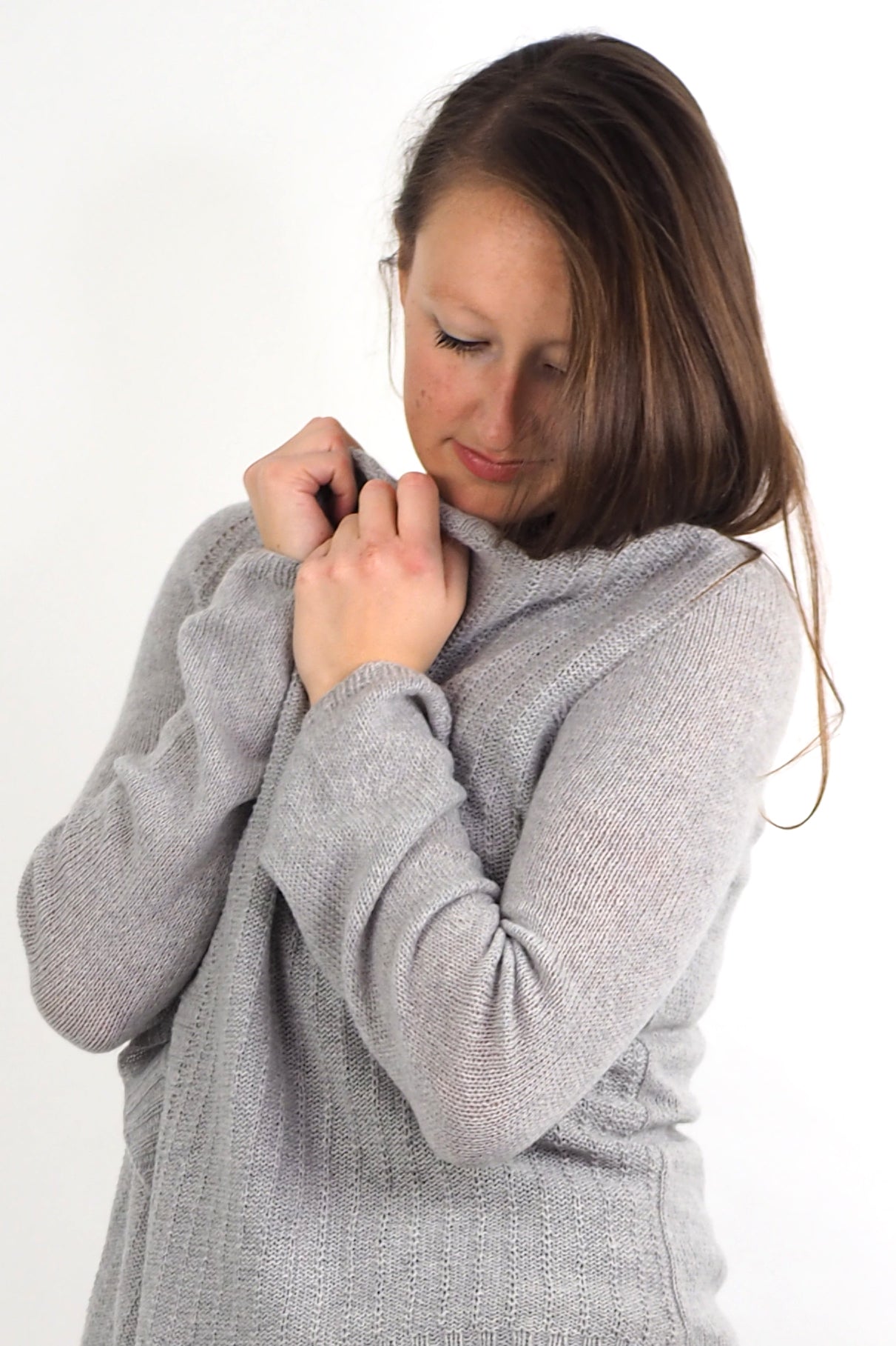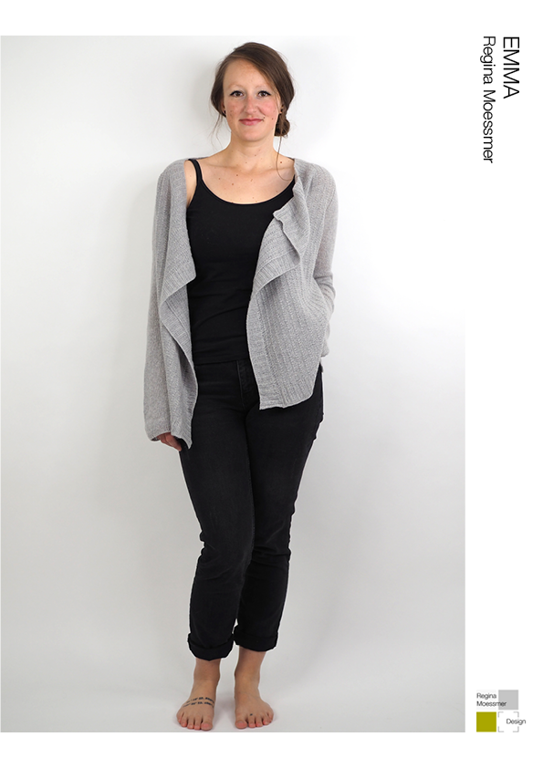 EMMA wird nahtlos von oben nach unten in Reihen gearbeitet. Der Hals- und Frontbereich wird im Rippmuster [2re, 2li] ohne Knopflöcher gearbeitet, der Halsausschnitt wird durch deutsche verkürzte Reihen geformt, die Schultern durch fortlaufende Zunahmen. EMMA hat einen geteilten Bund, der hinten länger ist.