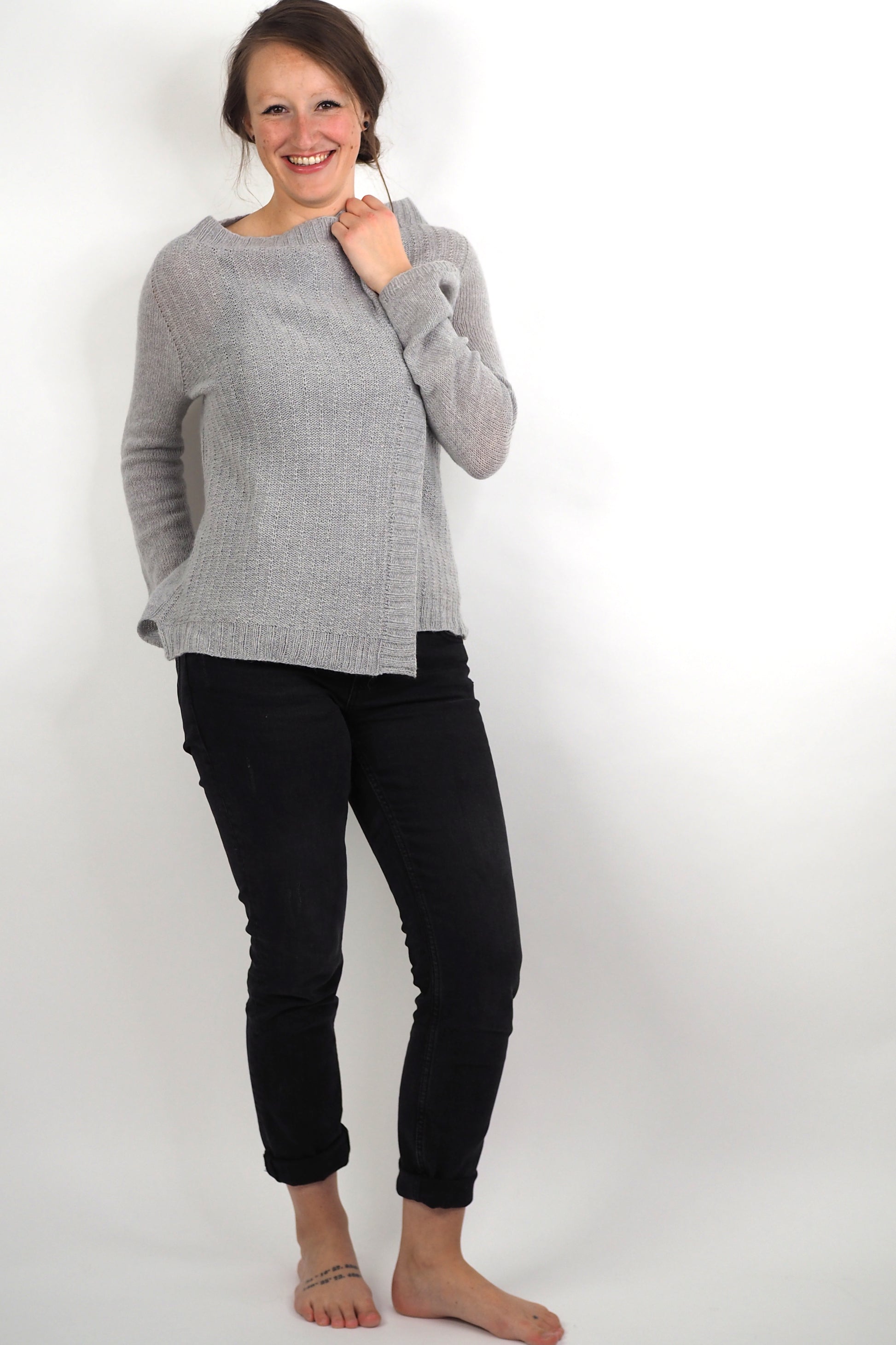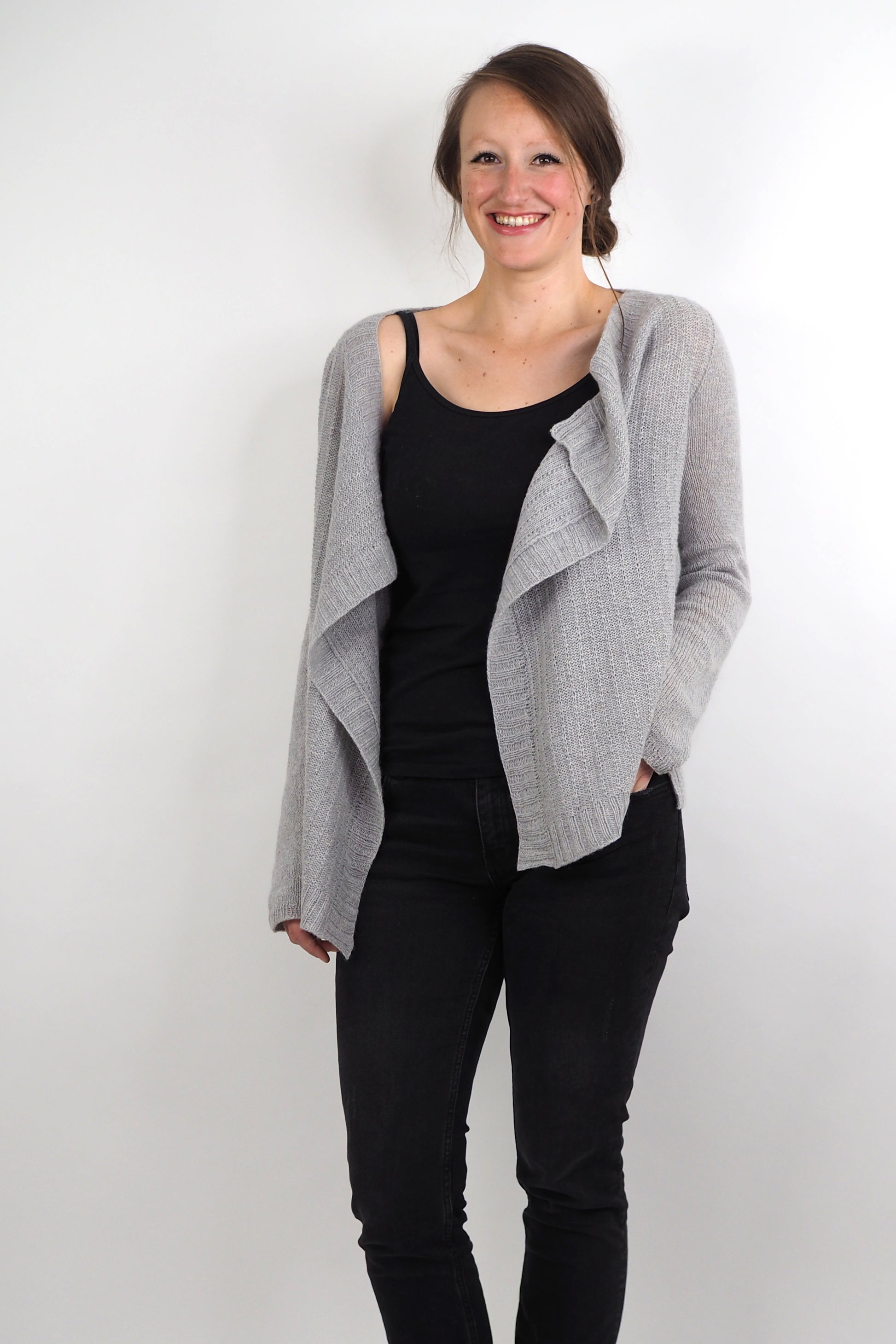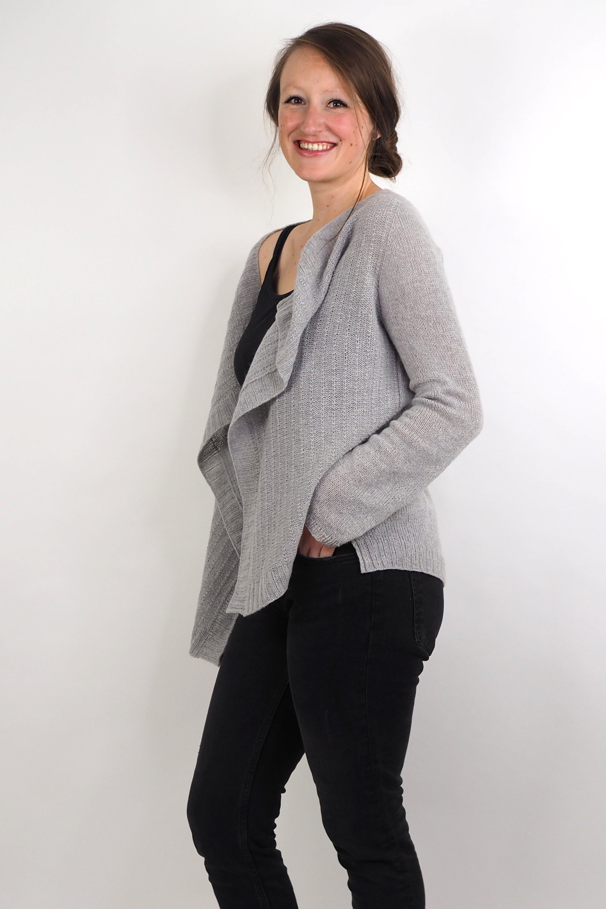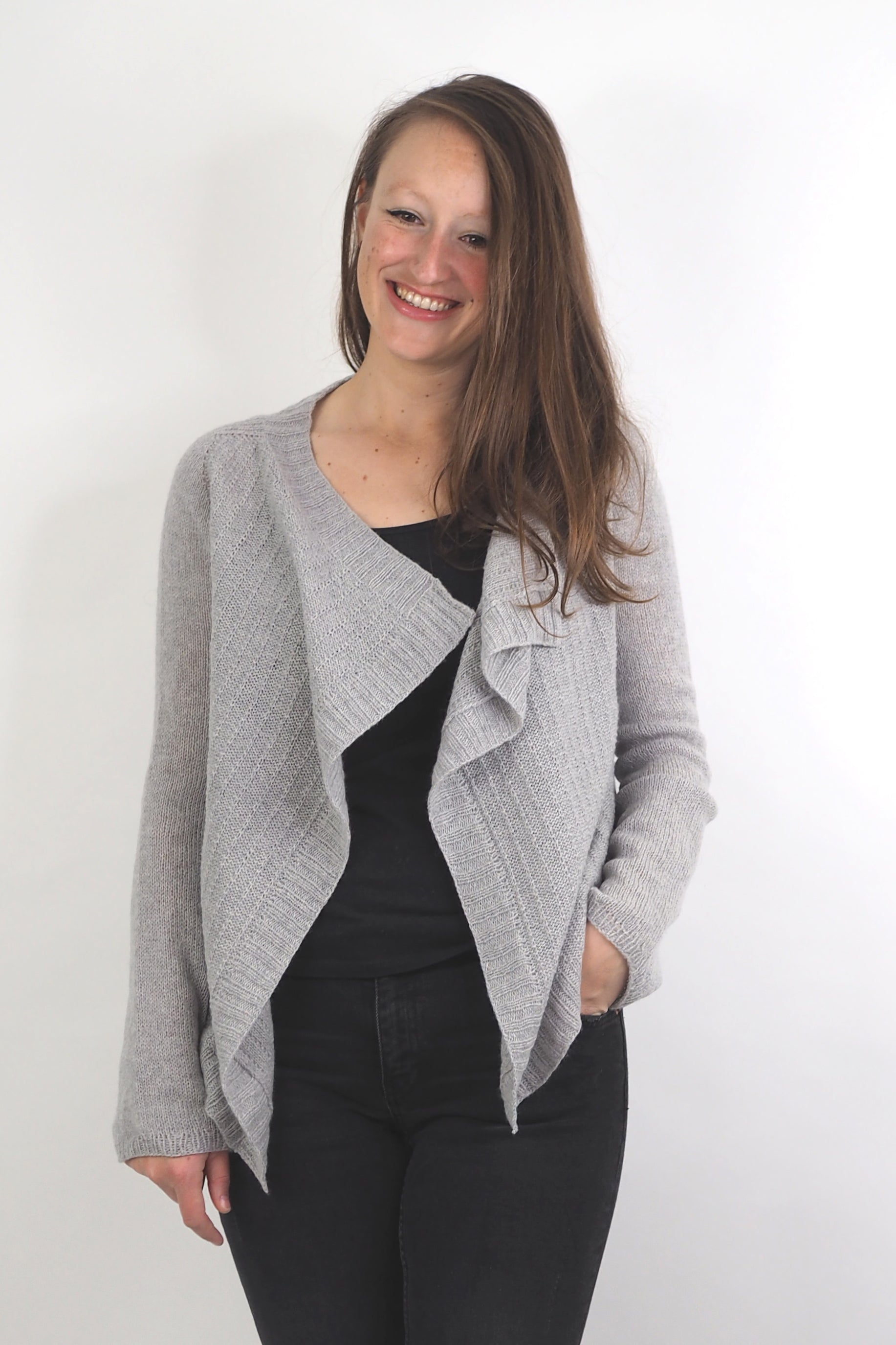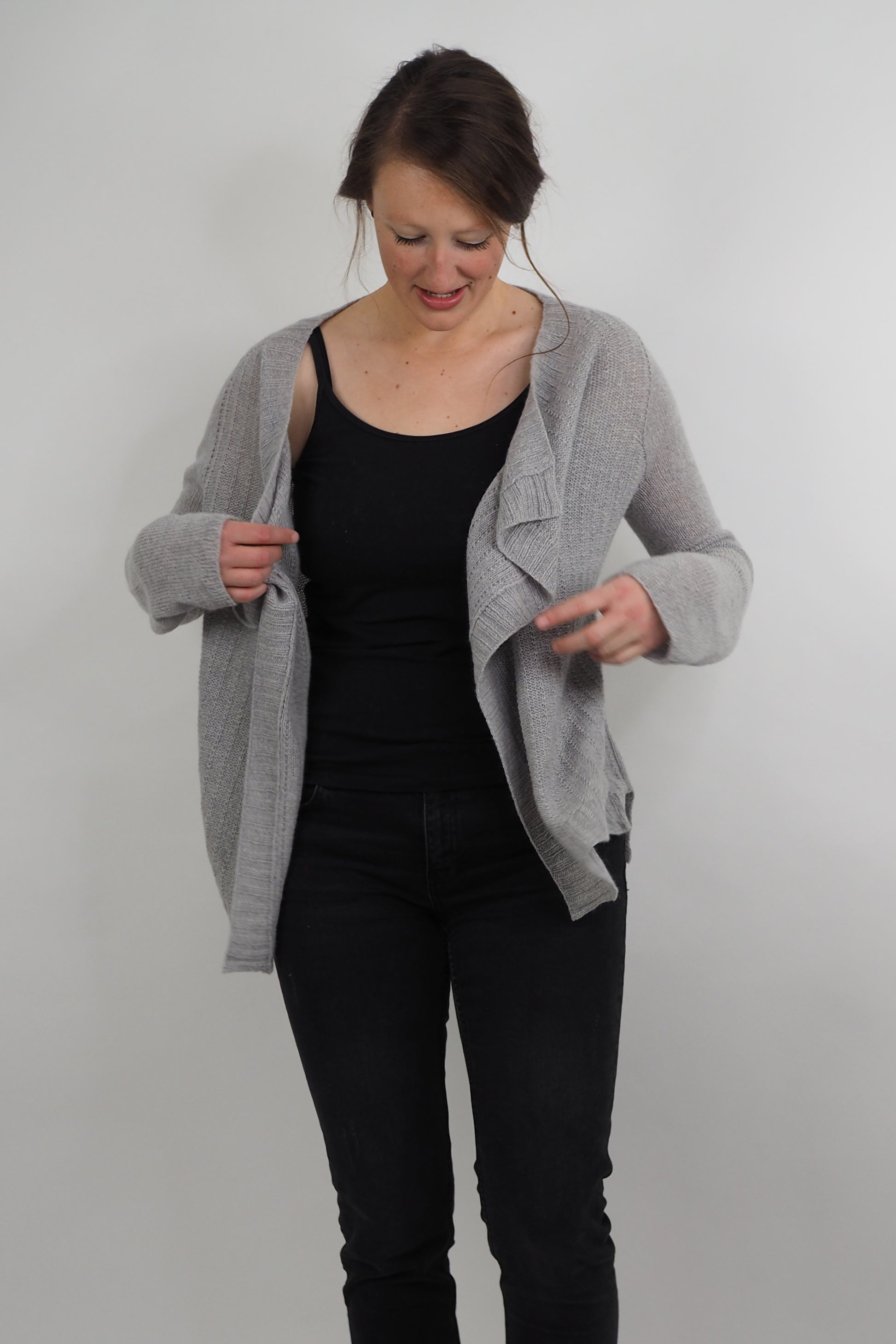EMMA wird nahtlos von oben nach unten in Reihen gearbeitet. Der Hals- und Frontbereich wird im Rippmuster [2re, 2li] ohne Knopflöcher gearbeitet, der Halsausschnitt wird durch deutsche verkürzte Reihen geformt, die Schultern durch fortlaufende Zunahmen. EMMA hat einen geteilten Bund, der hinten länger ist.