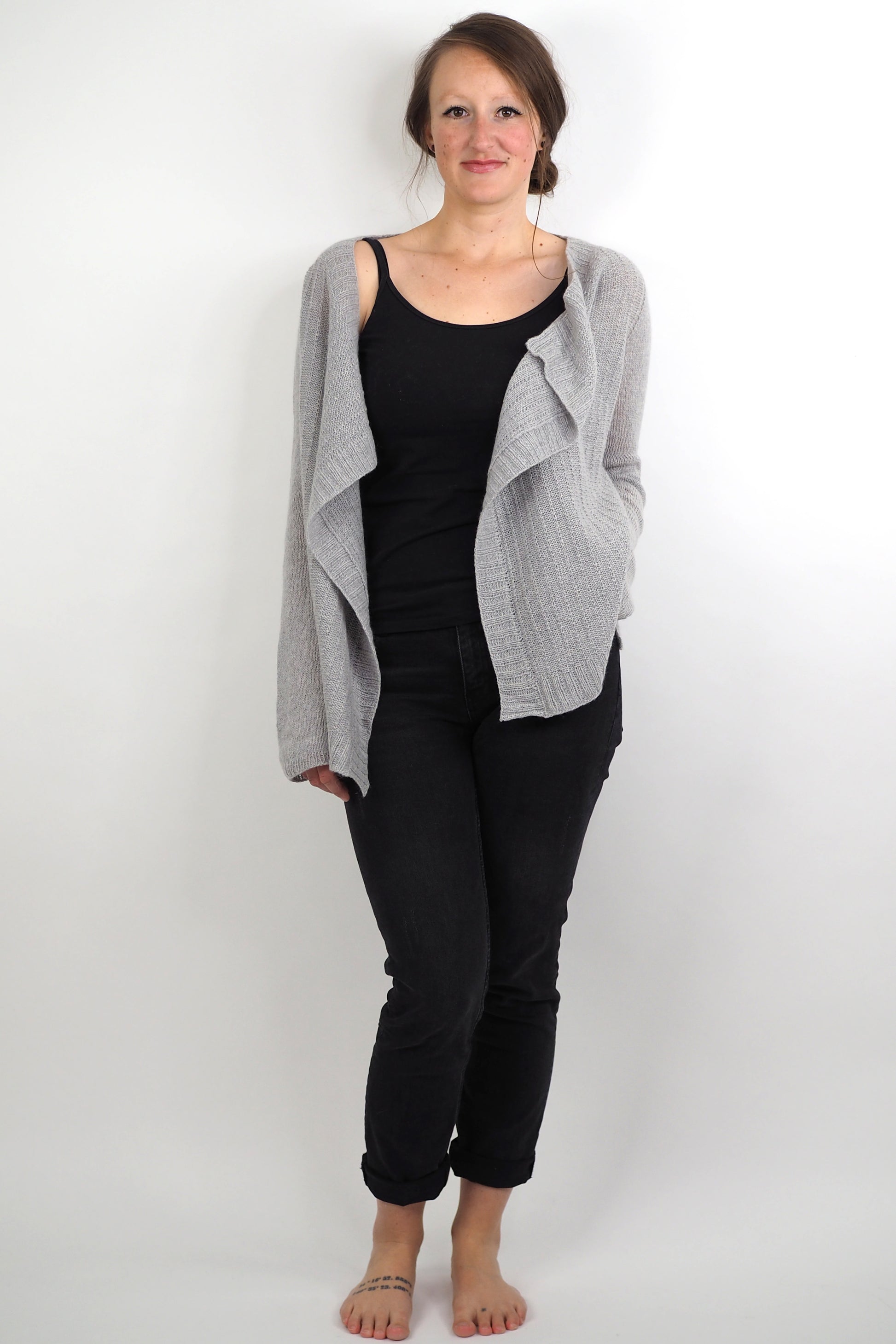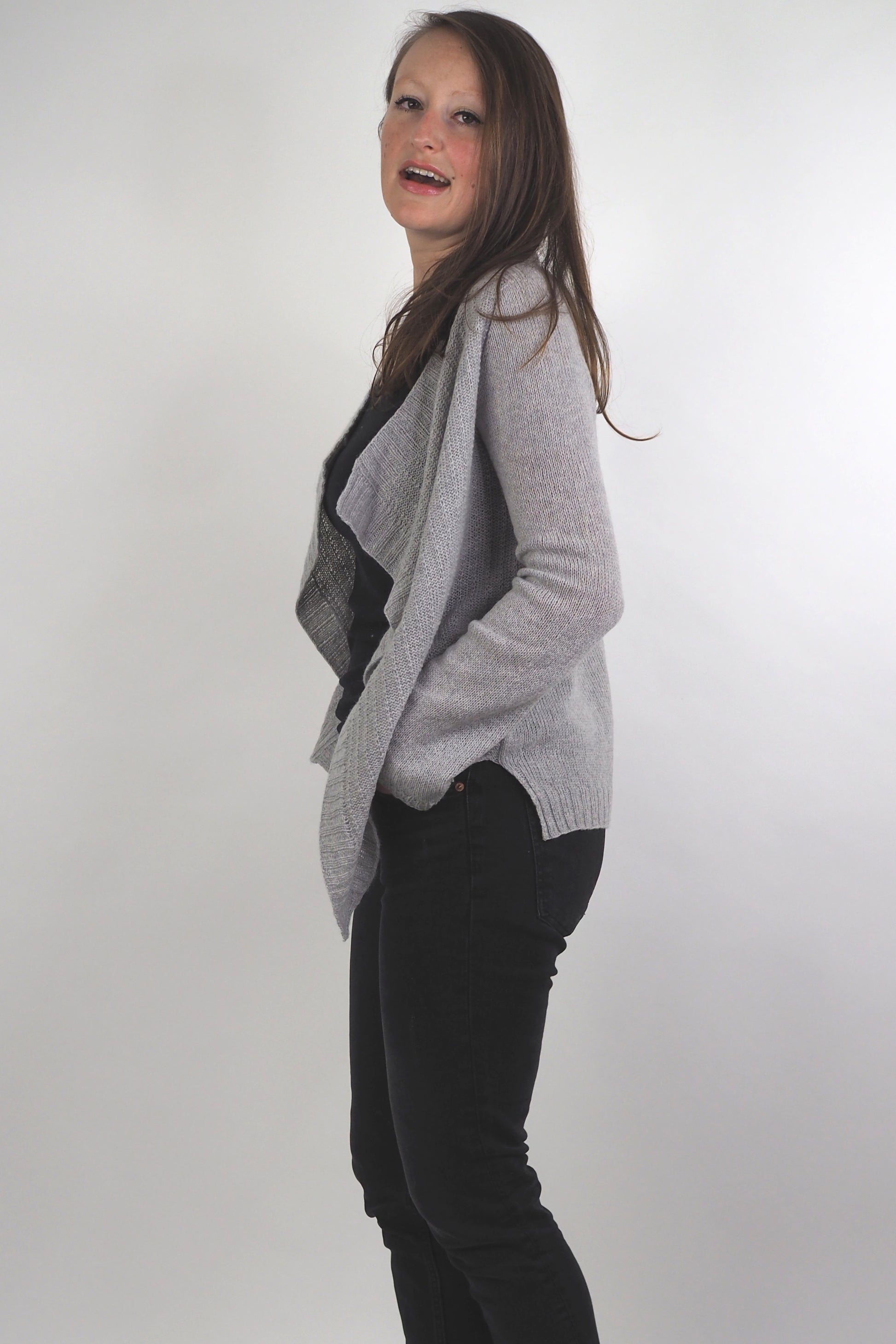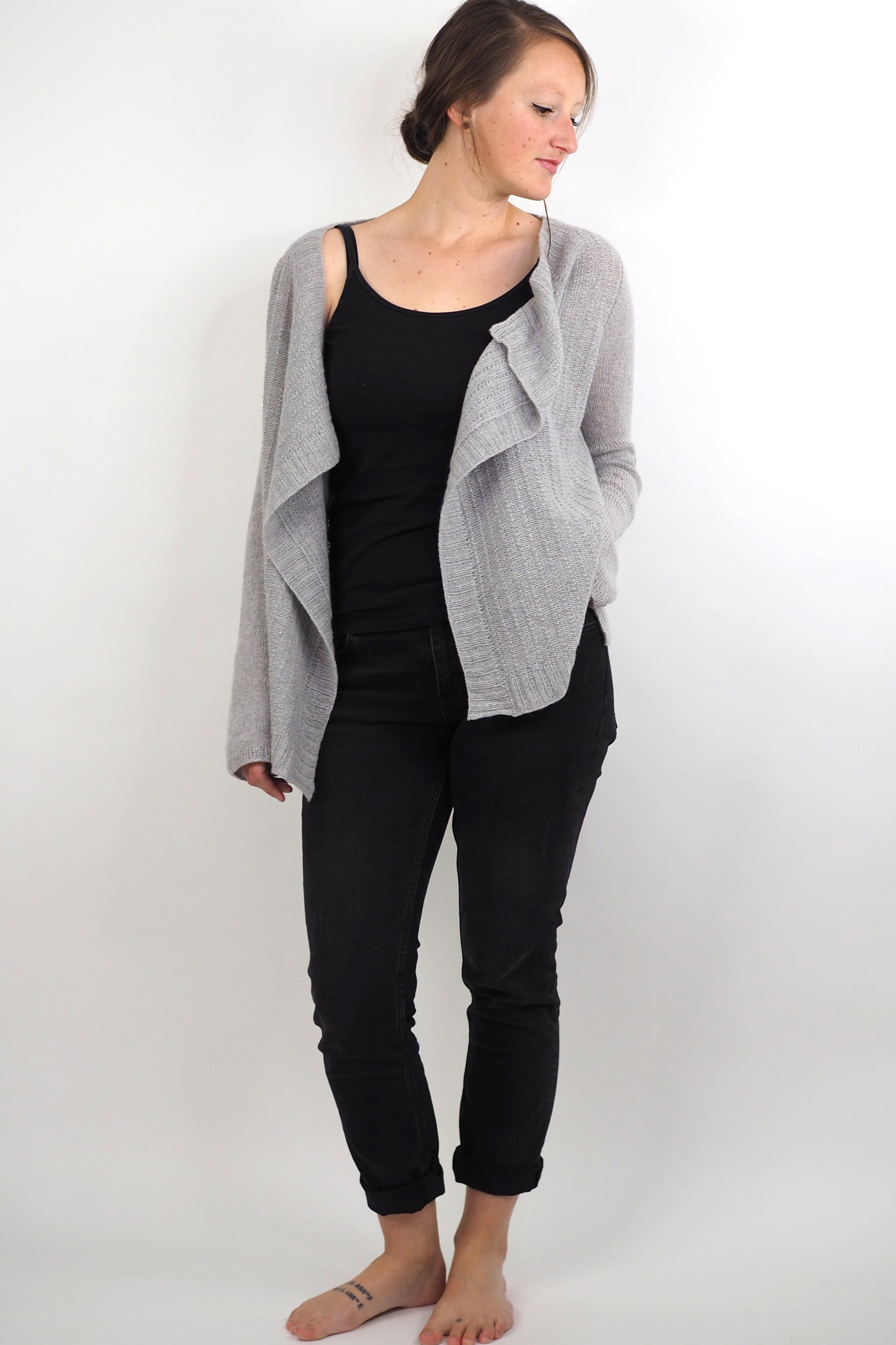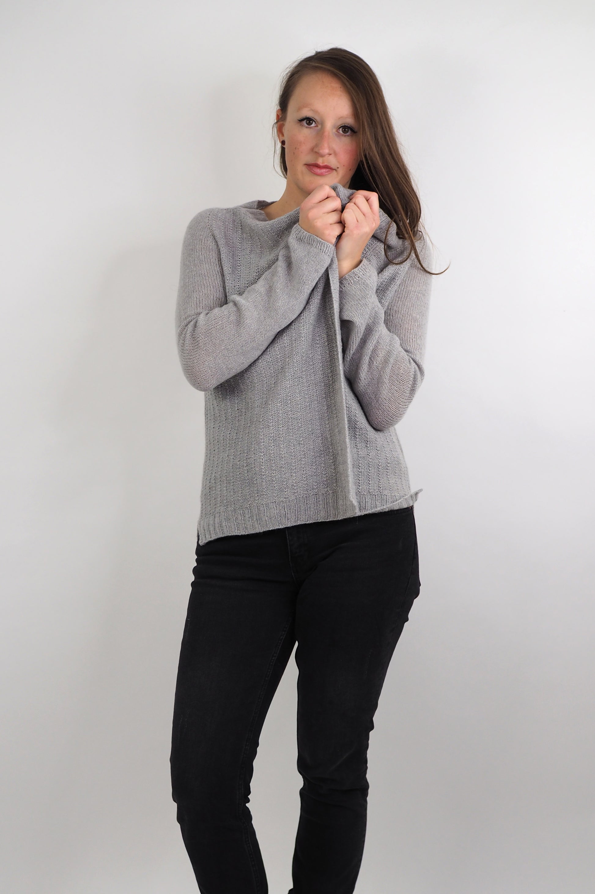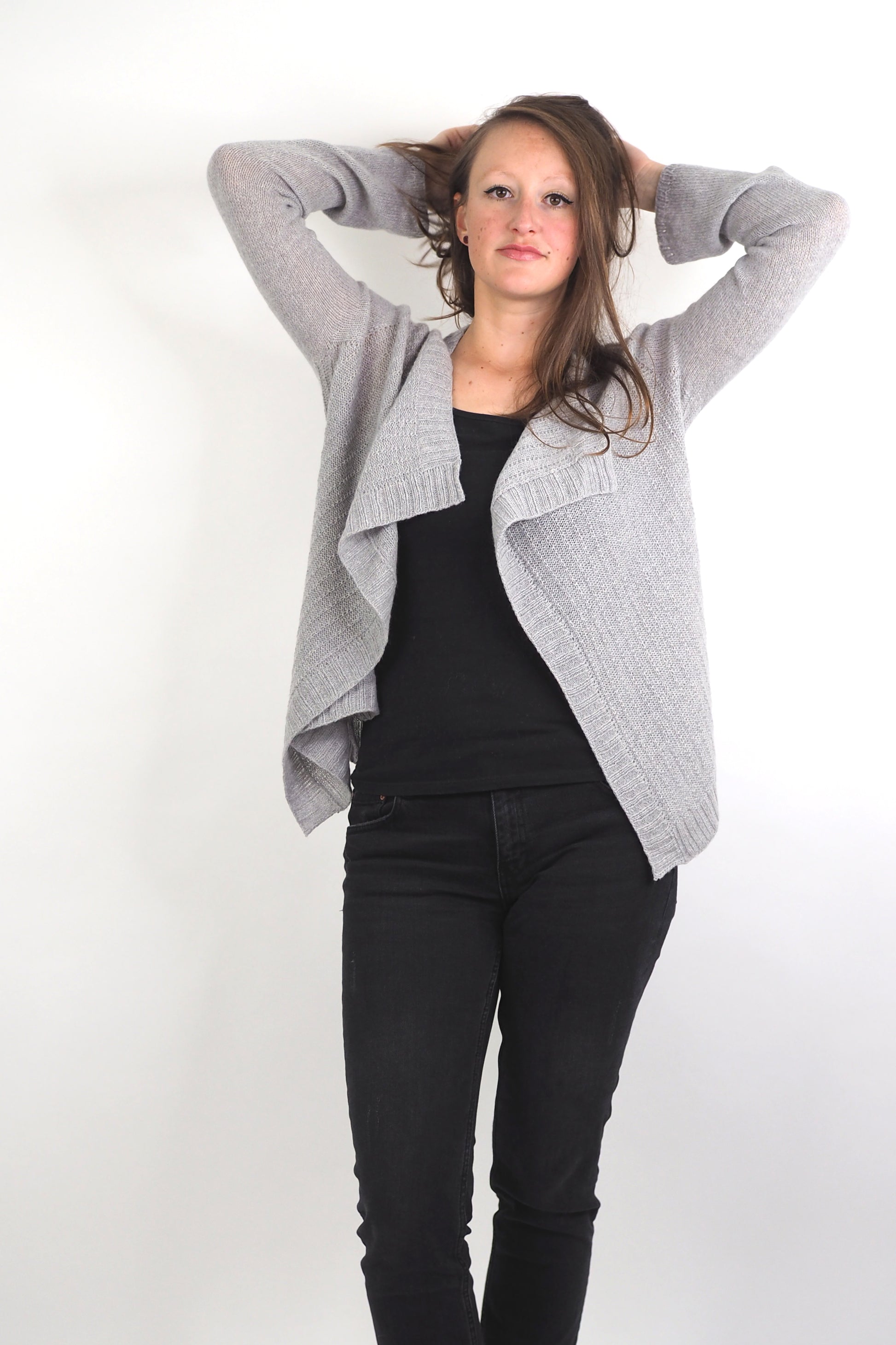 EMMA wird nahtlos von oben nach unten in Reihen gearbeitet. Der Hals- und Frontbereich wird im Rippmuster [2re, 2li] ohne Knopflöcher gearbeitet, der Halsausschnitt wird durch deutsche verkürzte Reihen geformt, die Schultern durch fortlaufende Zunahmen. EMMA hat einen geteilten Bund, der hinten länger ist.