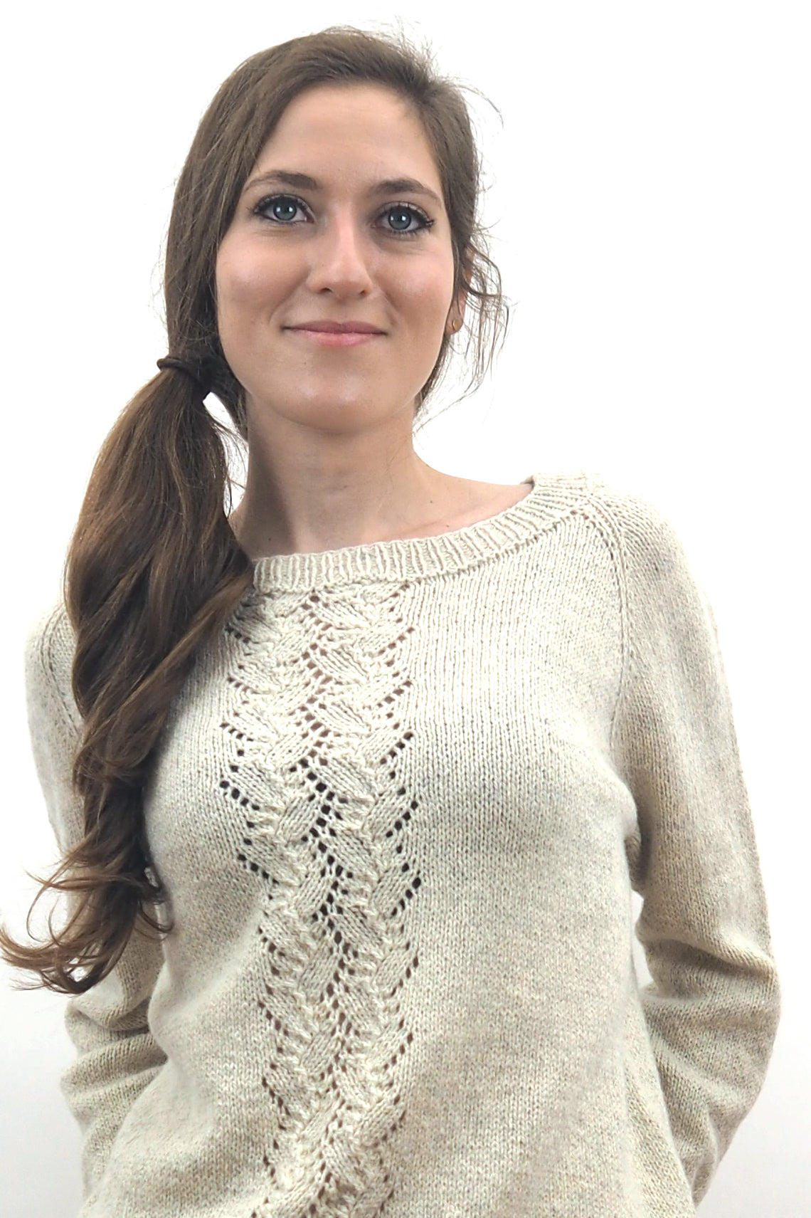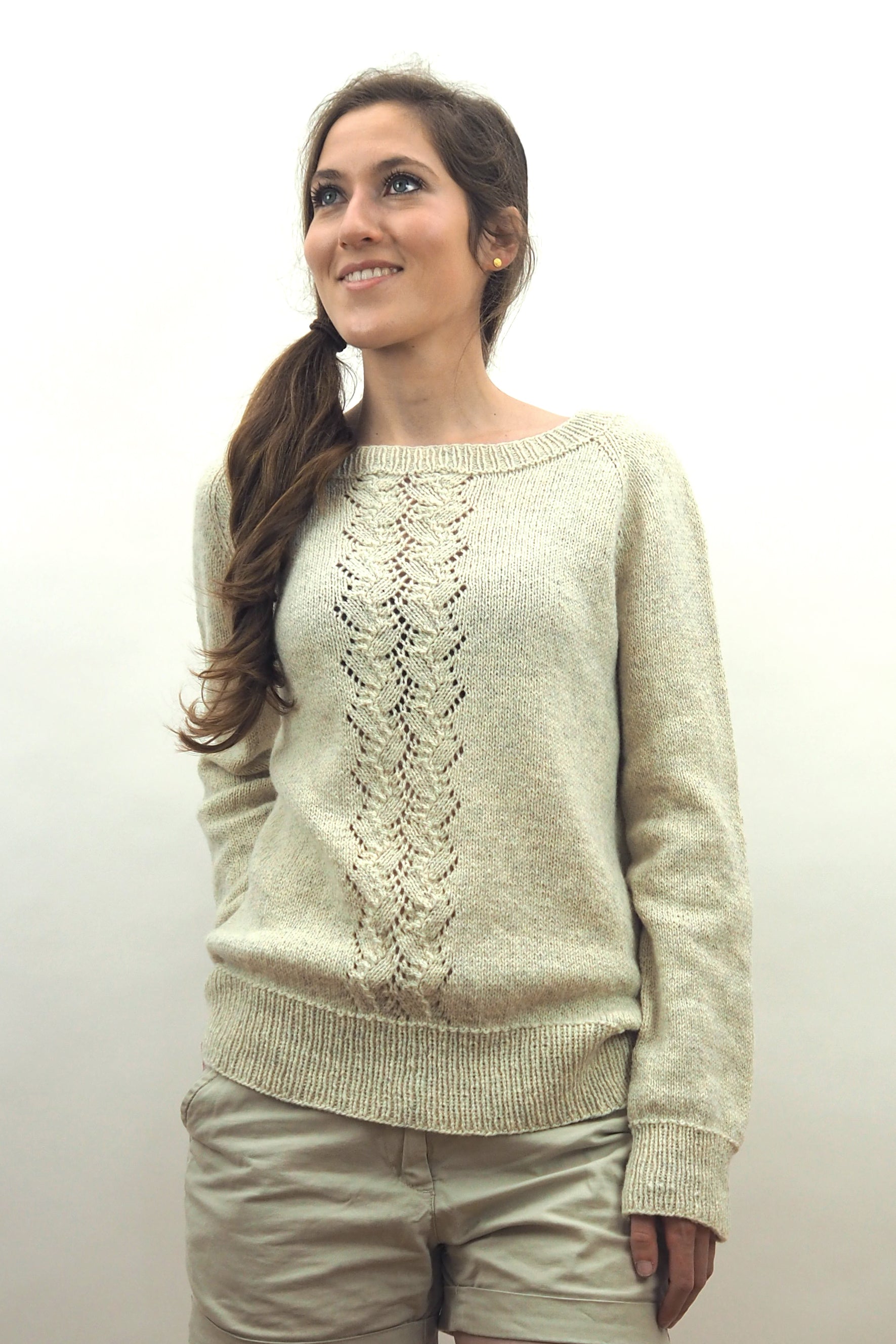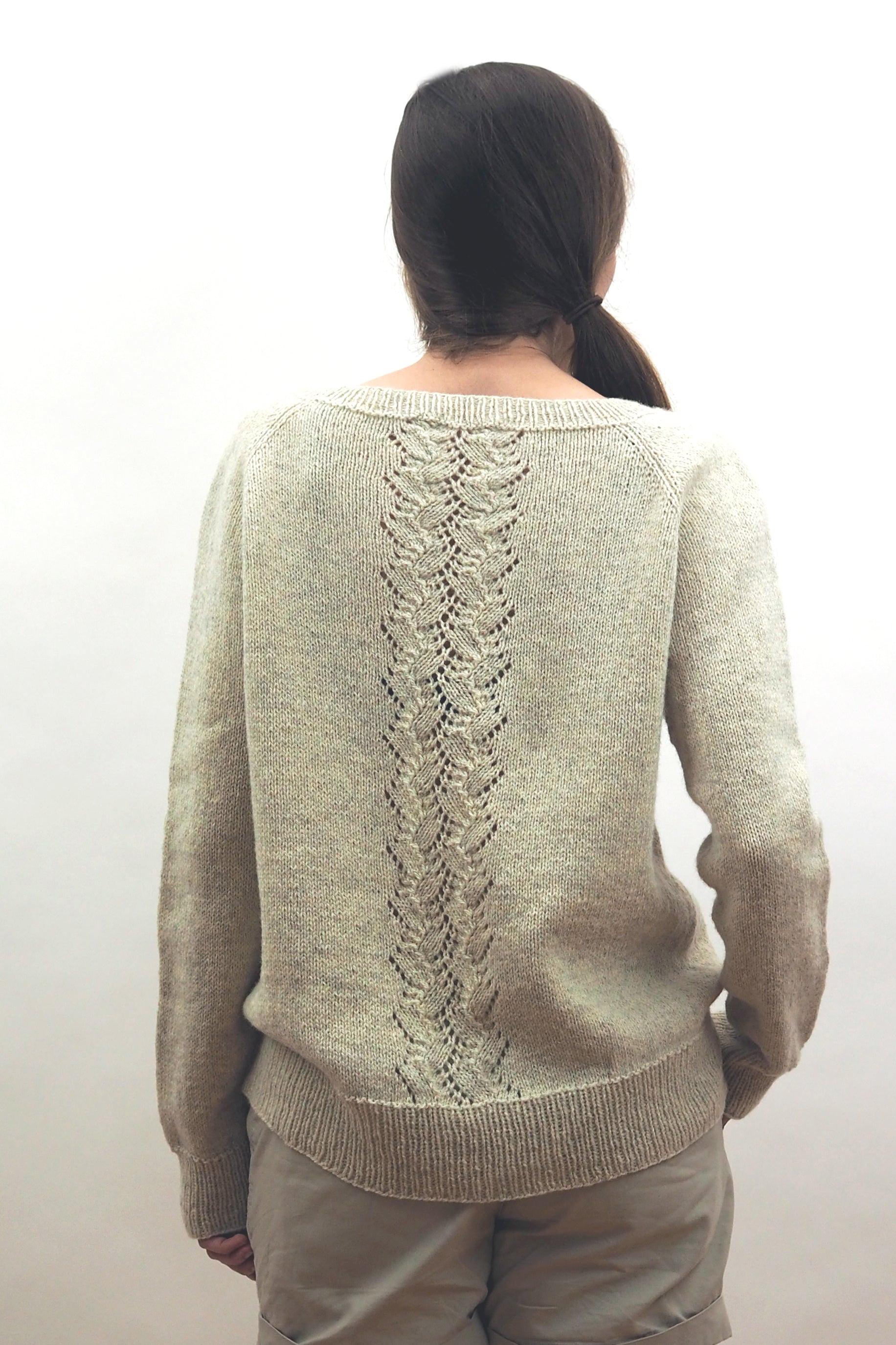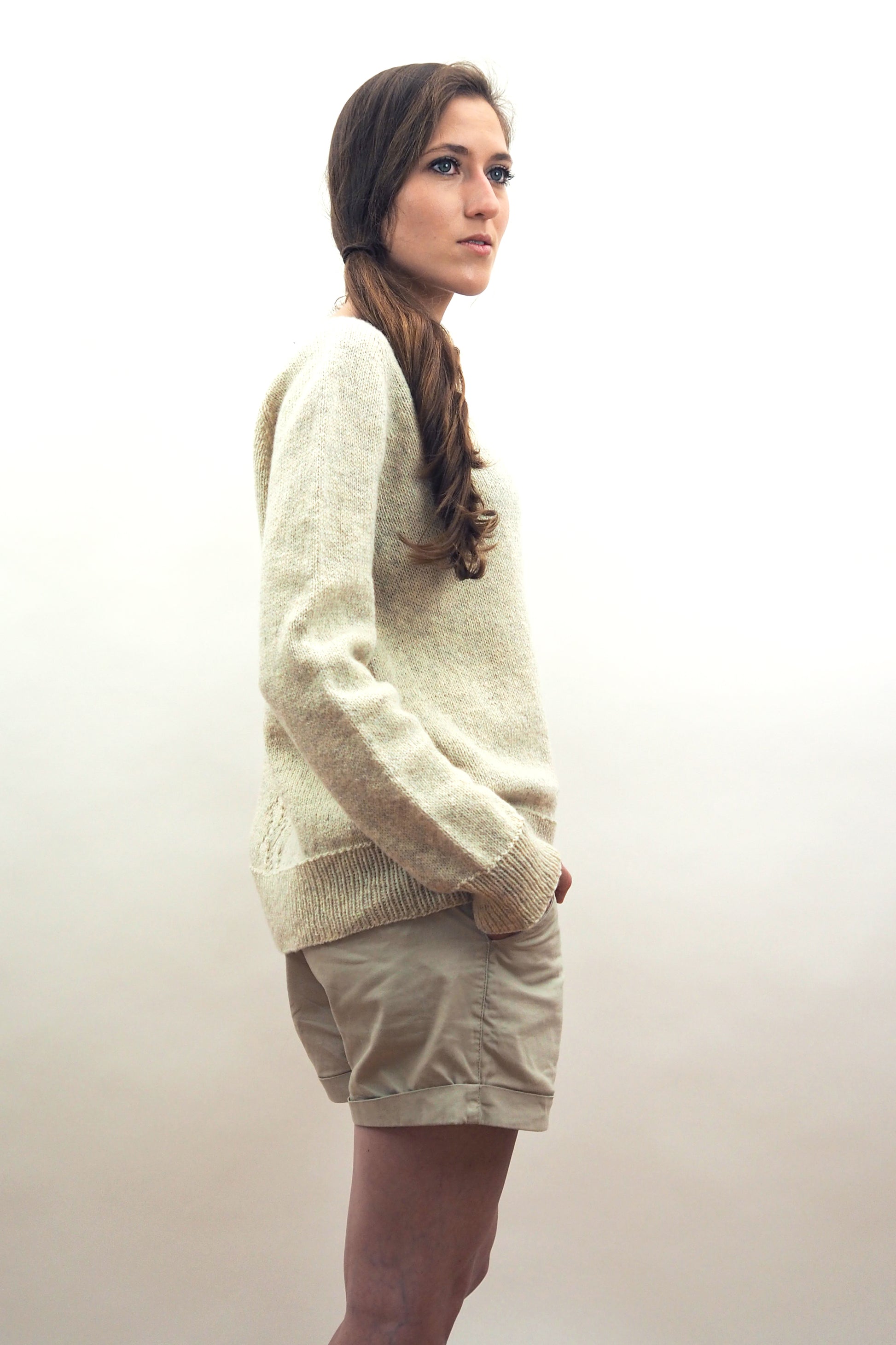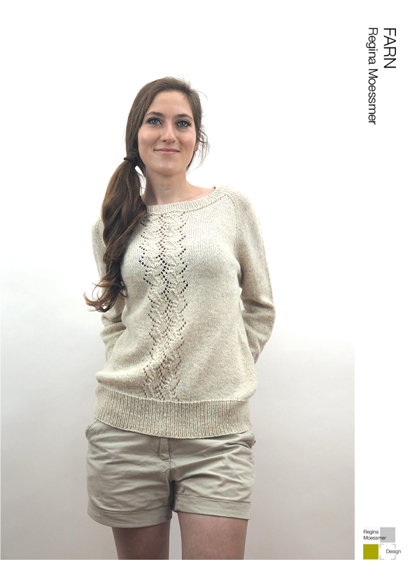 FARN wird nahtlos von oben nach unten gearbeitet, mit Raglanzunahmen und verkürzten Reihen zum Formen des Ausschnittes. Der Körper wird mit einer weichen A-Linien-Form gearbeitet, um eine lockere Passform zu erreichen.