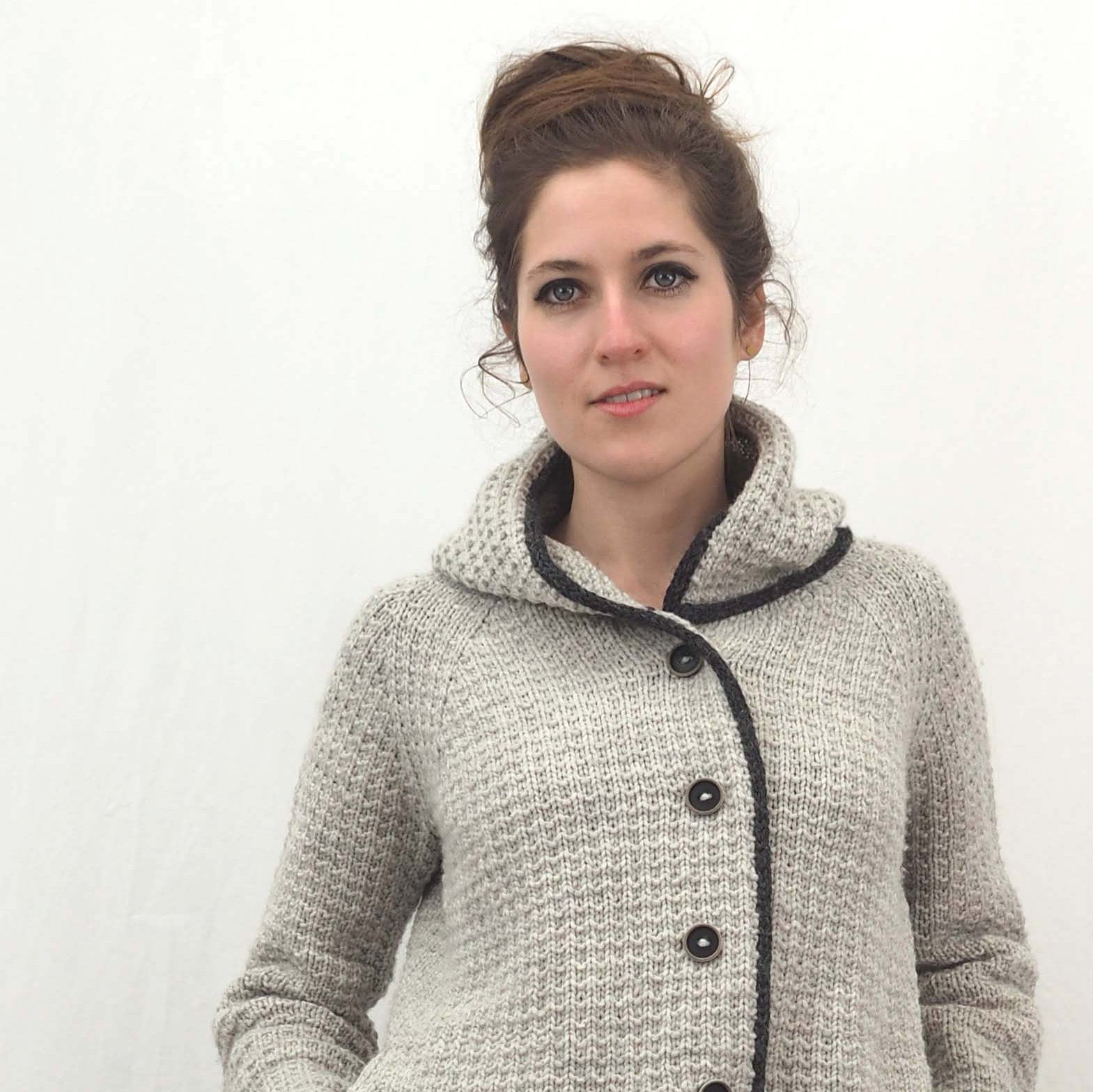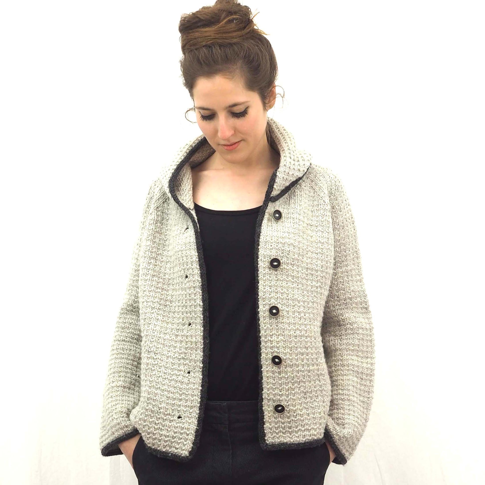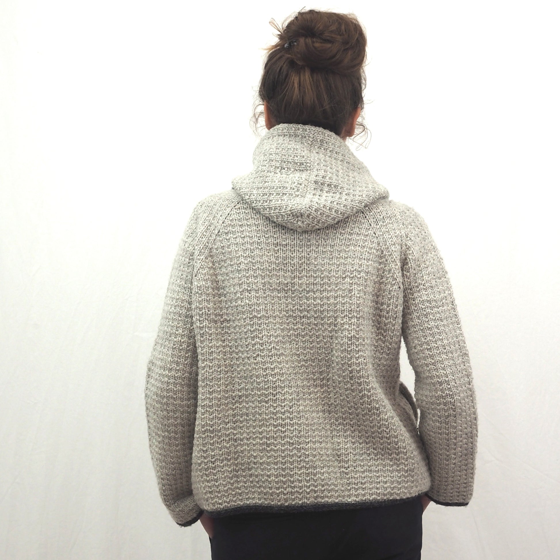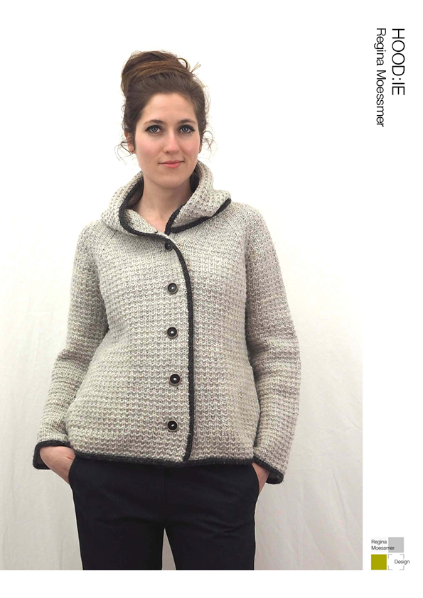 HOOD:IE ist eine warme Outdoor-Kapuzenjacke in Raglanform. Sie beginnt mit einem kleinen Halsbündchen im Hauptmuster, wobei die Halsausschnittformung mit verkürzten Reihen erfolgt. Nach Abschluss der verkürzten Reihen wird die Arbeit nahtlos von oben nach unten in ganzen Reihen fortgesetzt. Die seitlichen Taschen werden in die Vorderteile eingearbeitet. Vor dem Stricken der Kapuze wird ein I-Cord am Halsausschnitt gearbeitet. Nach Fertigstellung der Kapuze werden der Saum, die vordere Kante und die Kapuze mit einem I-Cord eingefasst.
