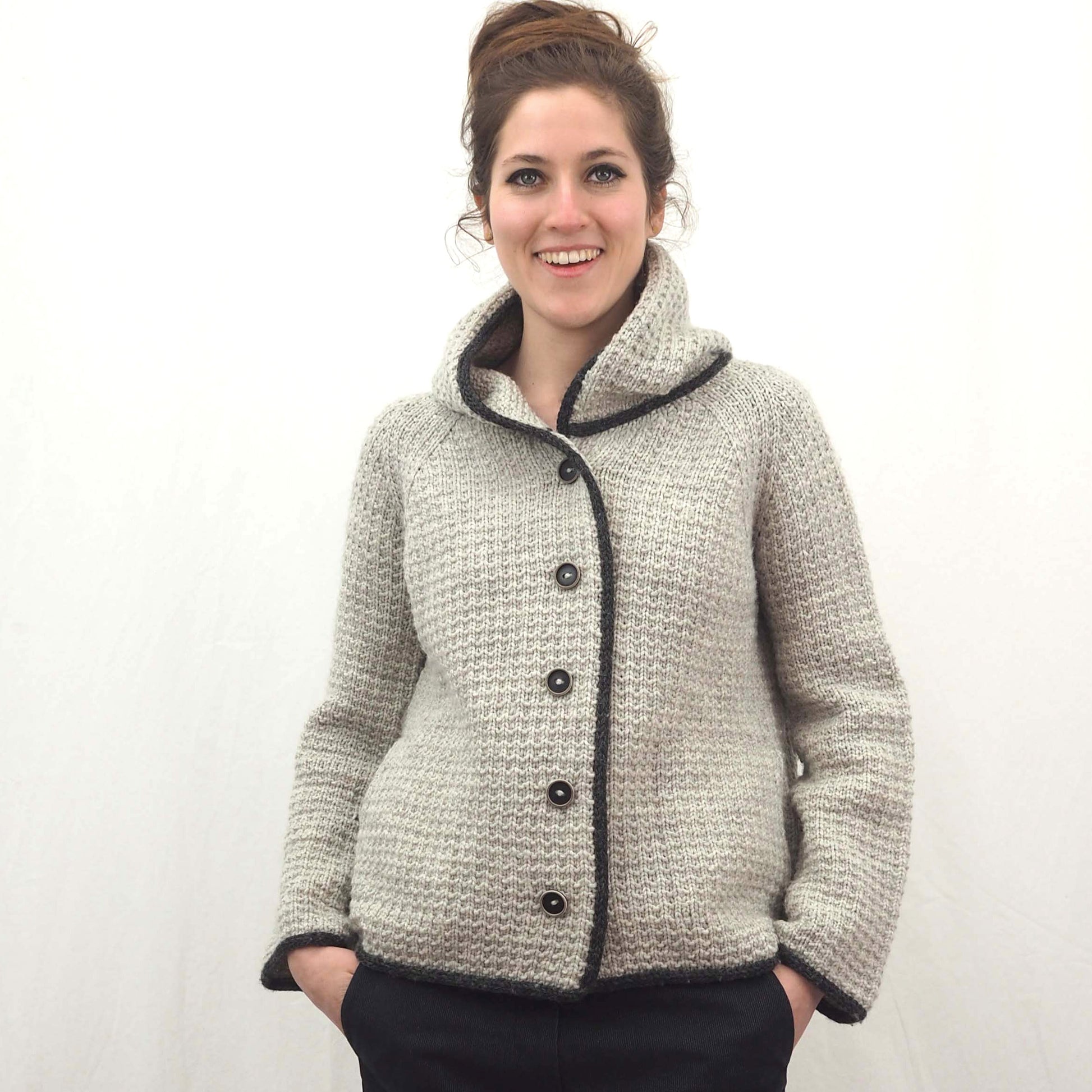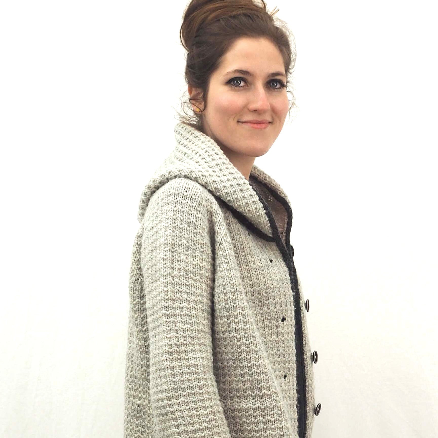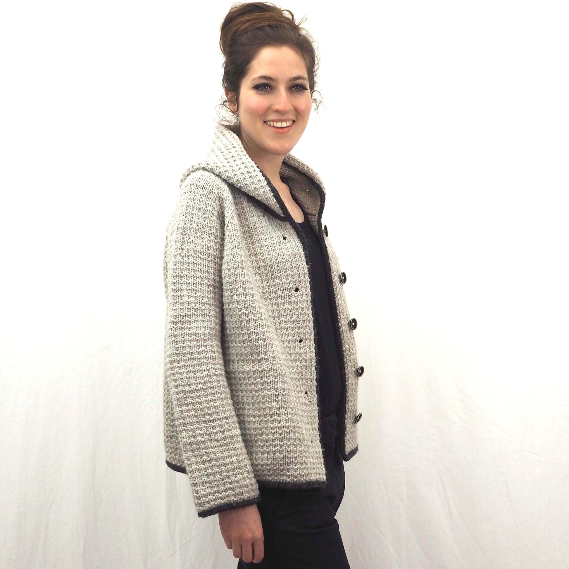 HOOD:IE ist eine warme Outdoor-Kapuzenjacke in Raglanform. Sie beginnt mit einem kleinen Halsbündchen im Hauptmuster, wobei die Halsausschnittformung mit verkürzten Reihen erfolgt. Nach Abschluss der verkürzten Reihen wird die Arbeit nahtlos von oben nach unten in ganzen Reihen fortgesetzt. Die seitlichen Taschen werden in die Vorderteile eingearbeitet. Vor dem Stricken der Kapuze wird ein I-Cord am Halsausschnitt gearbeitet. Nach Fertigstellung der Kapuze werden der Saum, die vordere Kante und die Kapuze mit einem I-Cord eingefasst.