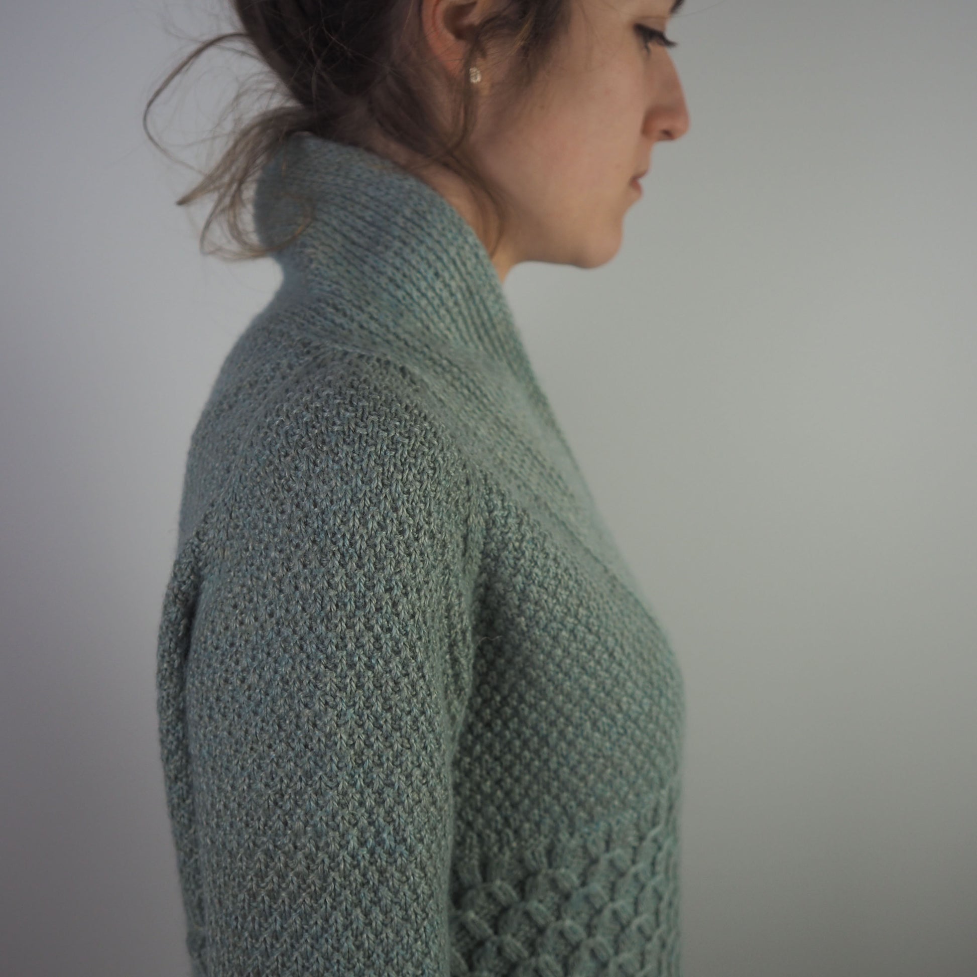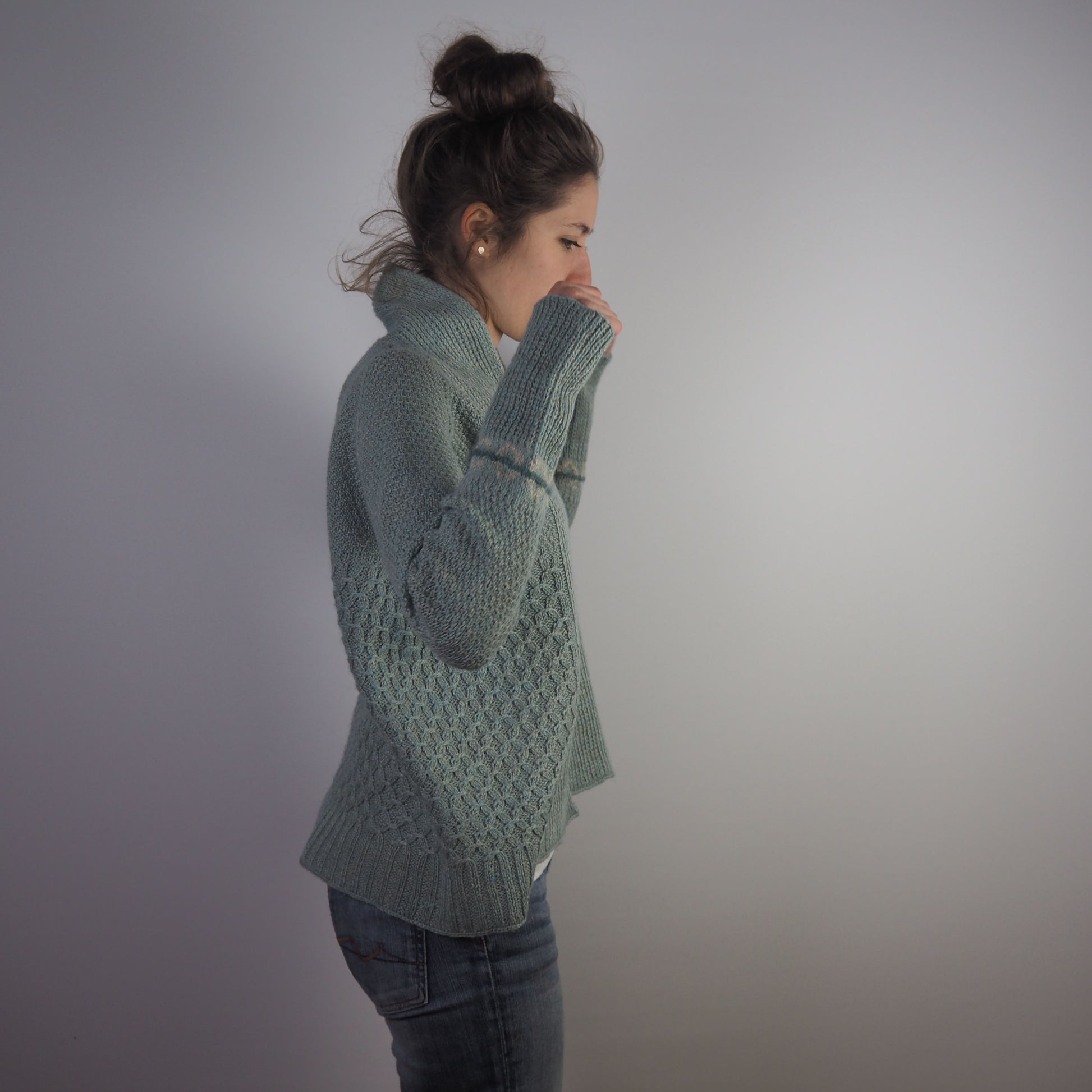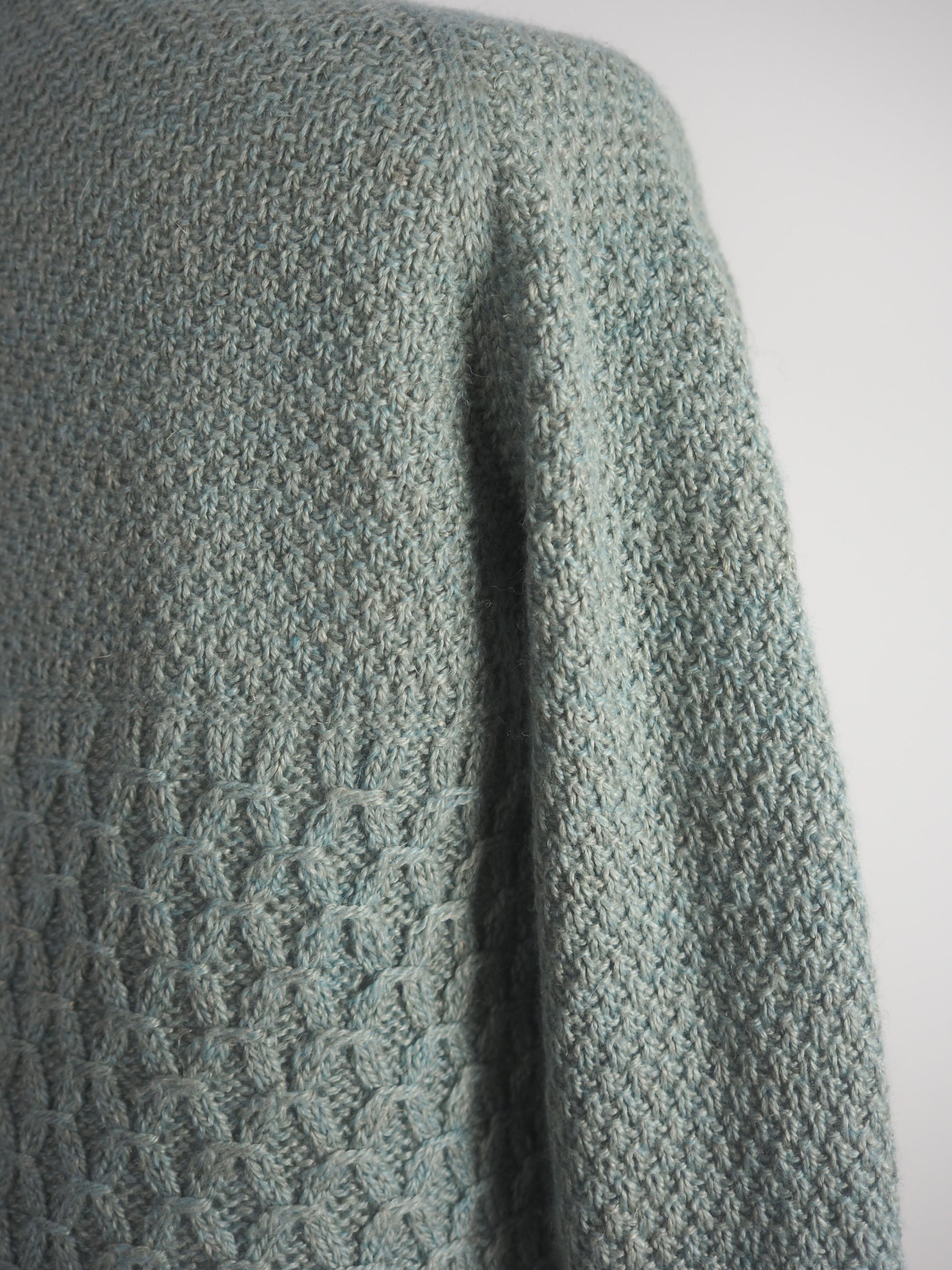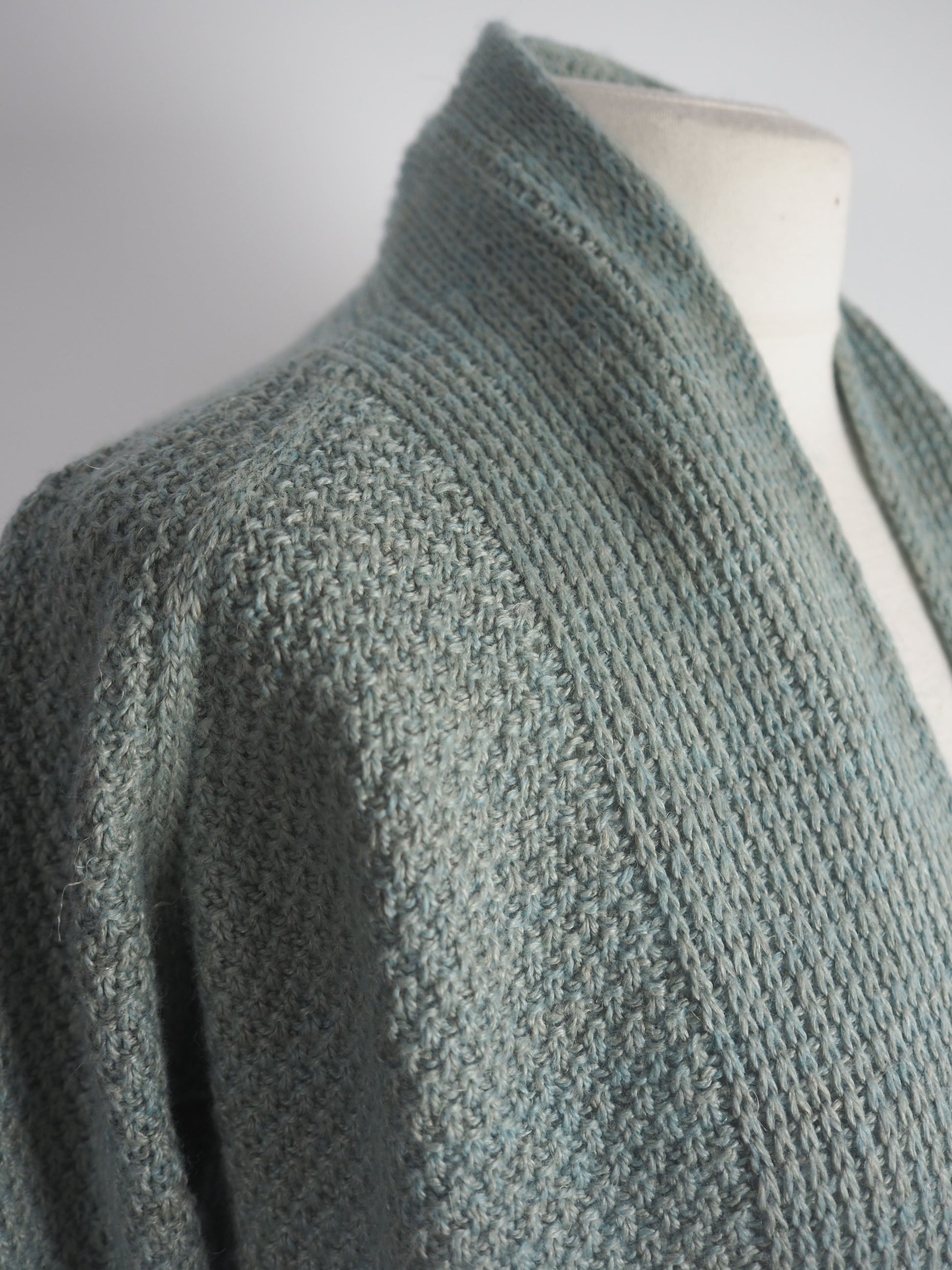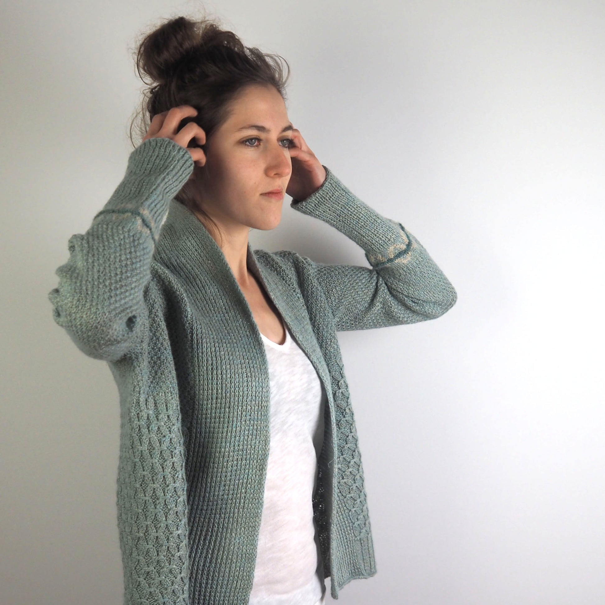 ALMA von Regina Mössme, gestrickt mit HERZFASER NO.14 in der Farbe ZEITFLUSS unserer MEISTERSTÜCKE – FARBIGE BILDER von Herzfasern – exklusiv bei Herr U am Amalienpark.