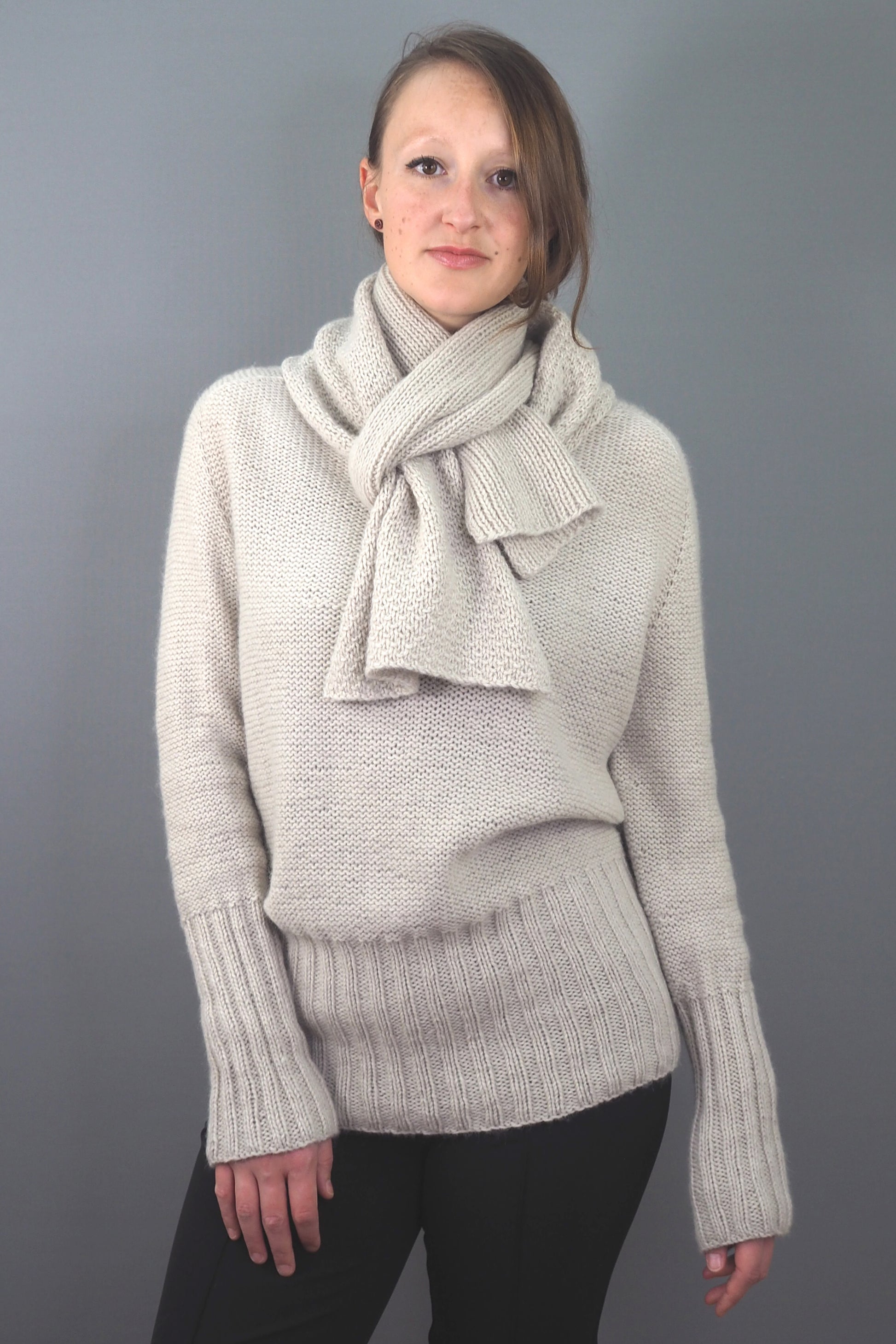 Unser Musterpullover ist gestrickt mit LAMANA BERGAMO, 75% Schurwolle (Merino Superfine), 25% Alpaka (Baby Alpaka), ca. 65 m pro 25 g, Farbe 03 Seidengrau melange.