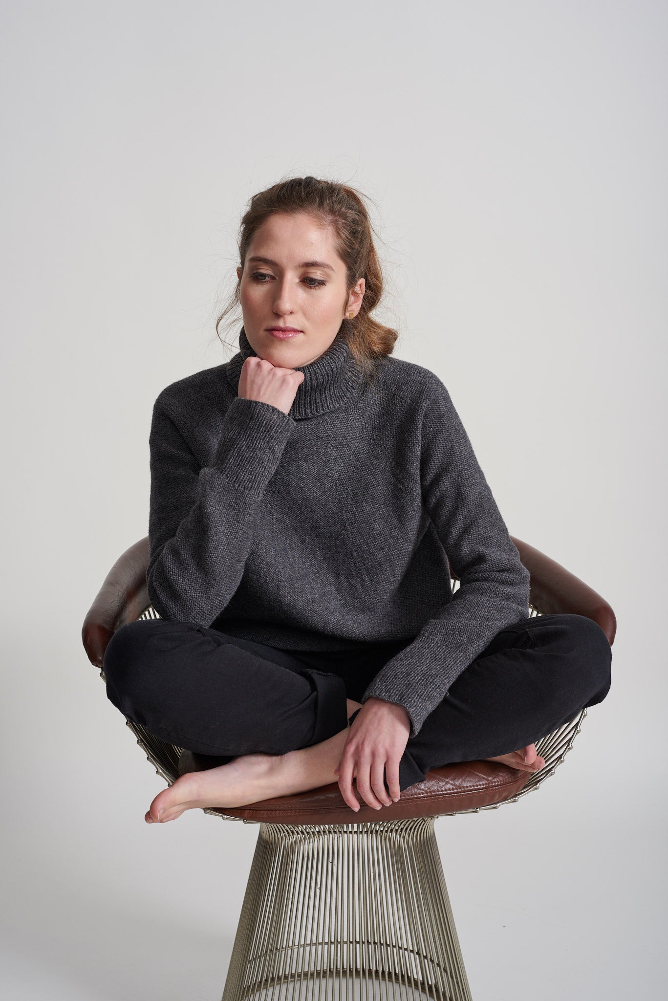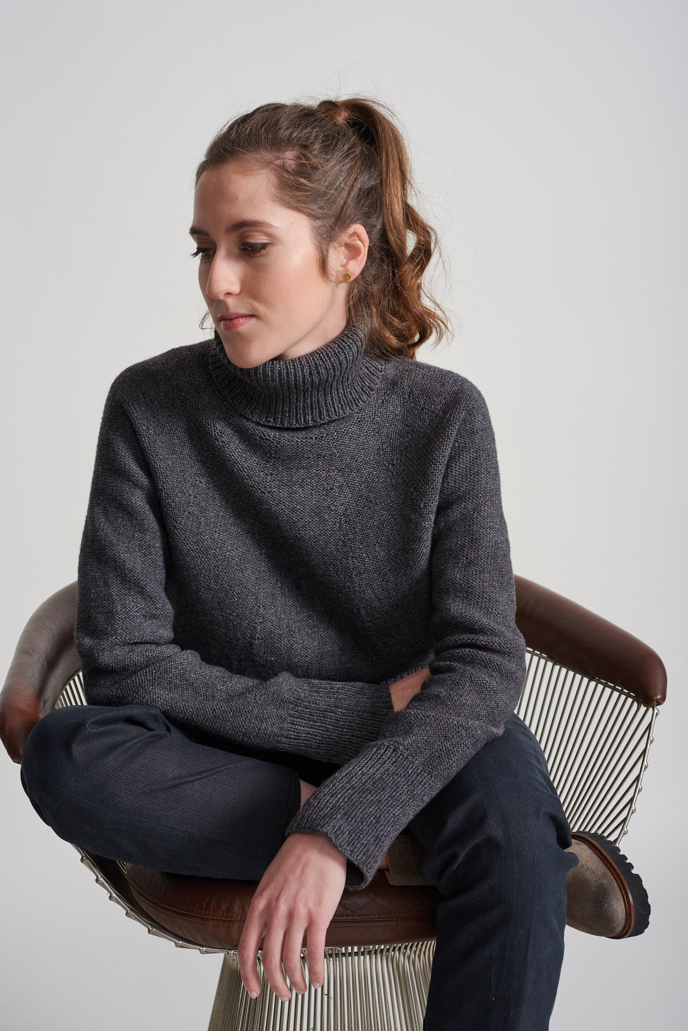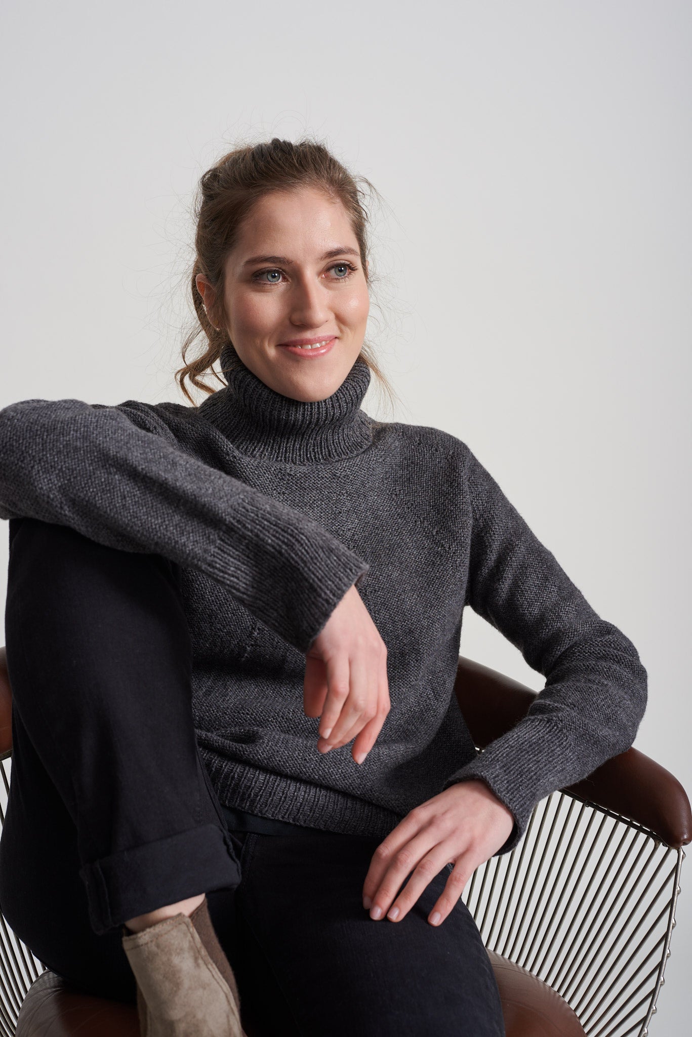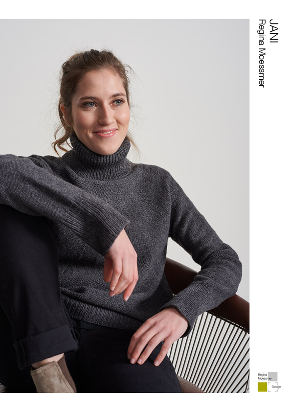 JANI wird von oben nach unten gearbeitet. Begonnen wird mit Zunahmen für die Rundpasse entlang 12 Markierungen. Um die sehr geradlinige Form zu erhalten, werden die Ärmel ohne Zunahmen unter dem Arm vom Körper abgeteilt. Entscheiden Sie ganz zum Schluss, ob Sie die links oder rechts gestrickte Seite außen tragen möchten. Erst danach werden die Maschen für den Kragen aufgenommen.