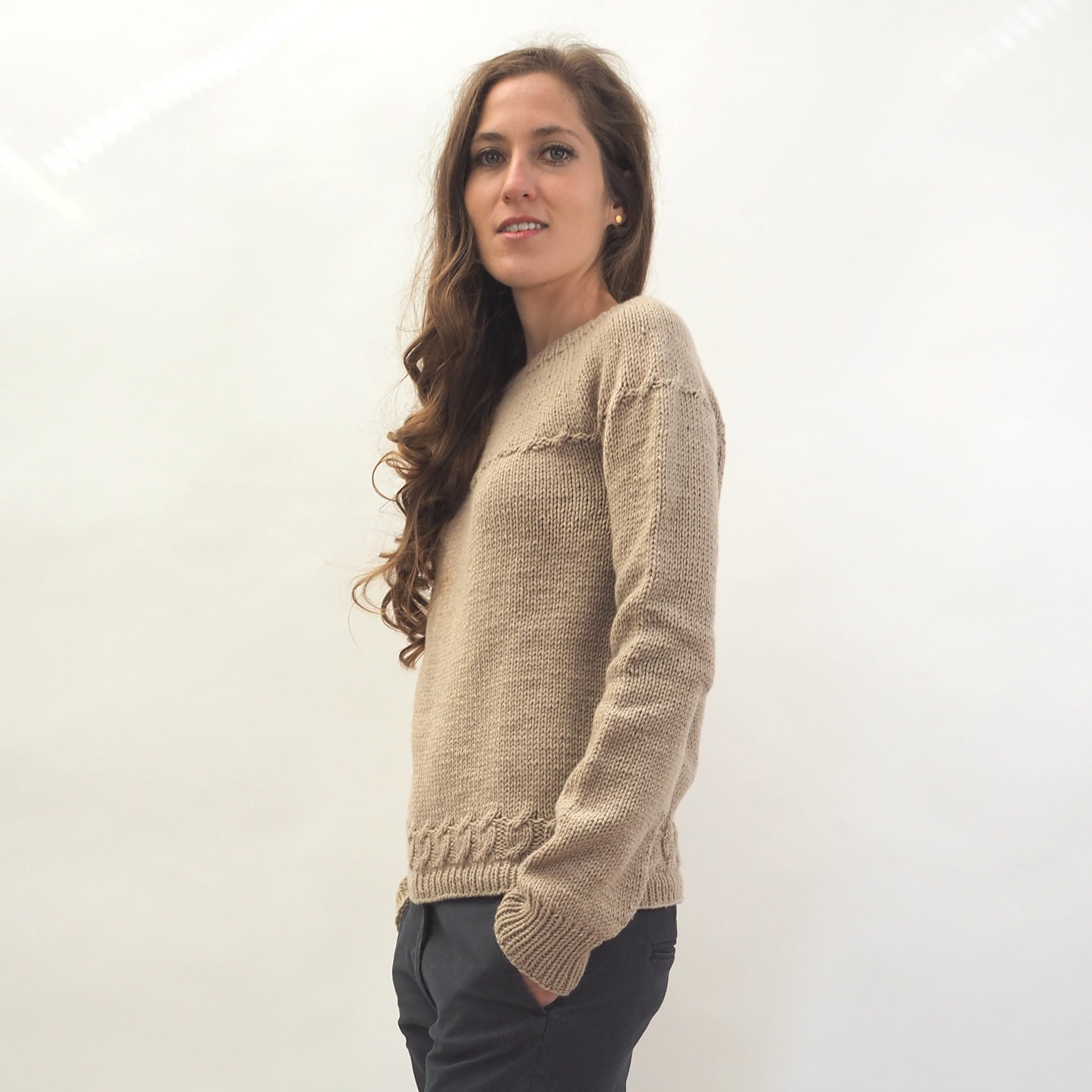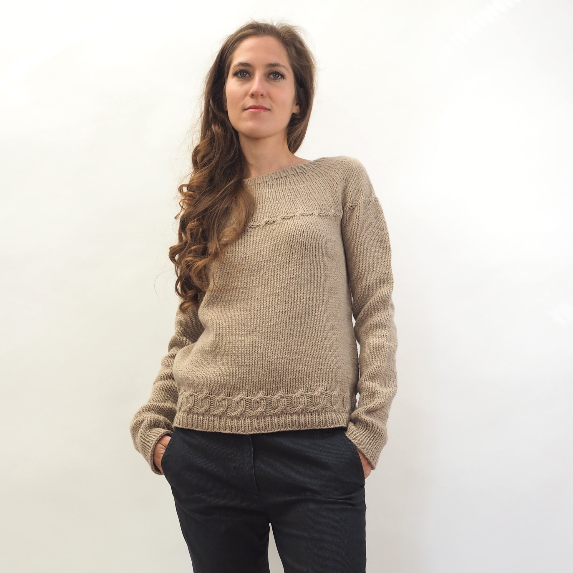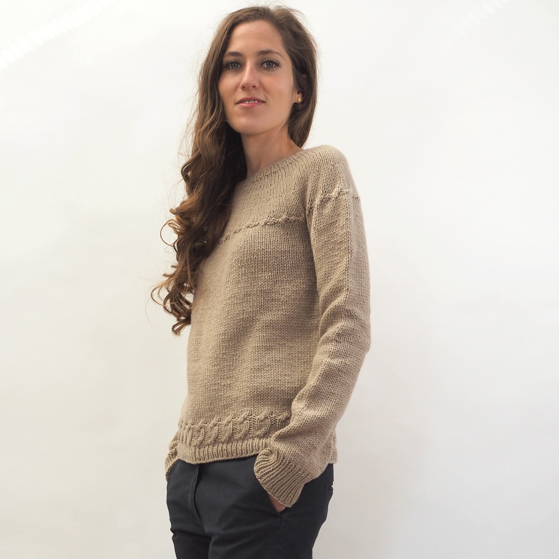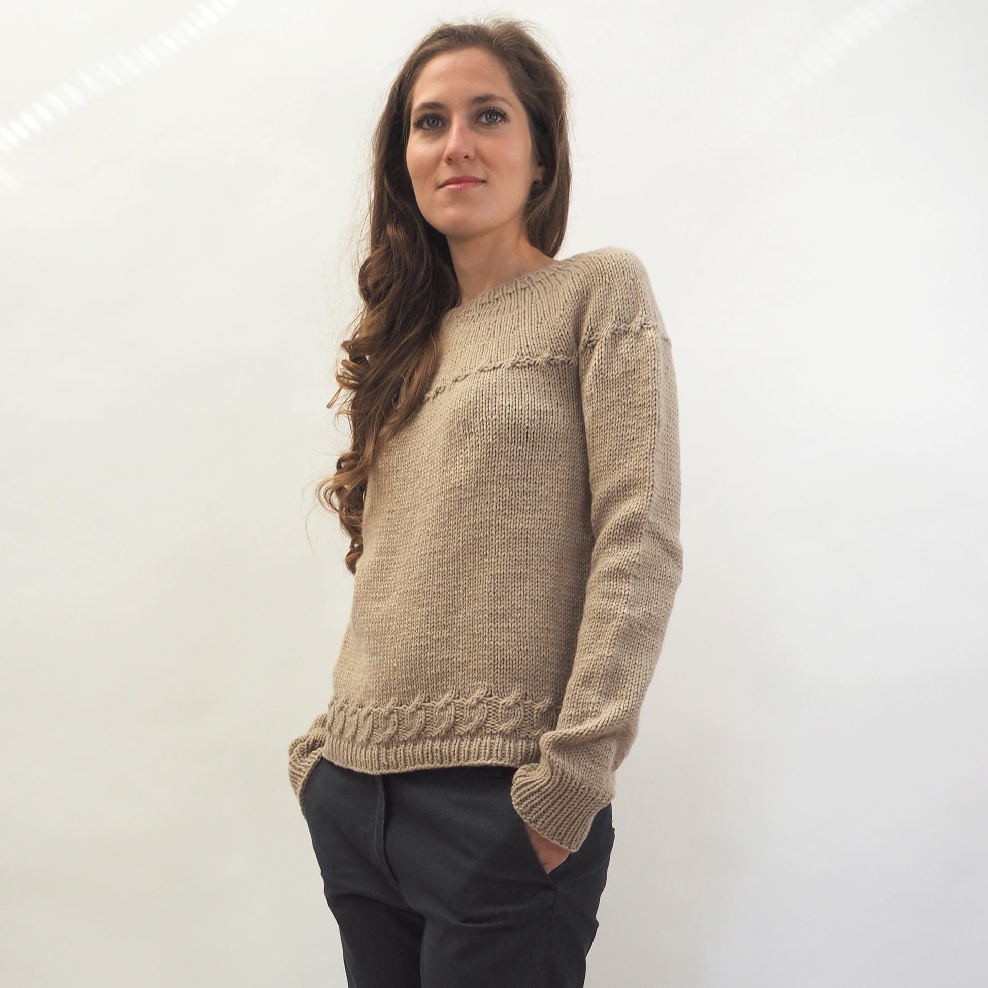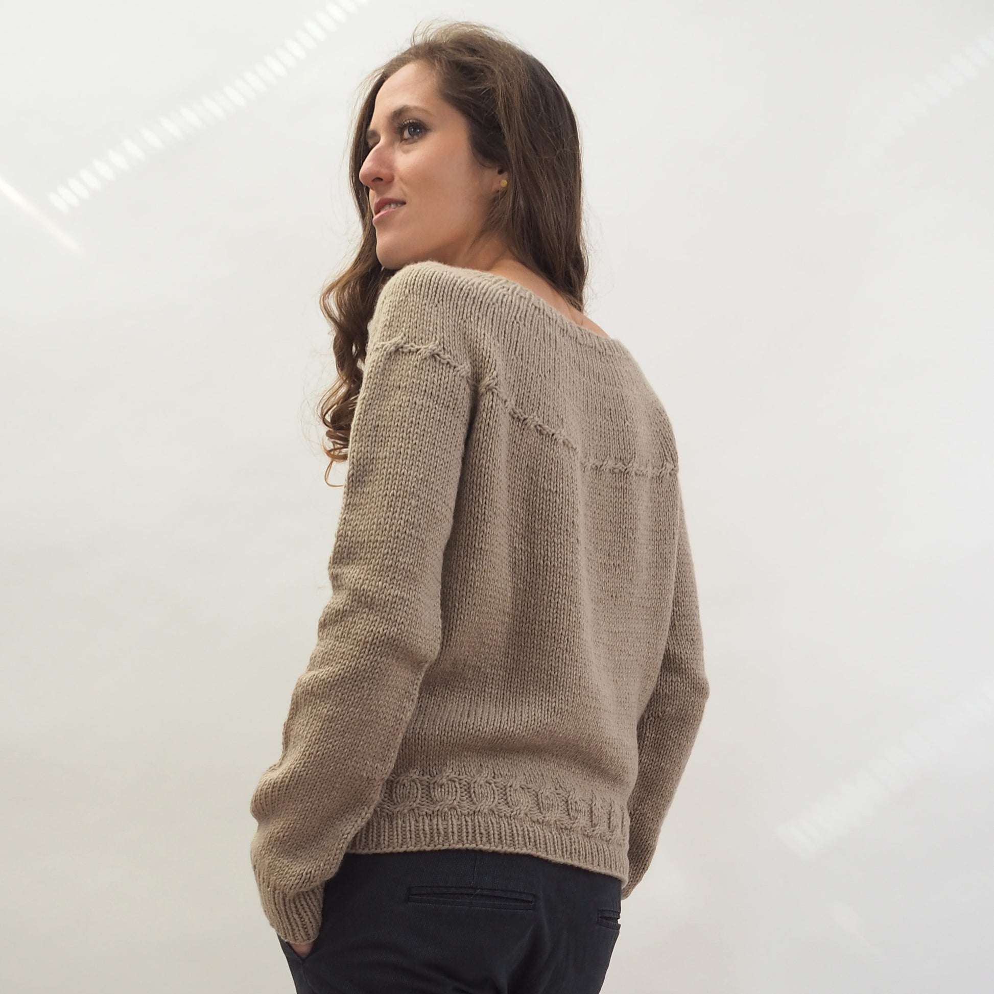 KALEA wird nahtlos von oben nach unten gearbeitet. Die abgerundete Passe wird durch geneigte Zunahmen geformt. Der Saum und die Bündchen werden im Rippenmuster [1re, 1li] gestrickt.