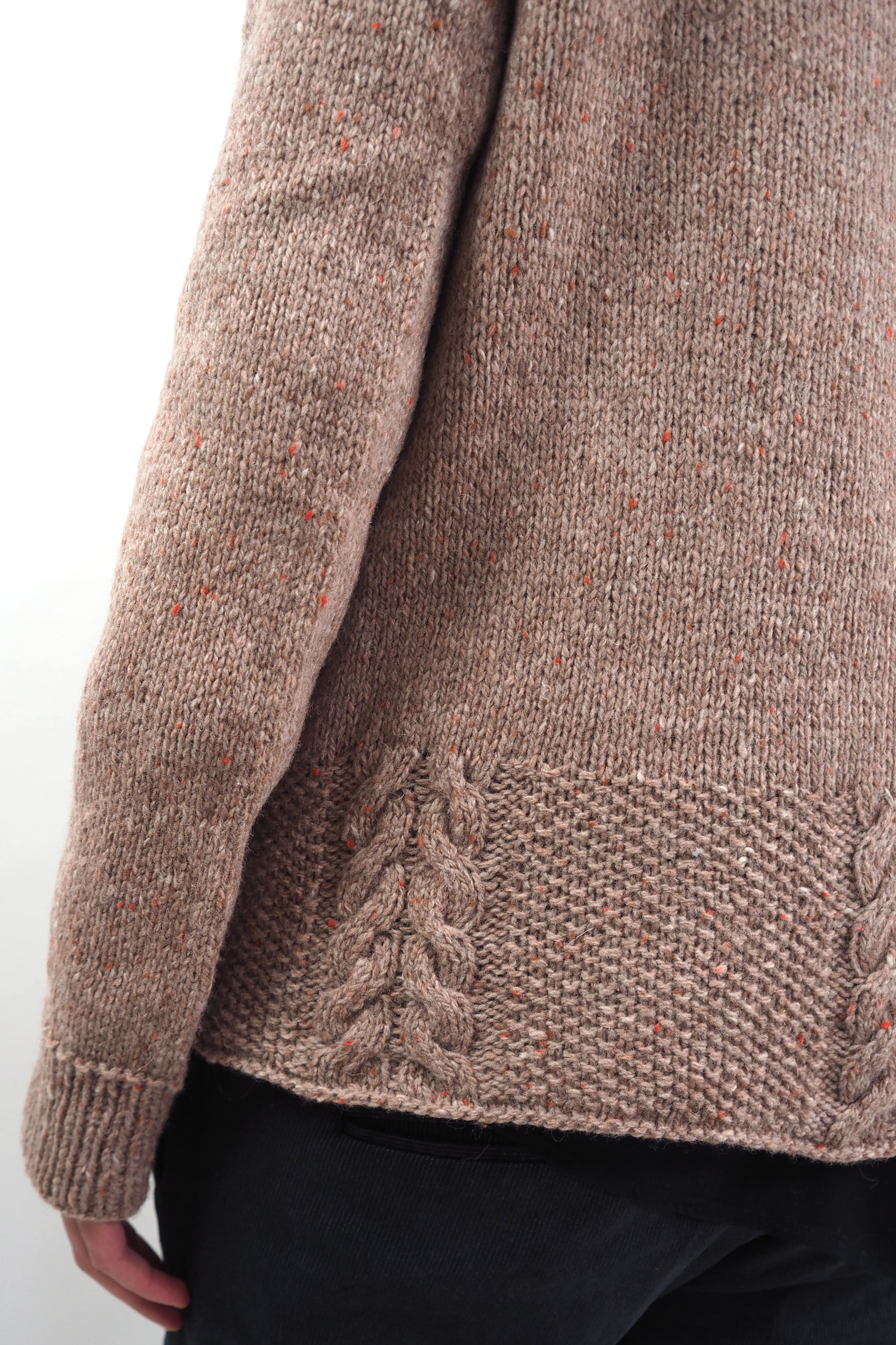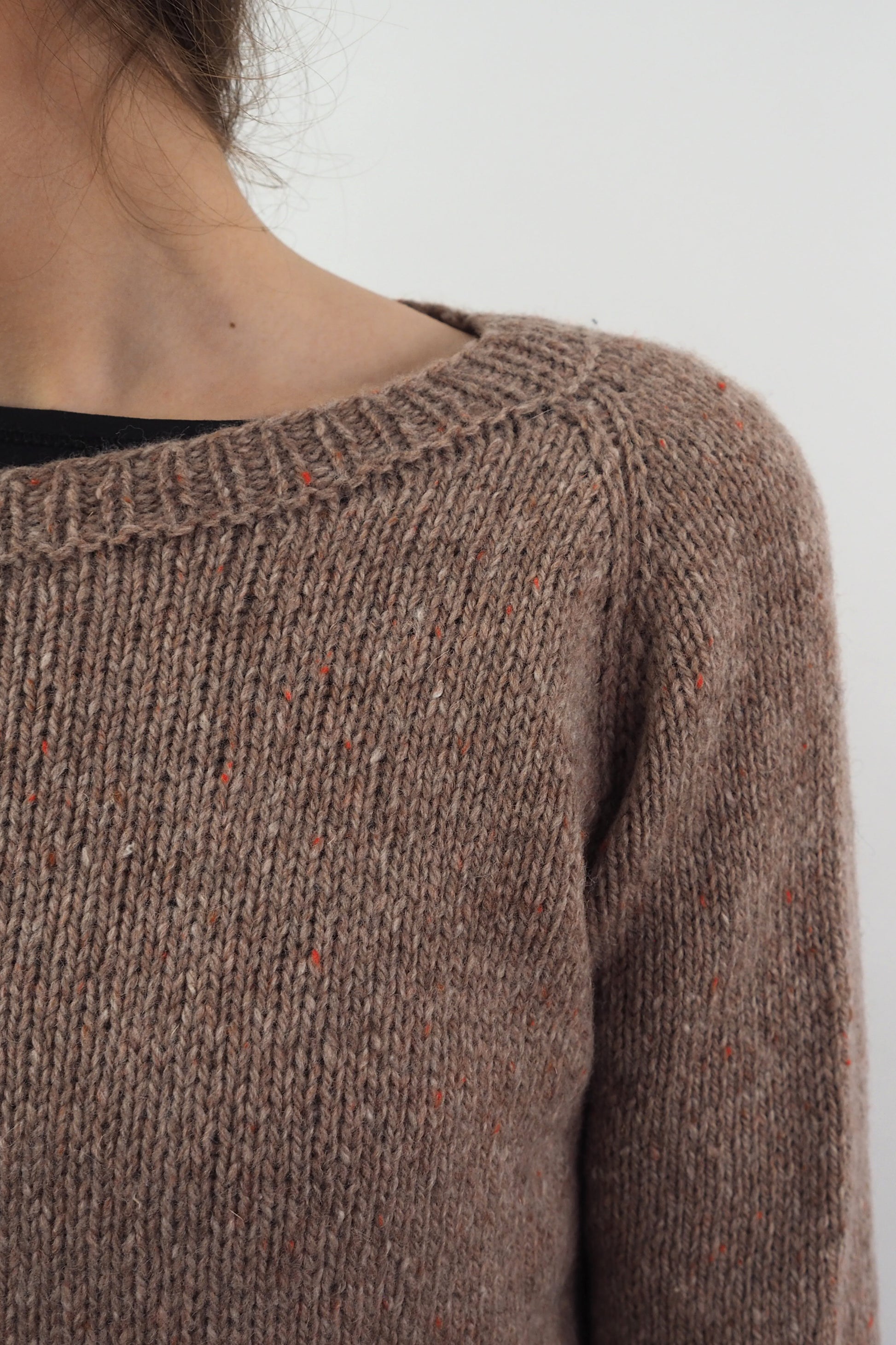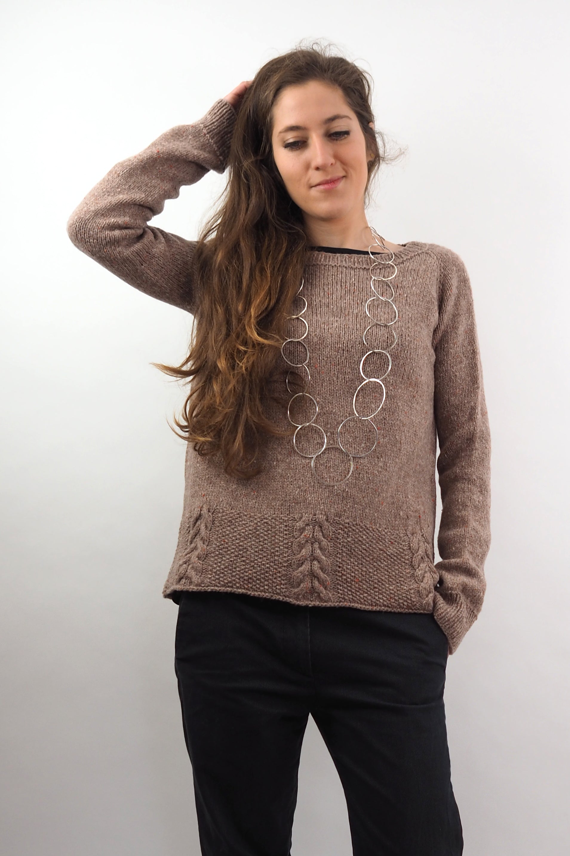 KARLA wird nahtlos von oben nach unten gearbeitet, mit verkürzten Reihen zum Formen des Ausschnittes und Raglanzunahmen. Der Körper wird mit einer sanften A-Linie gearbeitet, um eine lockere Passform zu erreichen. Die Anleitung enthält eine schlichte Raglan-Version des Pullovers und eine mit einem Zopfmusterabschluss.