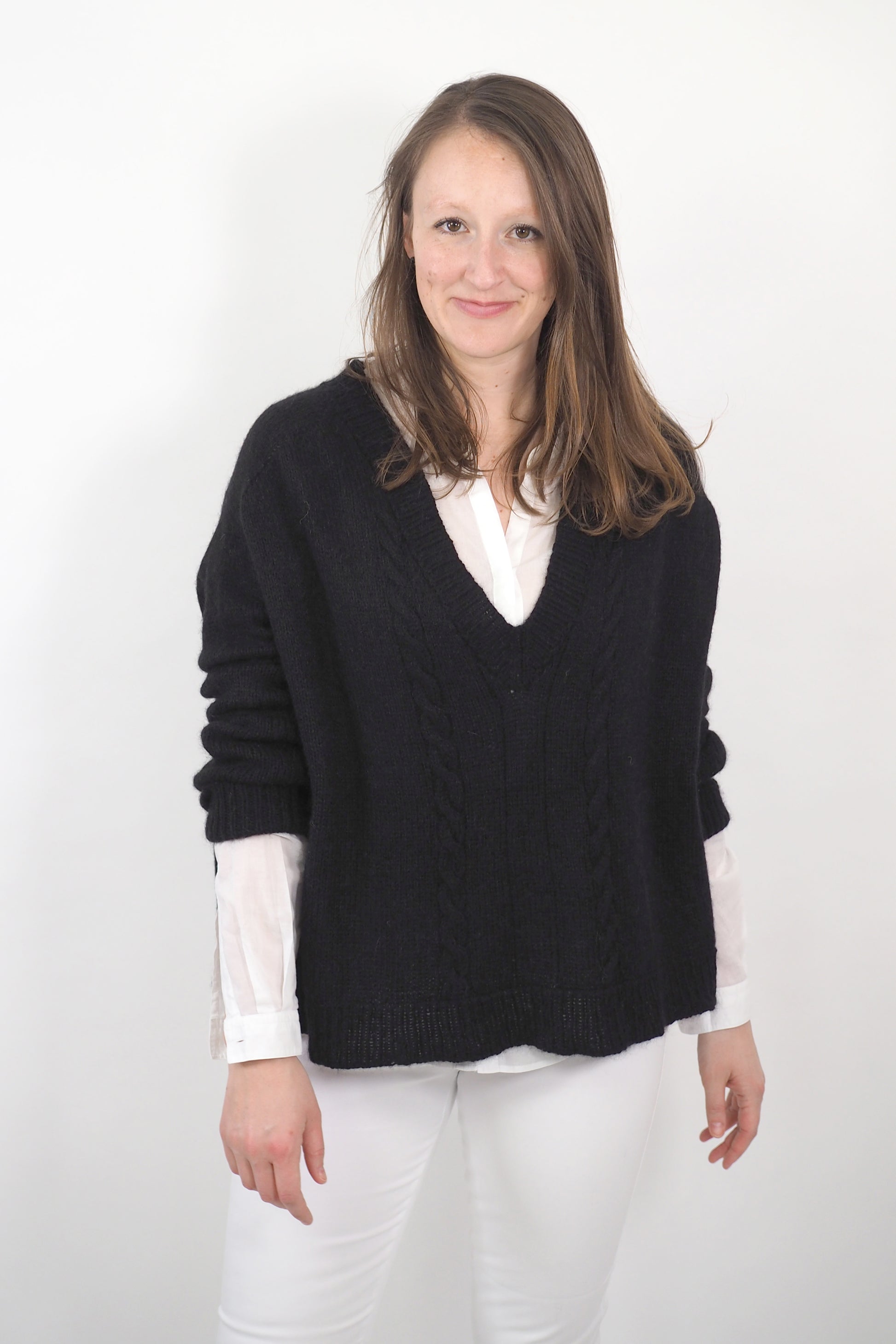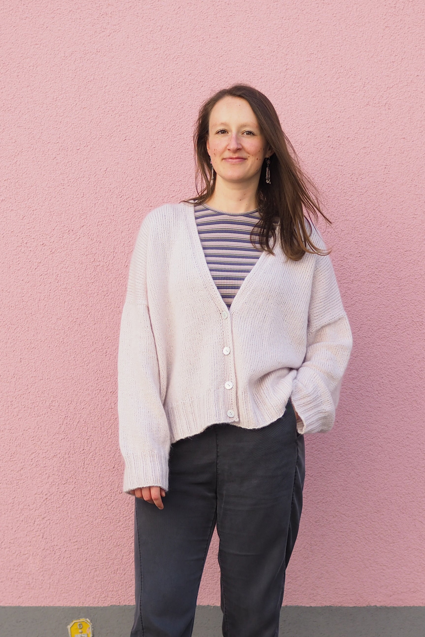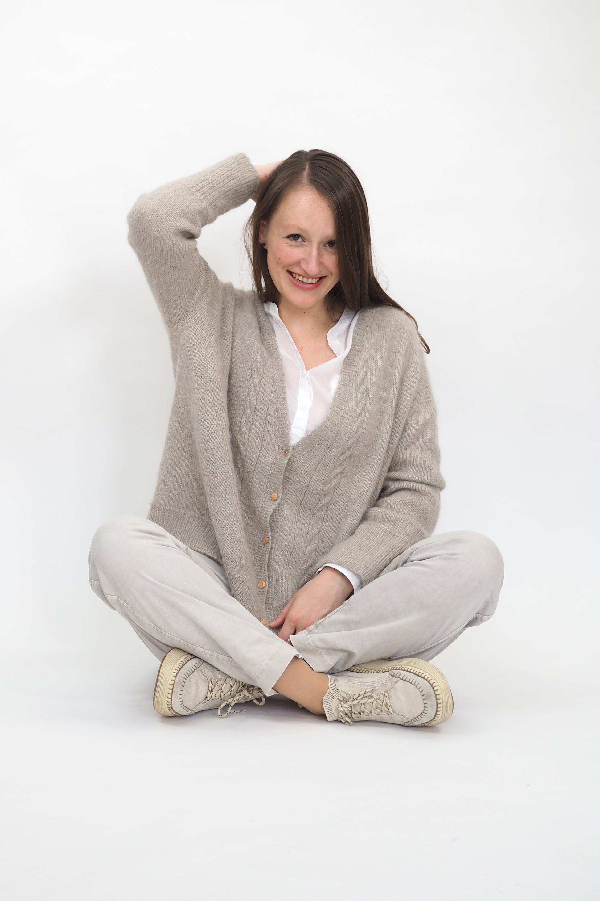 Unsere sechs Designs basieren auf Grundformen, die wir durch gezielte Anpassungen stark verändert haben. Der Cardigan „Tiramisu“ erhält seine großzügige Silhouette durch Raglanzunahmen, die zusätzlich in den Schulterpassen gestrickt werden. Die Form des Pullovers „Sina“ entsteht hingegen durch lange, schräge Schulterlinien.