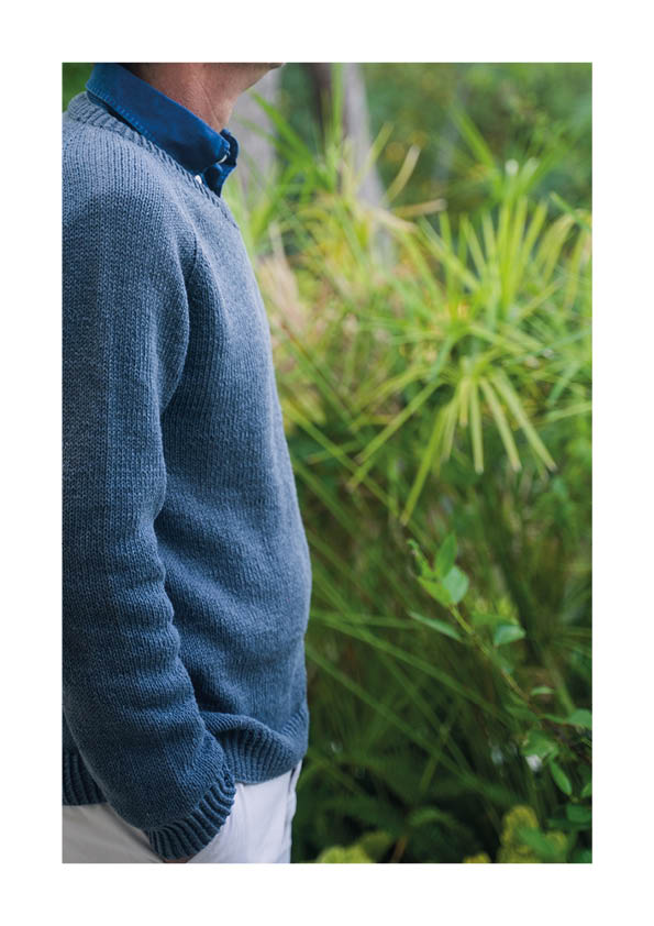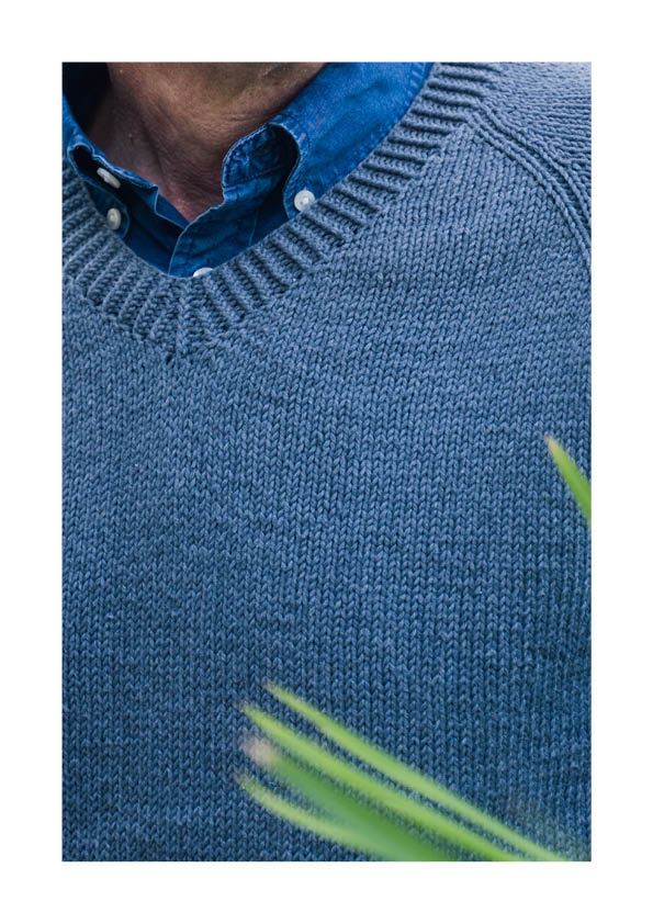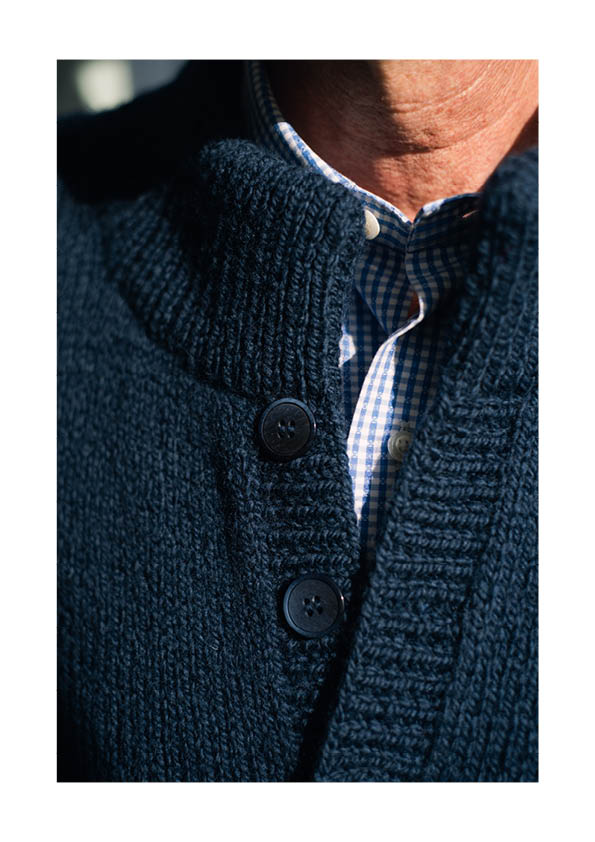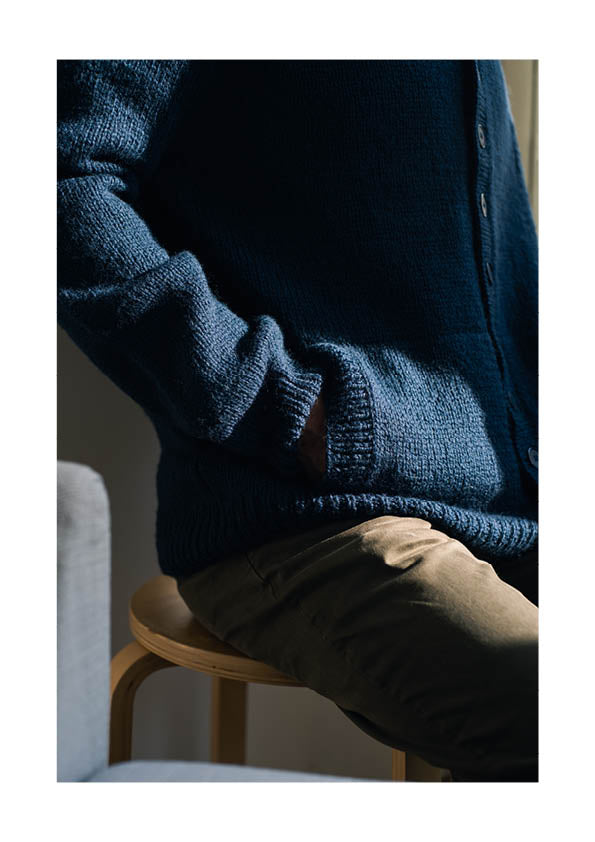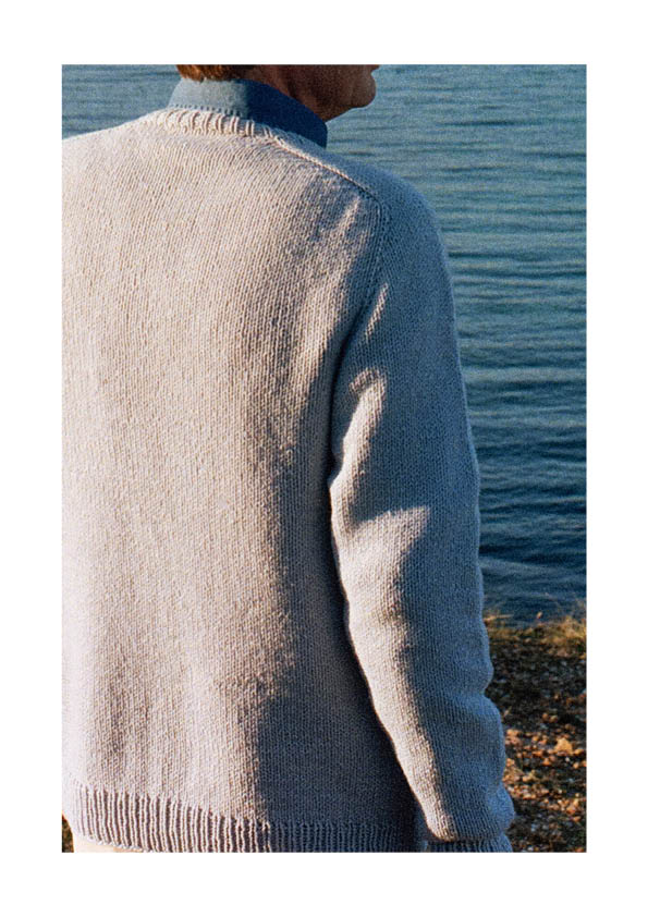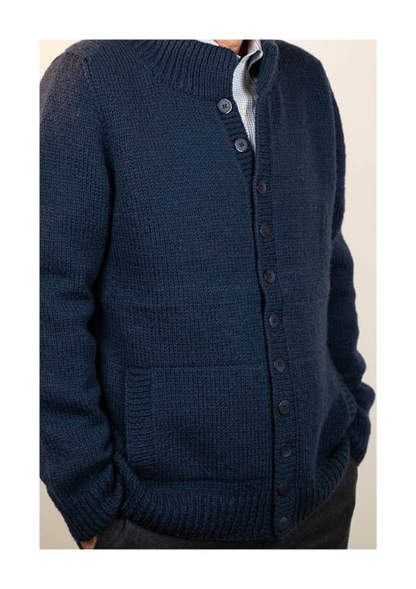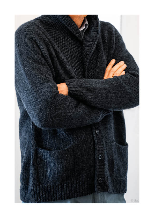 Unsere 5 Modelle basieren auf Grundformen, die der klassischen Männermode folgen: zwei Cardigans, einer davon mit Schalkragen, der zweite mit doppelt gestricktem Kragen. Bei den Pullovern haben wir je einen