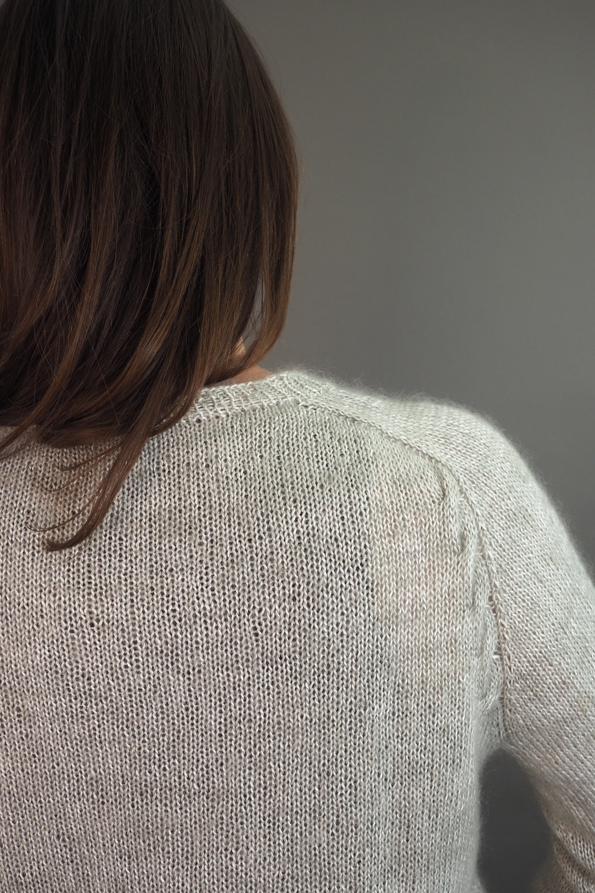 HABIBI bedeutet „Liebling“ und ist aus Herzfaserns Lieblingsgarn °50 gestrickt. Der Pullover wird nahtlos von oben bis unten gestrickt. Zu Beginn werden mit der Contiguous-Methode von Susie Myers Zunahmen für die Schulterpasse vorgenommen. Sobald die Schulterpasse fertig ist, werden geneigte Zunahmen für die Ärmel gearbeitet, sowie Zunahmen in den Zopfmustern für die Vorder- und Rückseite. Nach dem Abtrennen der Ärmel werden das untere Körperteil und die Ärmel glatt rechts gestrickt. Für den Abschluss des Halsausschnitts werden Maschen aufgenommen. Alle Maschen am Saum, an den Ärmelbündchen und am Halsausschnitt werden mit einer I-Kordel über zwei Maschen abgekettet.