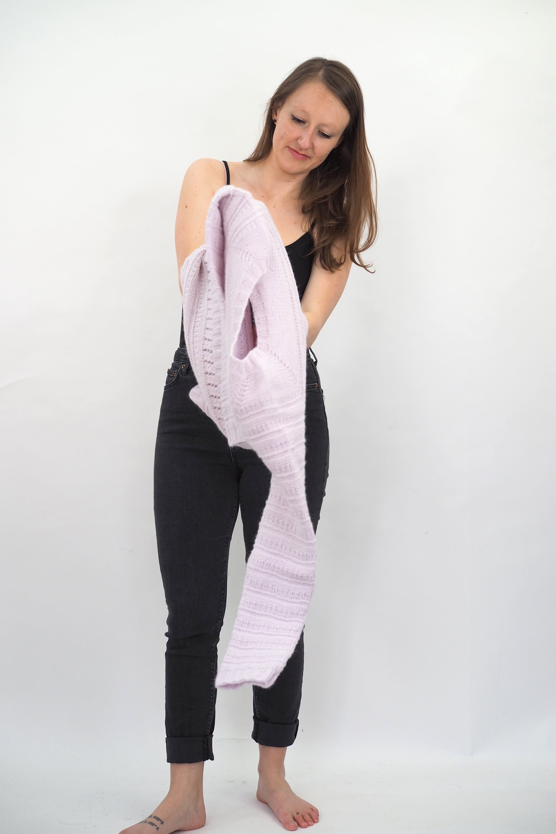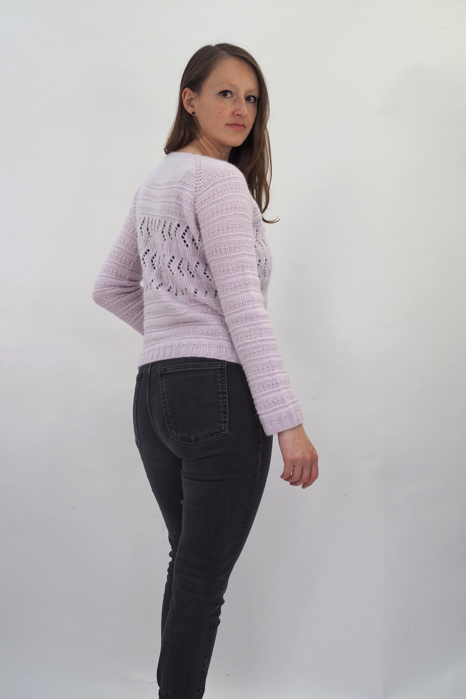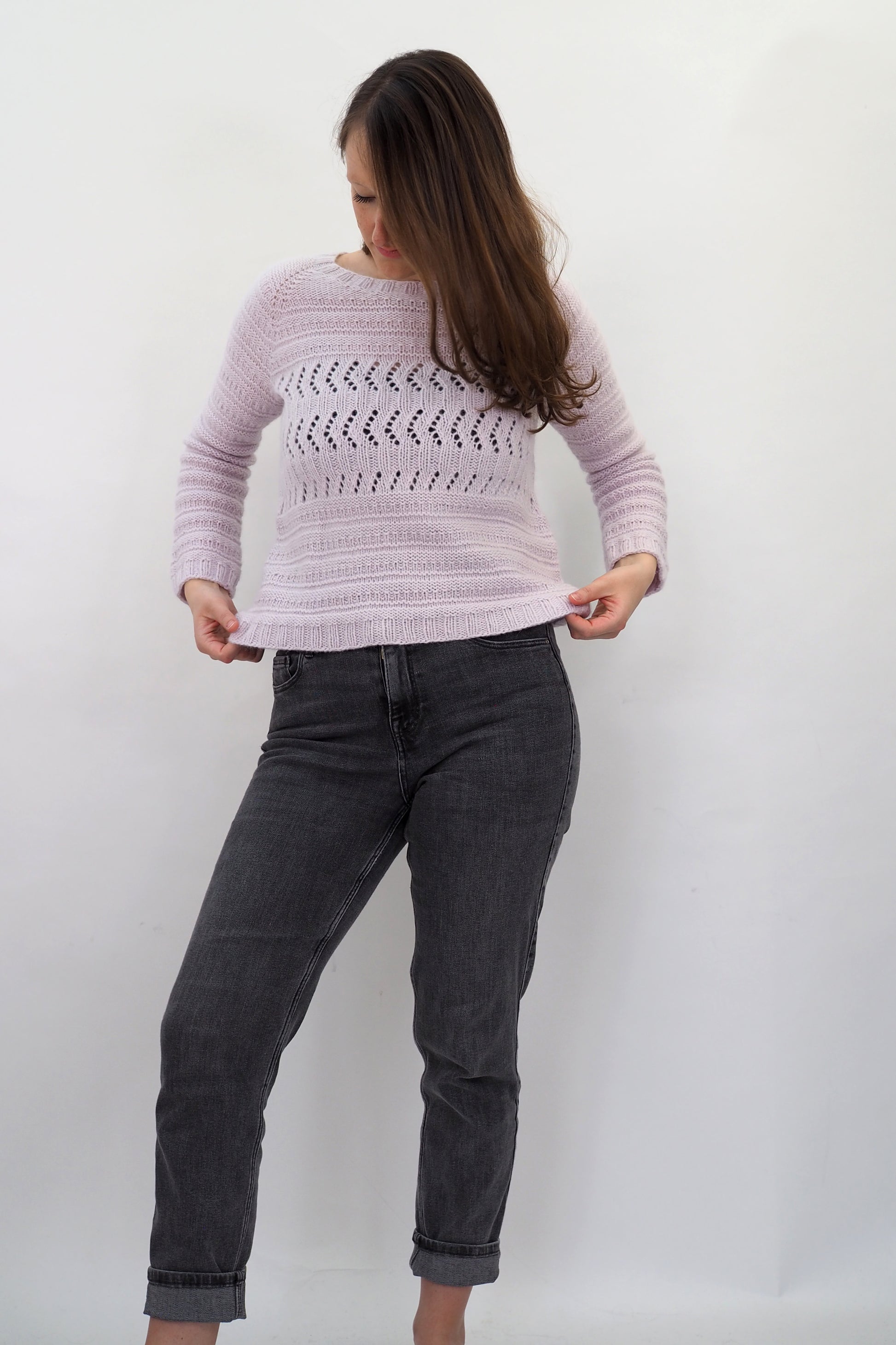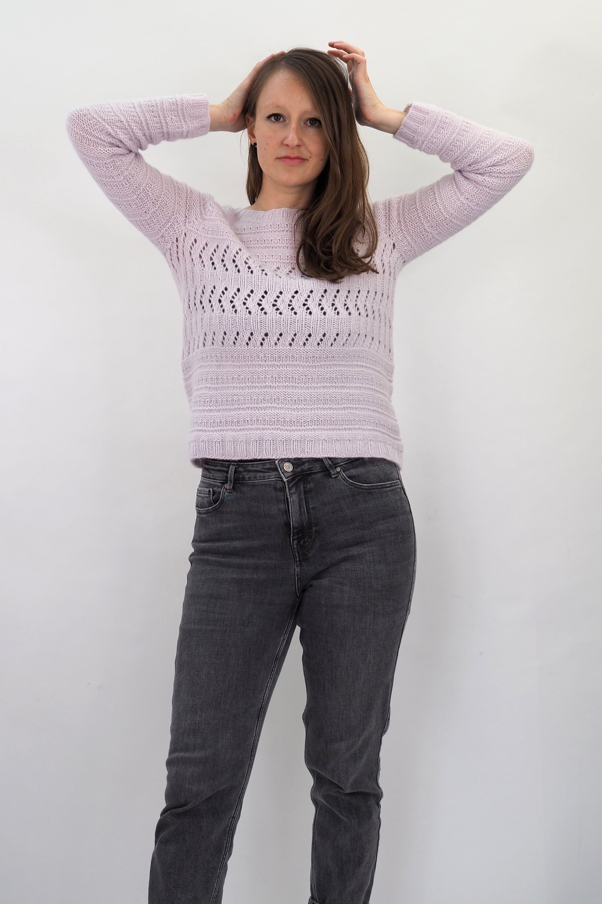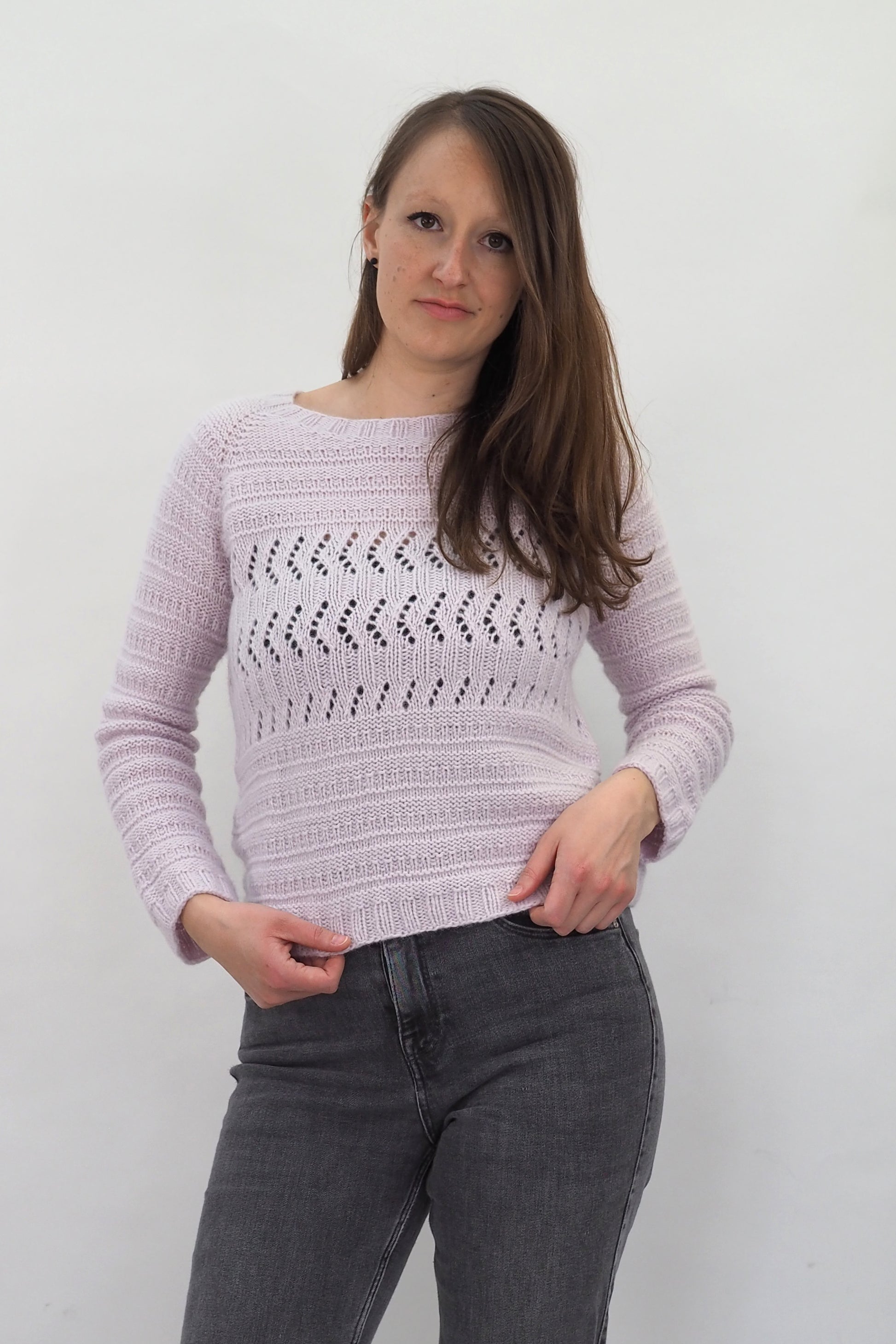 LAURA wird mit Raglanzunahmen nahtlos von oben nach unten gestrickt, der Ausschnitt wird mit verkürzten Reihen geformt.