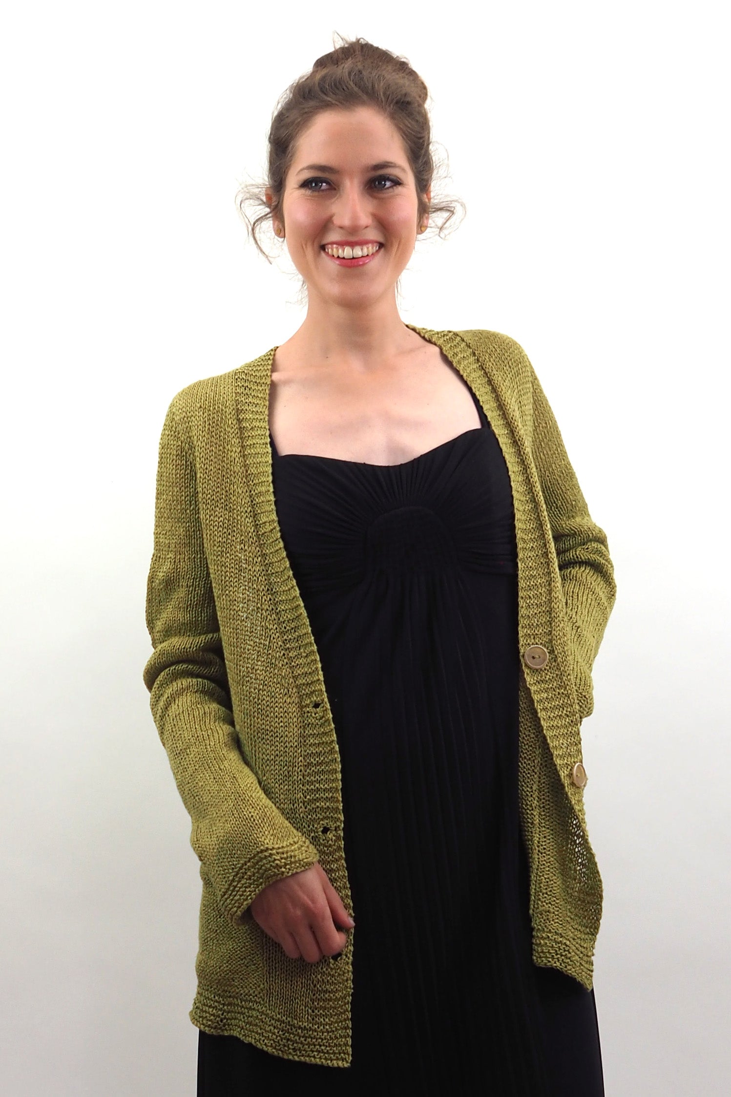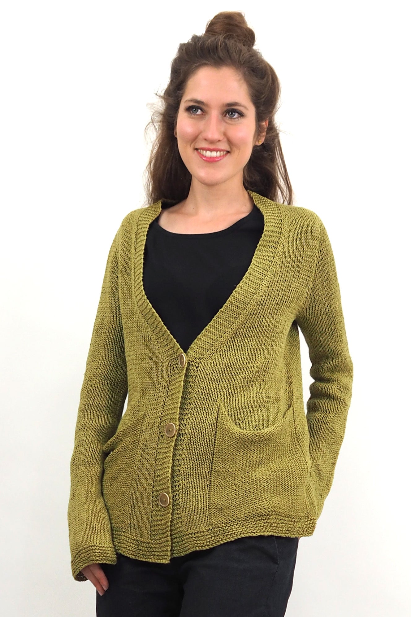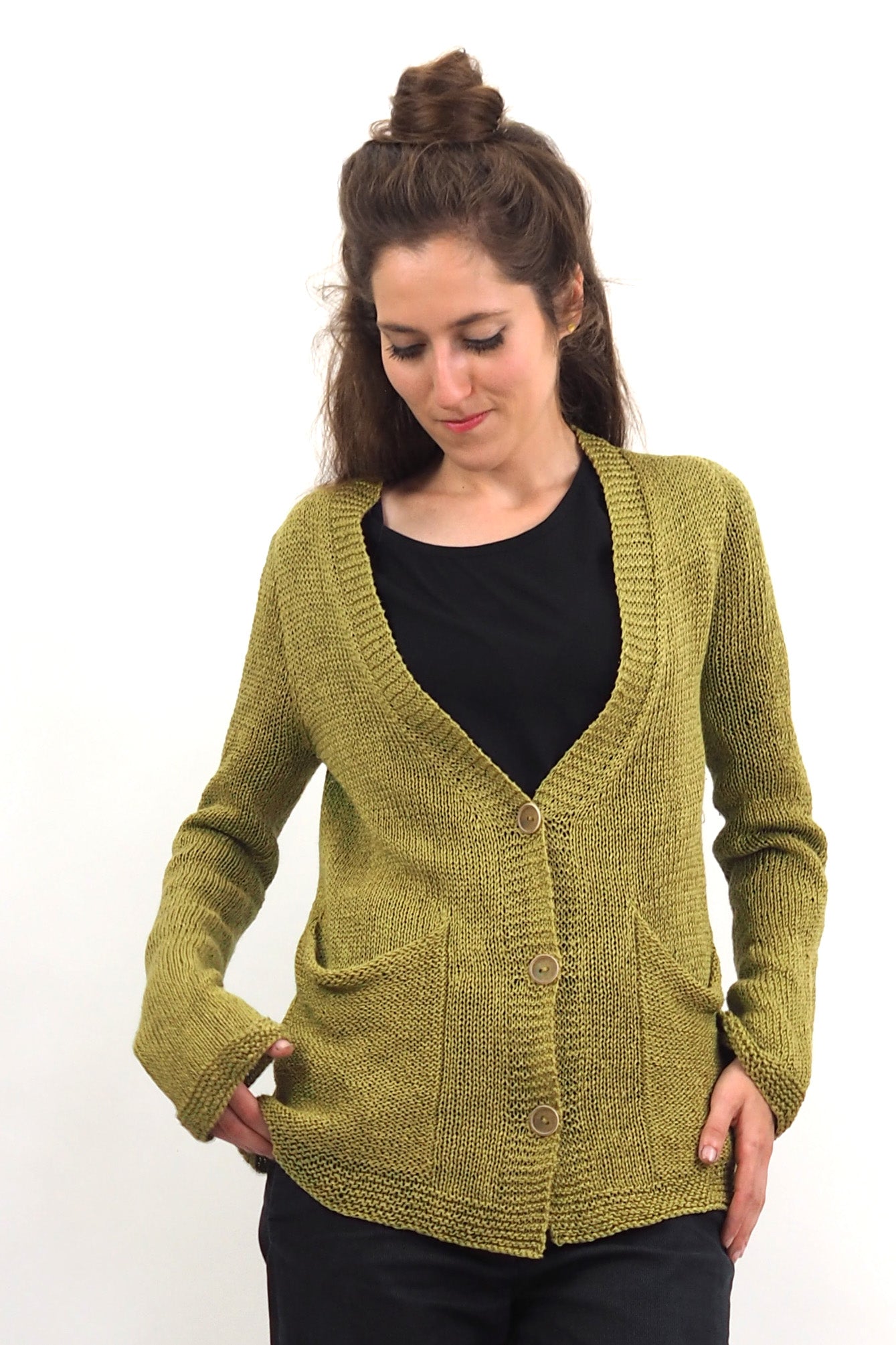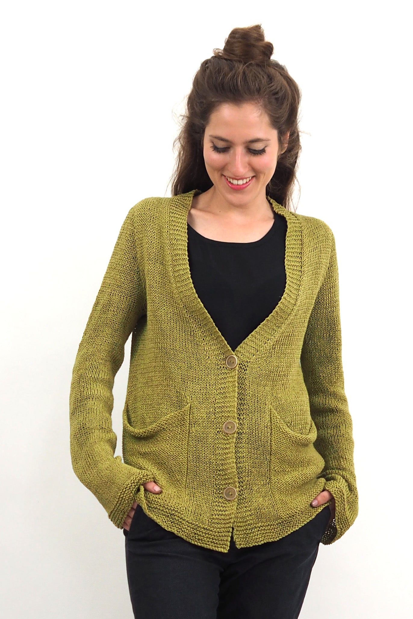 LOKE ist eine lässige Strickjacke, die nahtlos von oben nach unten gearbeitet wird. Sie beginnt mit einem provisorischen Maschenanschlag für die Blende. Die Schultern werden mit der Methode "contiguous" geformt.