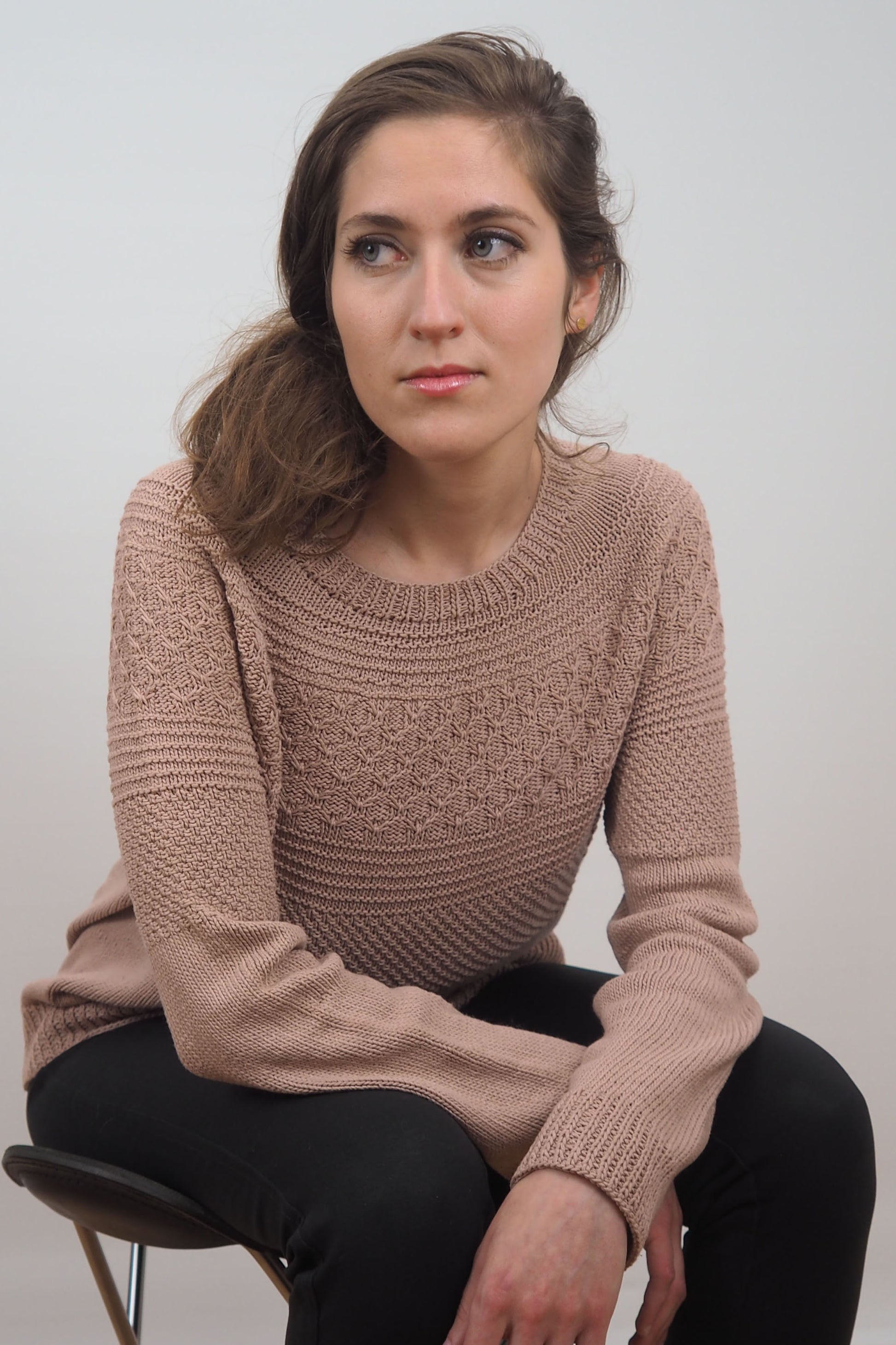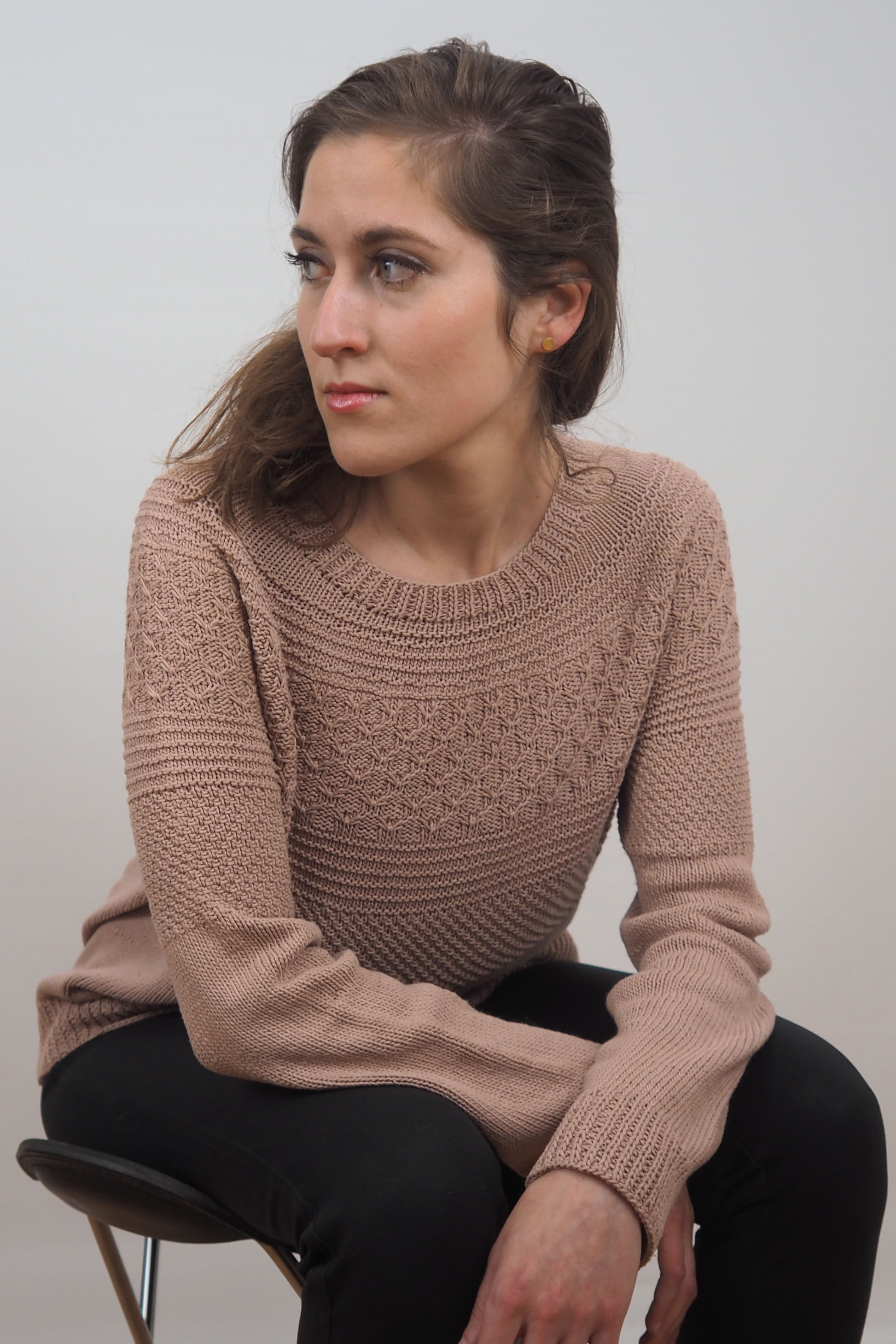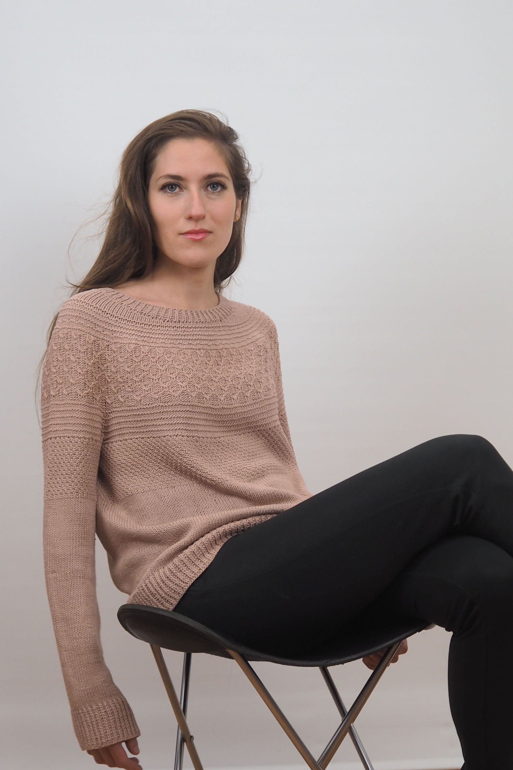Lotta wird nahtlos von oben nach unten gestrickt. Um den Ausschnitt zu formen, werden verkürzte Reihen gearbeitet. Zunahmen für die Passe werden gleichmäßig in der Runde gearbeitet, gefolgt von einem süßen Hebemaschenmuster.