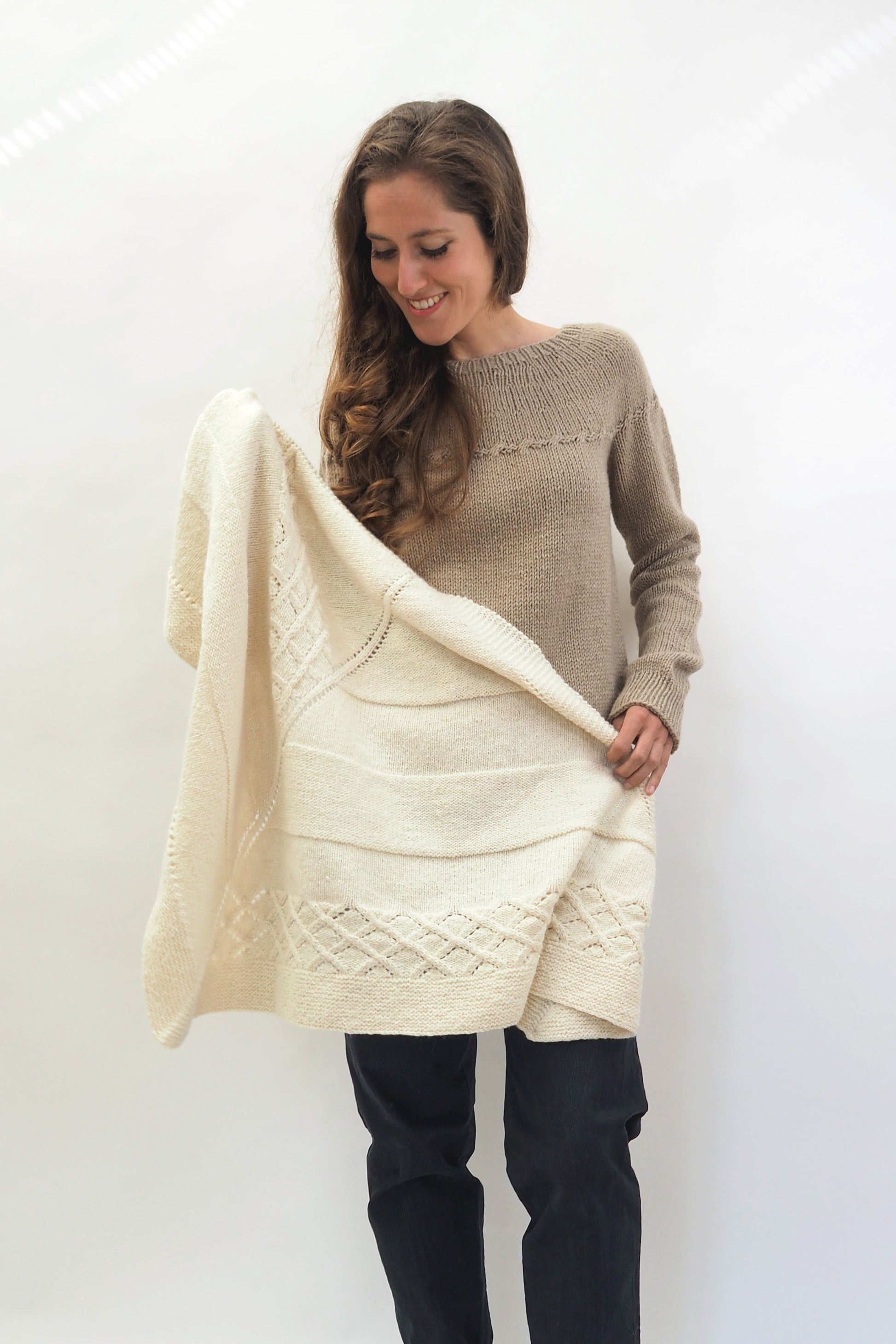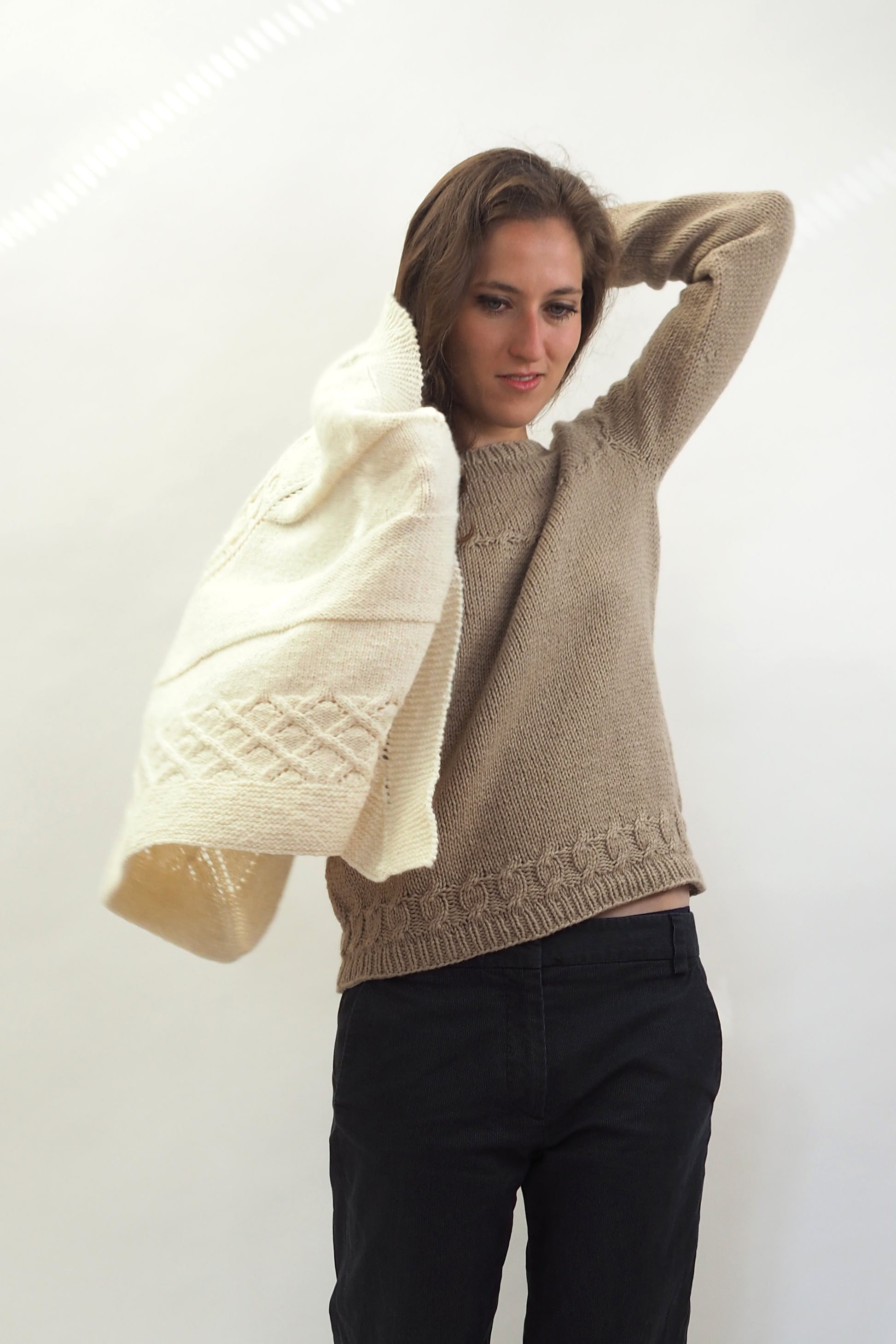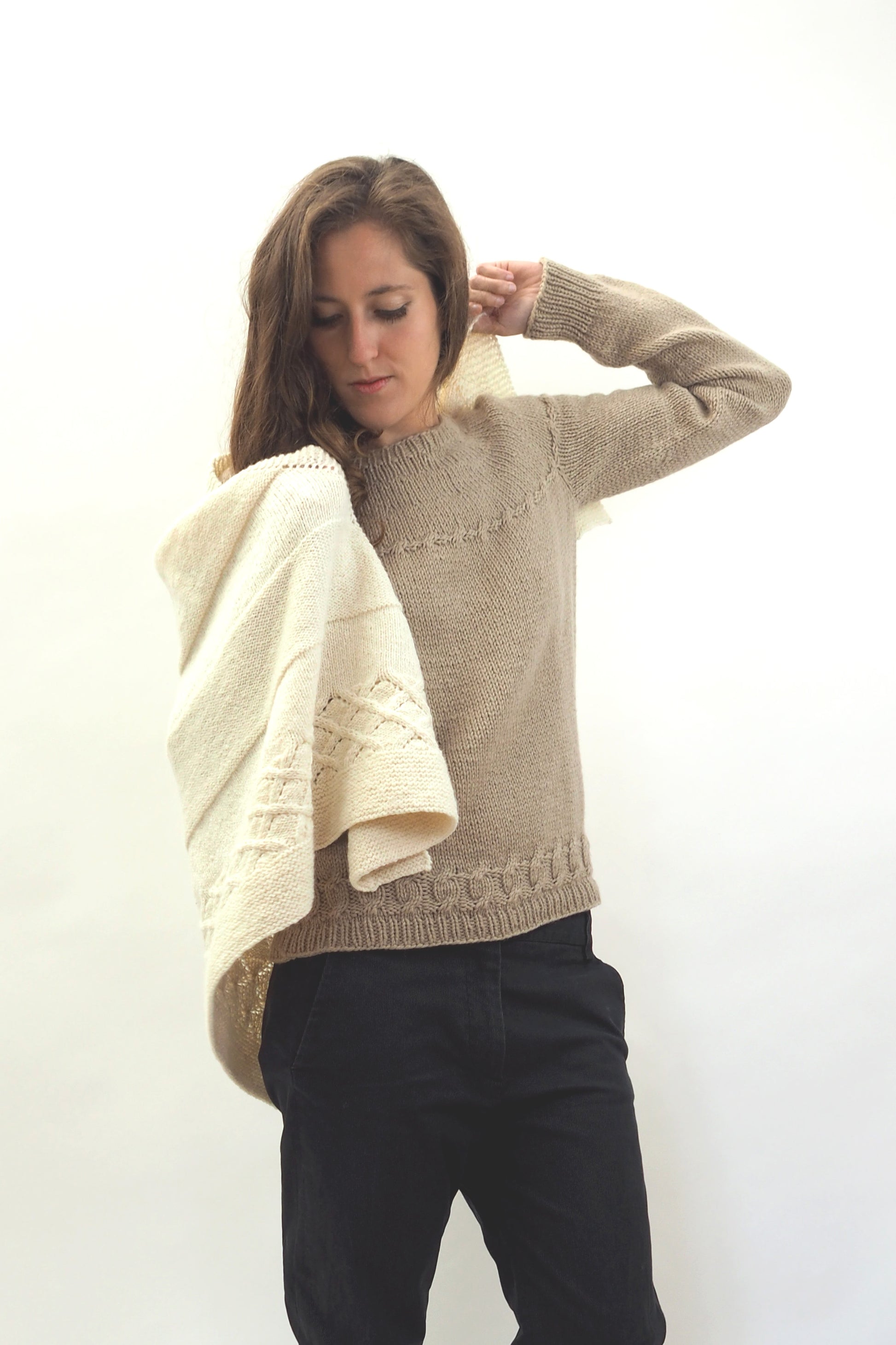 ALMA von Regina Mössme, gestrickt mit HERZFASER NO.14 in der Farbe ZEITFLUSS unserer MEISTERSTÜCKE – FARBIGE BILDER von Herzfasern – exklusiv bei Herr U am Amalienpark.