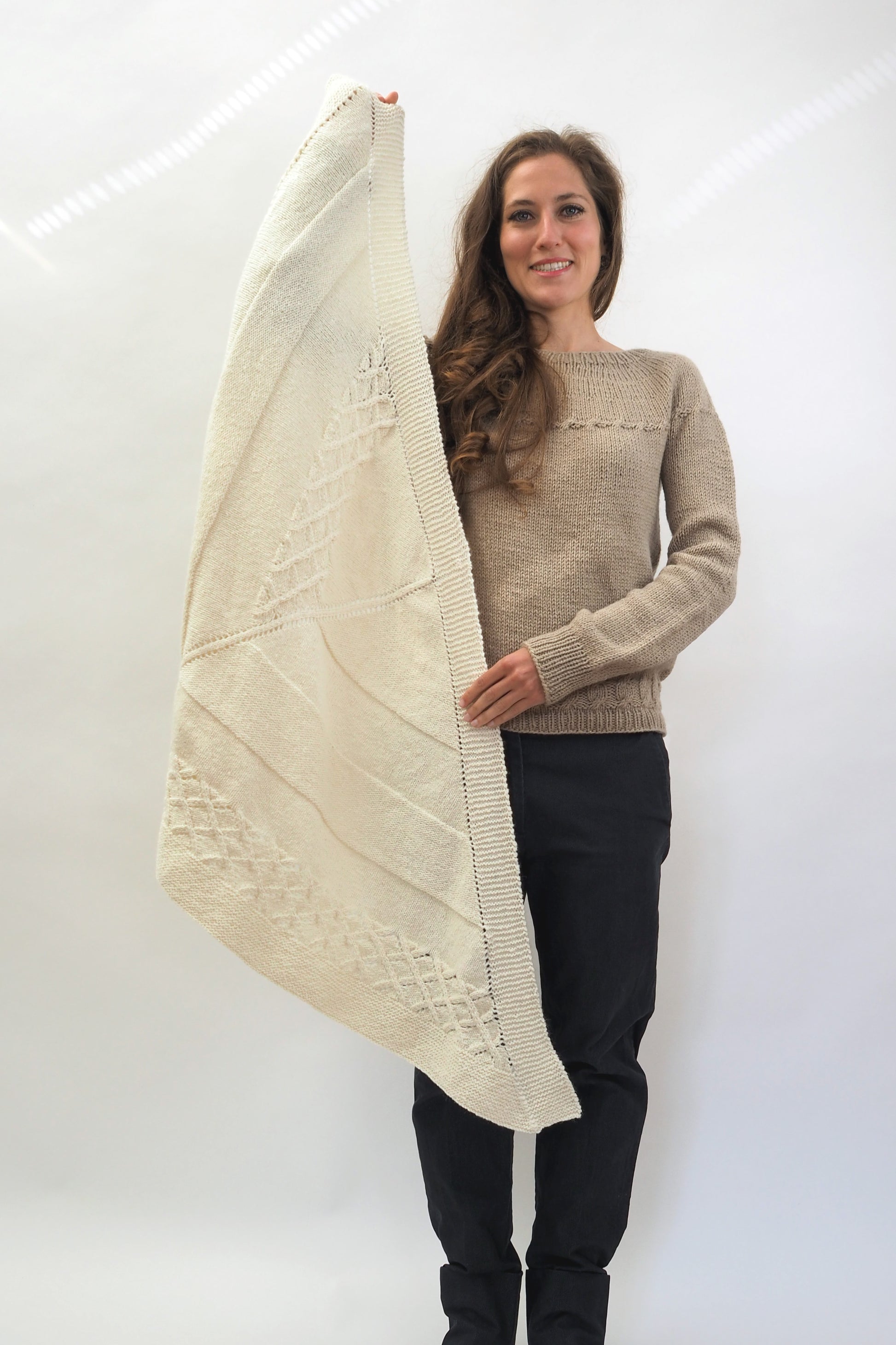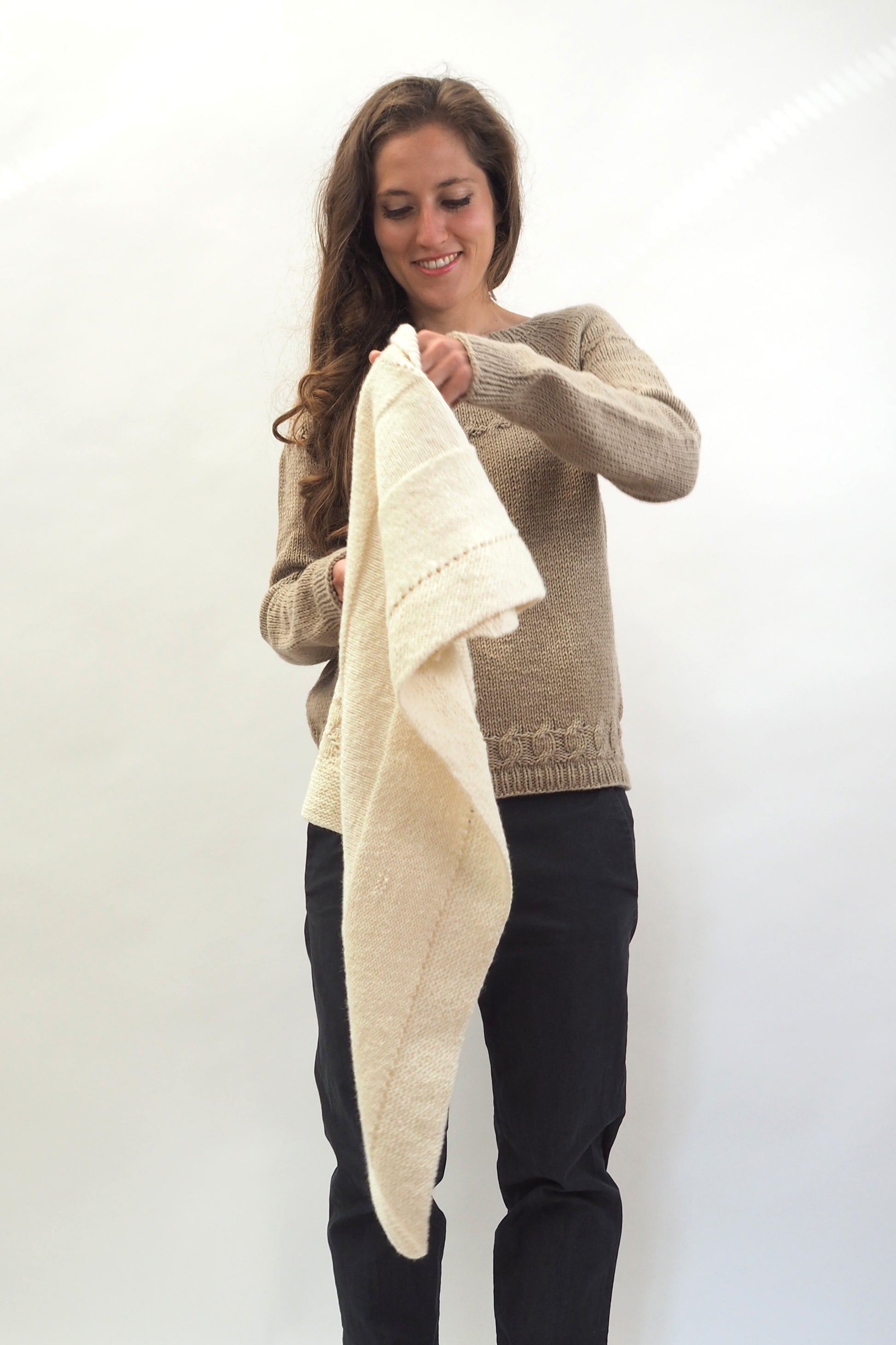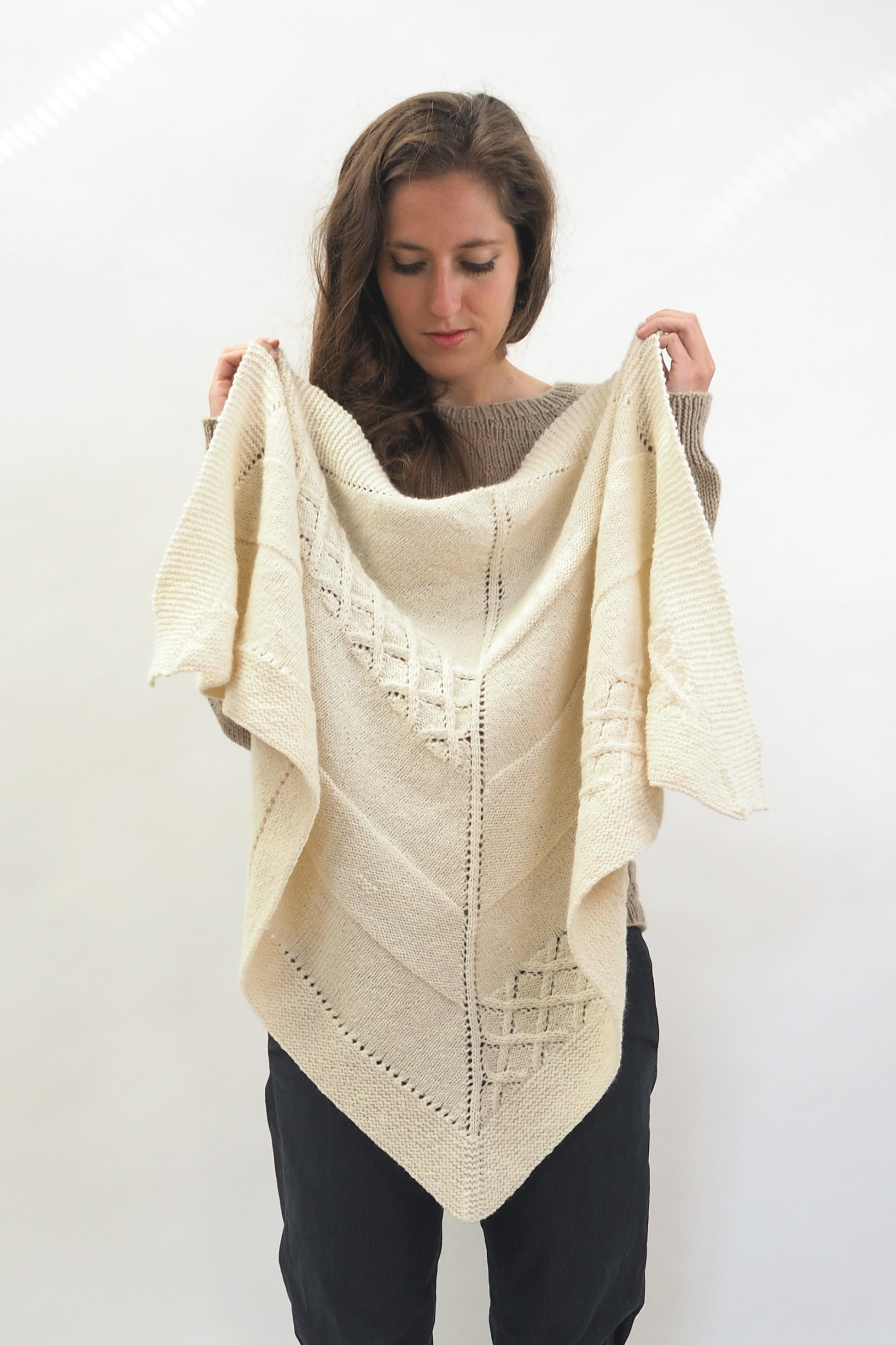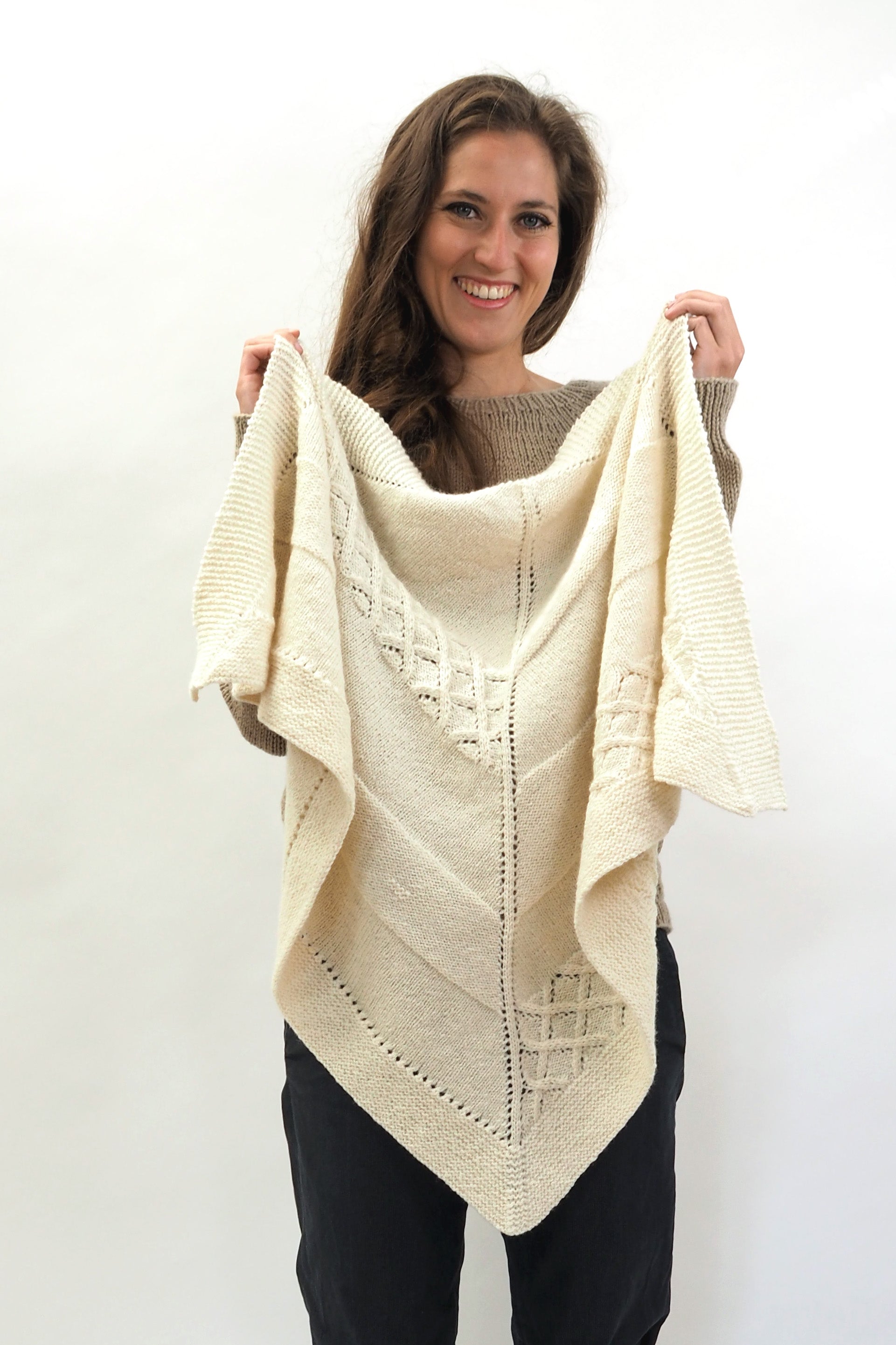 LUCCA ist ein dreieckiges Tuch, das vom Zentrum zur kraus gestrickten Kante hin gearbeitet wird. Die Streifen werden im glatt rechts gestrickten Muster, im glatt linken Muster und in einem Gittermuster gestrickt.