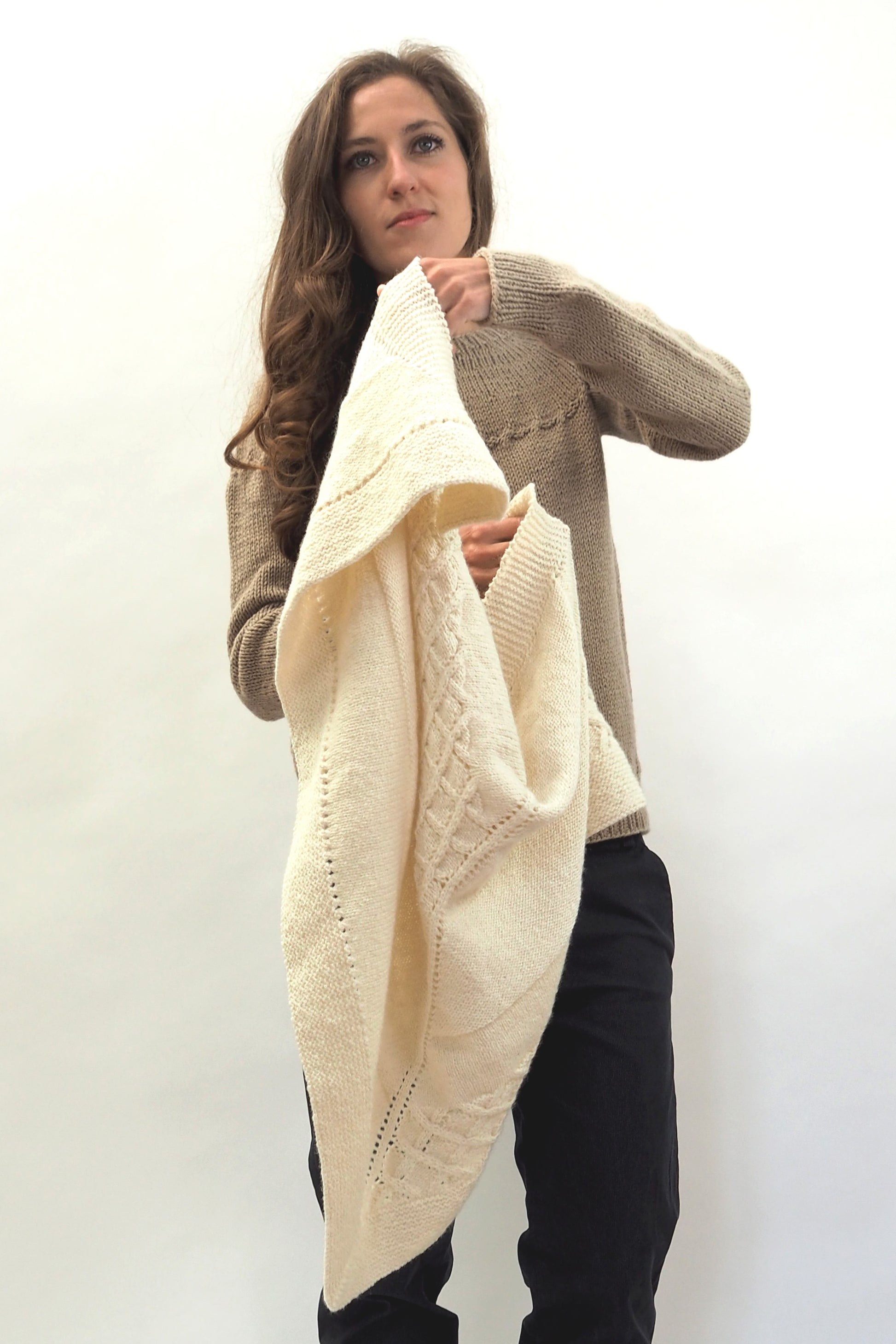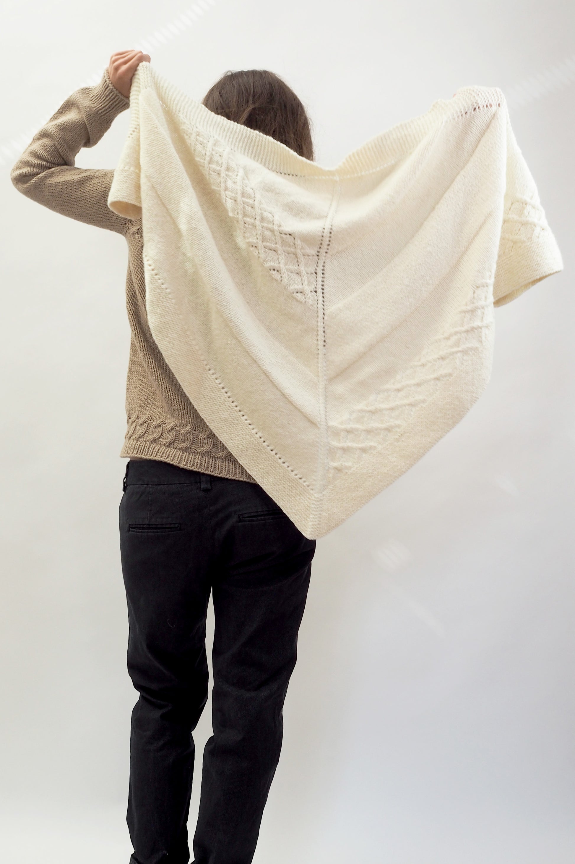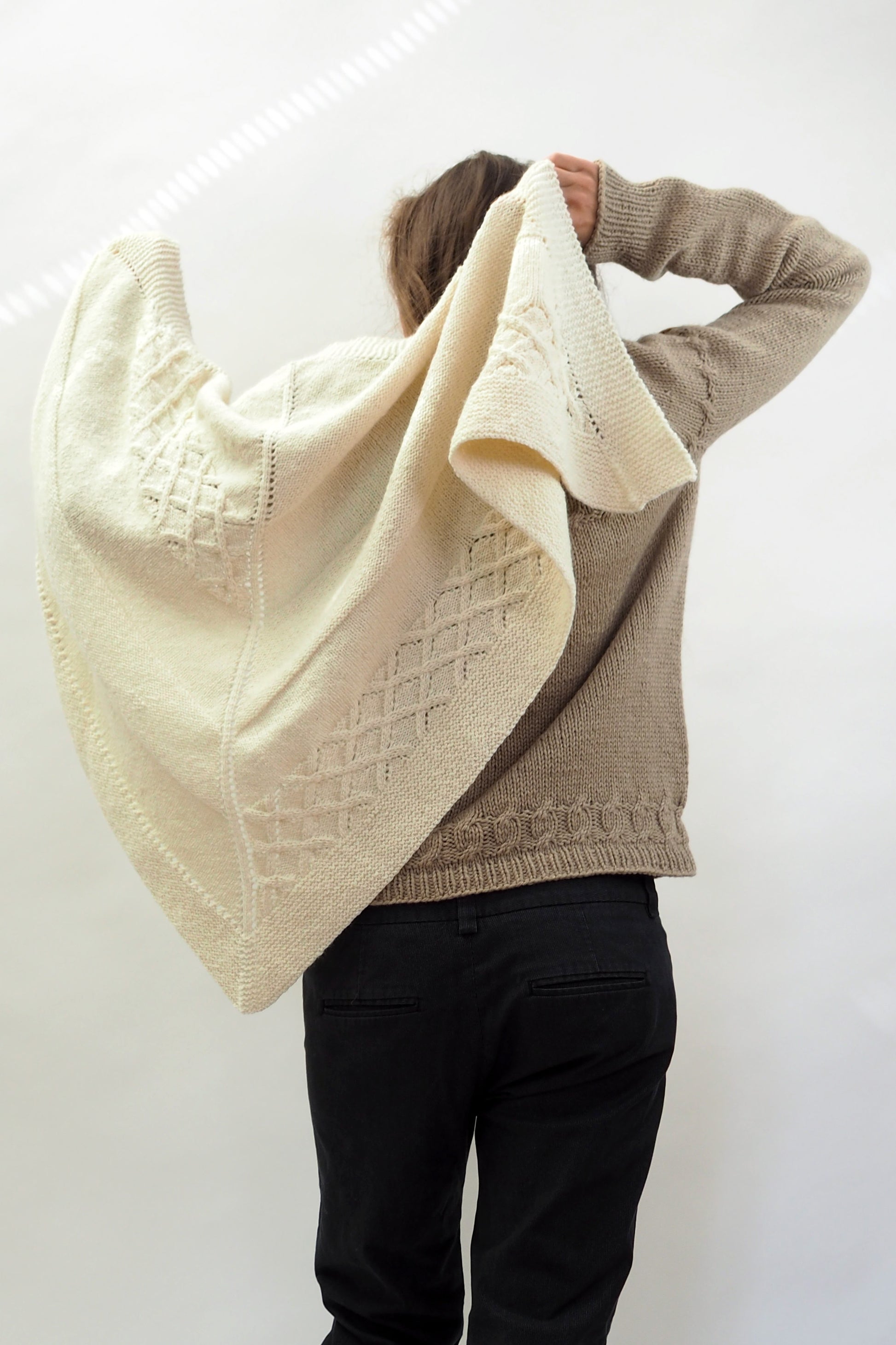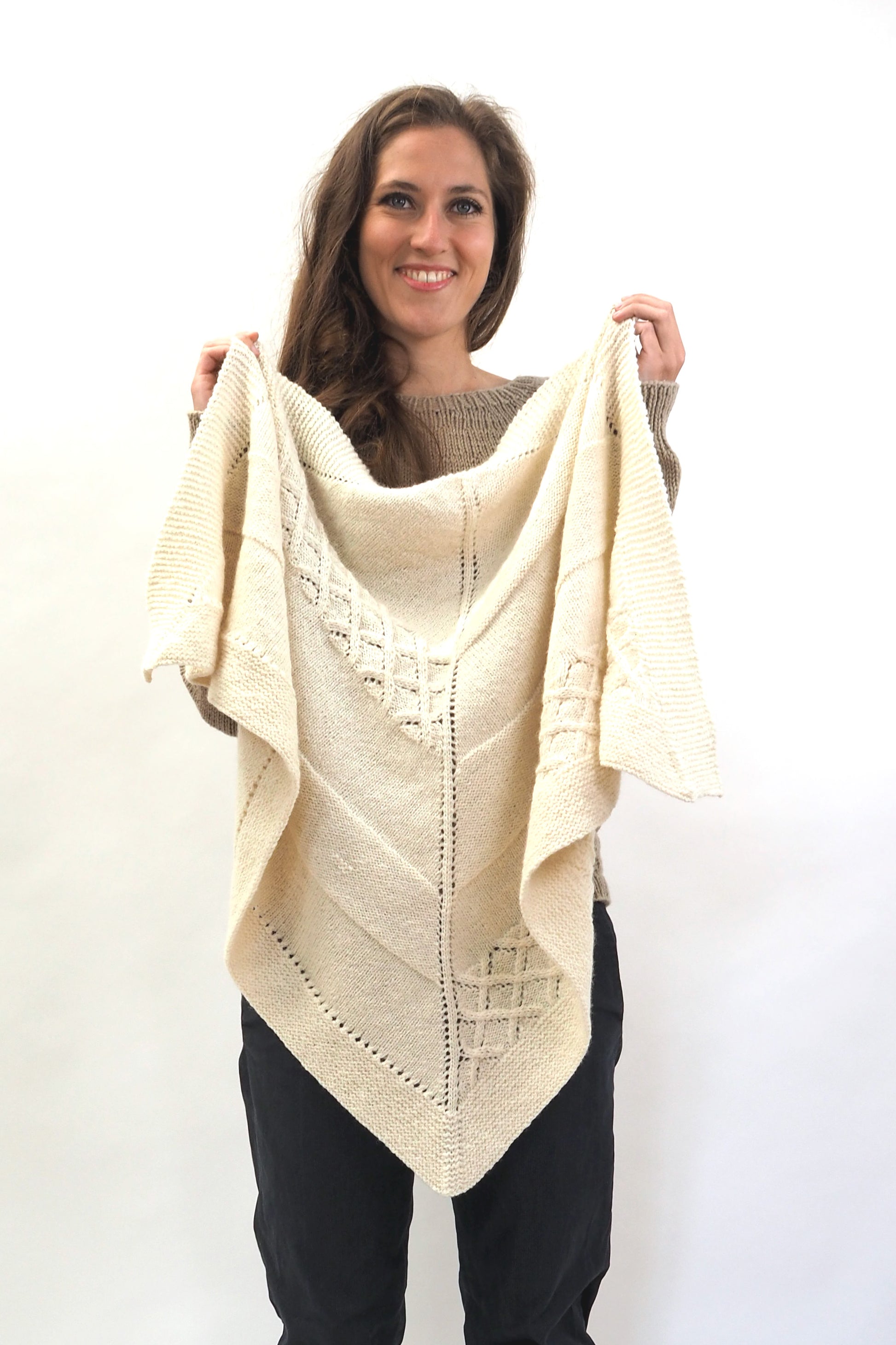 LUCCA ist ein dreieckiges Tuch, das vom Zentrum zur kraus gestrickten Kante hin gearbeitet wird. Die Streifen werden im glatt rechts gestrickten Muster, im glatt linken Muster und in einem Gittermuster gestrickt.