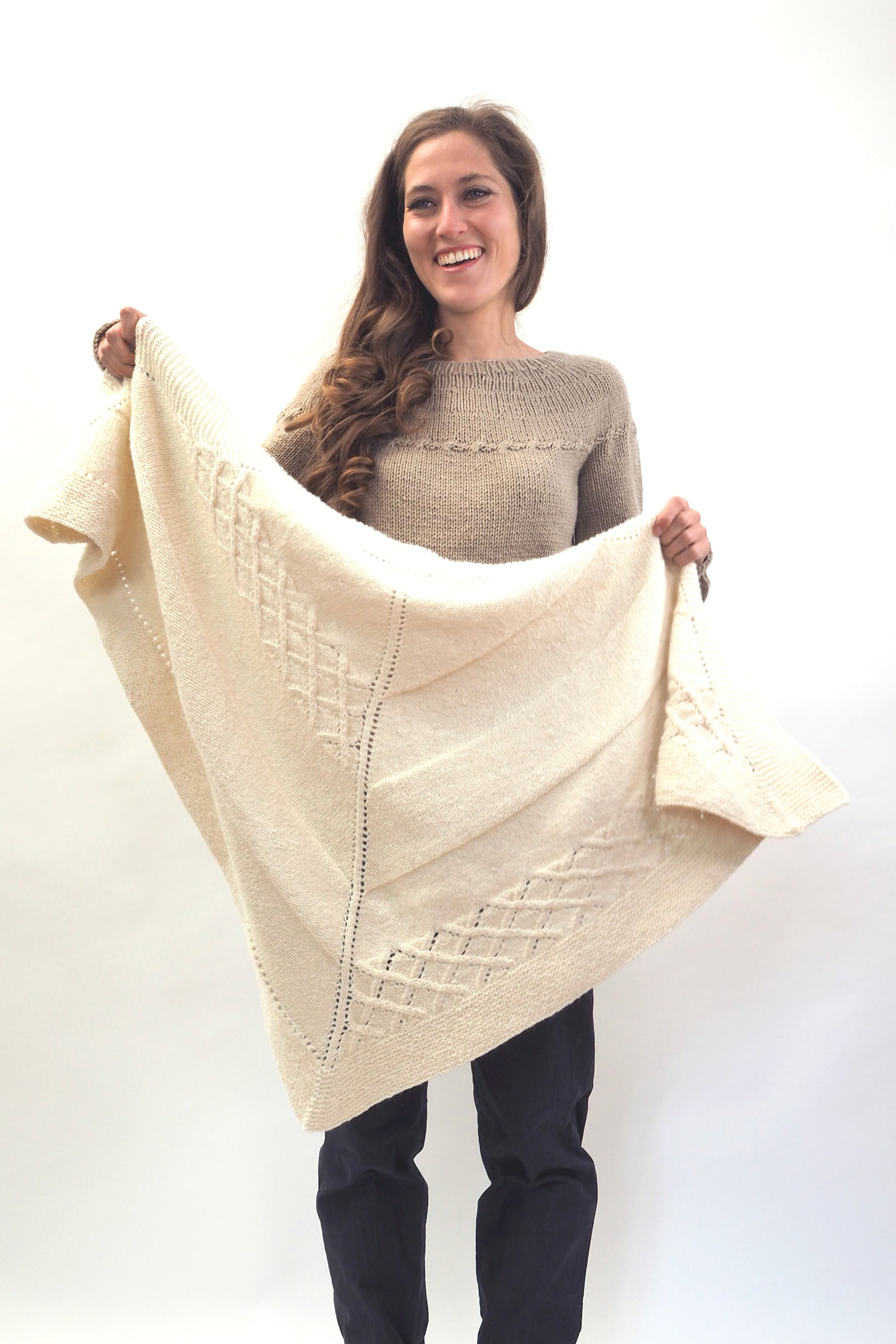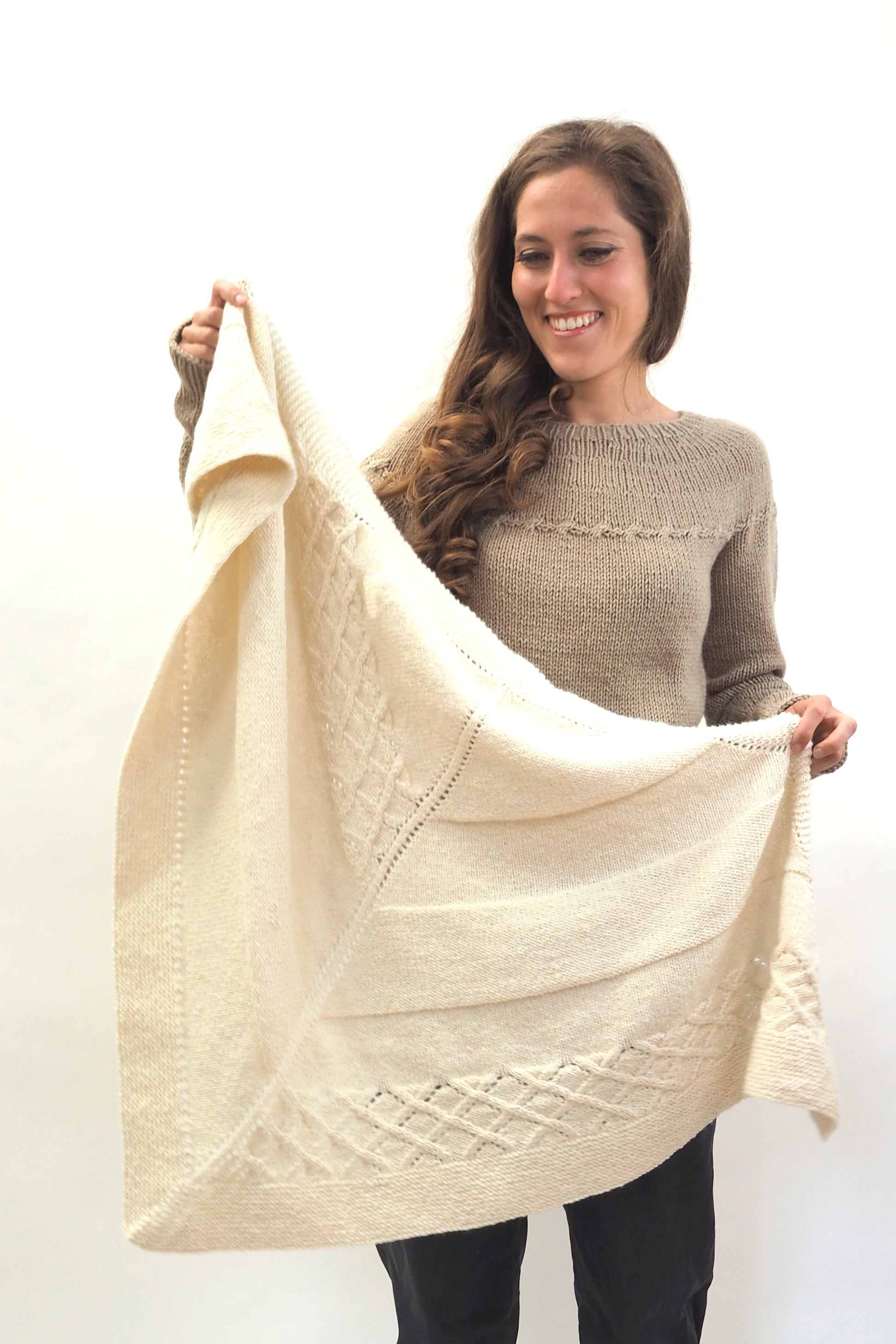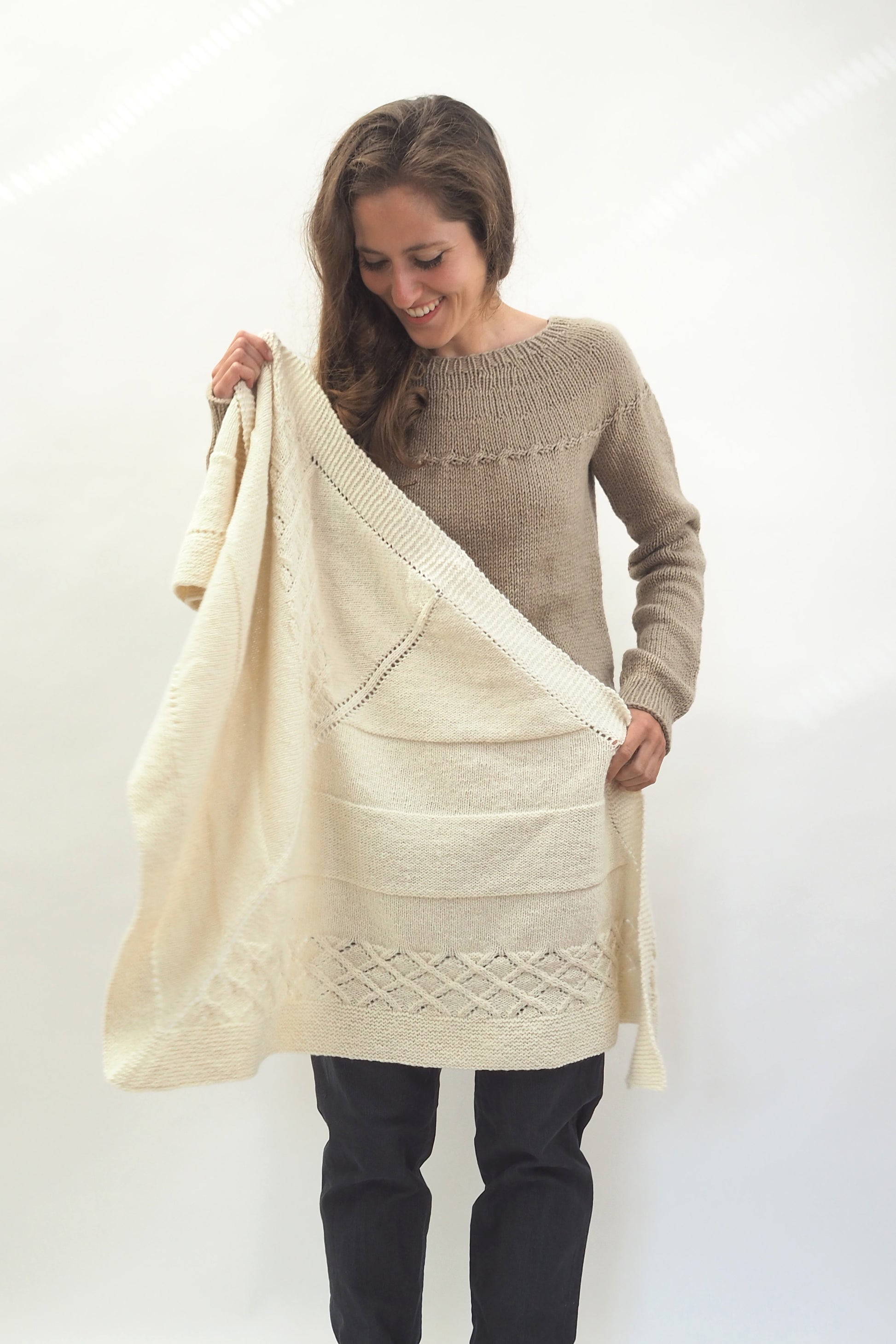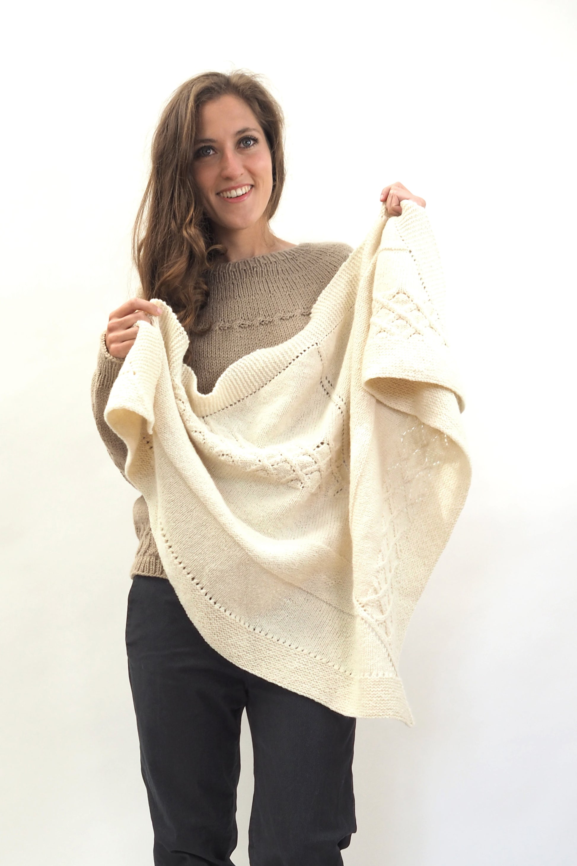 LUCCA ist ein dreieckiges Tuch, das vom Zentrum zur kraus gestrickten Kante hin gearbeitet wird. Die Streifen werden im glatt rechts gestrickten Muster, im glatt linken Muster und in einem Gittermuster gestrickt.