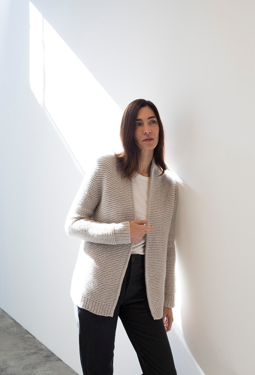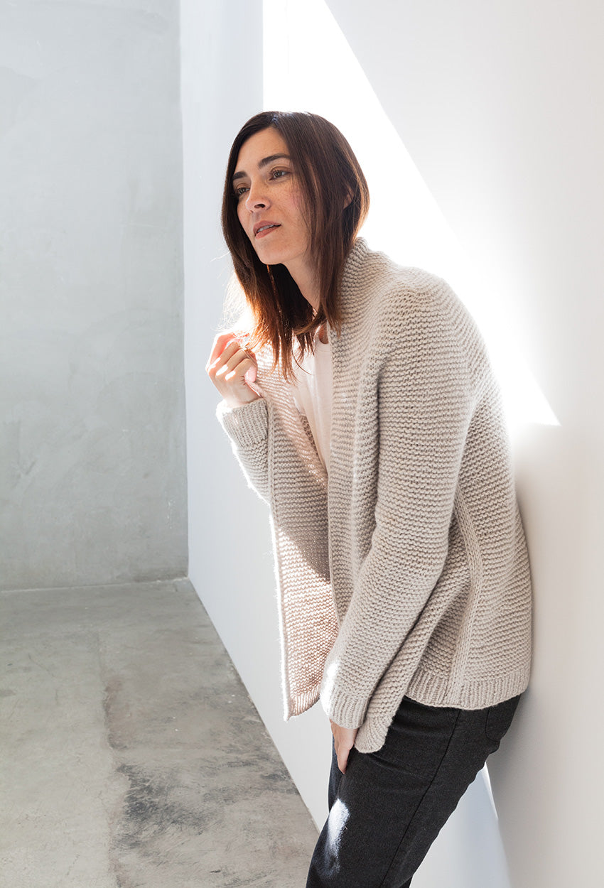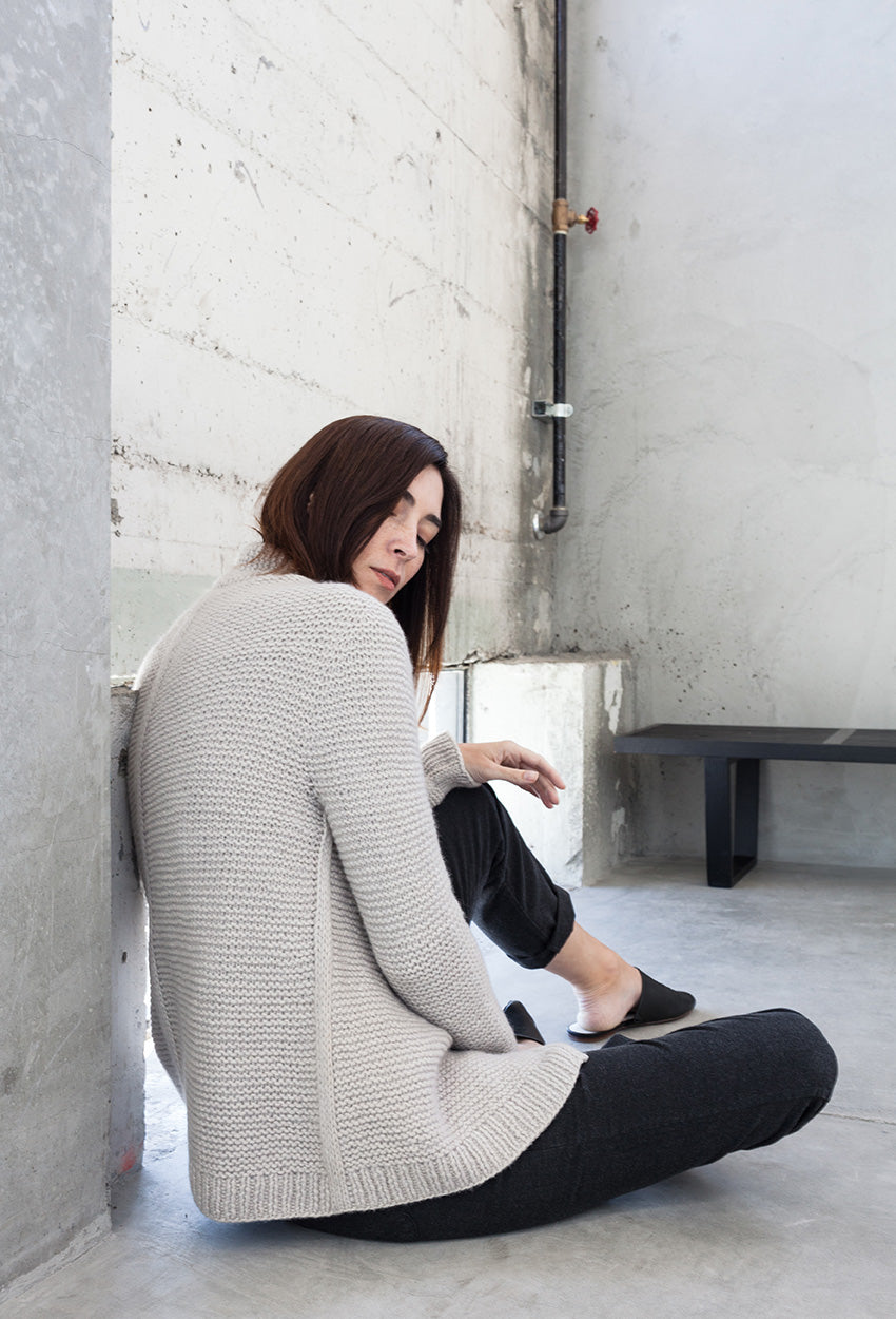 ALMA von Regina Mössme, gestrickt mit HERZFASER NO.14 in der Farbe ZEITFLUSS unserer MEISTERSTÜCKE – FARBIGE BILDER von Herzfasern – exklusiv bei Herr U am Amalienpark.