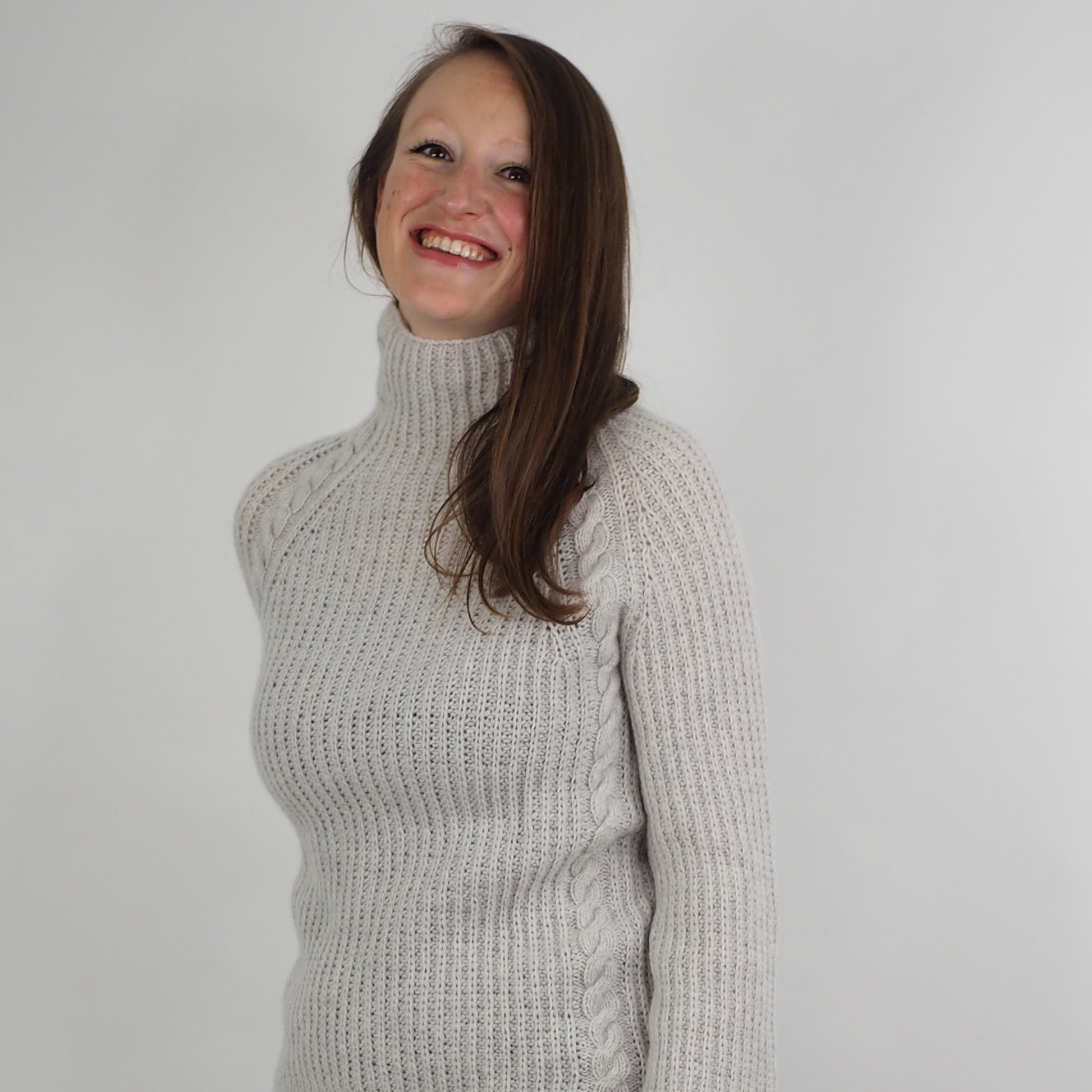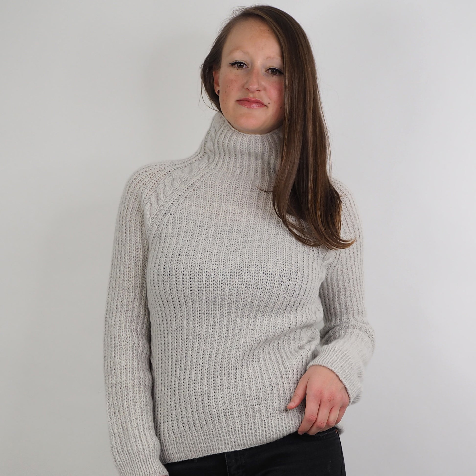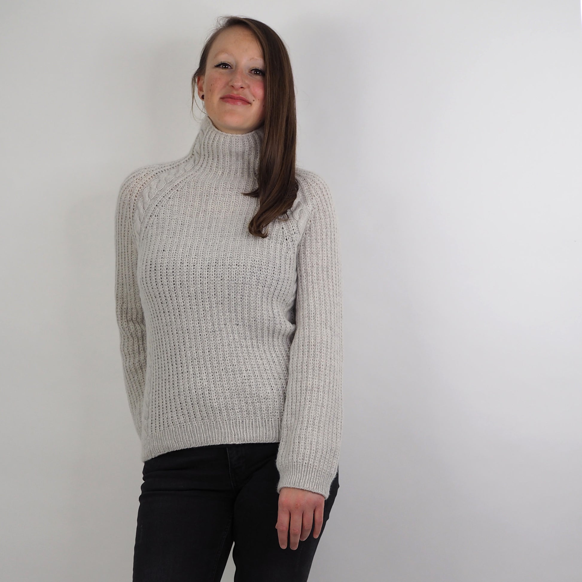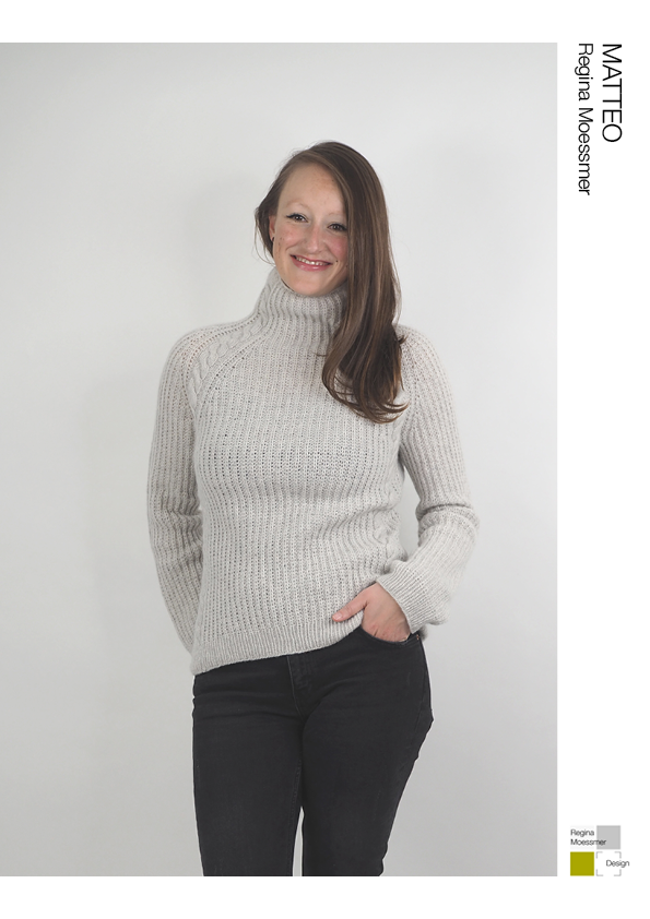 MATTEO wird nahtlos von oben nach unten in halbem Patentmuster und mit Raglan-Maschen in Zopfmuster gearbeitet. Der Ausschnitt wird mit German Short Rows geformt, danach werden Körperteil und Ärmel entlang der Raglan-Maschen zugenommen.