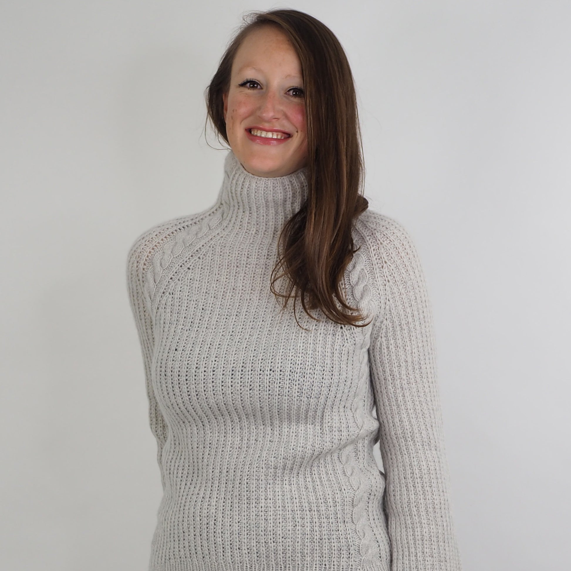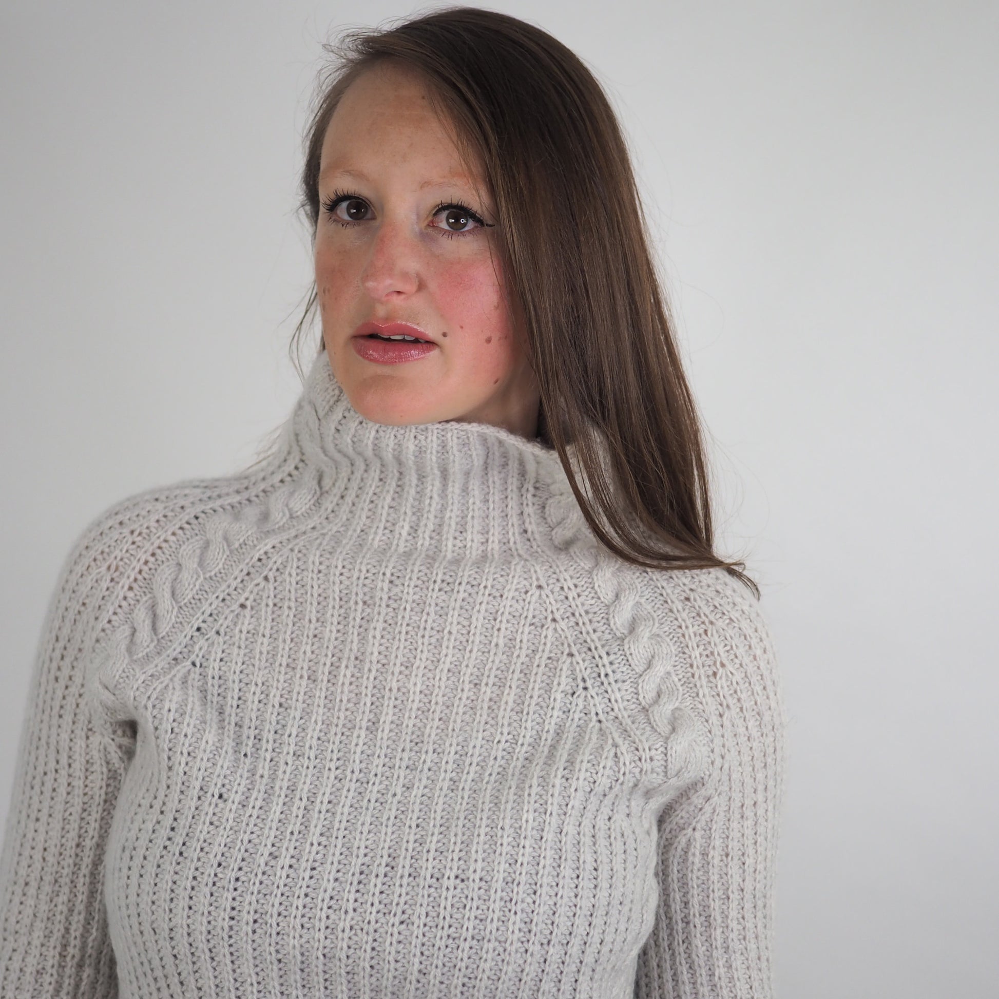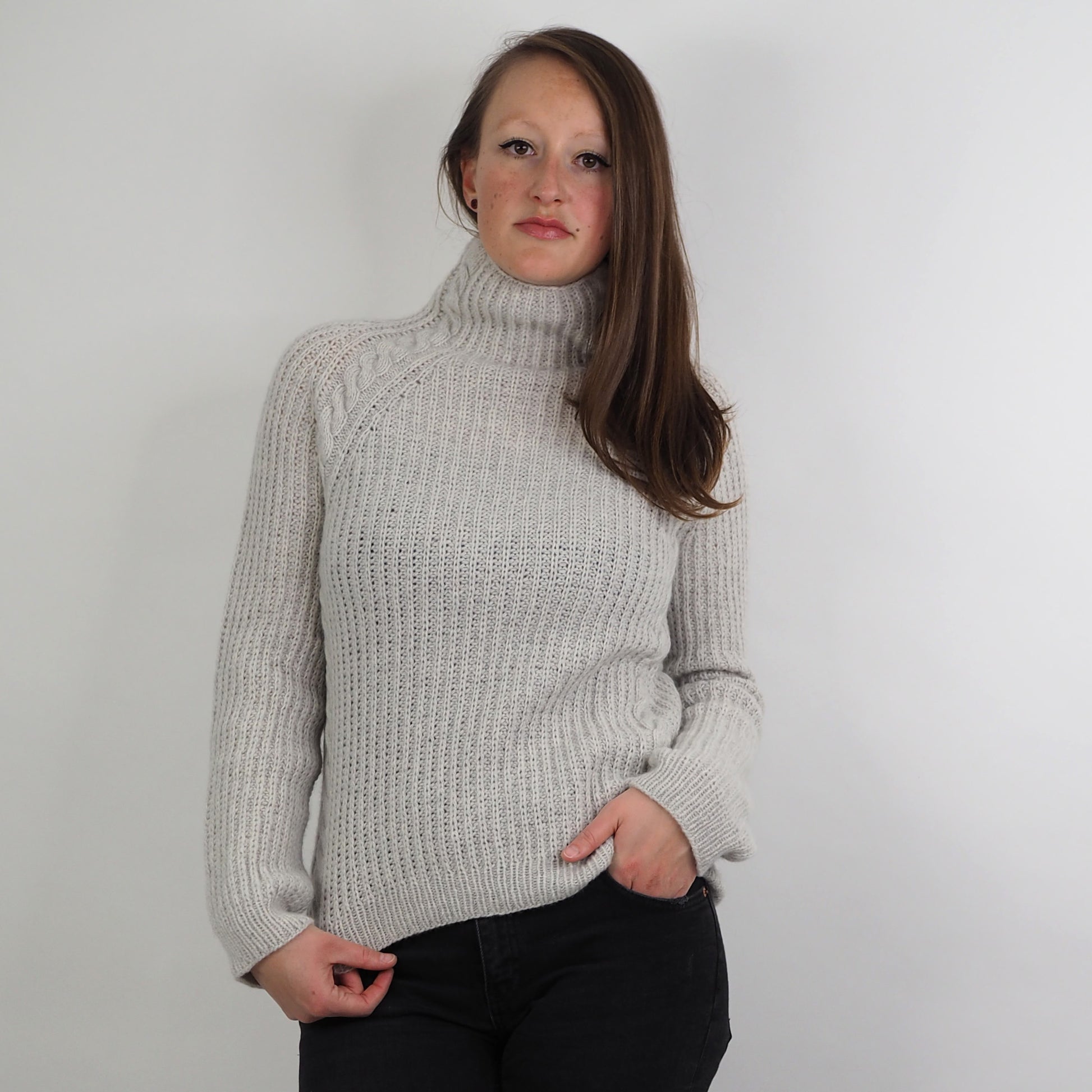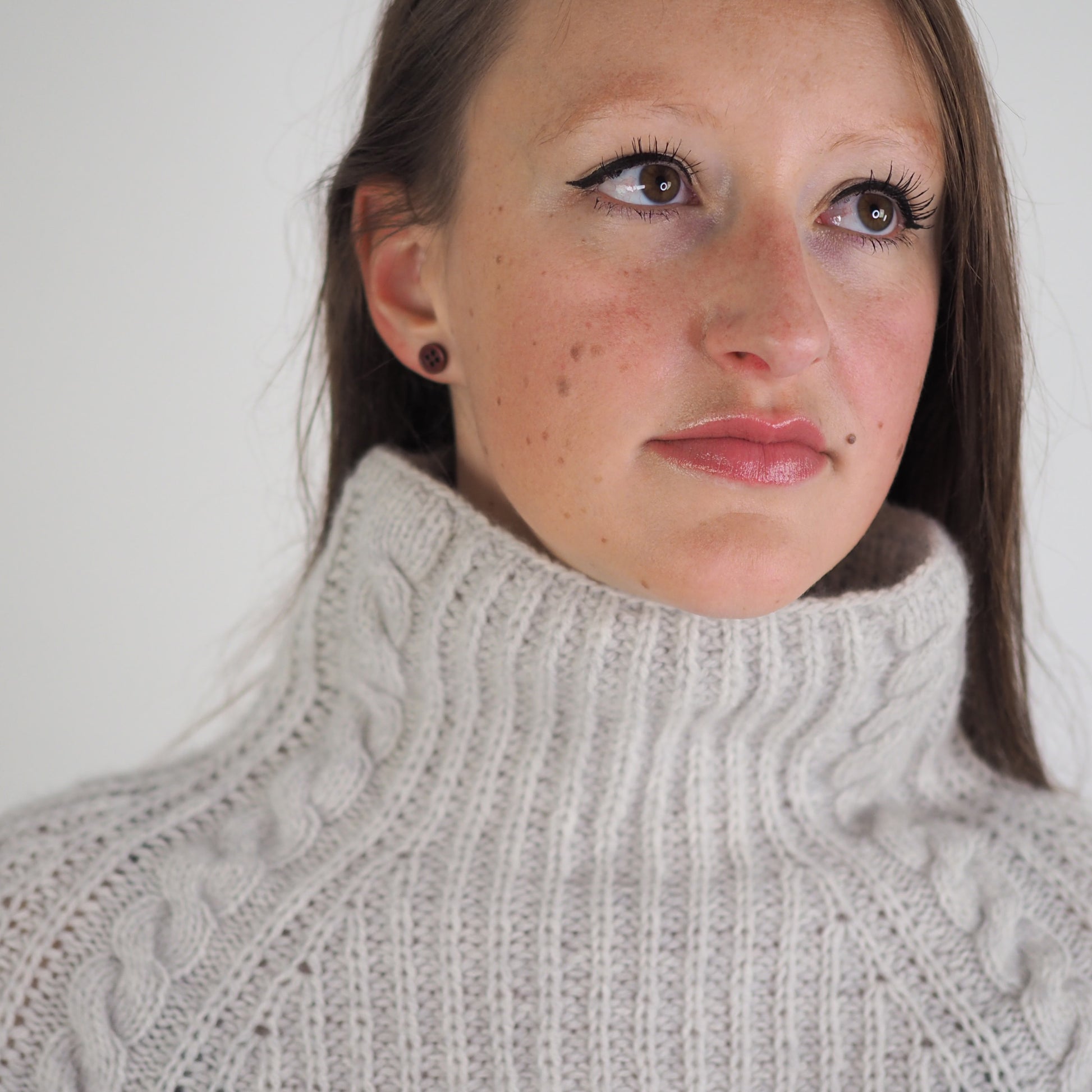 MATTEO wird nahtlos von oben nach unten in halbem Patentmuster und mit Raglan-Maschen in Zopfmuster gearbeitet. Der Ausschnitt wird mit German Short Rows geformt, danach werden Körperteil und Ärmel entlang der Raglan-Maschen zugenommen.