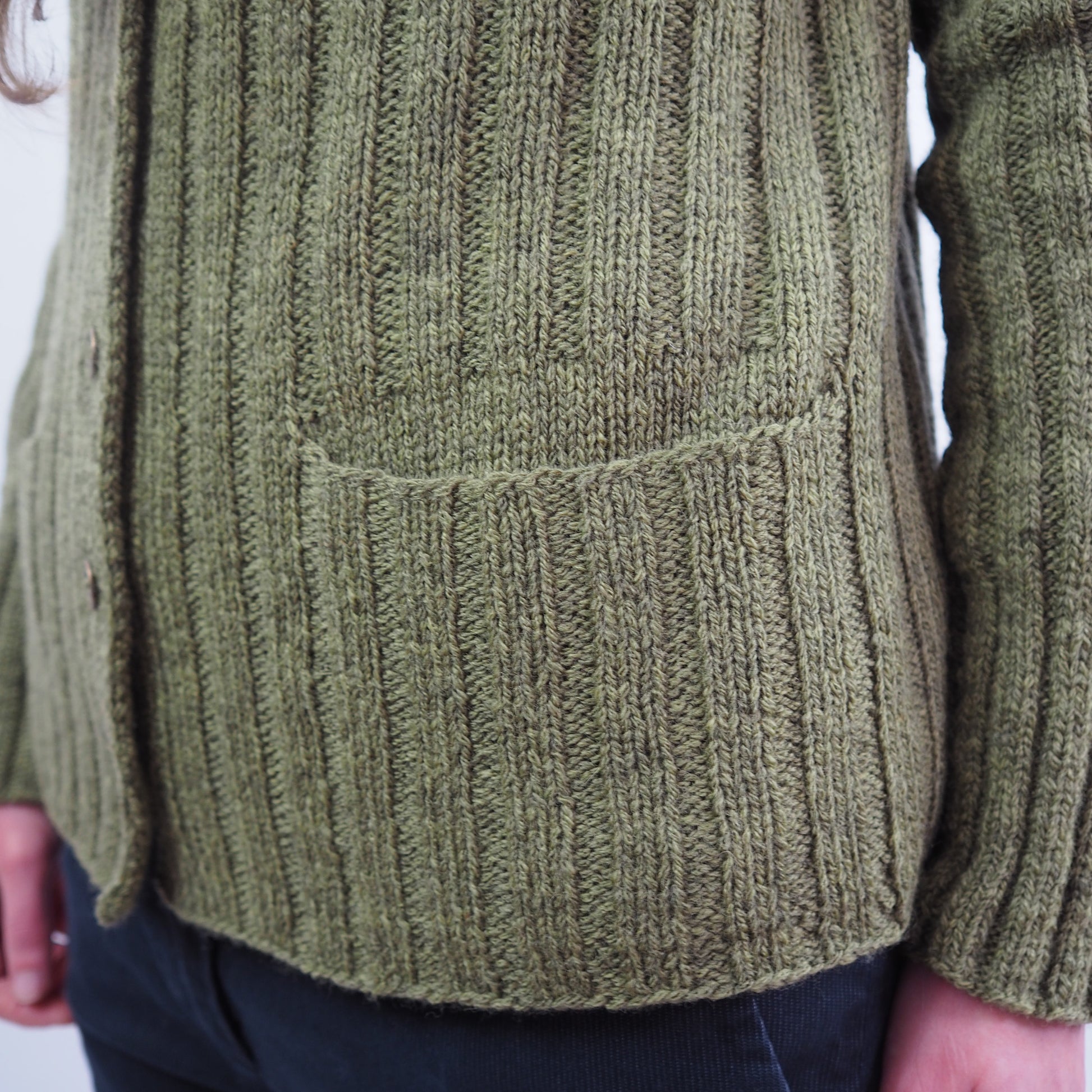 MORLAIX Cardi wird in Reihen nahtlos von oben nach unten gearbeitet. Das Halsbündchen und die vorderen Blenden werden im Rippenmuster [1re, 1li] gestrickt. Der Ausschnitt wird durch verkürzte Reihen geformt, die Schultern durch Zunahmen nach der "contiguous" Methode von Susie Myers.