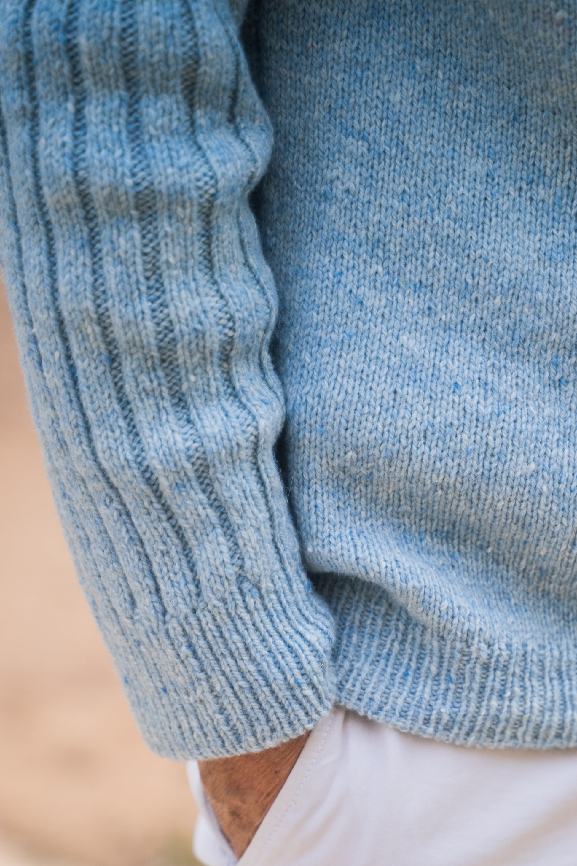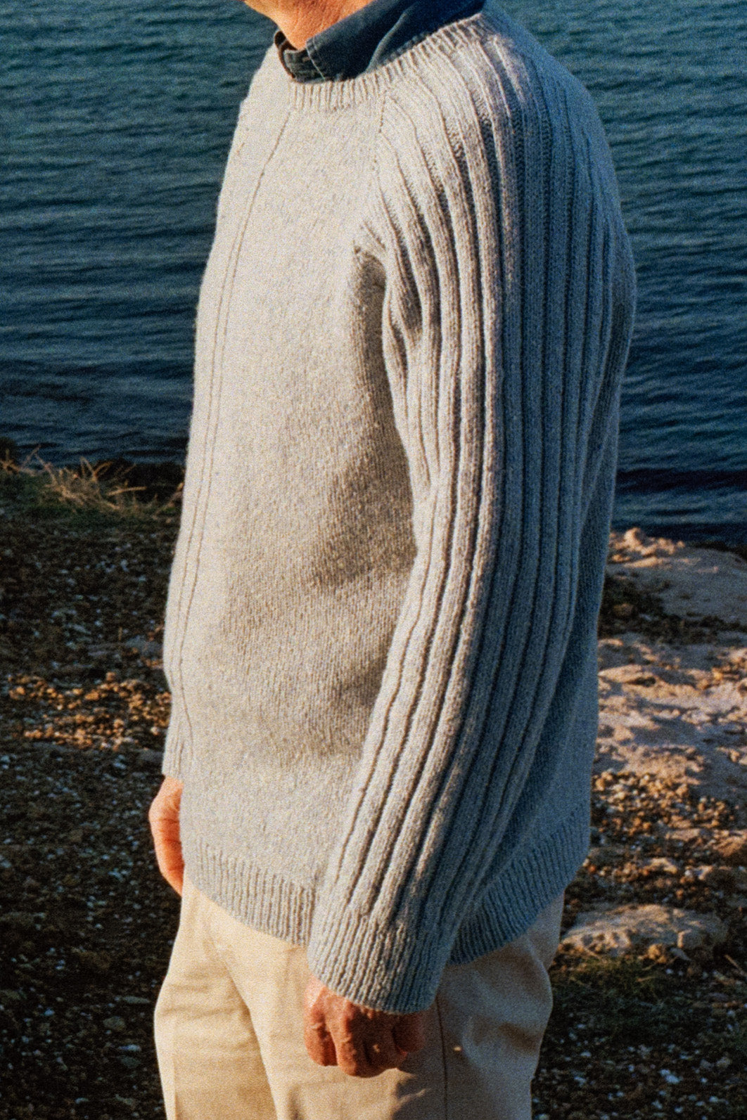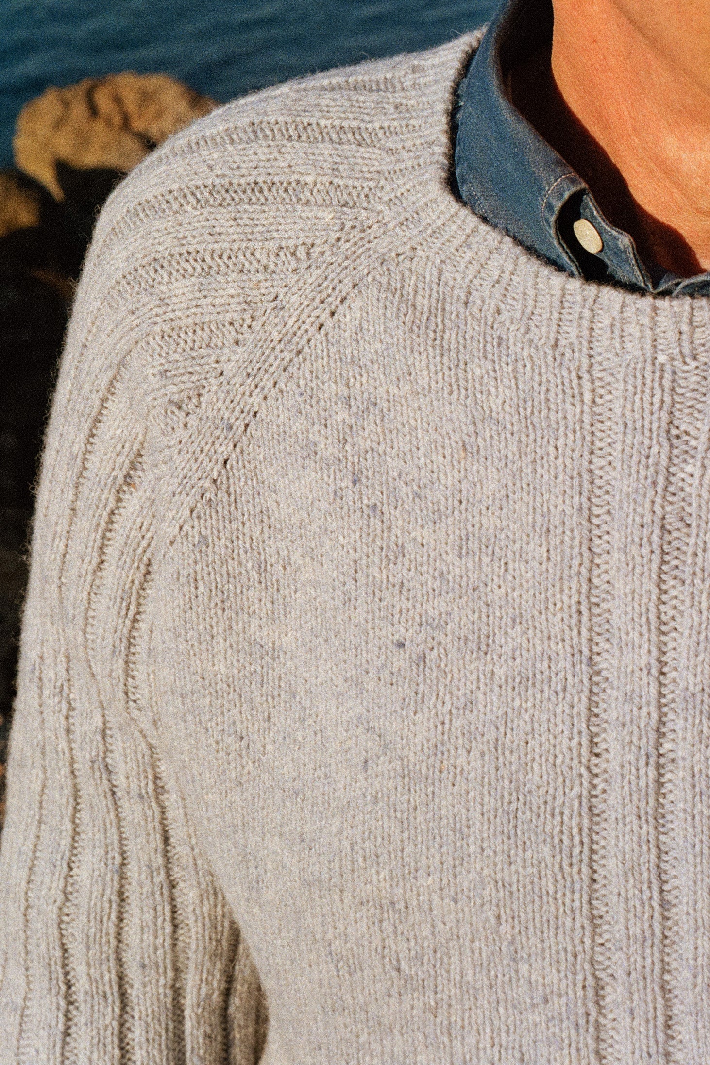NILS wird nahtlos von oben nach unten gestrickt, mit verkürzten Reihen zur Formung des Halsausschnitts und Raglanzunahmen. Die Ärmel werden im Rippenmuster 3re, 2 li gestrickt und auf der Vorder- und Rückseite befindet sich zusätzlich ein kleines Rippendetail. Der Ausschnitt wird mit der German Short Rows-Technik geformt.