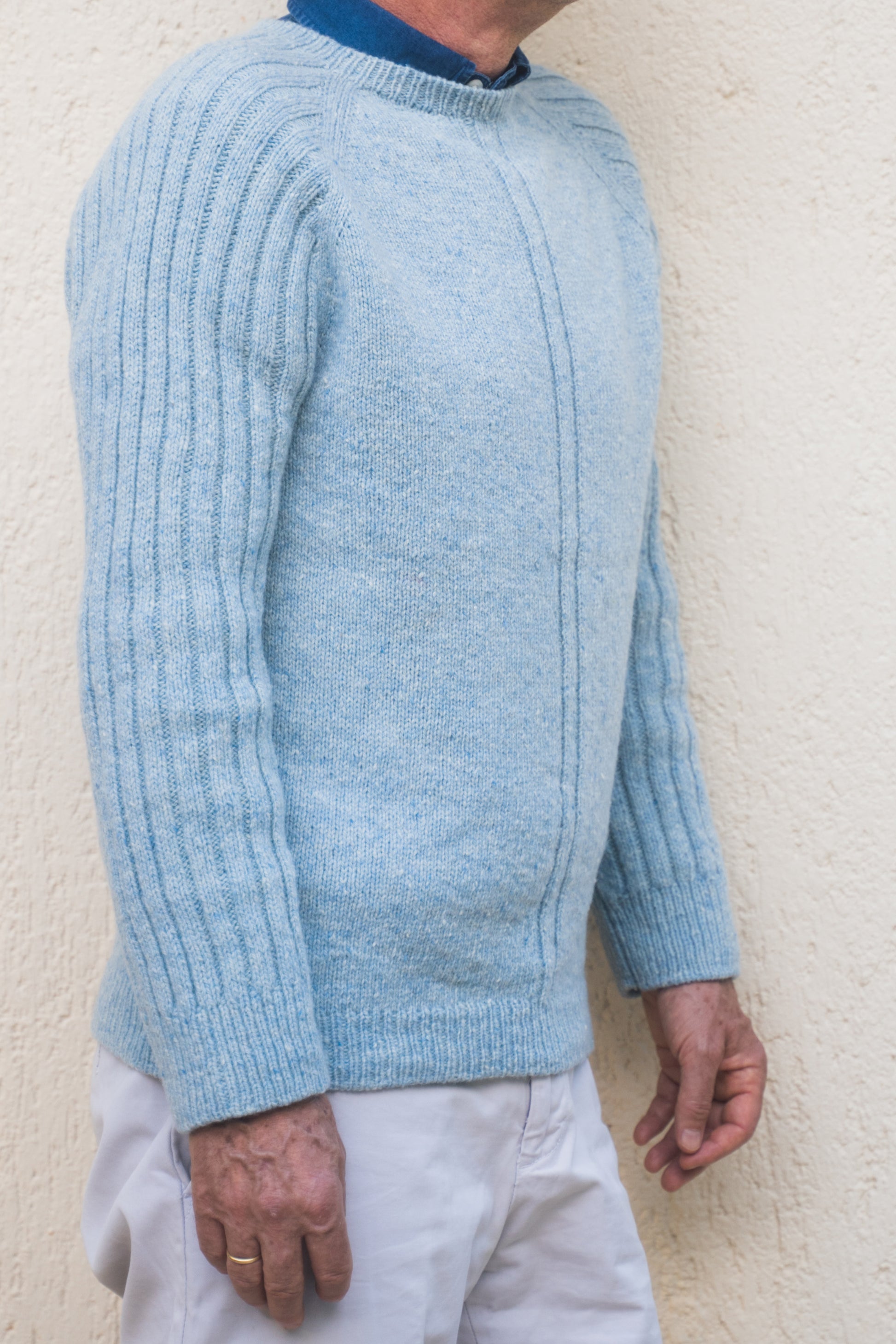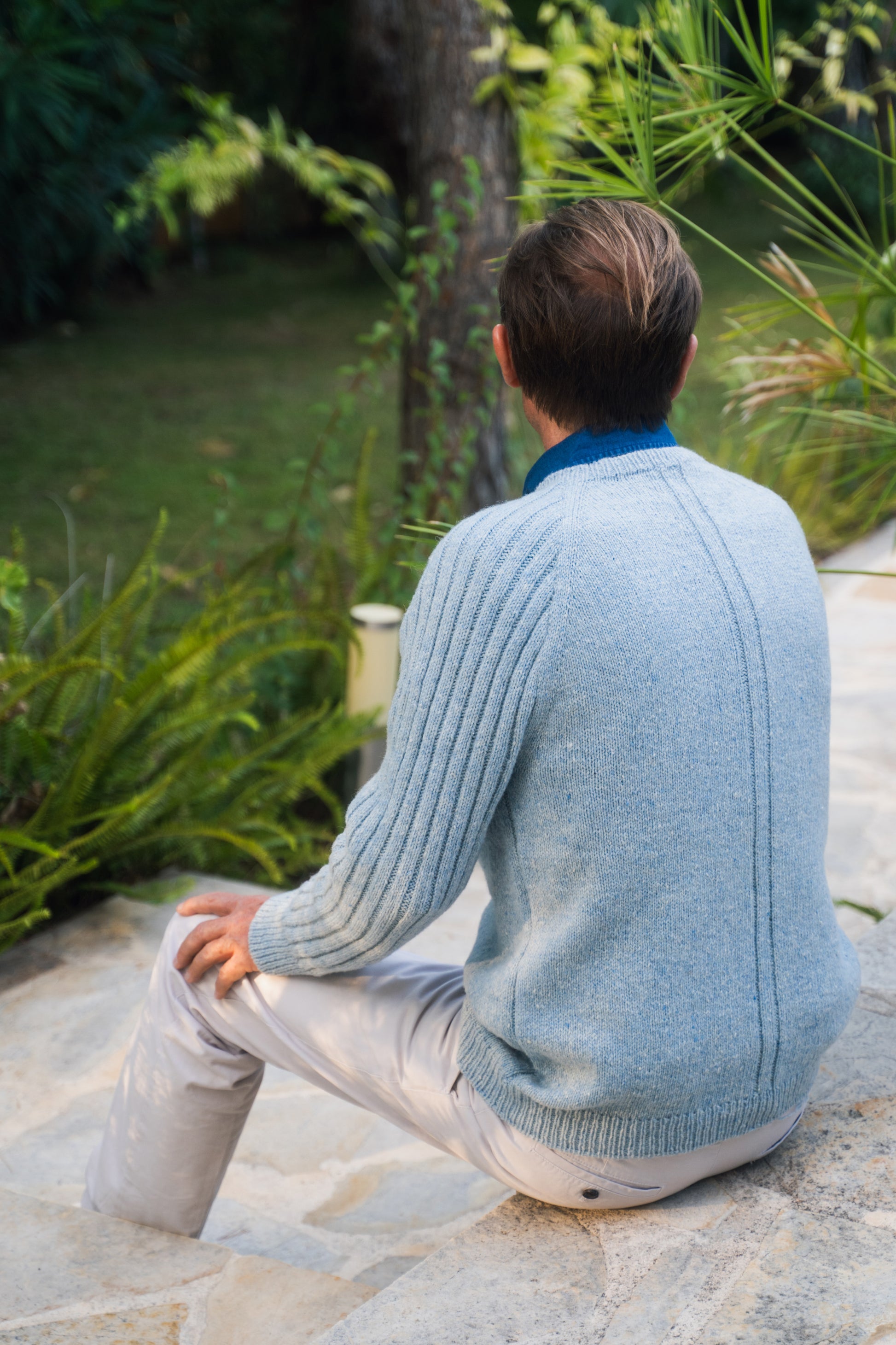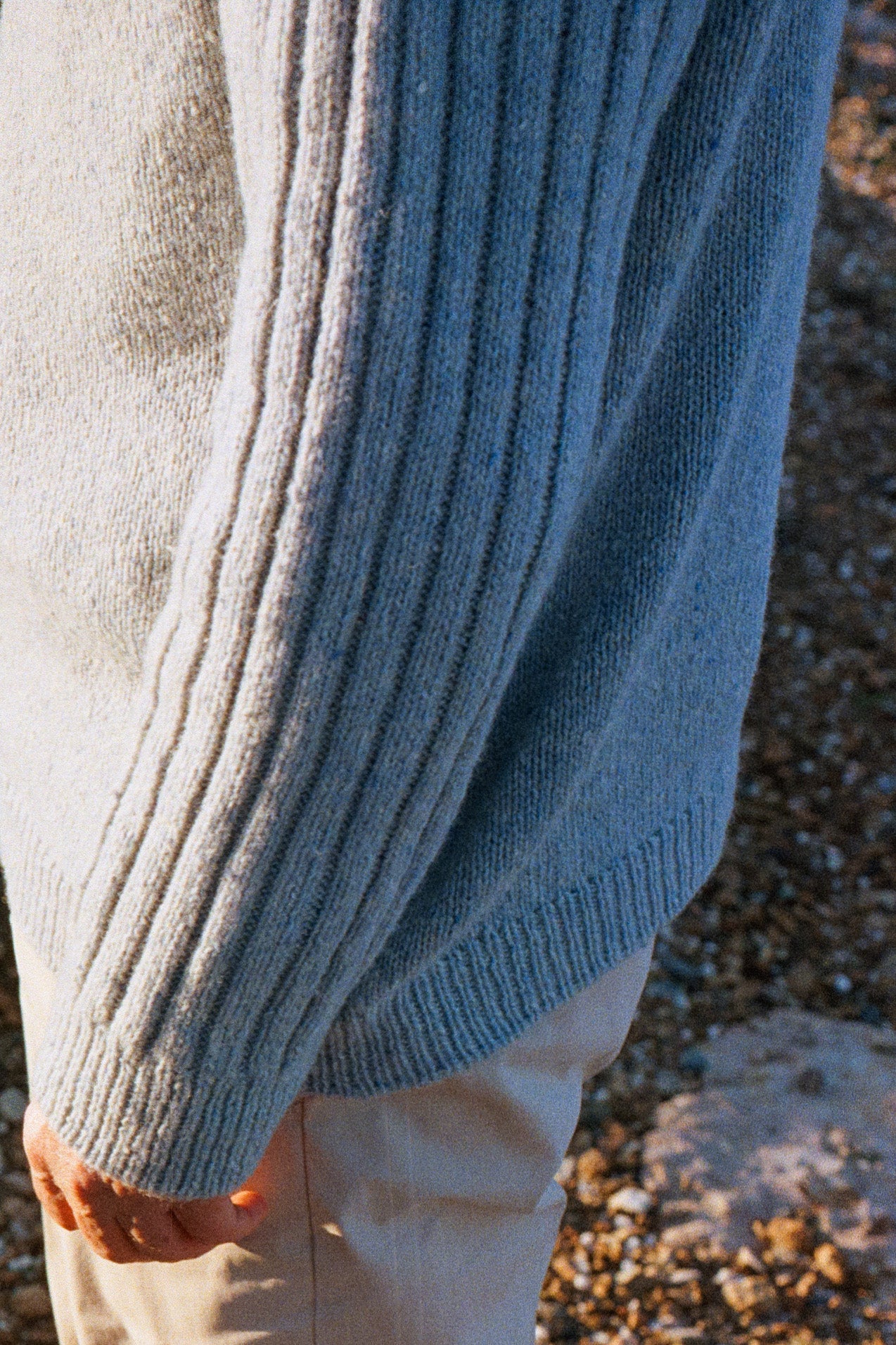 NILS wird nahtlos von oben nach unten gestrickt, mit verkürzten Reihen zur Formung des Halsausschnitts und Raglanzunahmen. Die Ärmel werden im Rippenmuster 3re, 2 li gestrickt und auf der Vorder- und Rückseite befindet sich zusätzlich ein kleines Rippendetail. Der Ausschnitt wird mit der German Short Rows-Technik geformt.