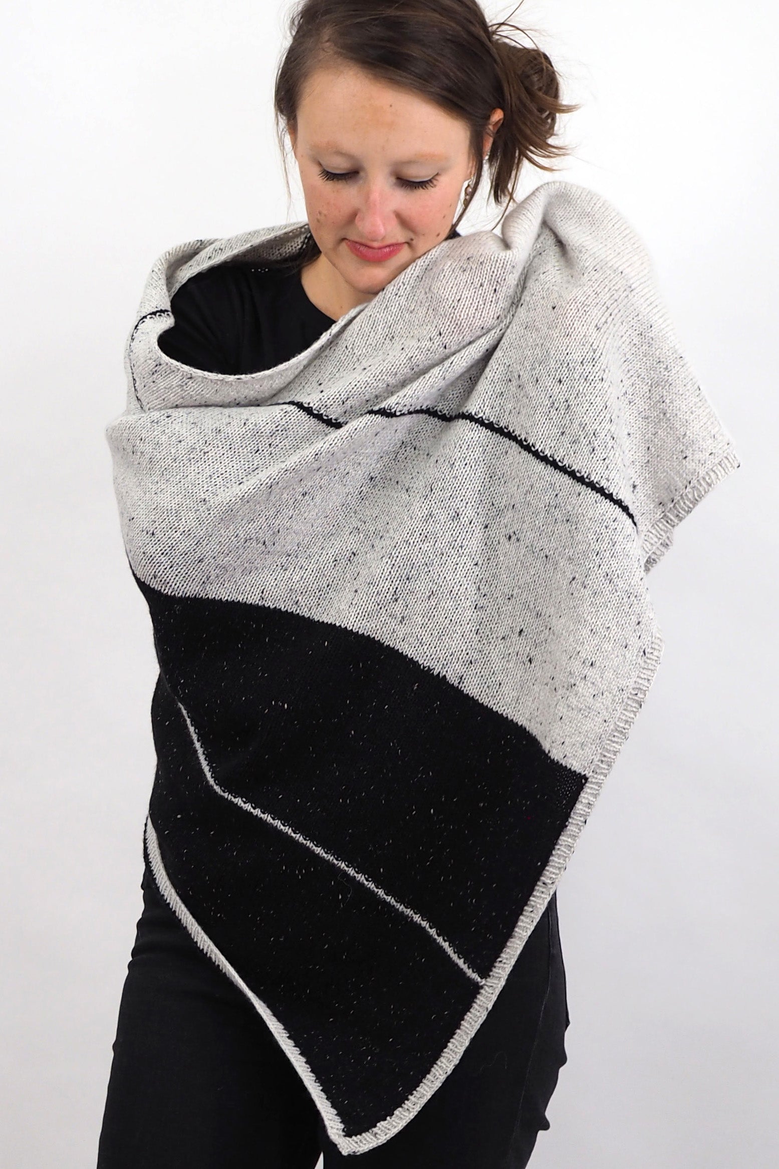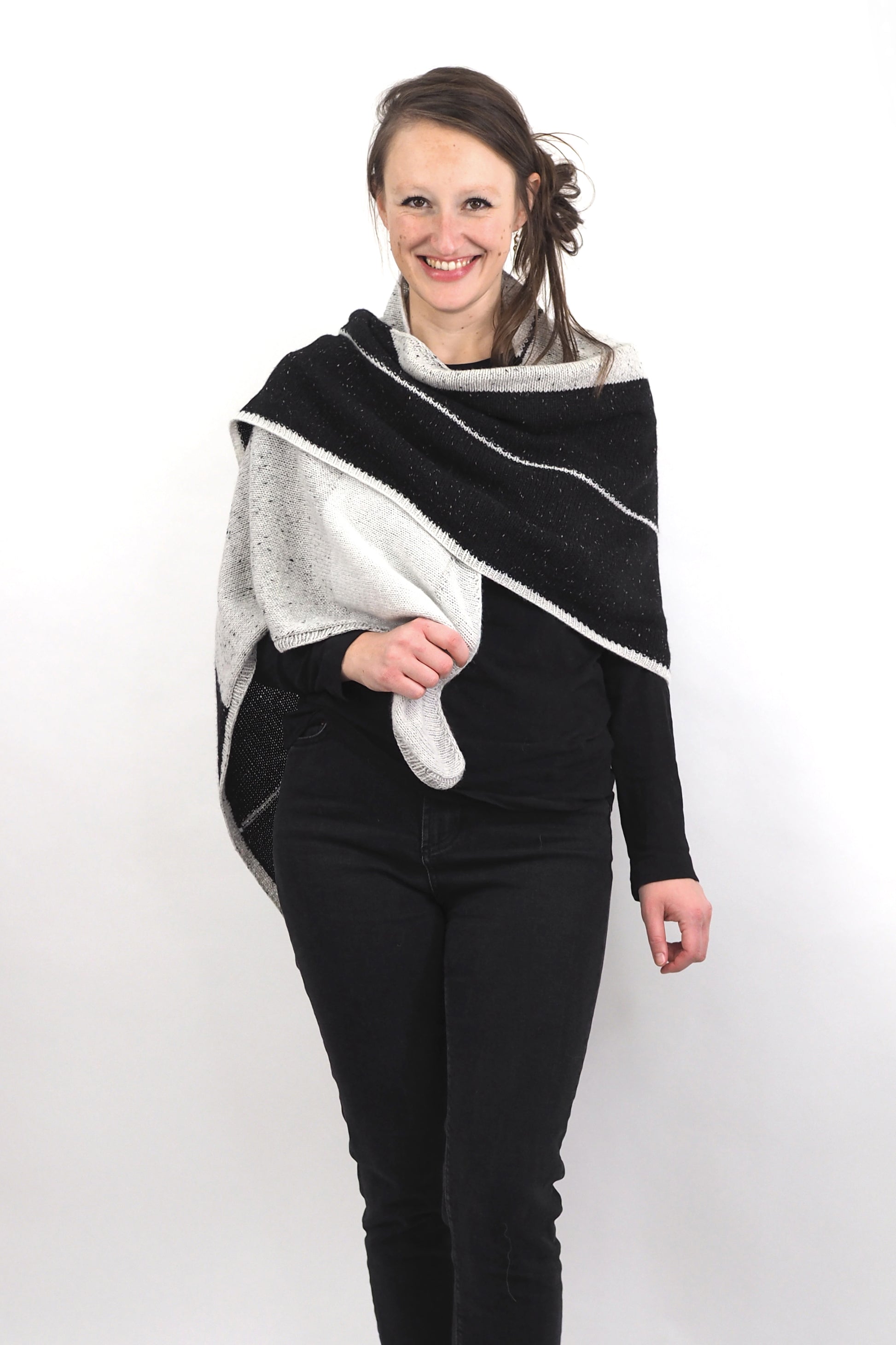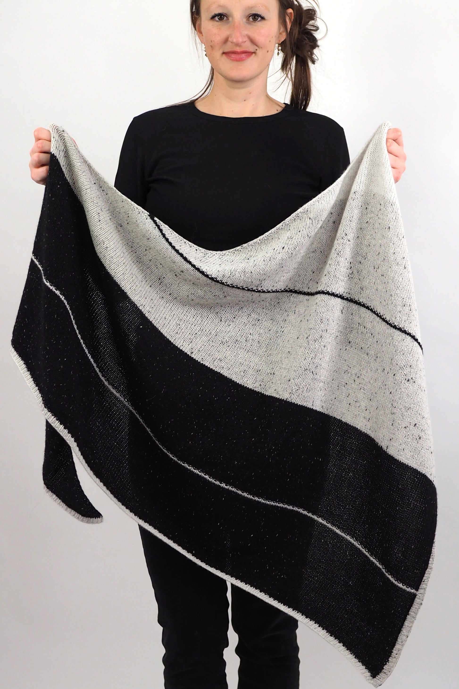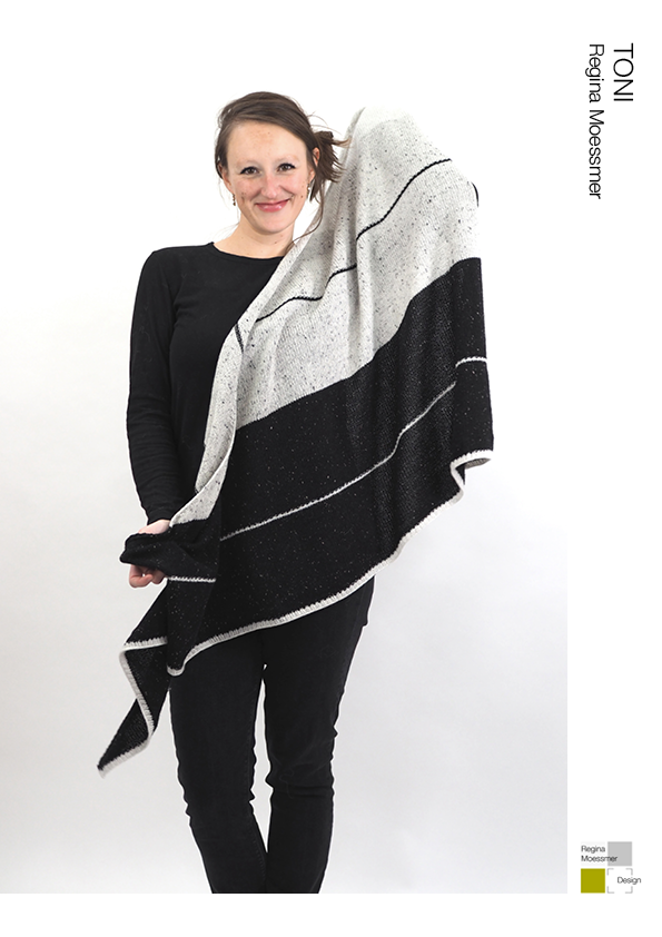 TONI beginnt mit einem Anschlag von 3 Maschen. Für die dreieckige Form werden in jeder zweiten Reihe 2 Maschen zugenommen. Der Farbwechsel erfolgt immer am Ende einer ungeraden Reihe, wodurch eine saubere oberste Kante entsteht, die nicht genäht werden muss. Zwischen den breiten Farbstreifen werden 2 Reihen im Rippenmuster [1 rechts, 1 links] gearbeitet, wodurch der Schal eine angenehme Textur erhält. Schließlich werden auch die beiden kurzen Seiten mit dem Rippenmuster abgeschlossen.