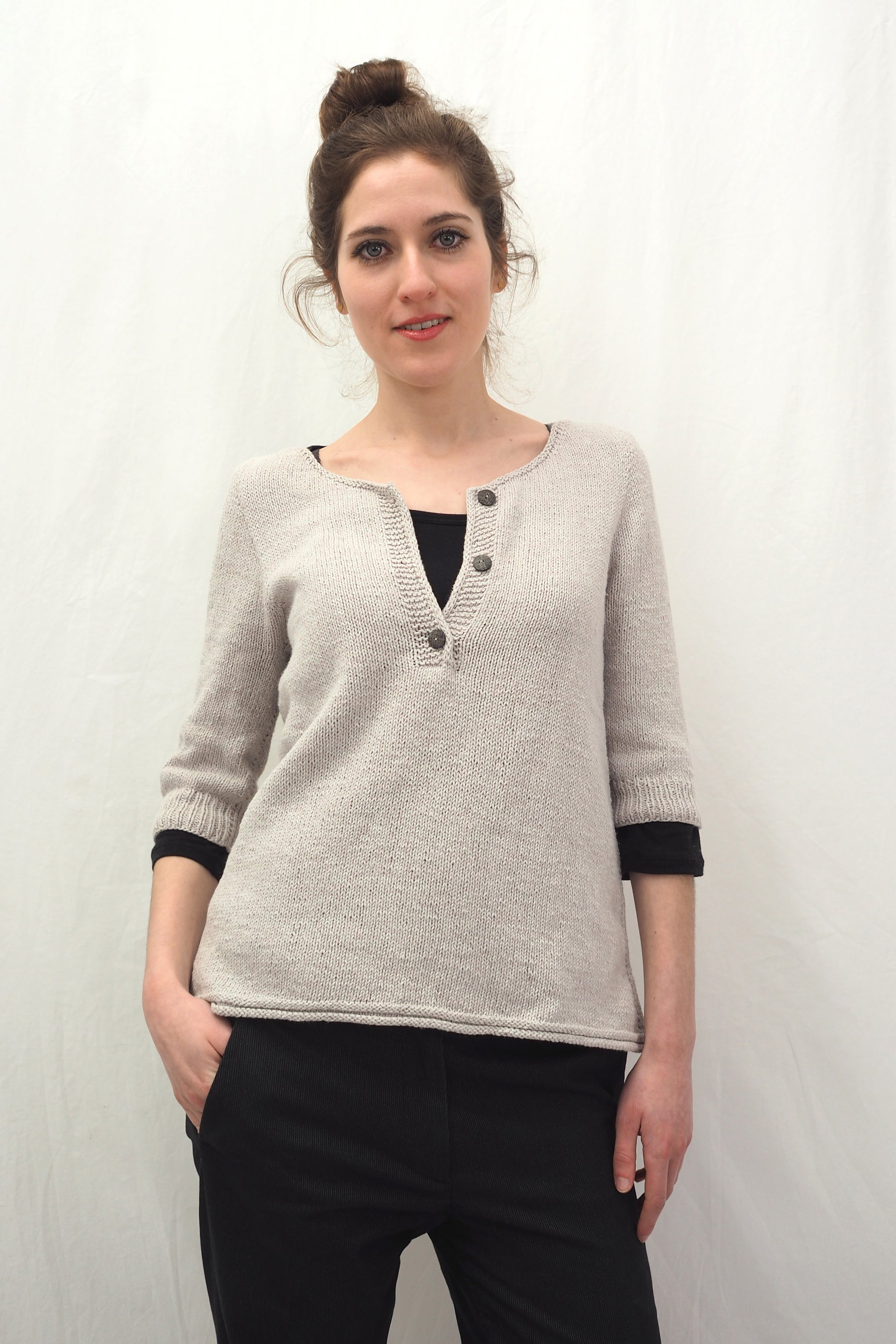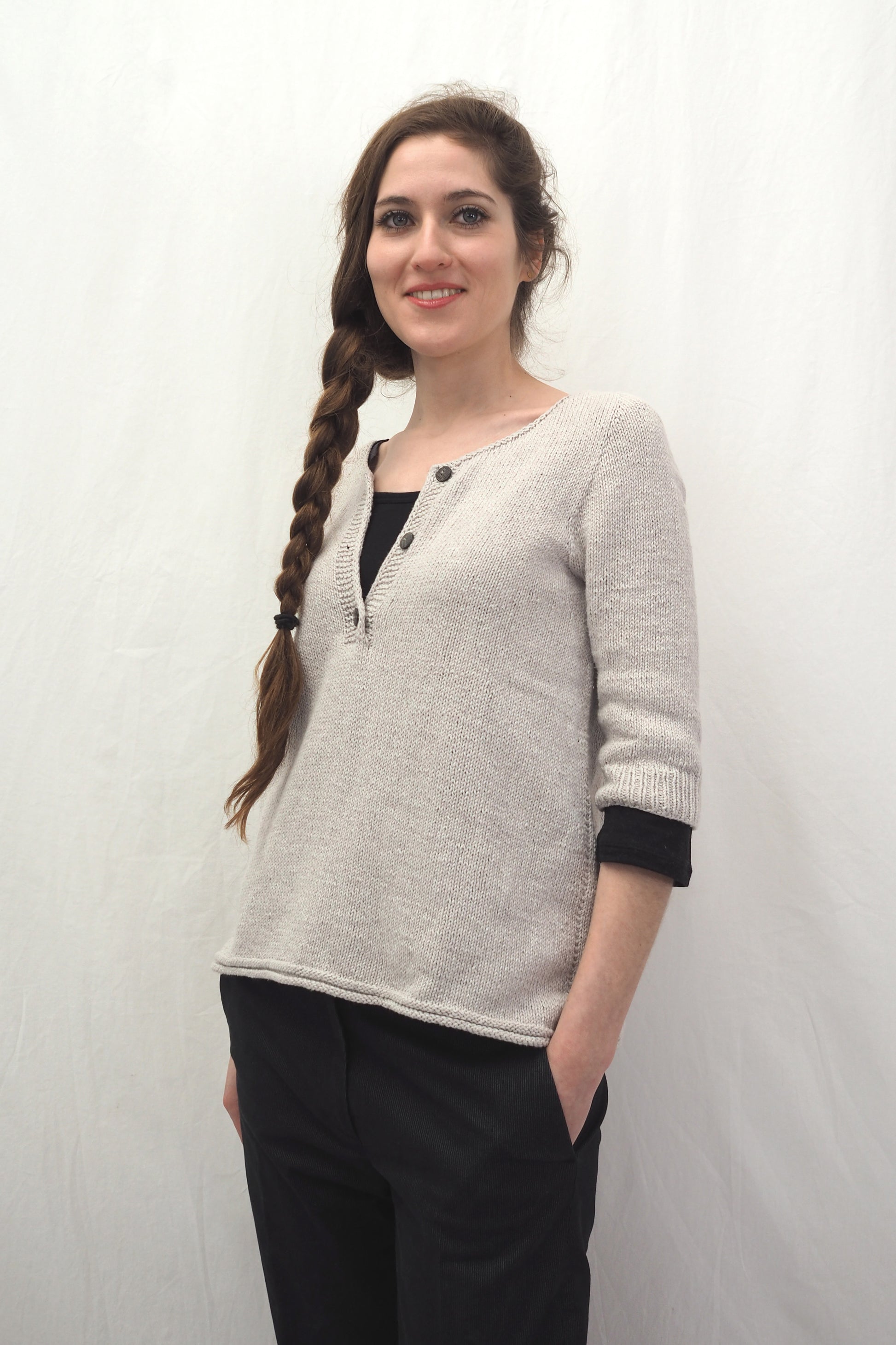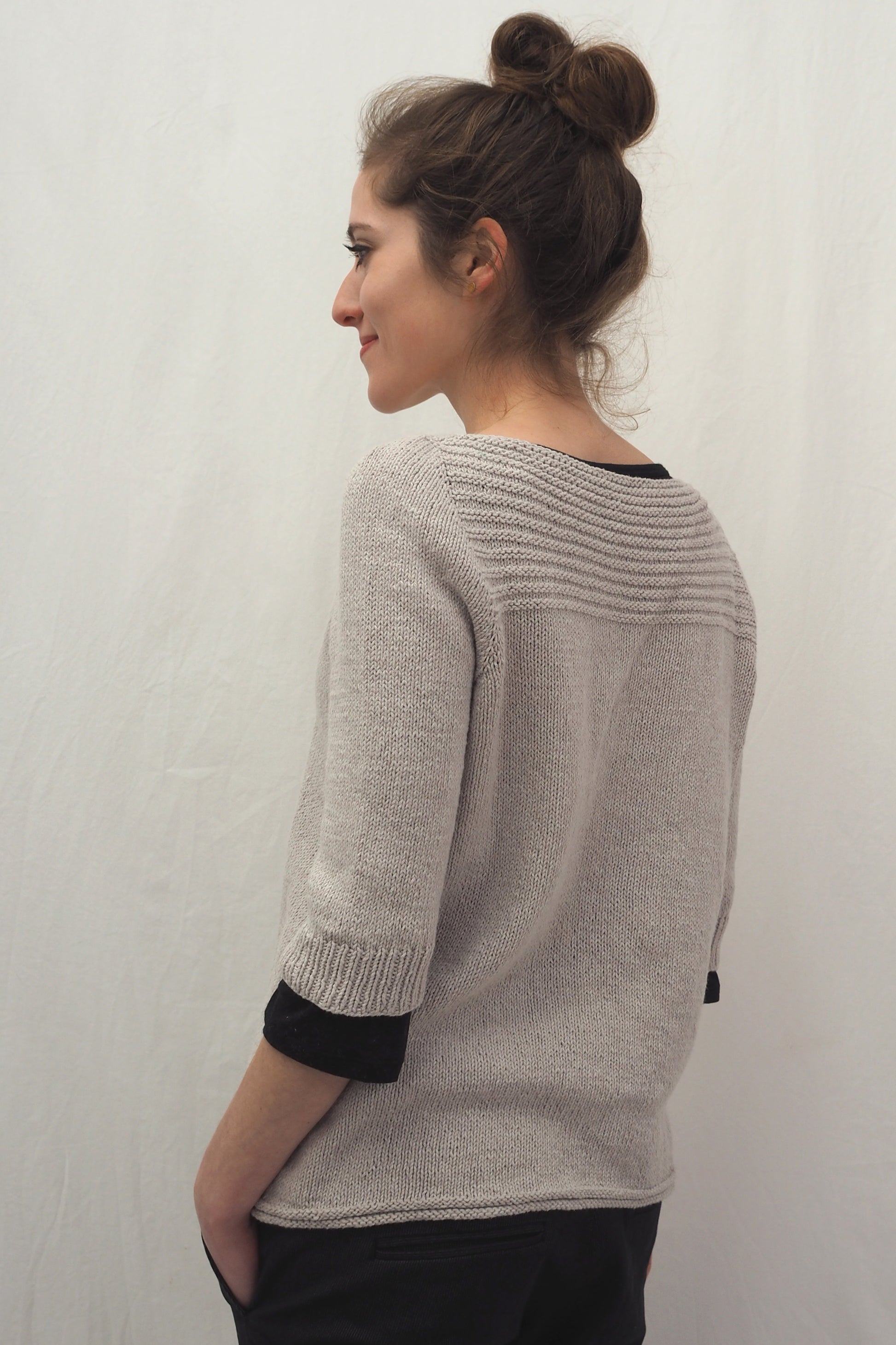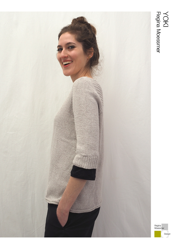 YOKI wird nahtlos von oben nach unten gearbeitet und hat einen Henley-Ausschnitt sowie ein Querrippenmuster auf der oberen Hälfte des Rückens. Zuerst wird der Halsausschnitt durch verkürzte Reihen geformt, und dann wird die Passe in der Runde gearbeitet. Die Passe wird mit der "contiguous"-Methode gearbeitet. Die Seitennähte des Körperteils und je eine falsche Naht an den Ärmeln werden im Kraus-Rechts-Muster gestrickt.