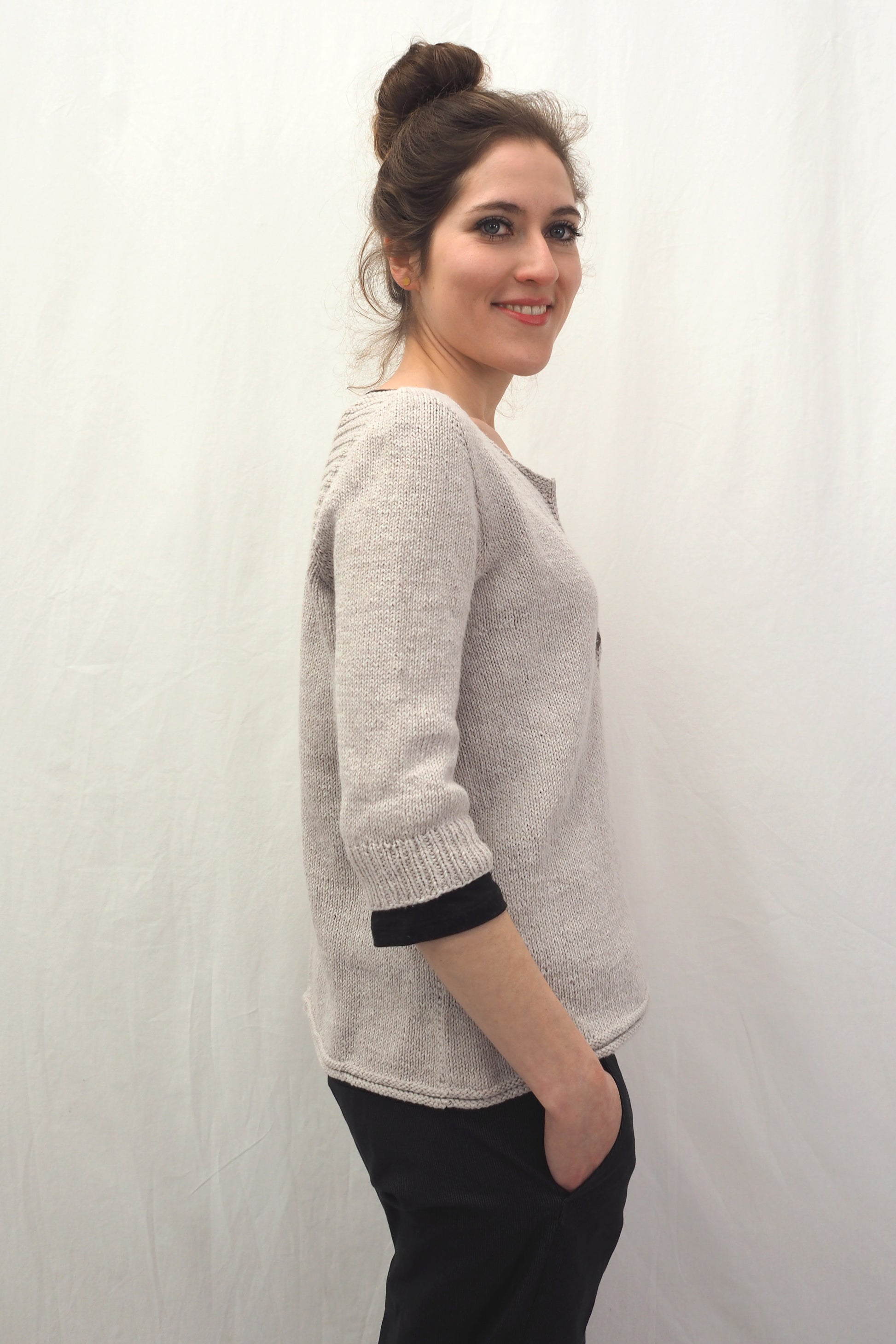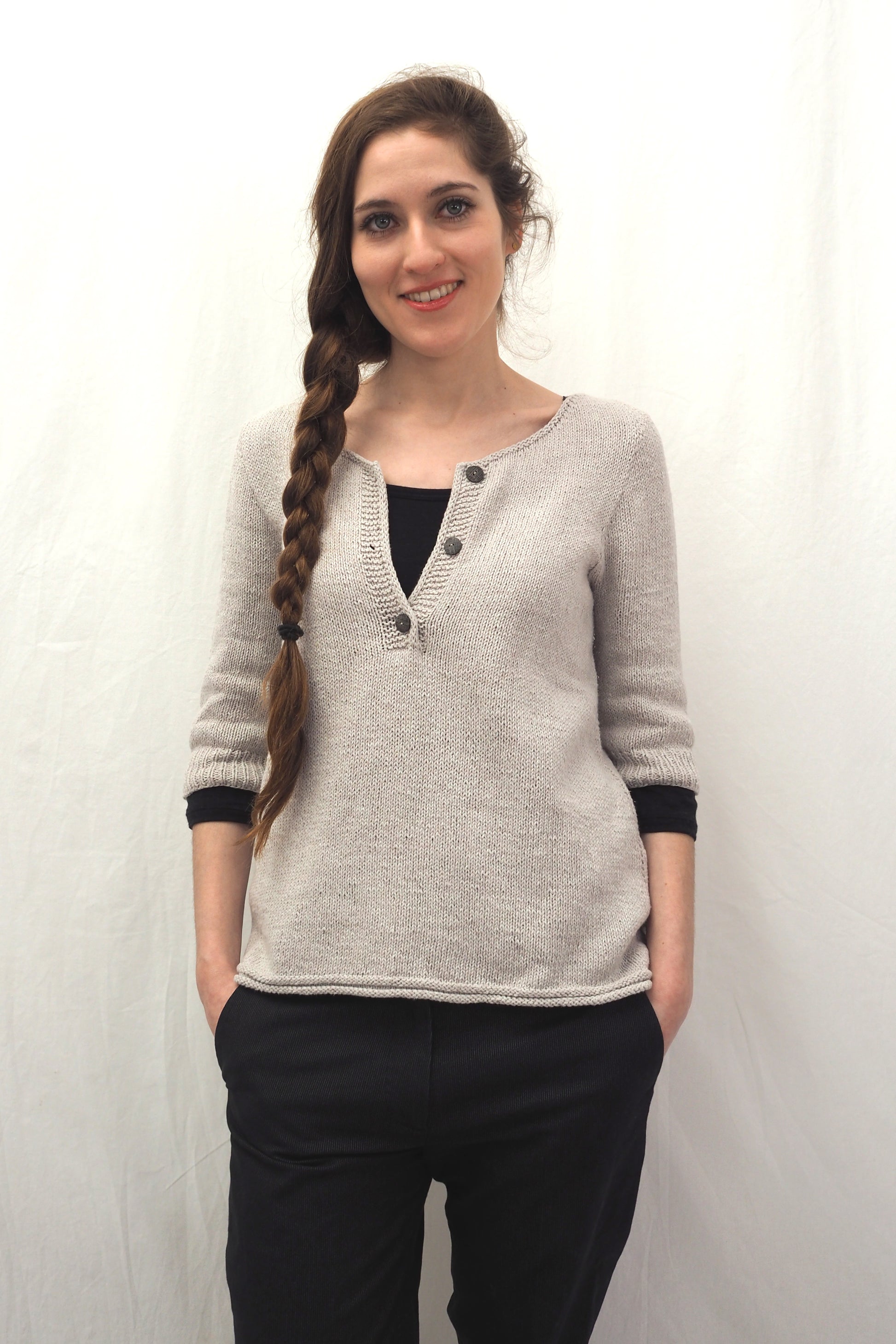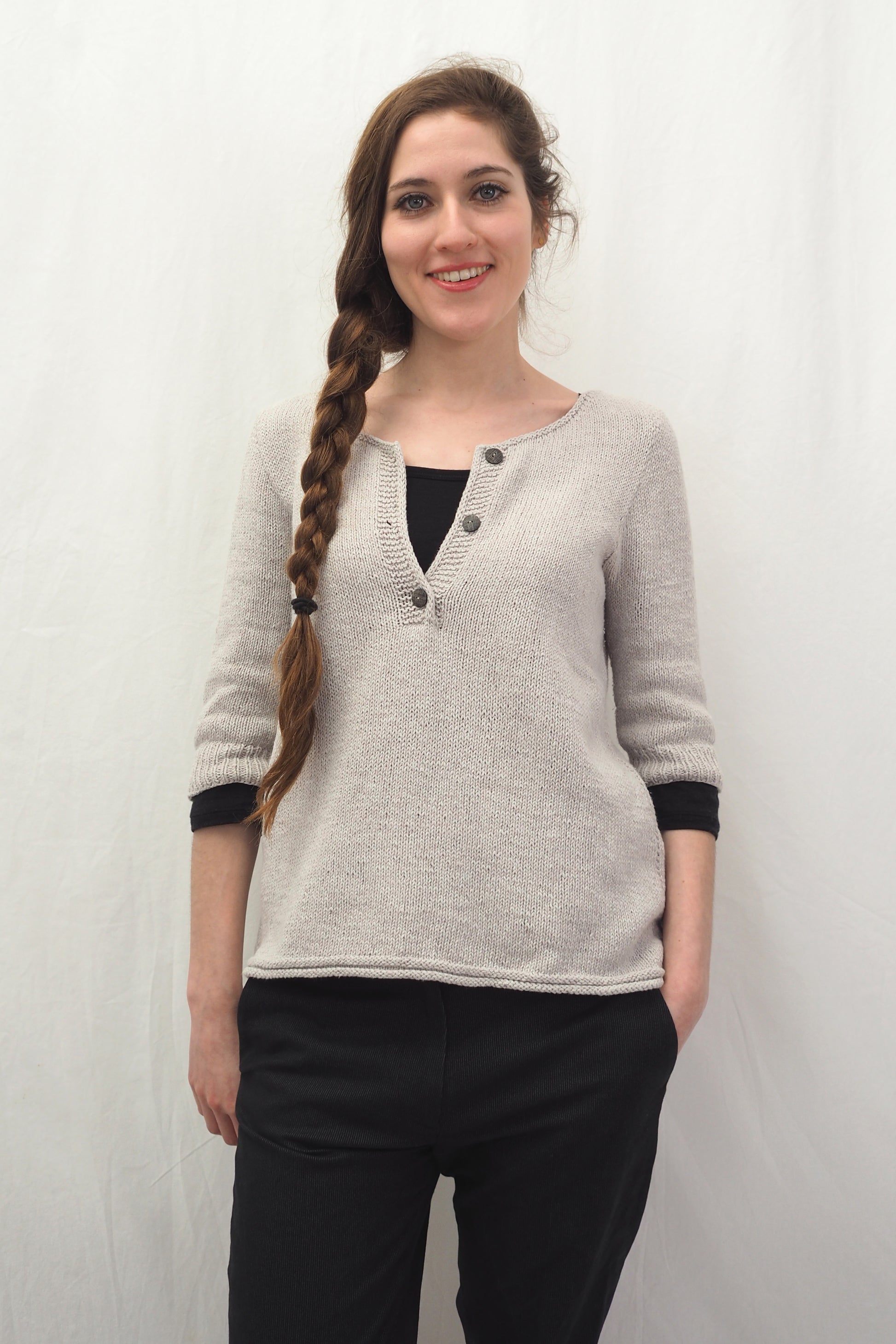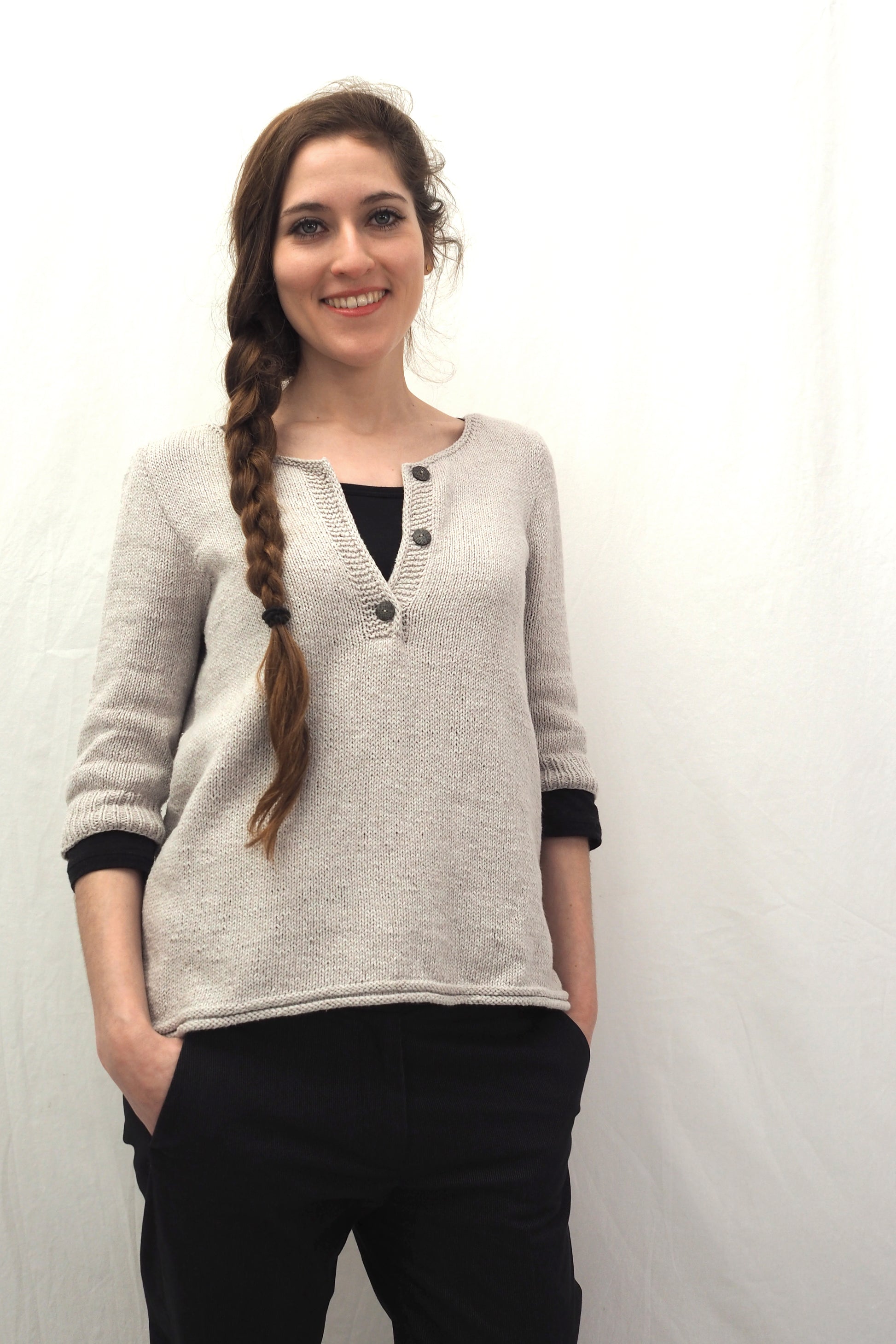 YOKI wird nahtlos von oben nach unten gearbeitet und hat einen Henley-Ausschnitt sowie ein Querrippenmuster auf der oberen Hälfte des Rückens. Zuerst wird der Halsausschnitt durch verkürzte Reihen geformt, und dann wird die Passe in der Runde gearbeitet. Die Passe wird mit der "contiguous"-Methode gearbeitet. Die Seitennähte des Körperteils und je eine falsche Naht an den Ärmeln werden im Kraus-Rechts-Muster gestrickt.