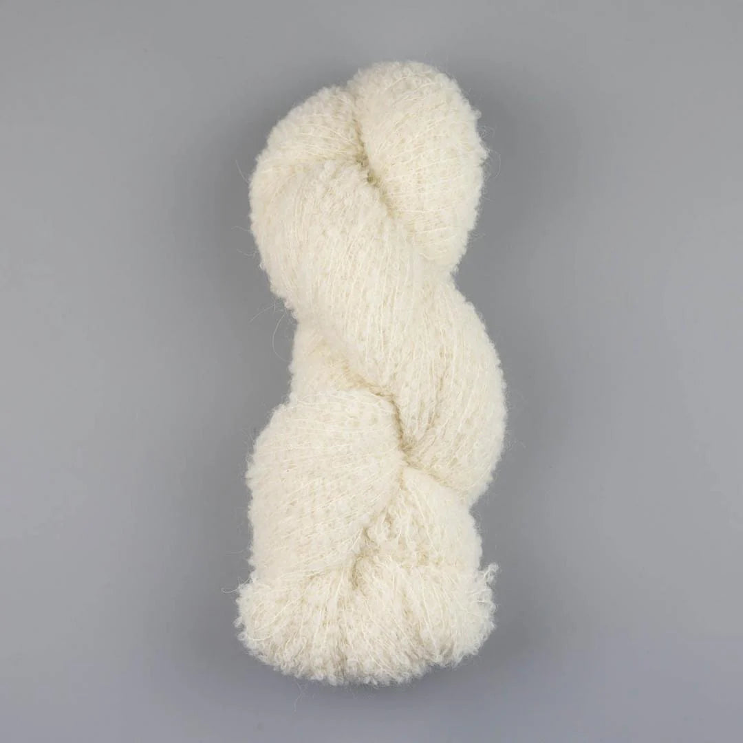ALPALOOP Bouclé ungefärbtSuper weiches, federleichtes Bouclégarn aus Alpaka superfine (24-26 Micron) mit stabilem Trägerfaden auf 100g Strängen, ungefärbt naturweiß zum Färben oder direkt zum Verstricken.
