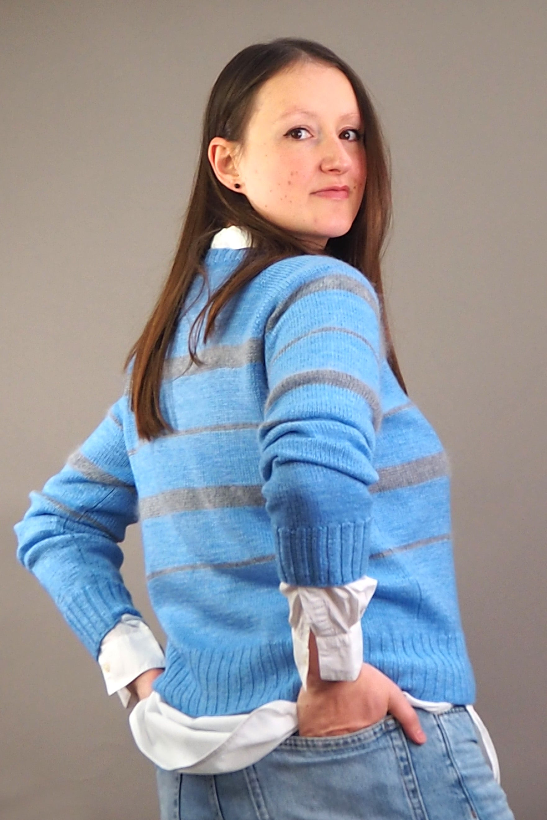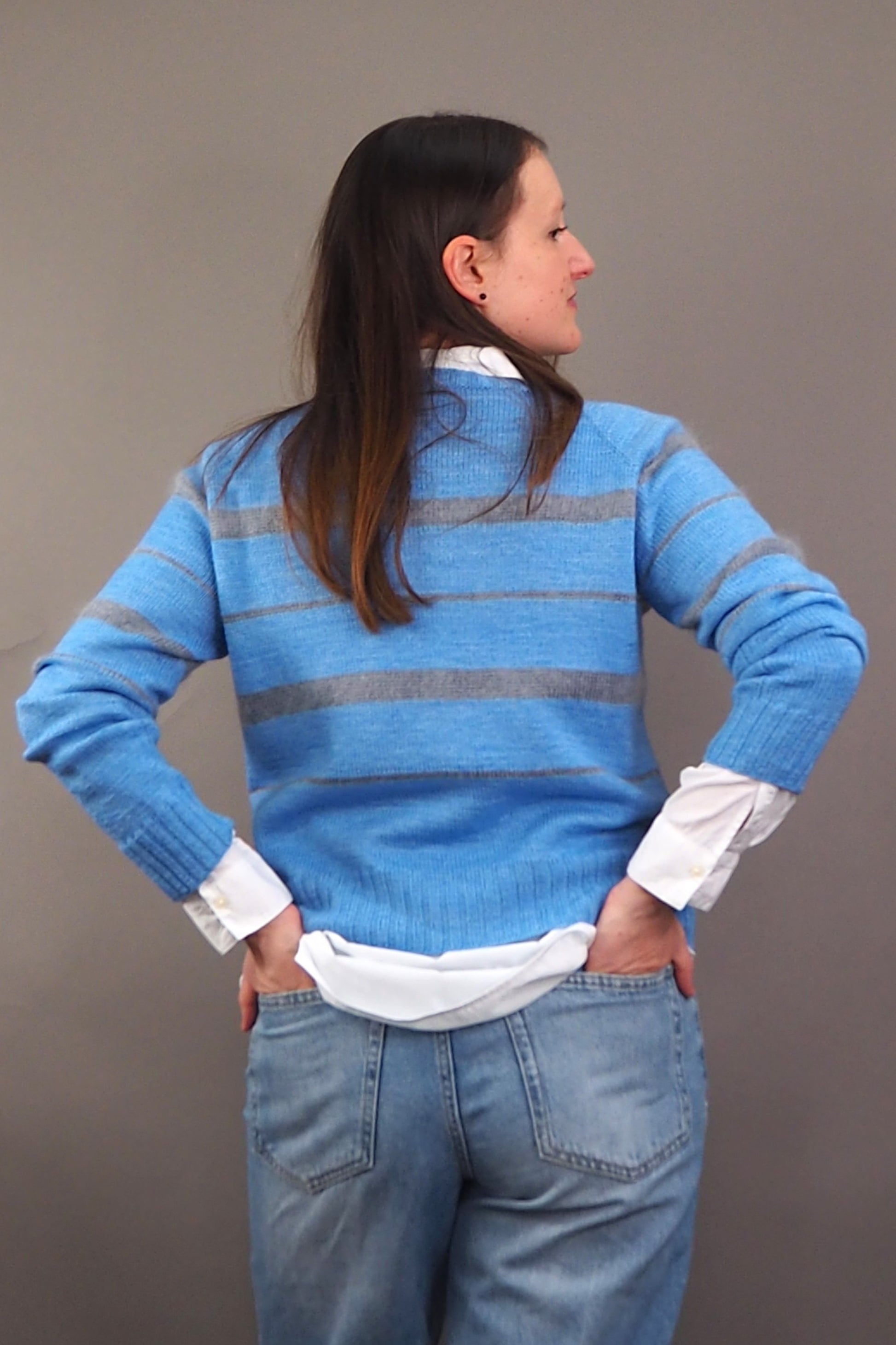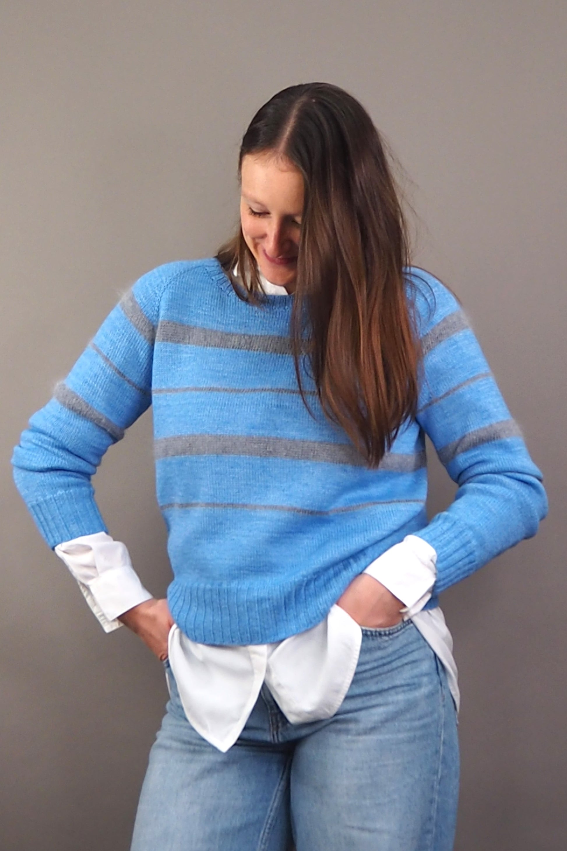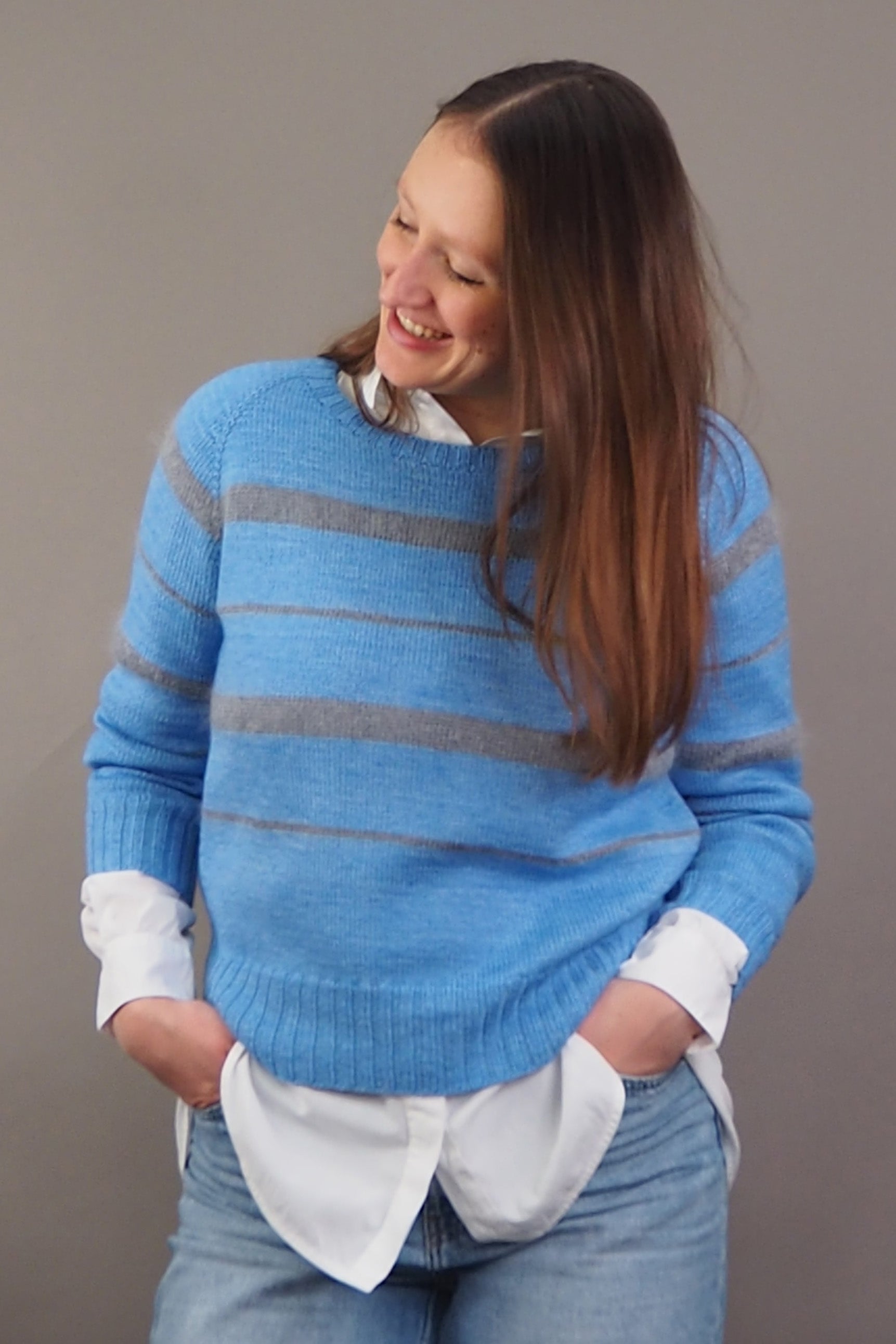 Perfectly matched: N°92 and N°50 from Herzfasern and our new striped raglan. Lykke features [k2, p2] ribbing and stripes in two different widths, which look wonderfully relaxed when knitted with the fluffy N°50.