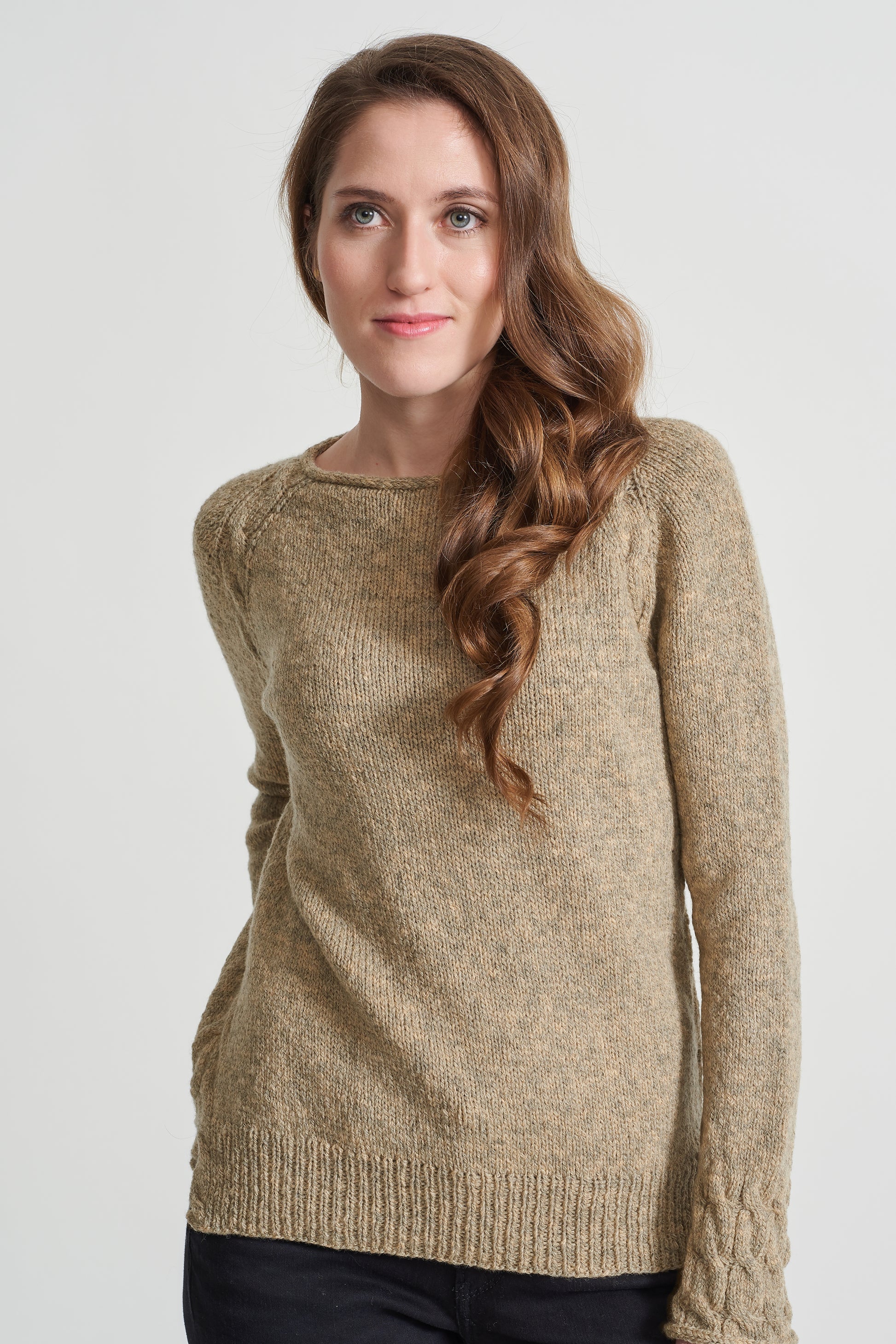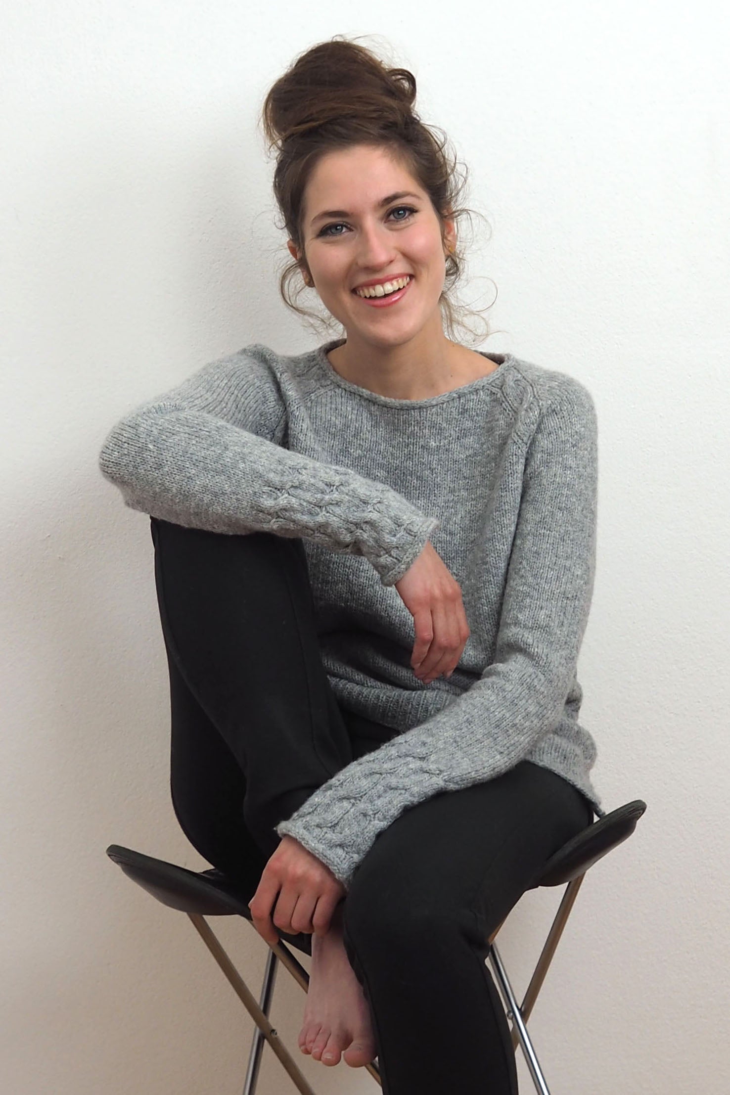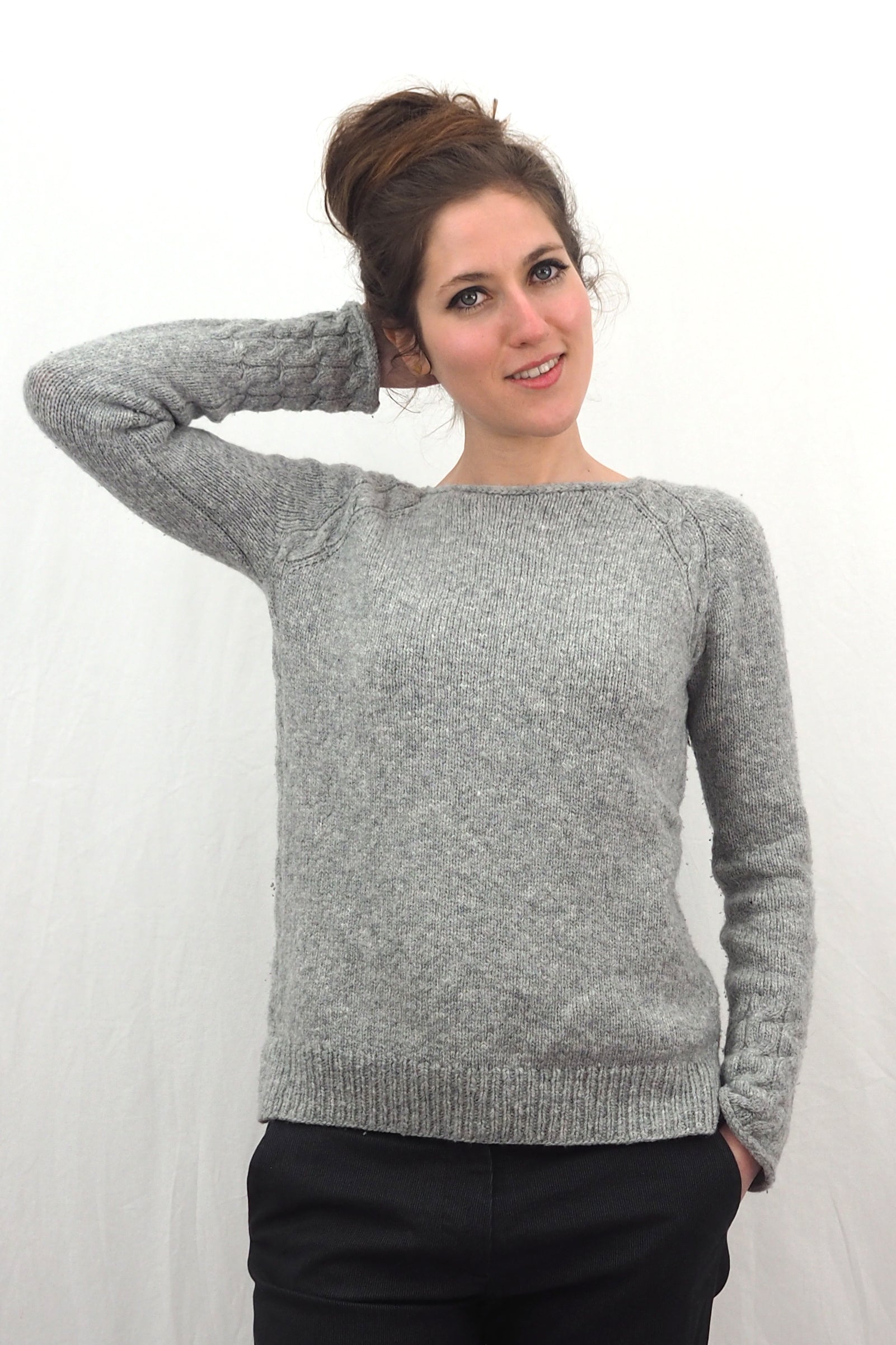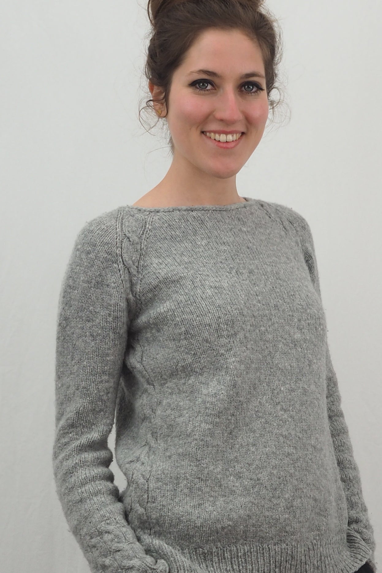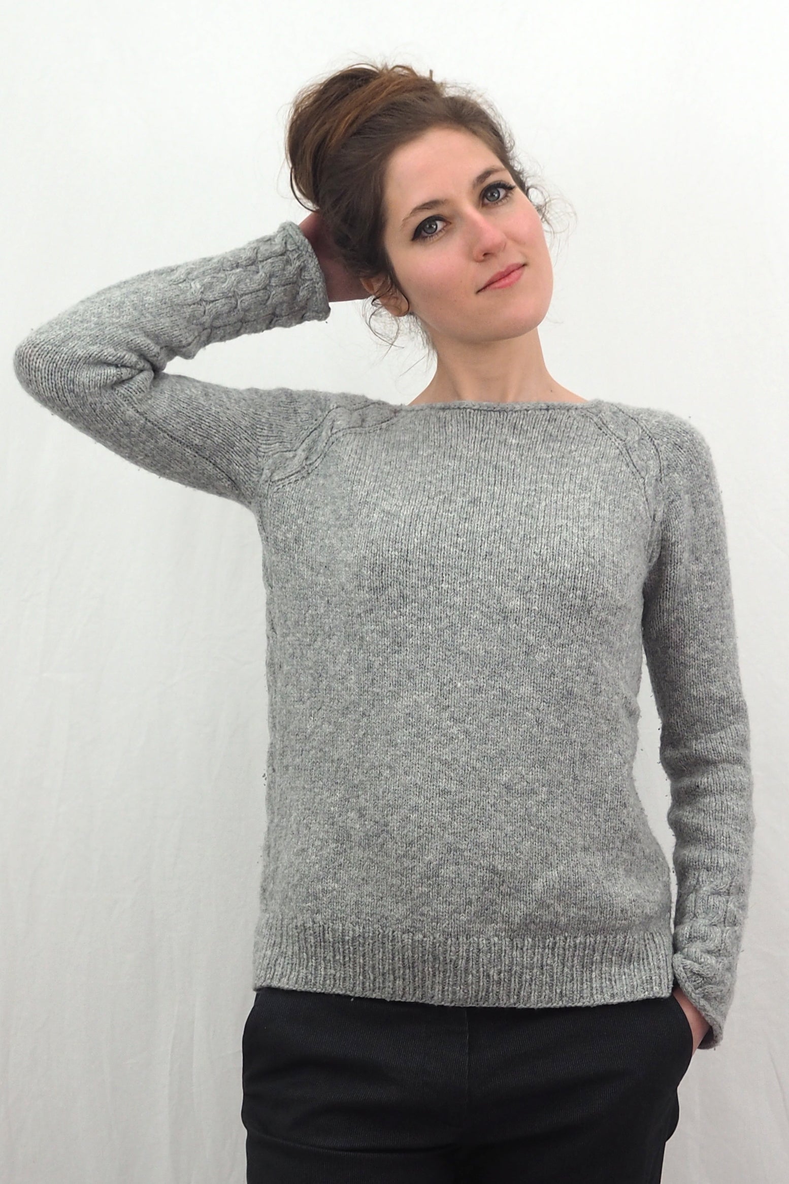 MALLI is worked seamlessly from the top down. The neckline is shaped by using the german short rows method. The cables of the raglan seams are continued at the side seams.