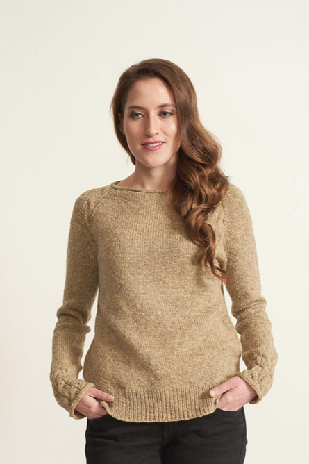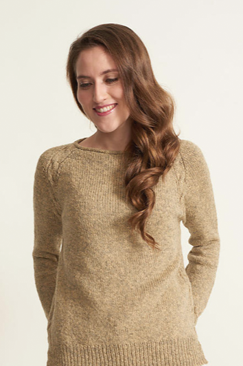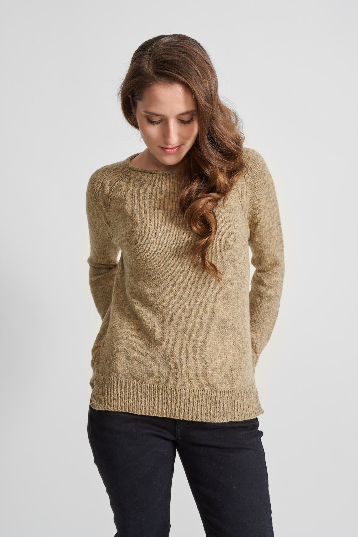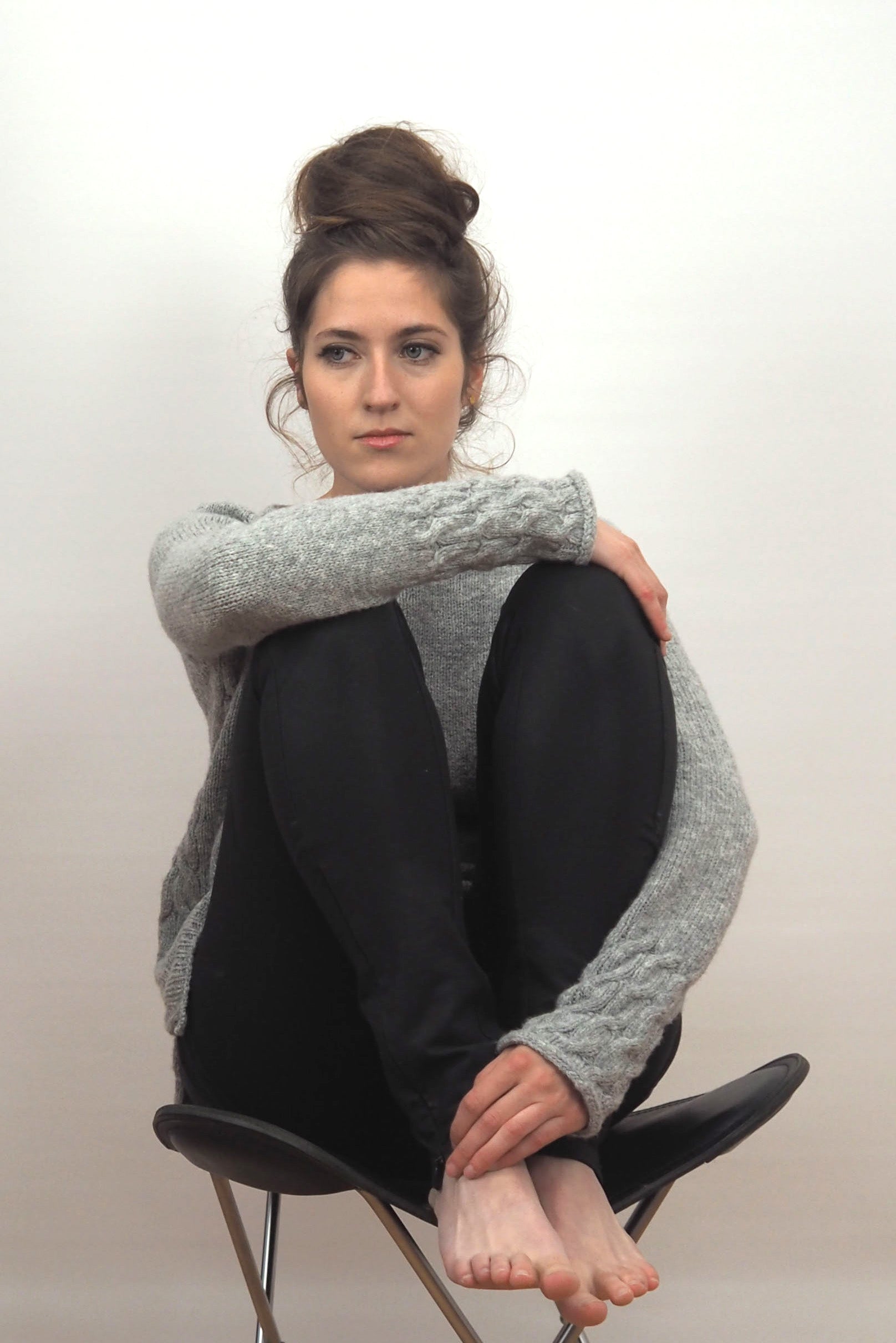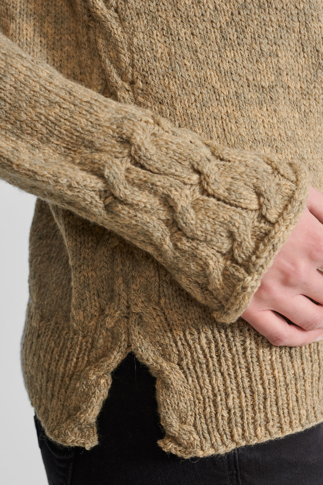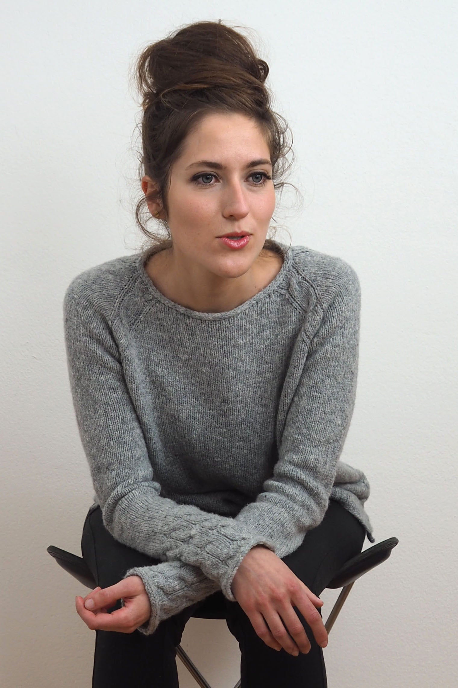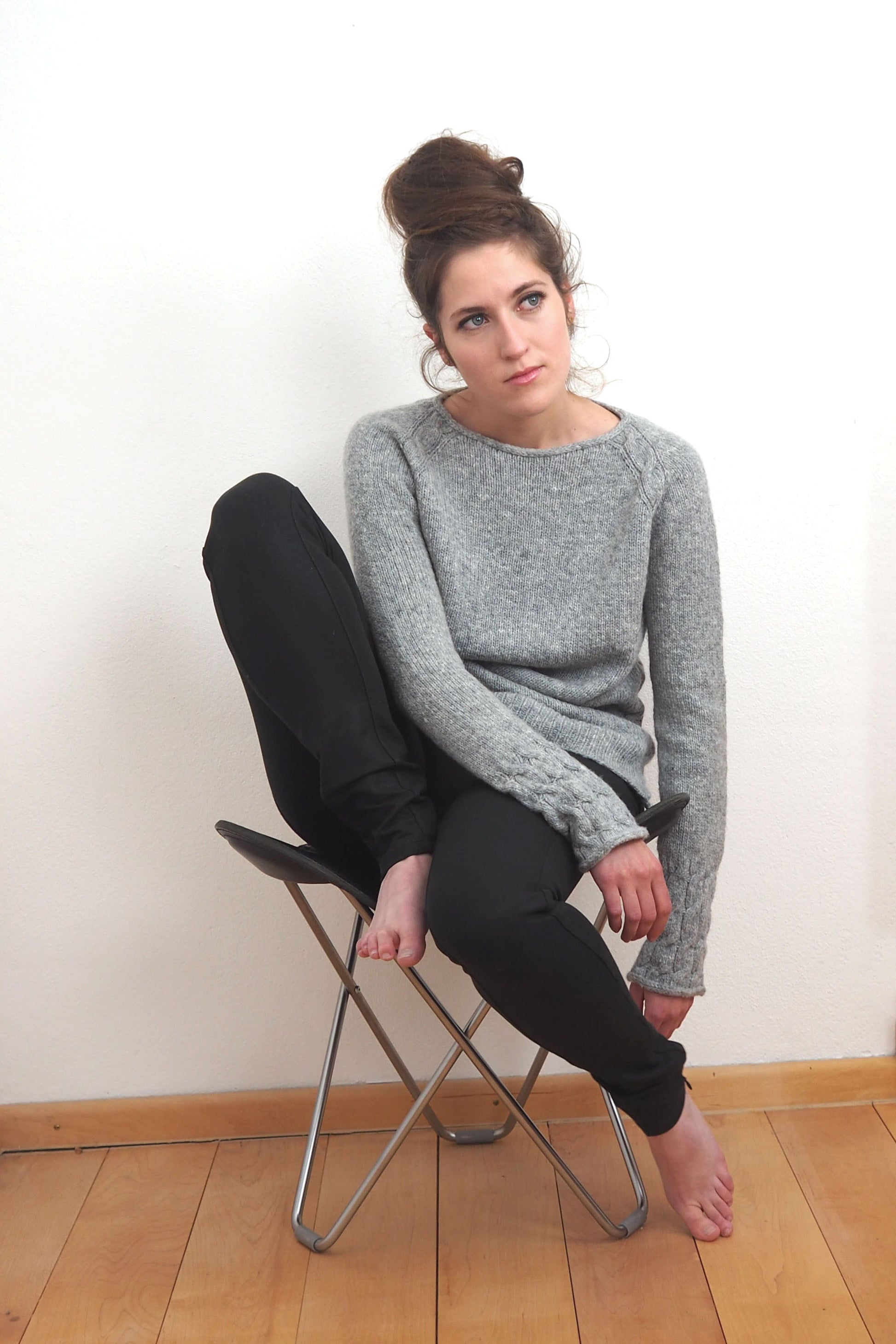 MALLI is worked seamlessly from the top down. The neckline is shaped by using the german short rows method. The cables of the raglan seams are continued at the side seams.
