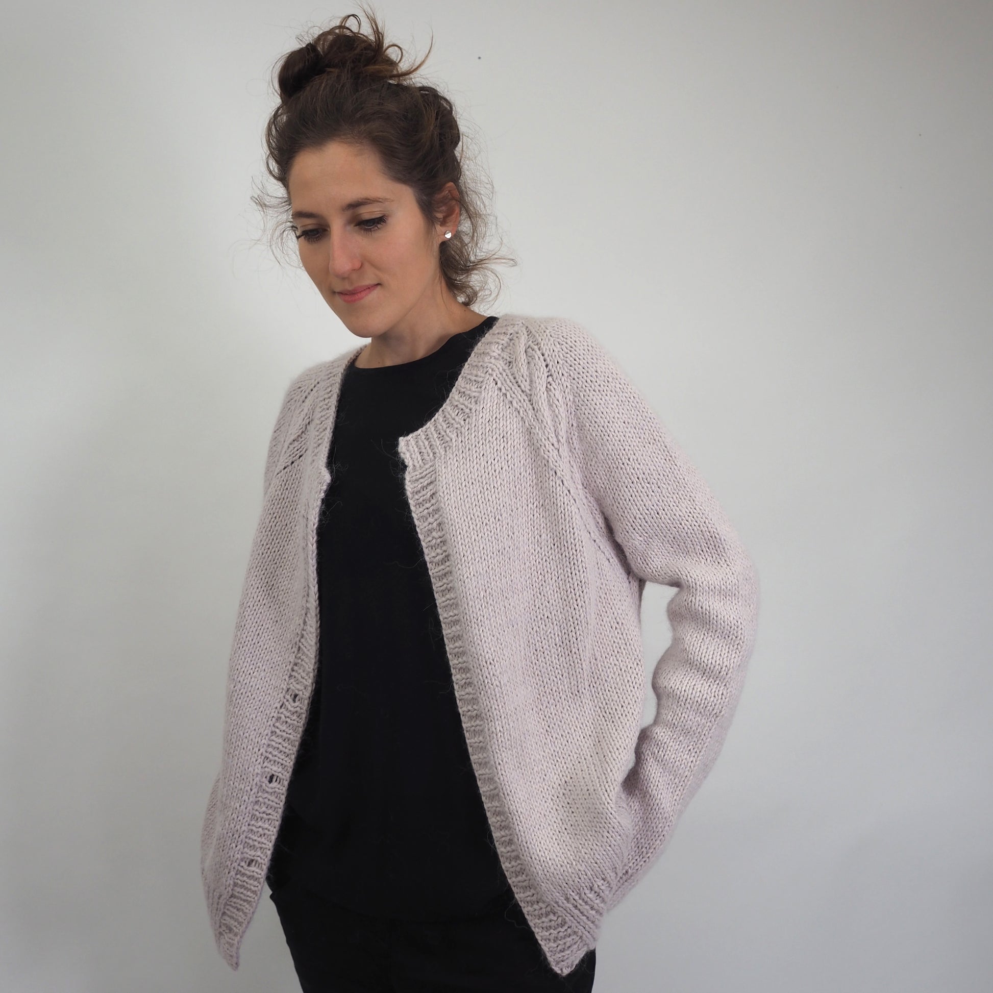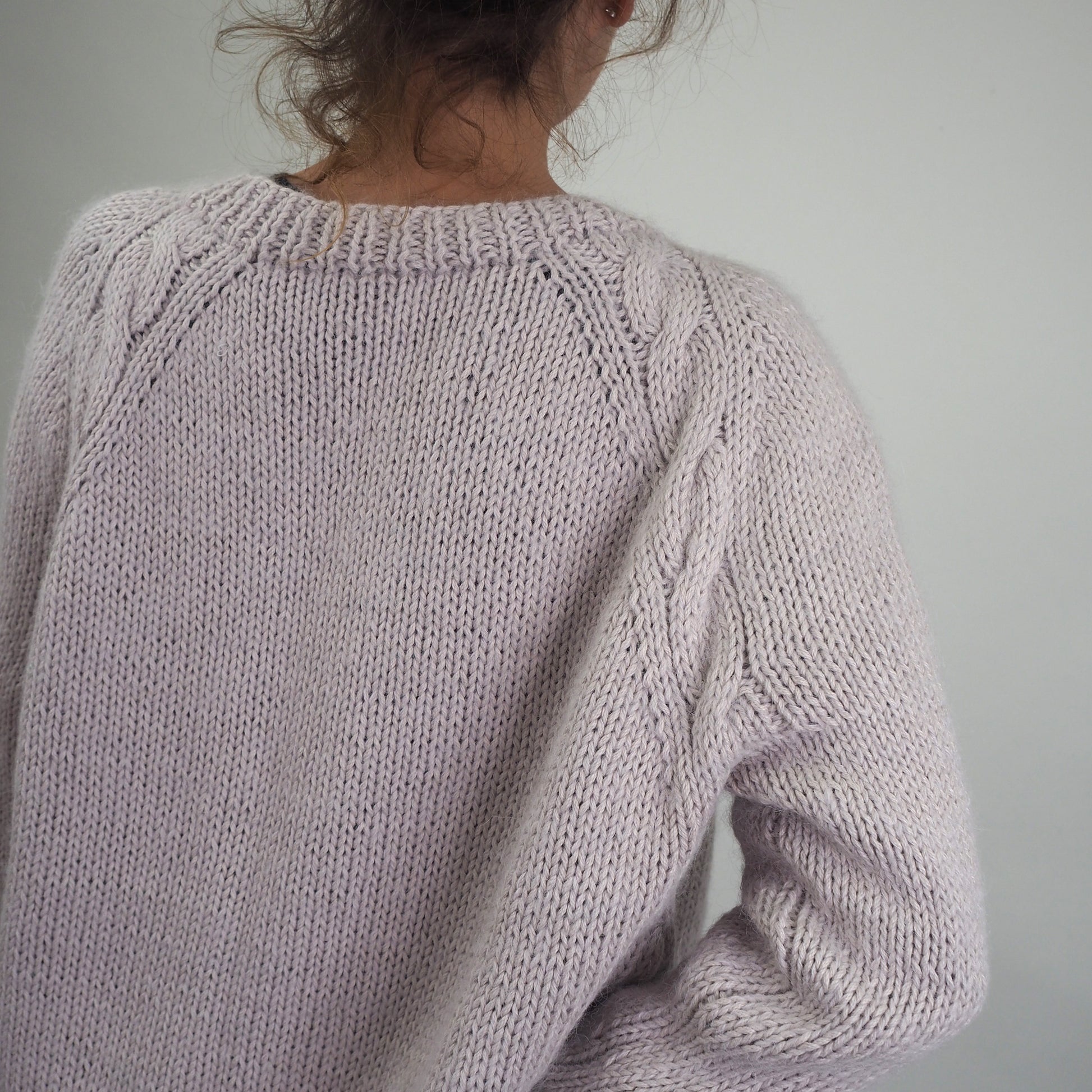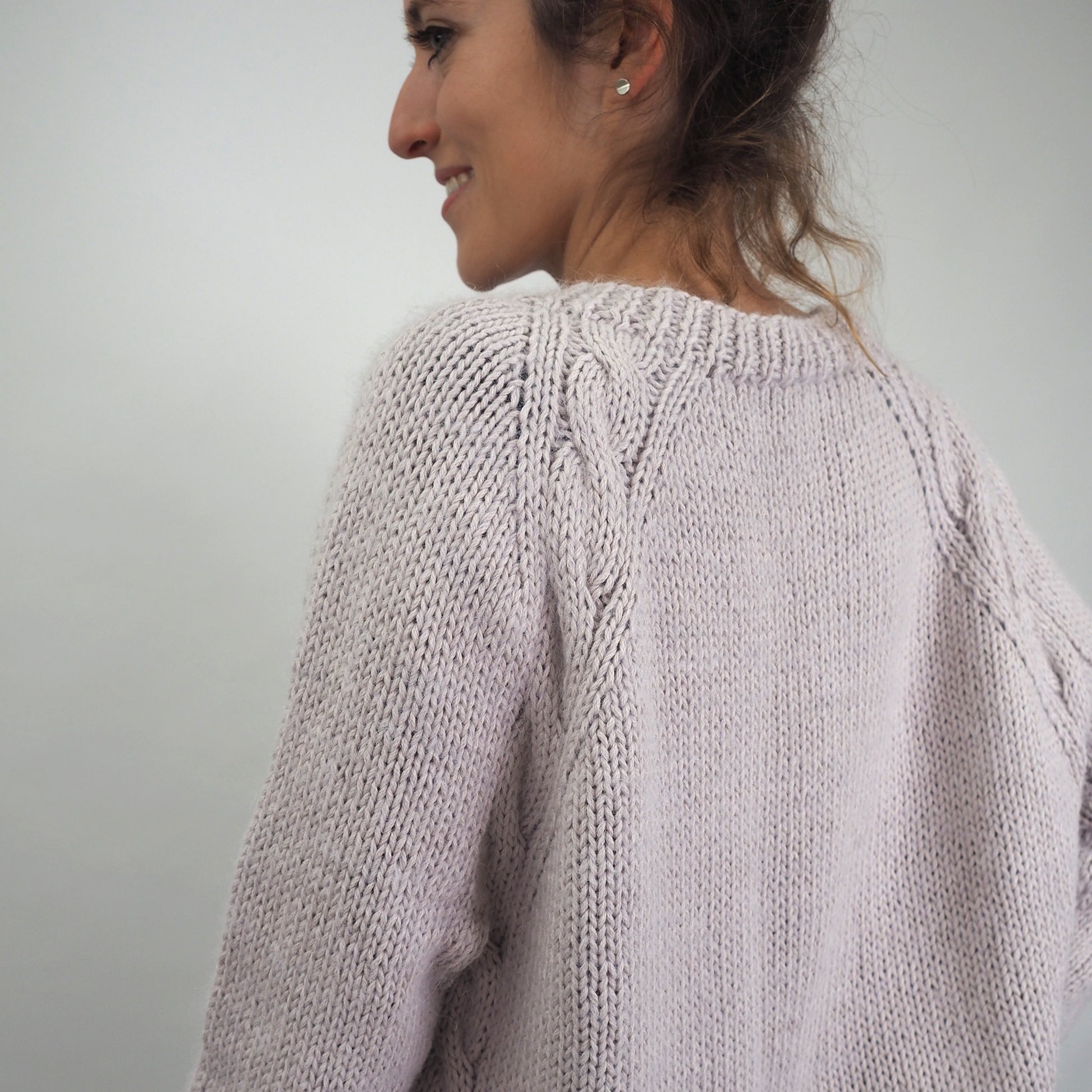 STINE is knit seamlessly from the top down. The increases to raglan are worked along cable-stitch bands that, after detaching the sleeves, continue down the sides and are worked separately for the split waistband. Our pattern piece is knitted with ALBSCHAF from MÄHRLE.