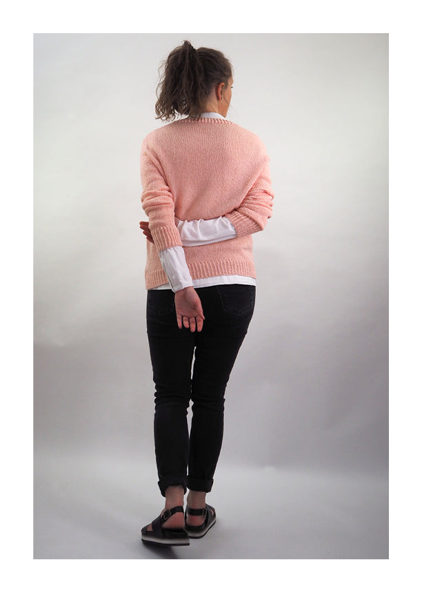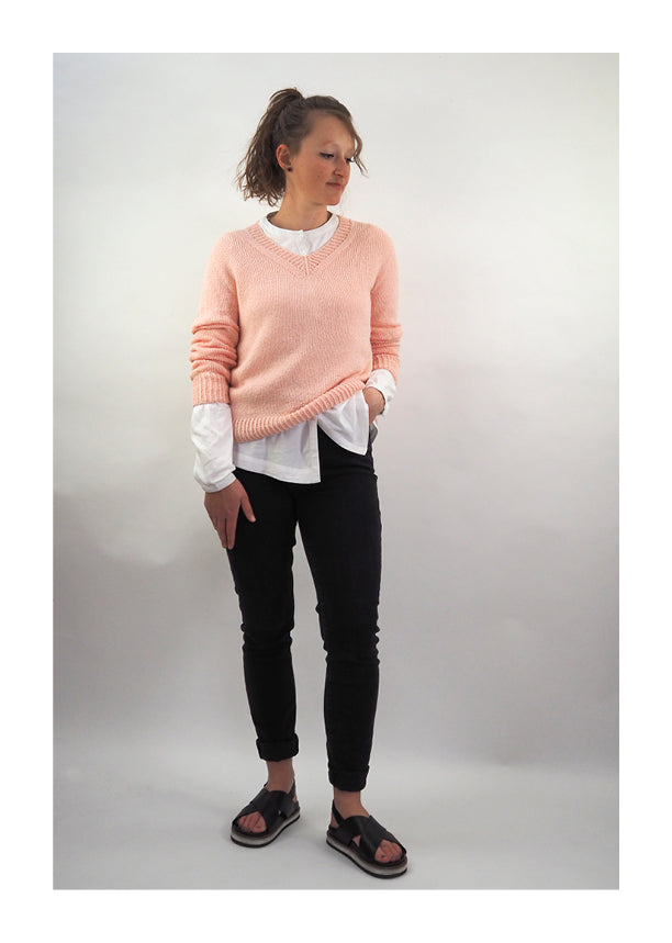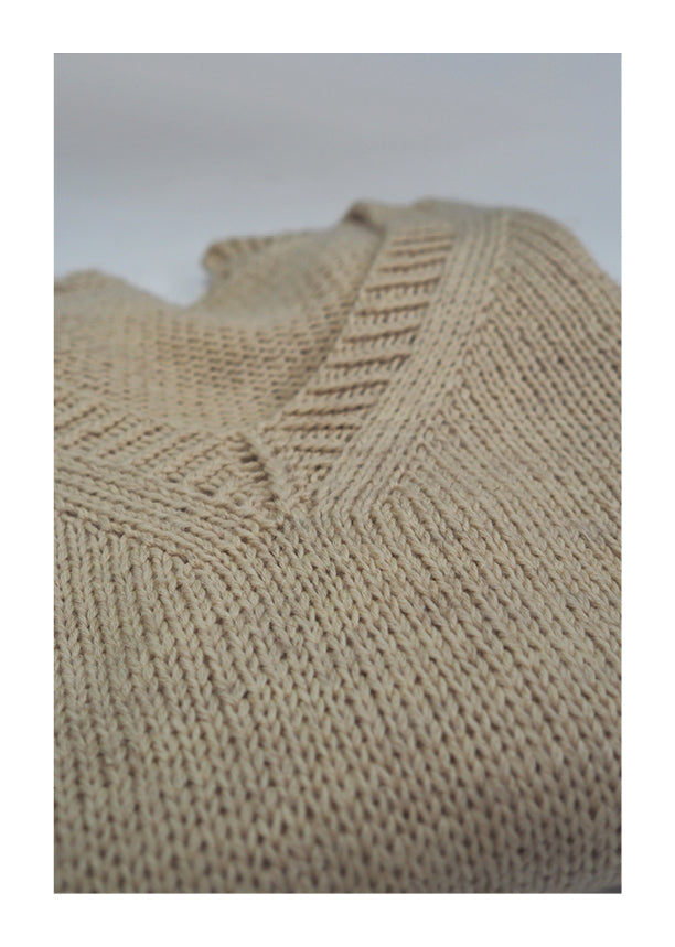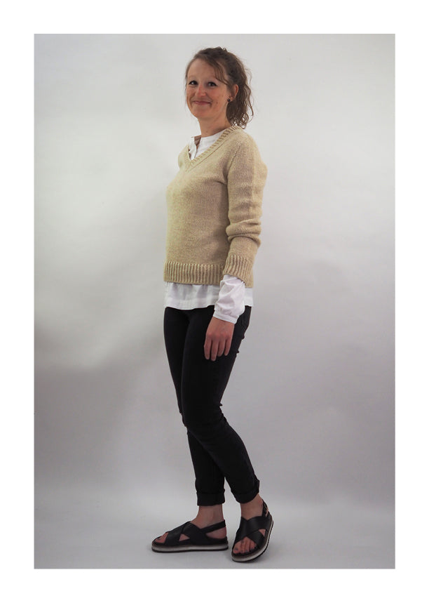 A classic V - neck sweater with [k1tbl, p1] ribbing for hem, neckband and cuffs.